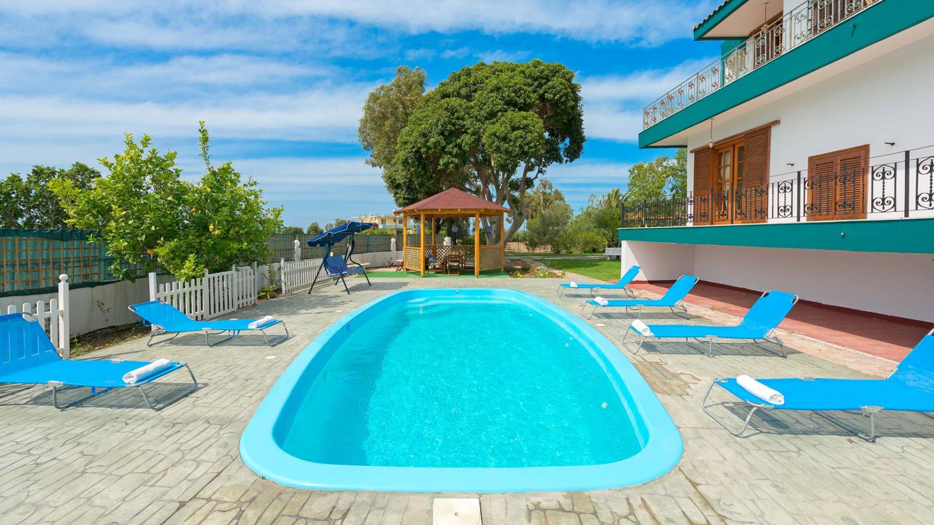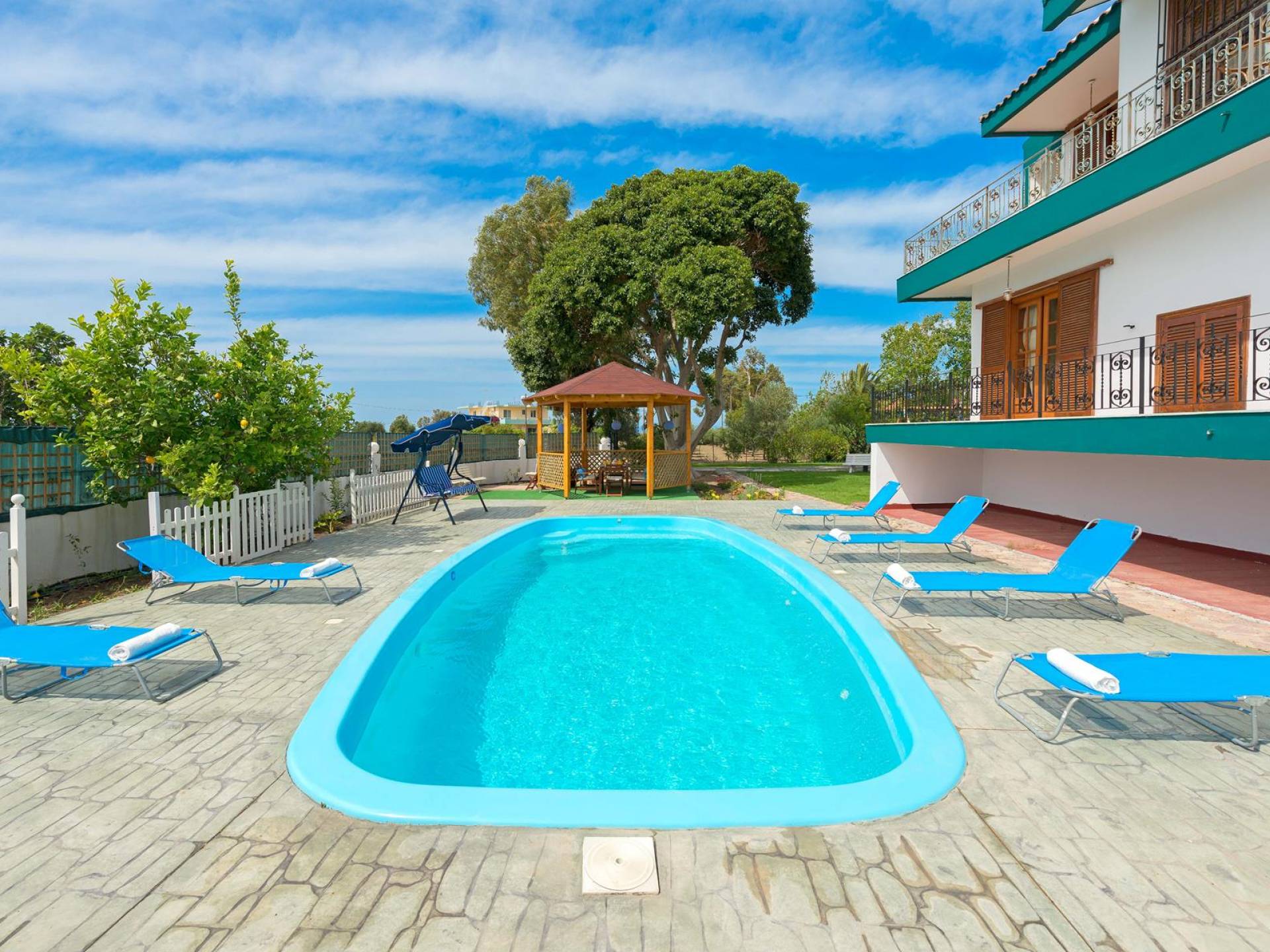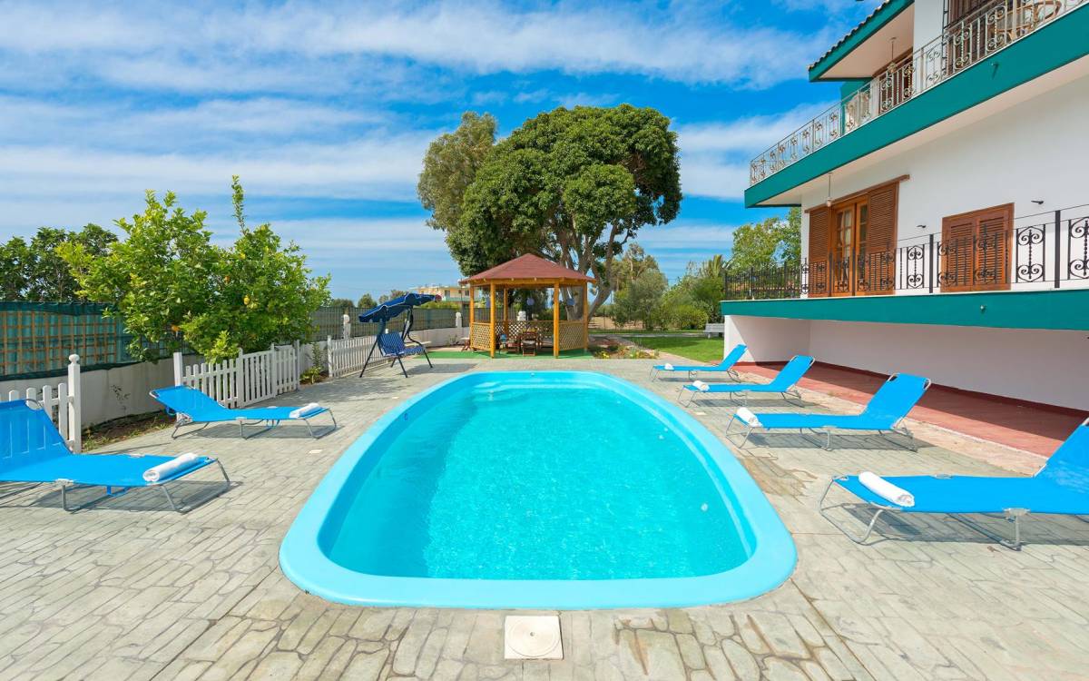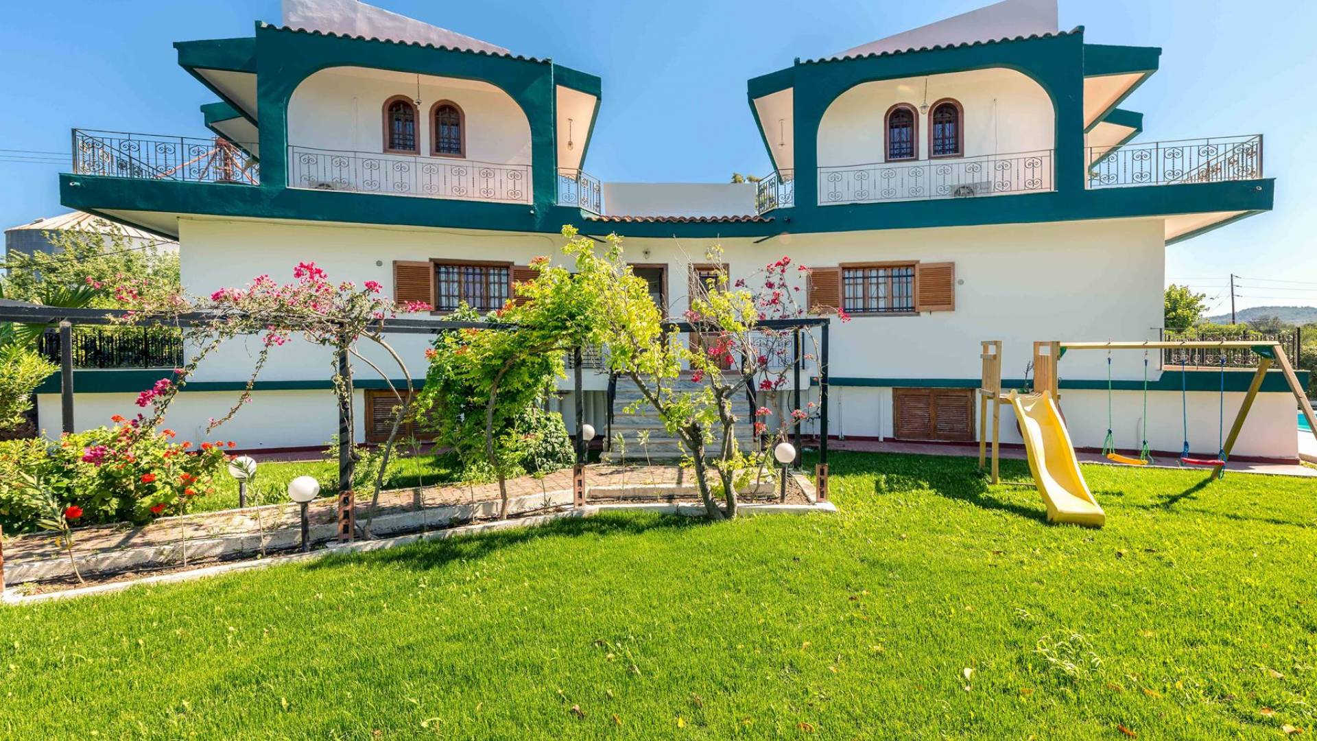 Marianna Villa 1 Rhodes dispose d'un grand jardin de 600m2 avec une piscine privée de 32 m2. Il y a un kiosque en bois près de la piscine avec une table à manger, où vous pourrez prendre votre repas ou vous détendre avec un livre. Nos plus jeunes pourront y jouer avec nos jeux de société. Dans la zone de la piscine, il y a des meubles de salon. En vue de la piscine et du belvédère, il y a une toute nouvelle aire de jeux, faite de bois et de couleurs vertes et adaptée aux enfants de 6 mois à 12 ans. Ainsi, les parents peuvent profiter de moments de détente au bord de la piscine tout en surveillant leurs enfants. La zone est clôturée. Un barbecue et un four à bois sont également disponibles. Des soirées spéciales avec des plats traditionnels rhodiens cuits au four à bois peuvent être organisées pour vous.