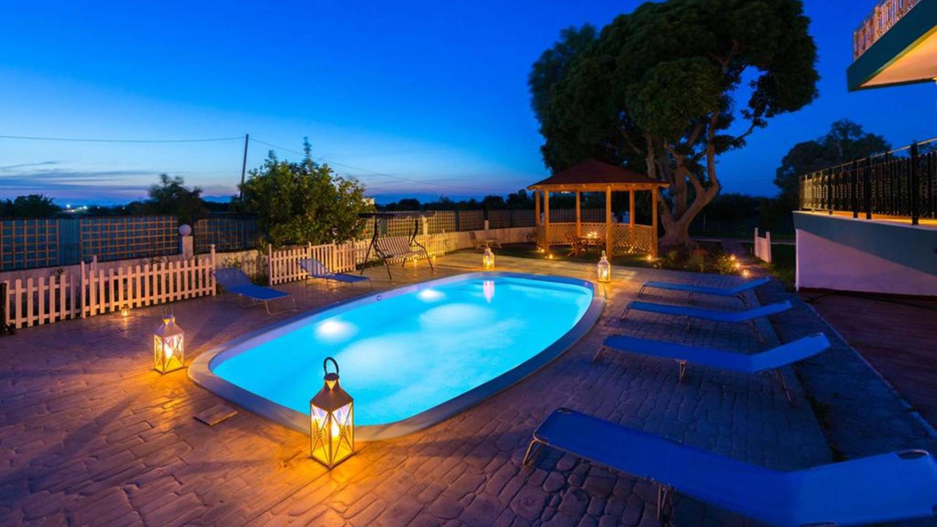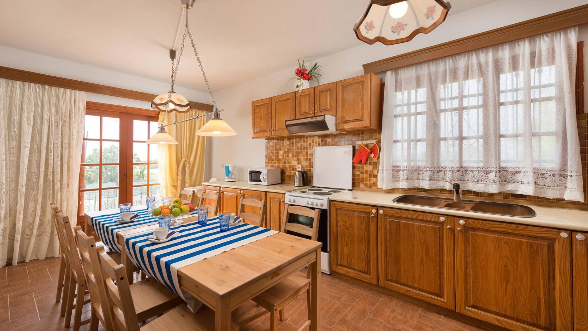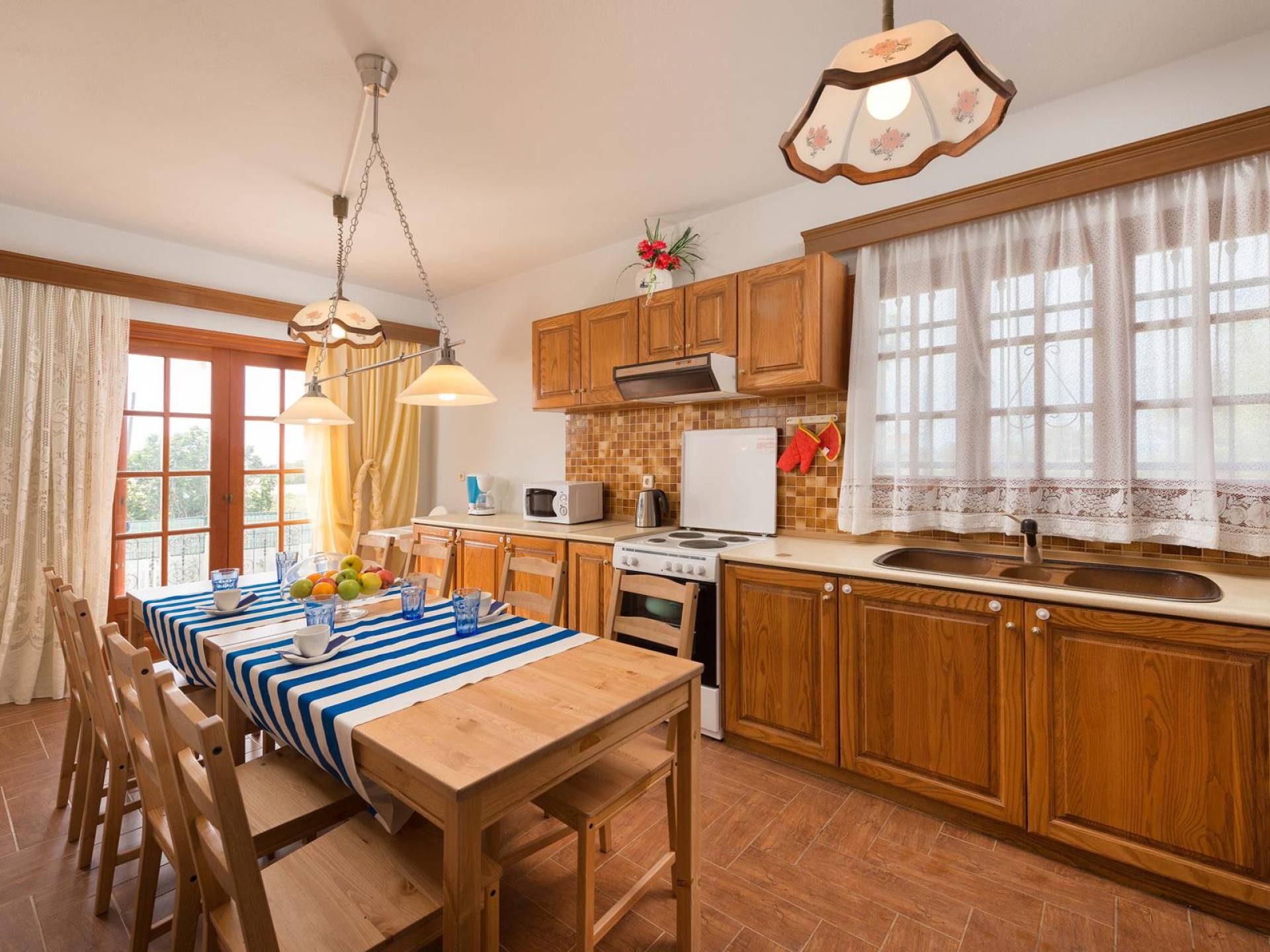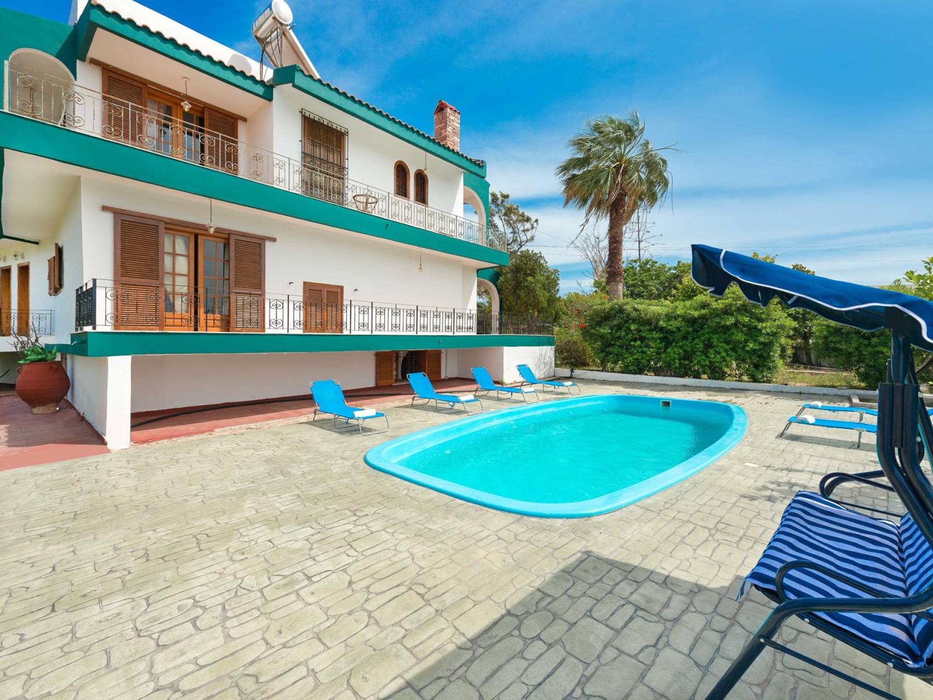 Marianna Villa 1 Rhodes dispose d'un grand jardin de 600m2 avec une piscine privée de 32 m2. Il y a un kiosque en bois près de la piscine avec une table à manger, où vous pourrez prendre votre repas ou vous détendre avec un livre. Nos plus jeunes pourront y jouer avec nos jeux de société. Dans la zone de la piscine, il y a des meubles de salon. En vue de la piscine et du belvédère, il y a une toute nouvelle aire de jeux, faite de bois et de couleurs vertes et adaptée aux enfants de 6 mois à 12 ans. Ainsi, les parents peuvent profiter de moments de détente au bord de la piscine tout en surveillant leurs enfants. La zone est clôturée. Un barbecue et un four à bois sont également disponibles. Des soirées spéciales avec des plats traditionnels rhodiens cuits au four à bois peuvent être organisées pour vous.