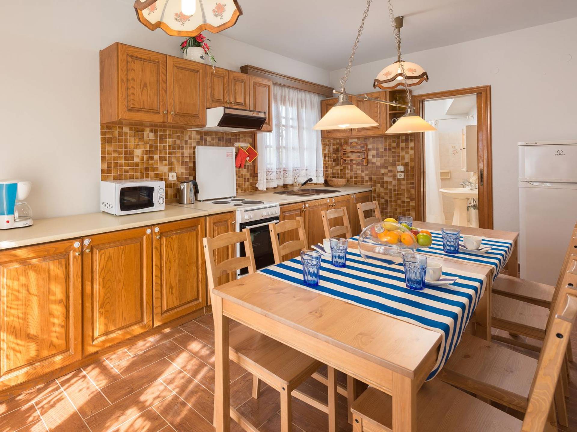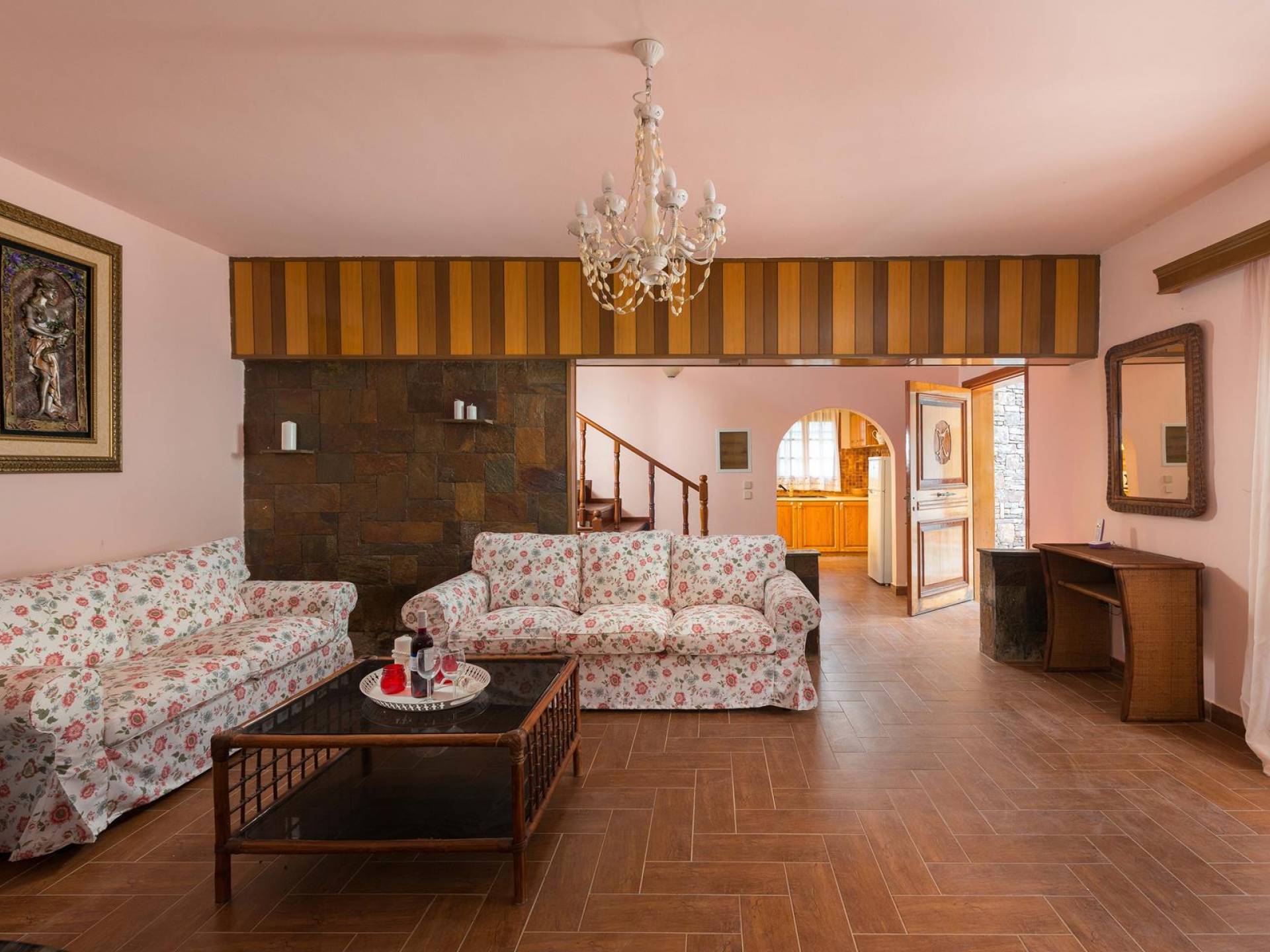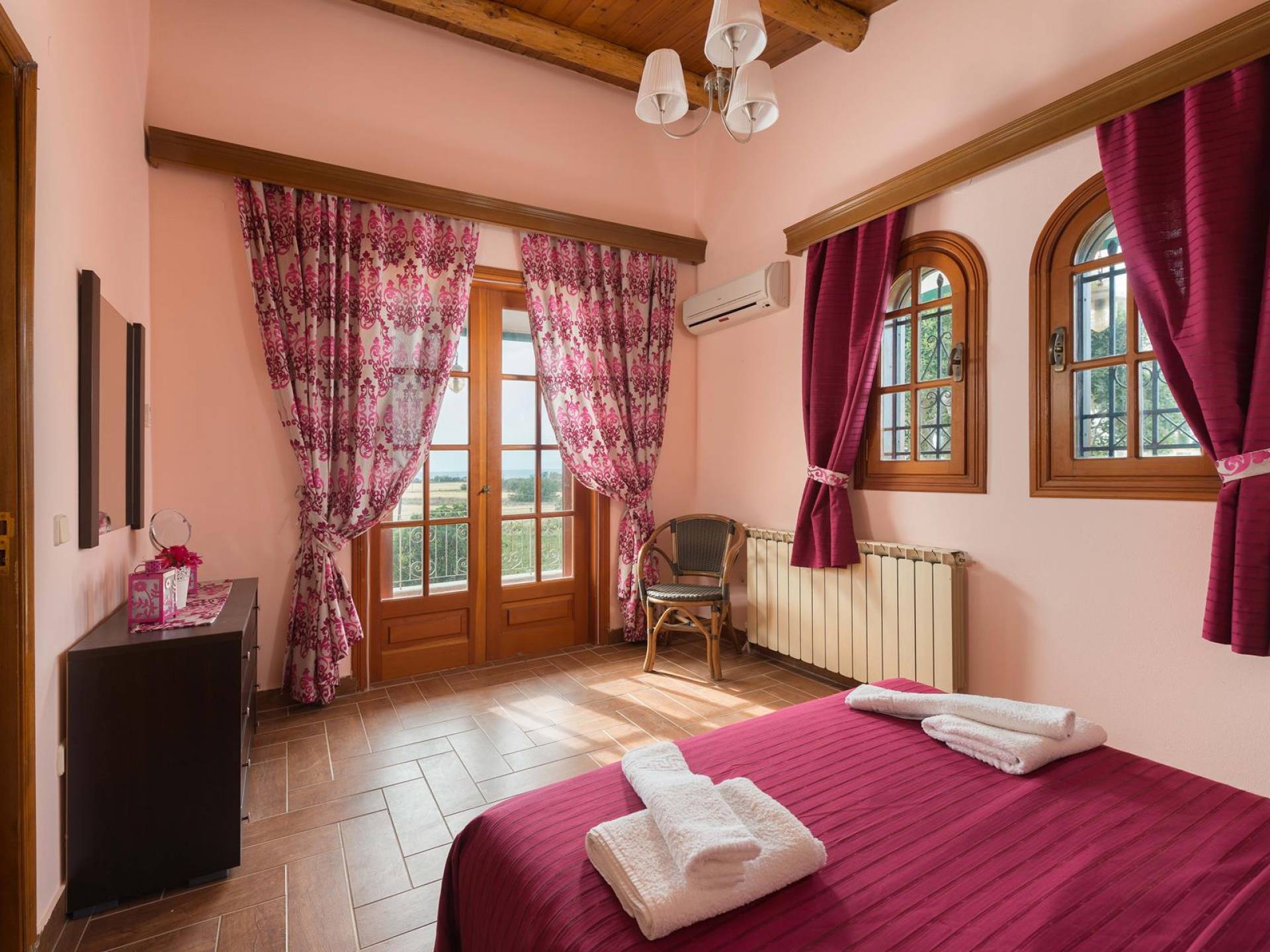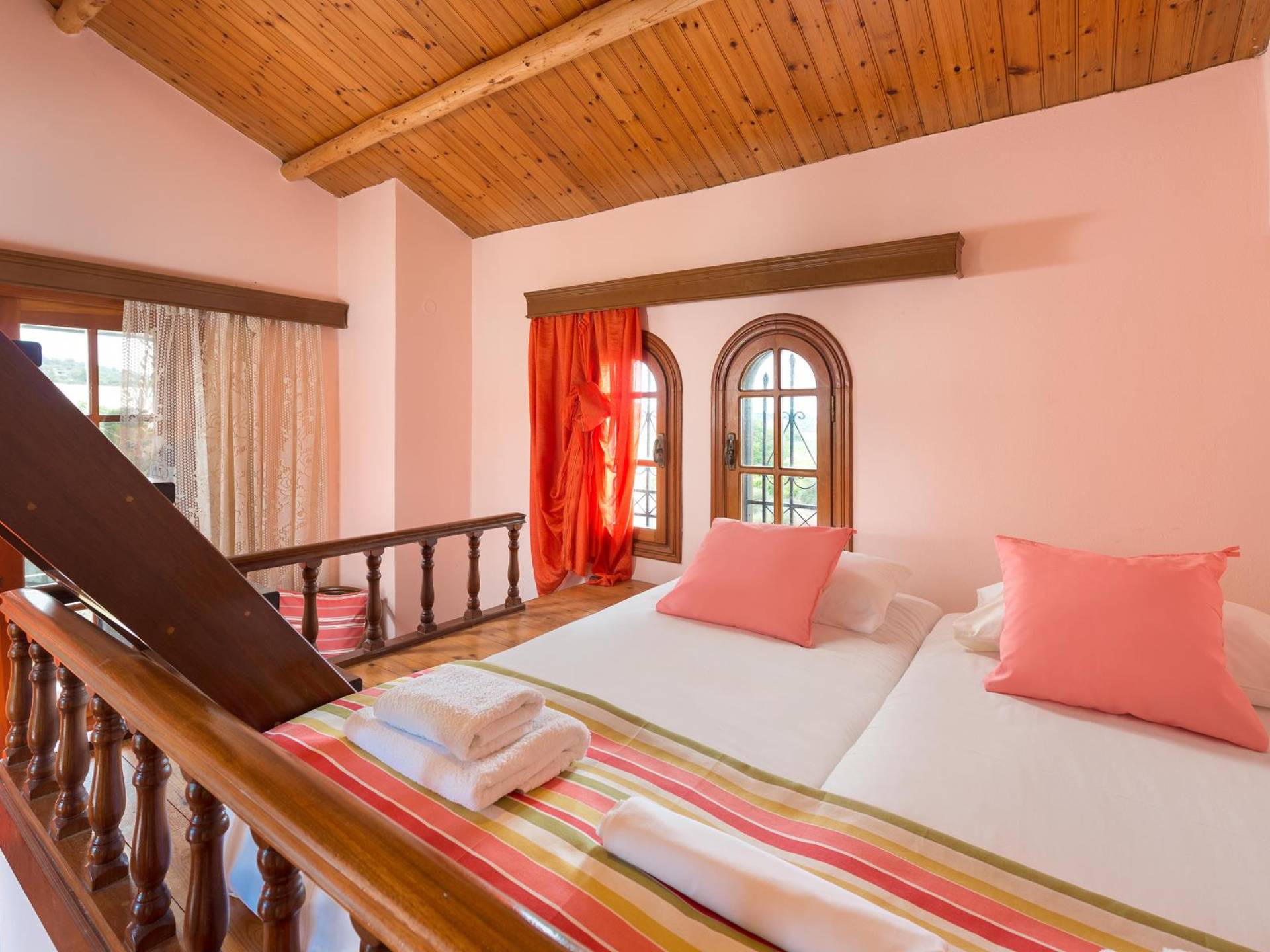 Au premier étage, il y a deux chambres joliment décorées. La première dispose d'un lit double et s'ouvre sur un balcon avec vue mer et piscine. Une table à manger est disponible sur le balcon d'où vous pourrez profiter de magnifiques couchers de soleil, alors que le soleil se couche dans la mer. La deuxième chambre a une construction traditionnelle spéciale de lits qui est utilisée dans l'île voisine de Syme (4 lits sont construits sur deux niveaux différents). Cette chambre donne sur le jardin. A cet étage, il y a une salle de bain avec baignoire. Au demi-sous-sol, il y a une troisième chambre ensoleillée décorée dans un style romantique joyeux.