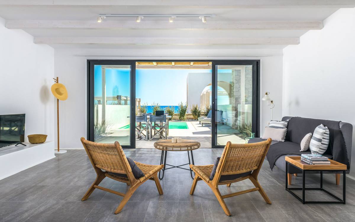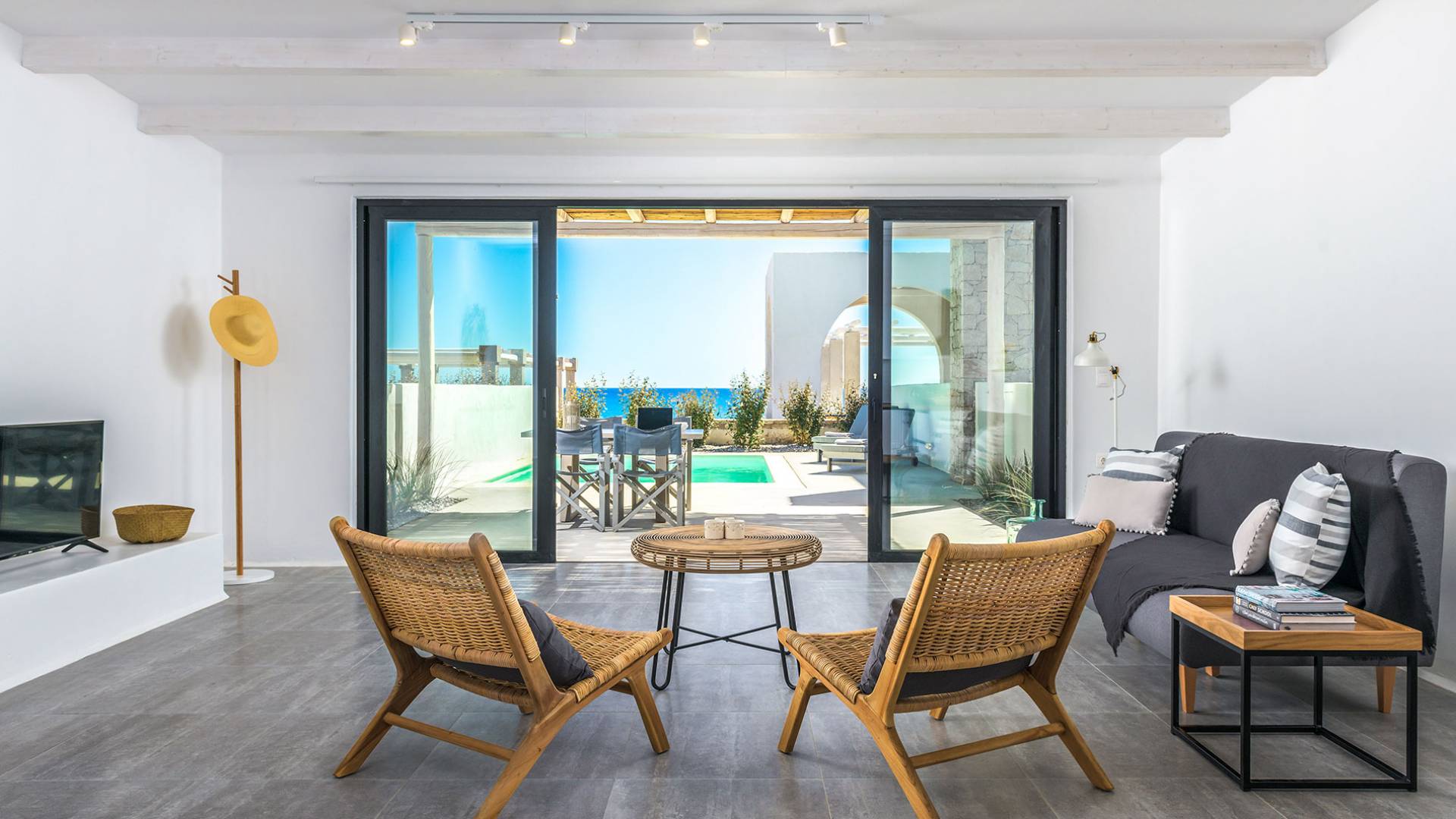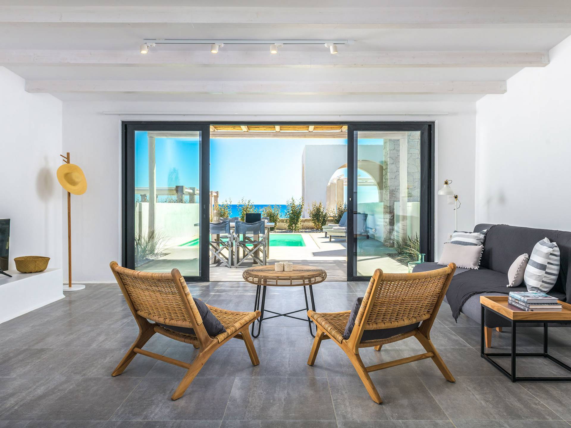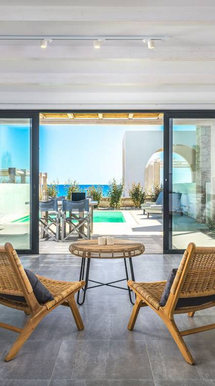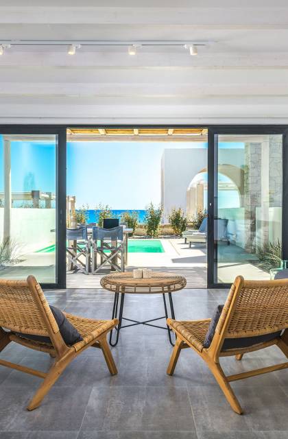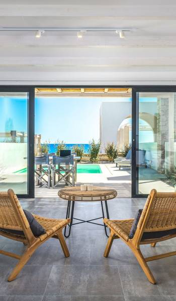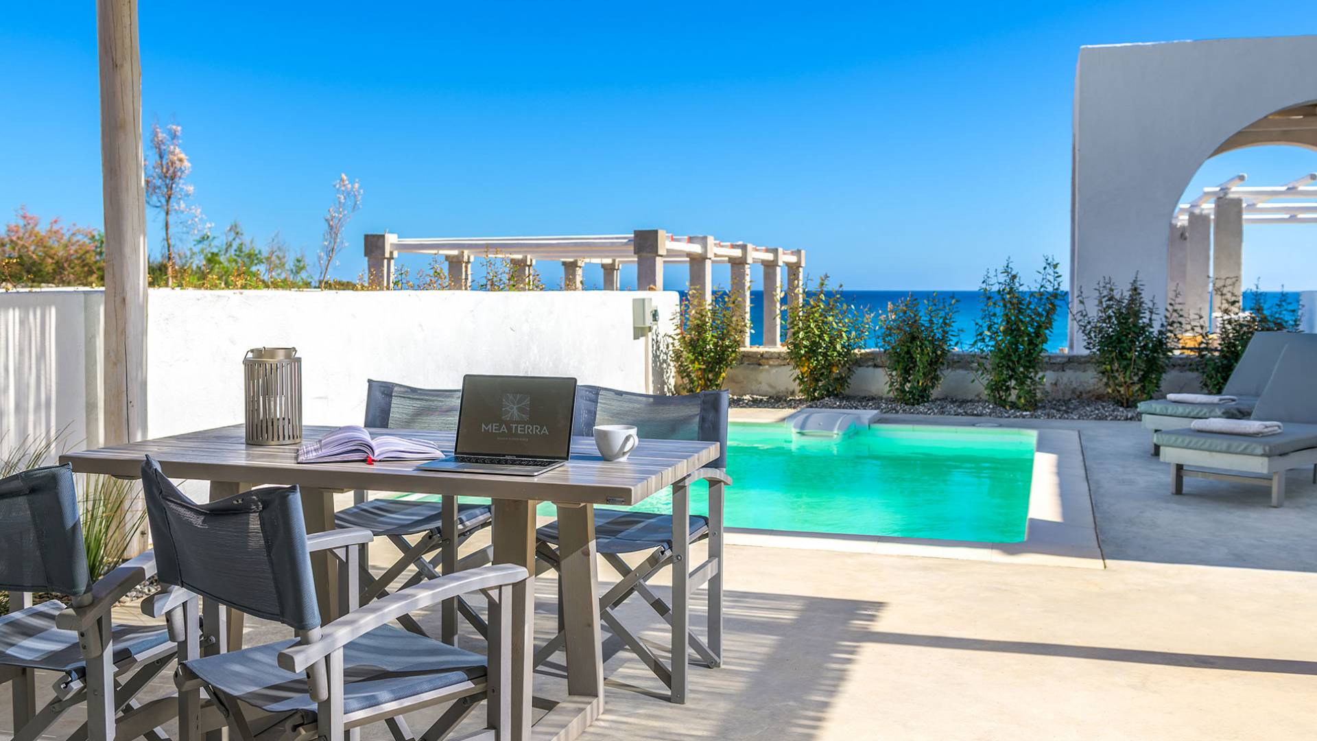 Mea Terra villas est un complexe de villas de luxe composé de deux villas, la Villa Esthir et la Villa Theros. Surplombant la mer Égée, Villa Esthir et Villa Theros offrent le même goût d'élégance et de style, tandis que chaque maison conserve une ambiance individuelle en fonction de ses différentes touches de décoration. Toutes les chambres contiennent des articles de luxe tels que des draps fins, des serviettes et des articles de toilette naturels.