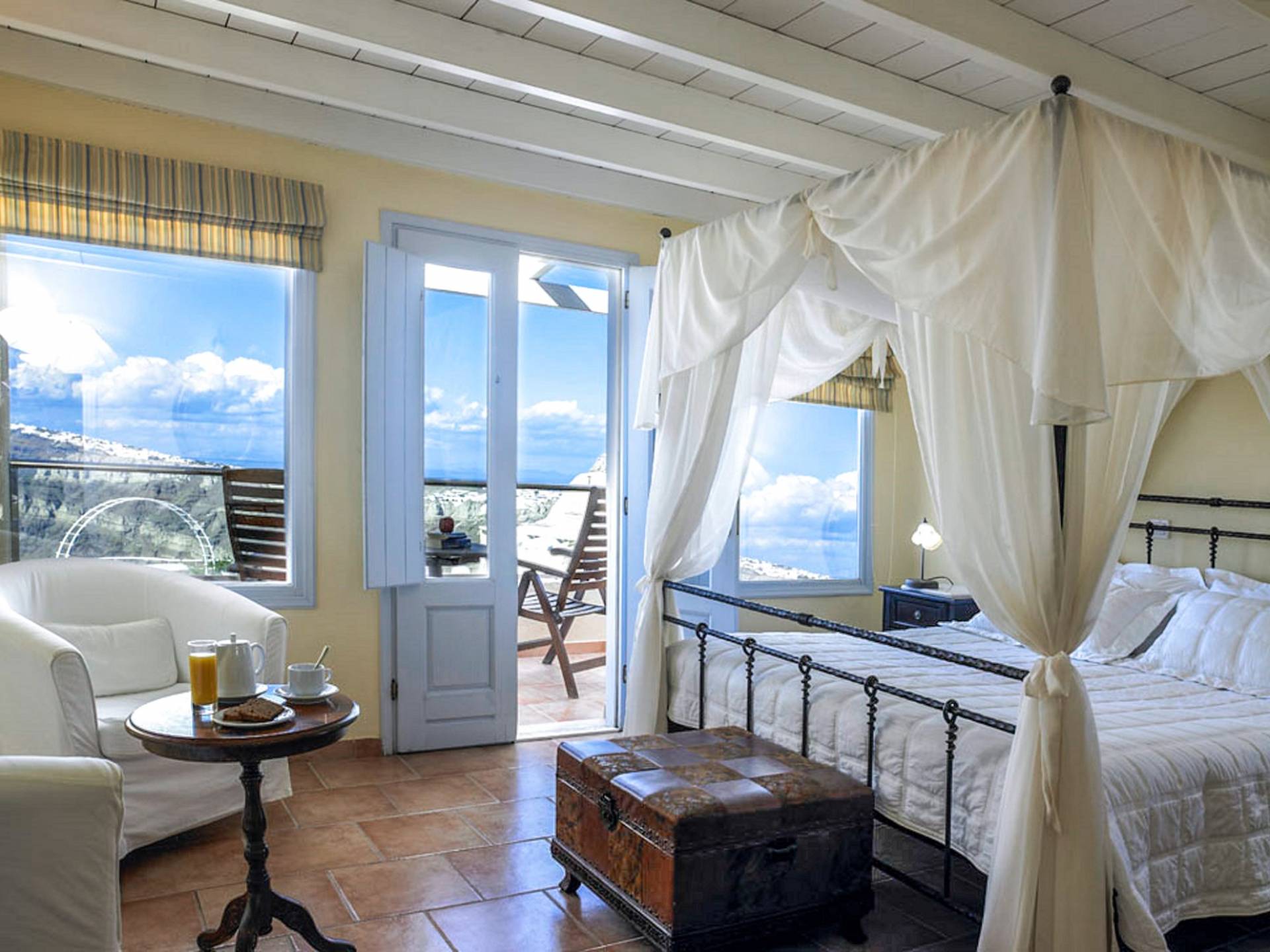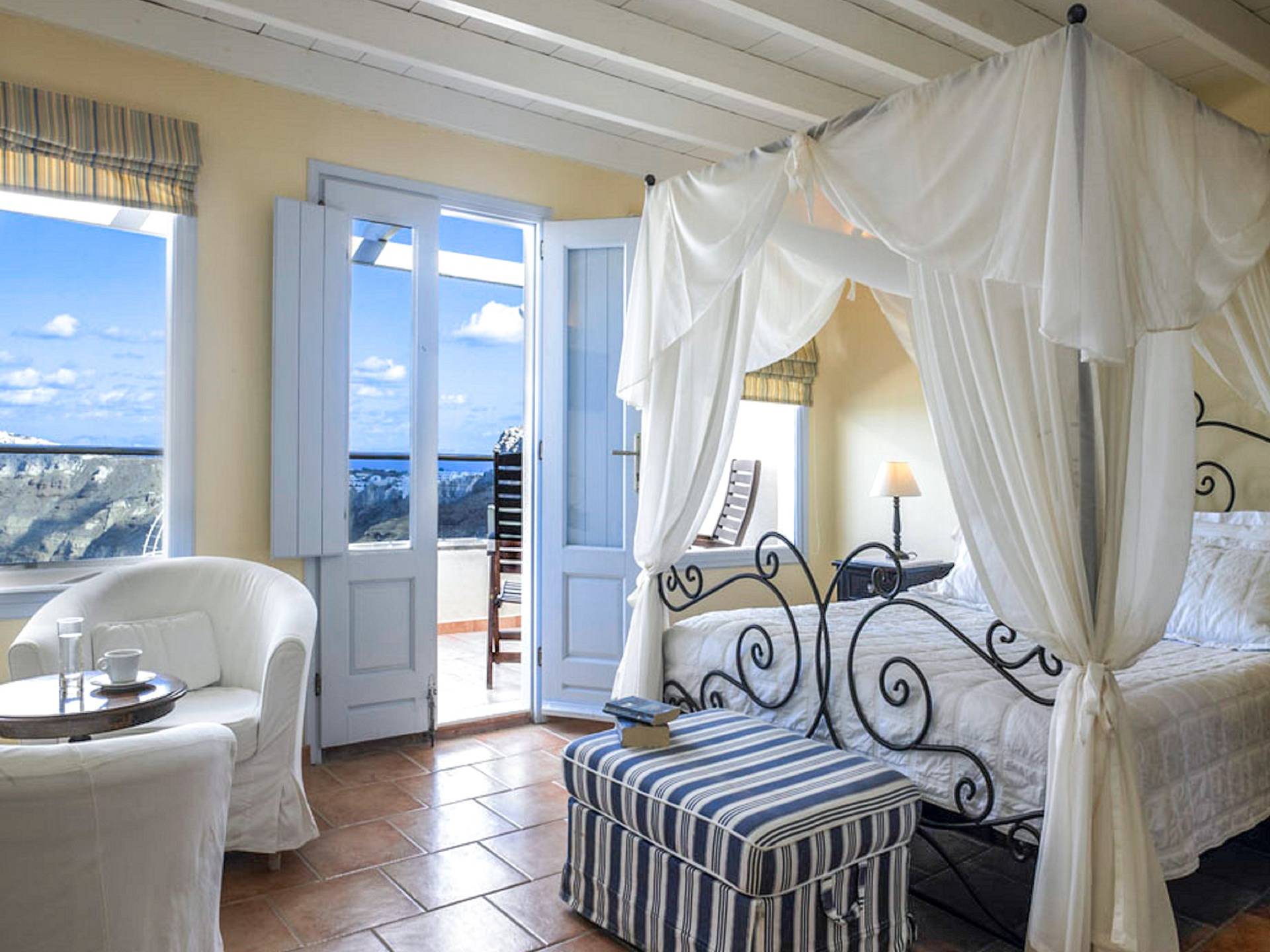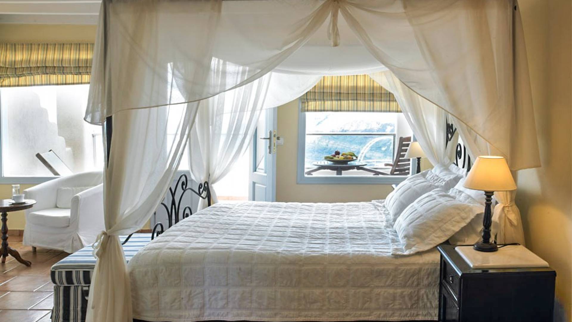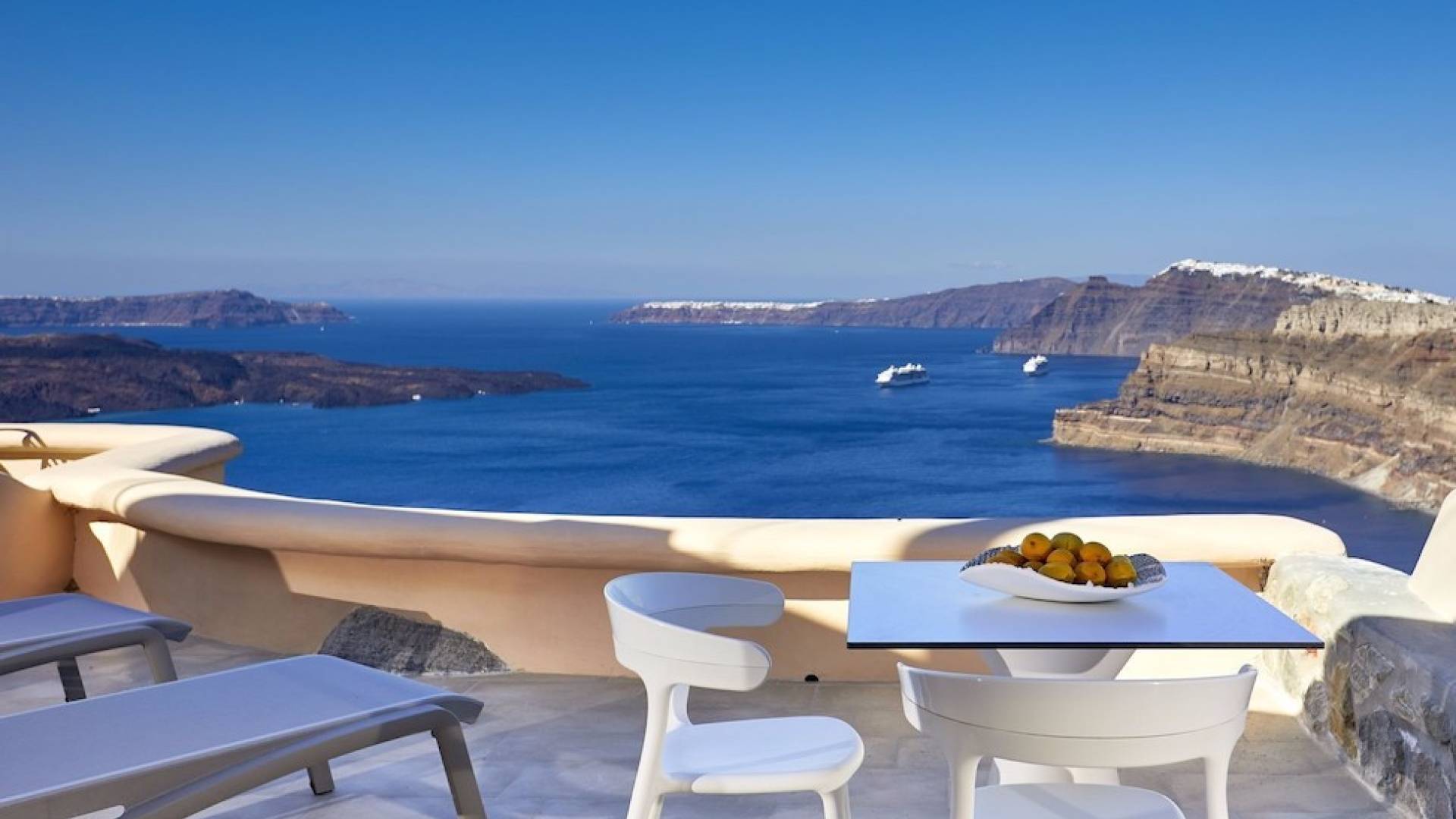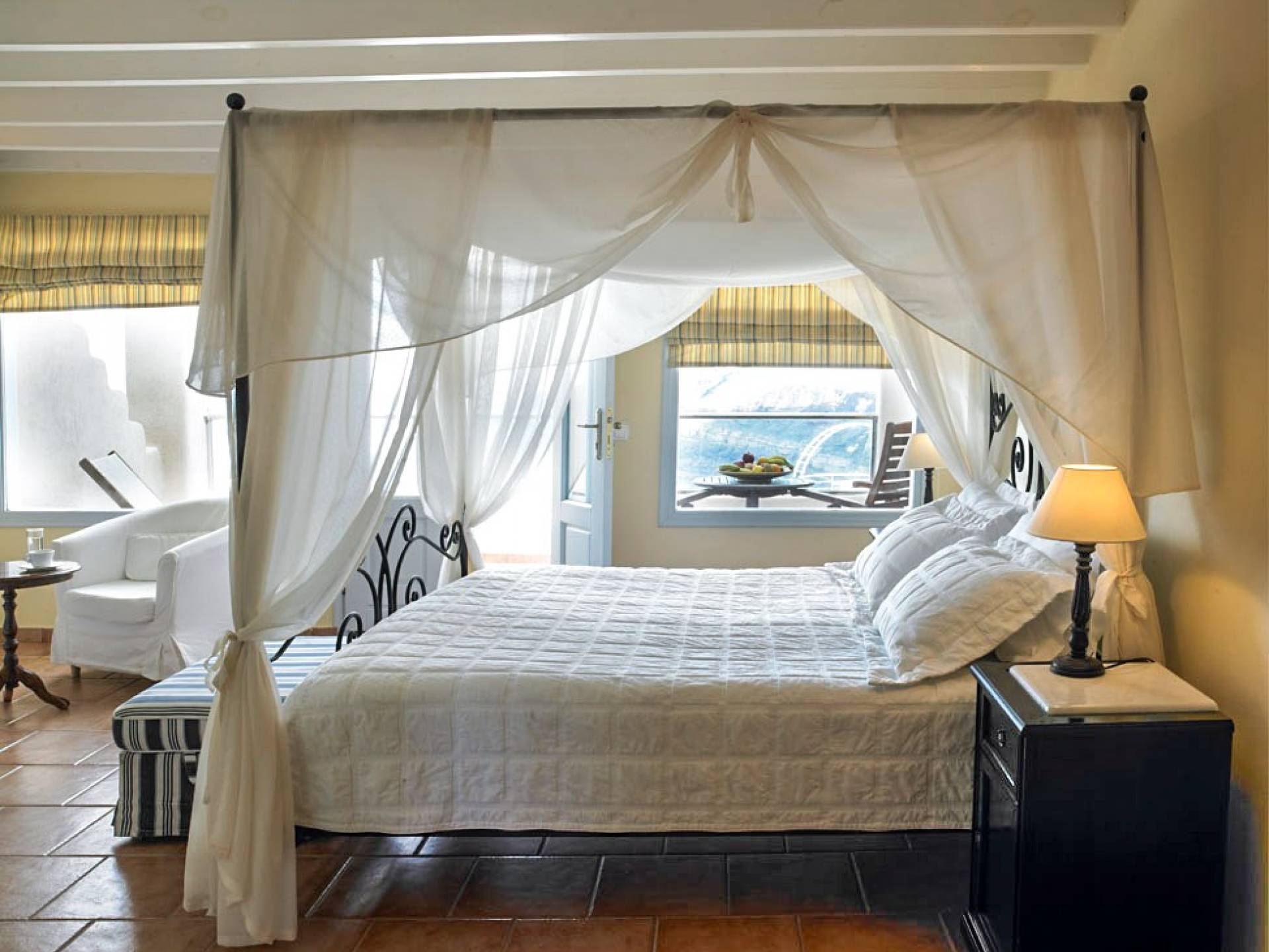 Après tout, la suite principale comprend une chambre décloisonnée et une baignoire donnant sur la caldeira, un coin salon, une salle de bains avec douche, une véranda avec vue sur la mer.