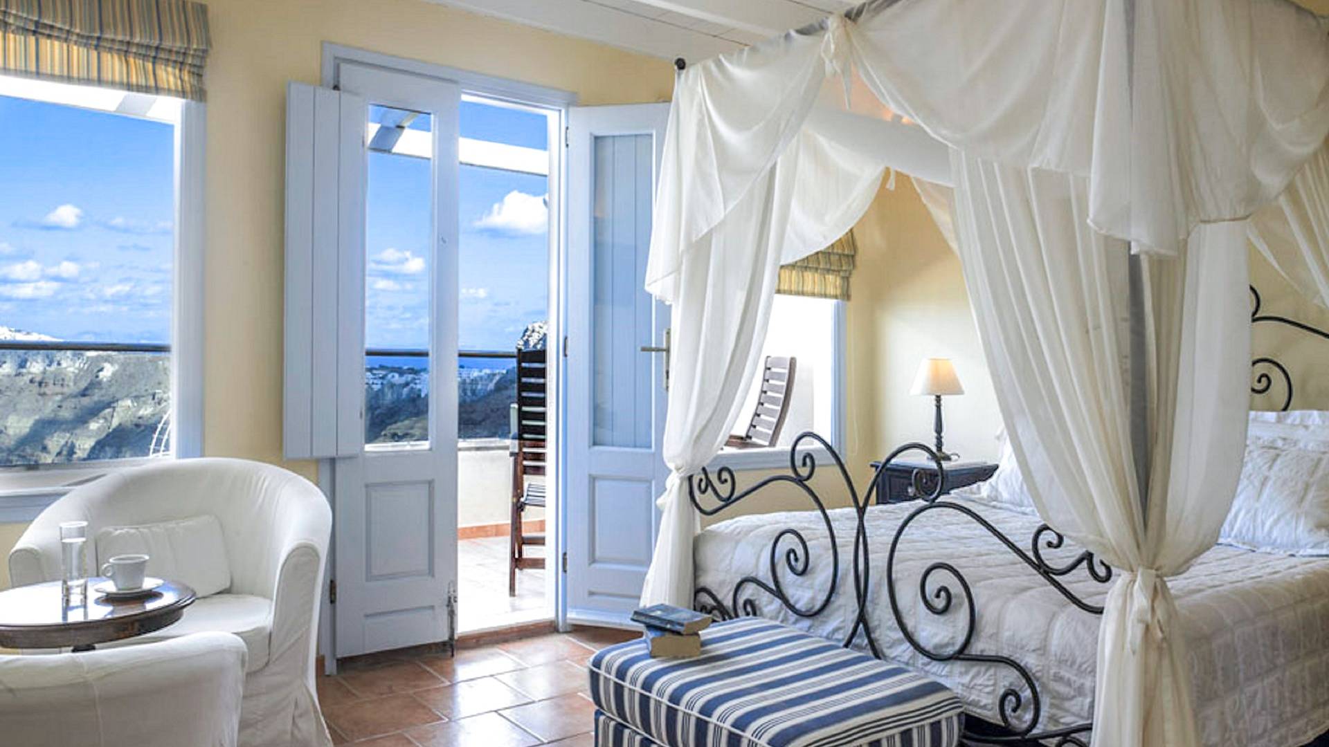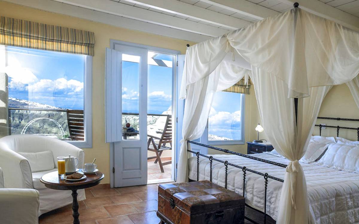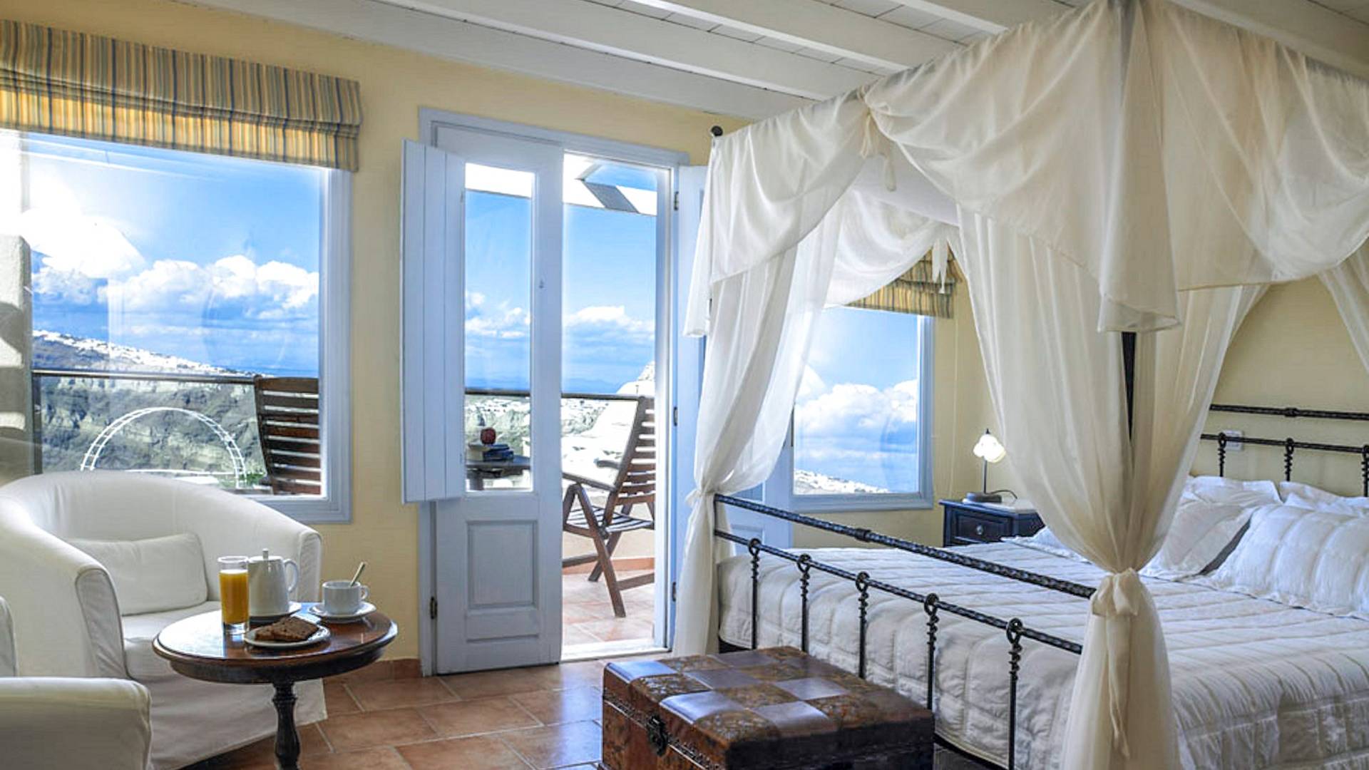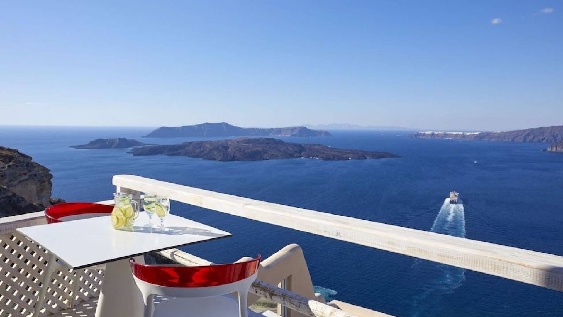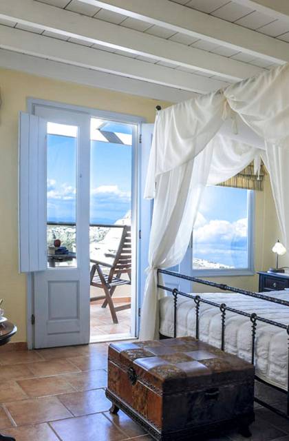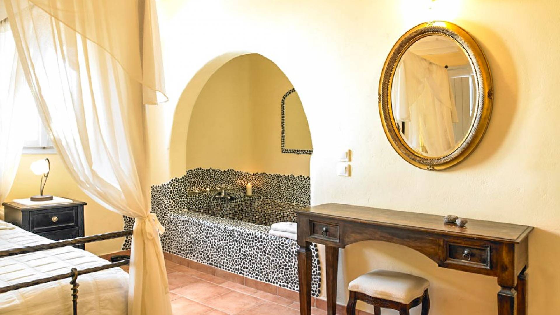 Après tout, la suite principale comprend une chambre décloisonnée et une baignoire donnant sur la caldeira, un coin salon, une salle de bains avec douche, une véranda avec vue sur la mer.
