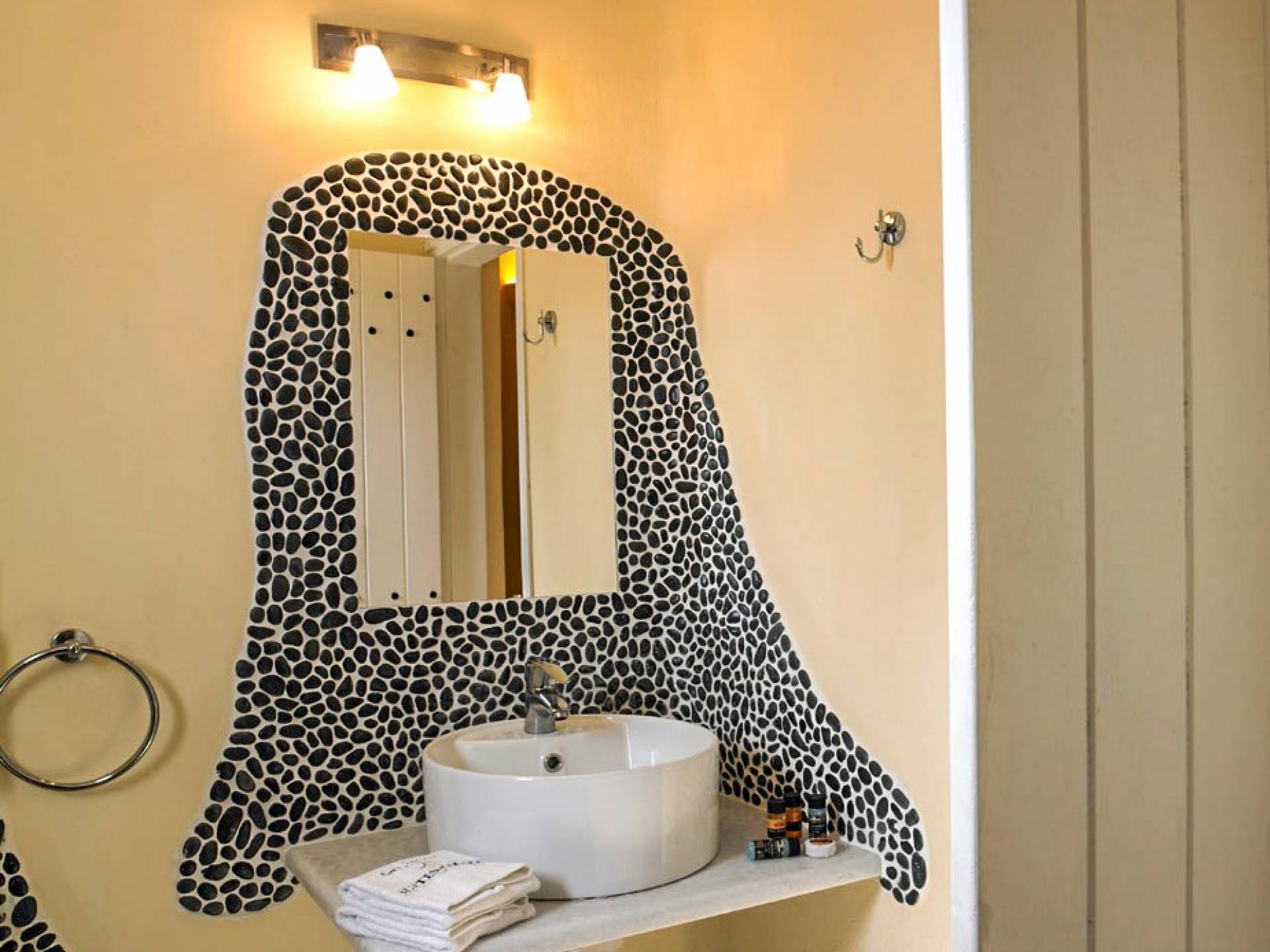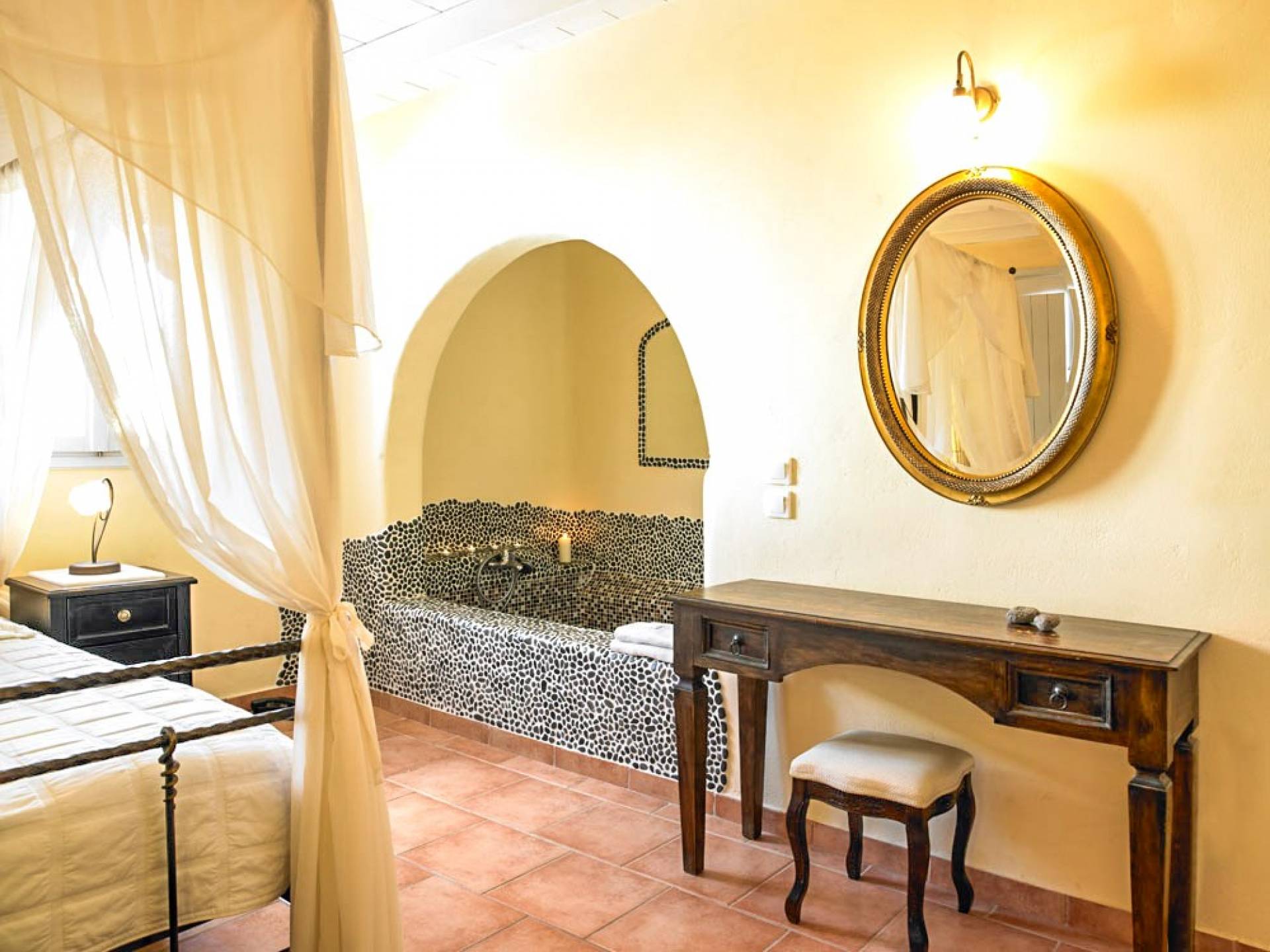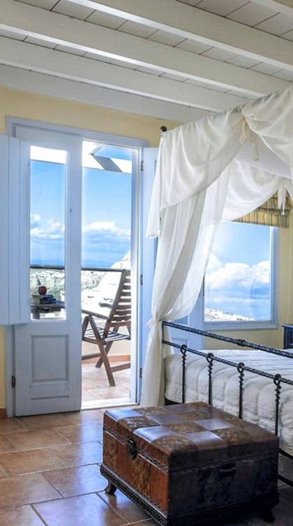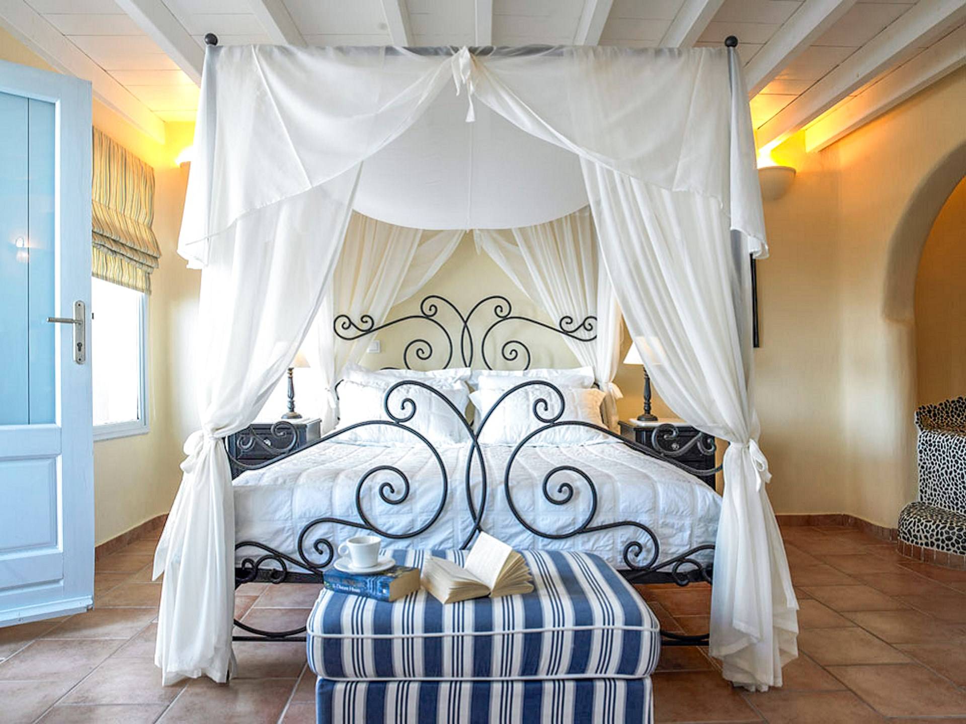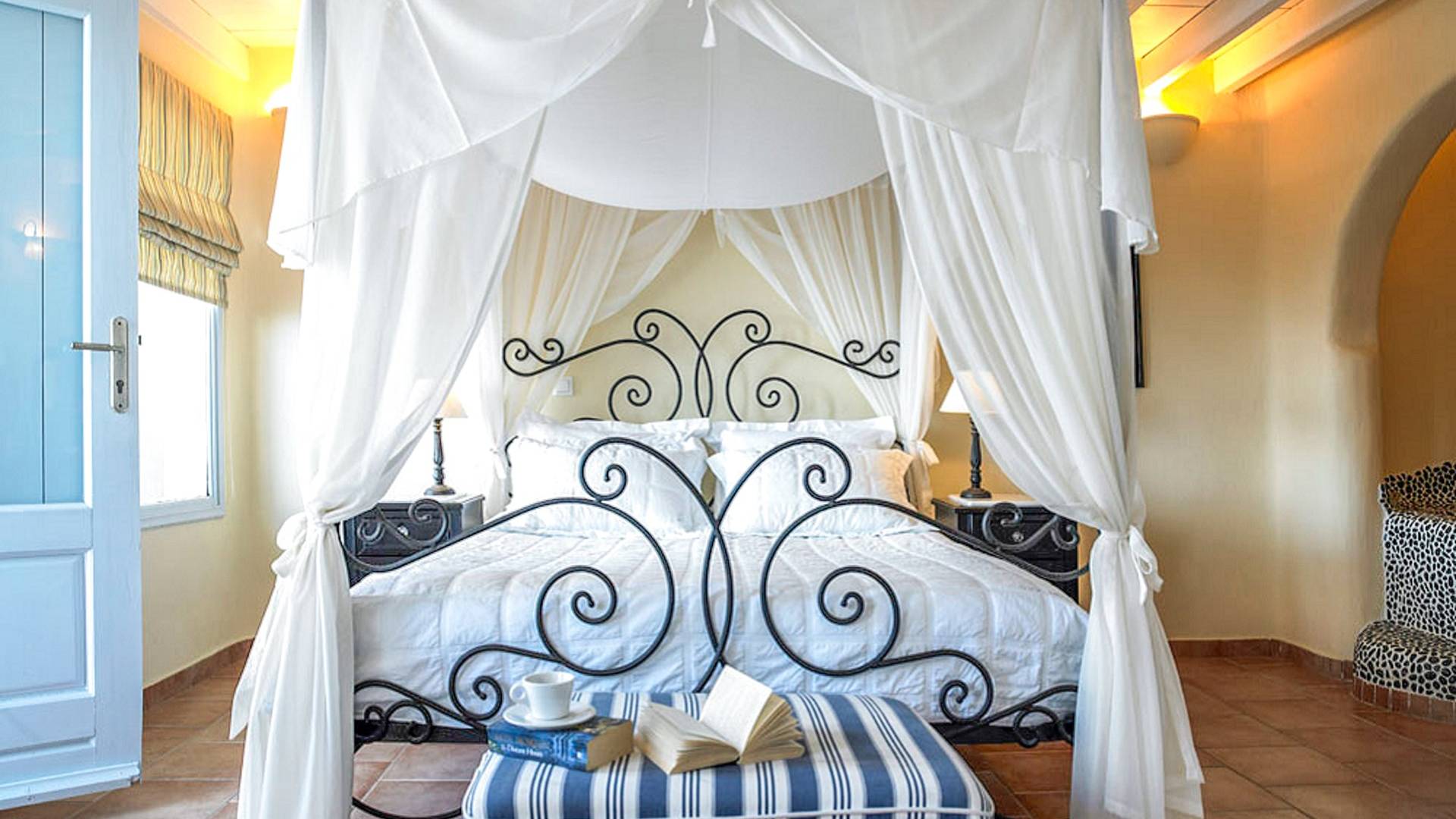Après tout, la suite principale comprend une chambre décloisonnée et une baignoire donnant sur la caldeira, un coin salon, une salle de bains avec douche, une véranda avec vue sur la mer.