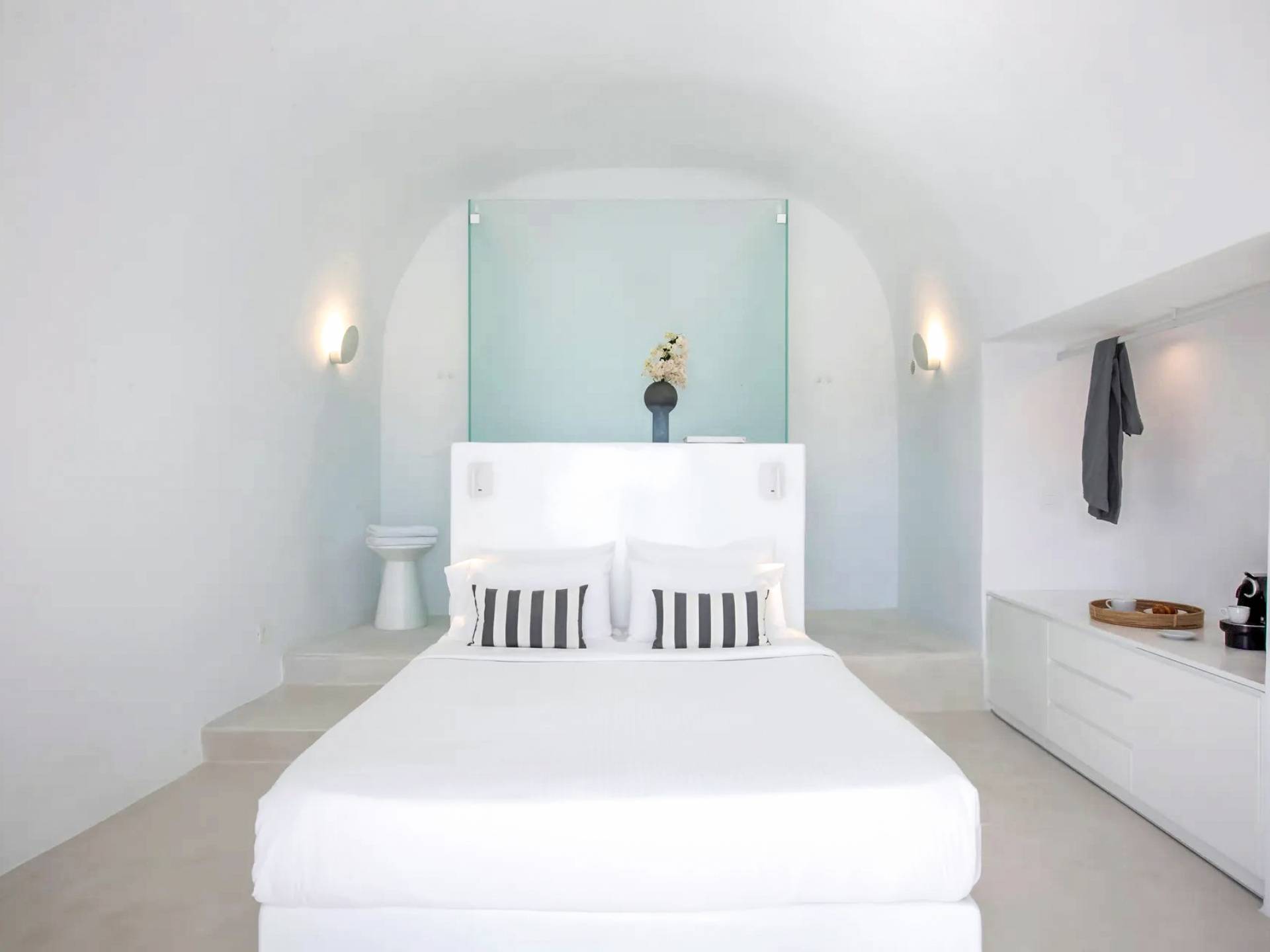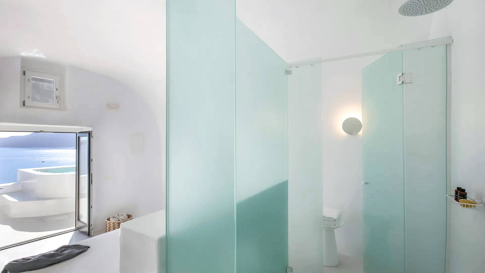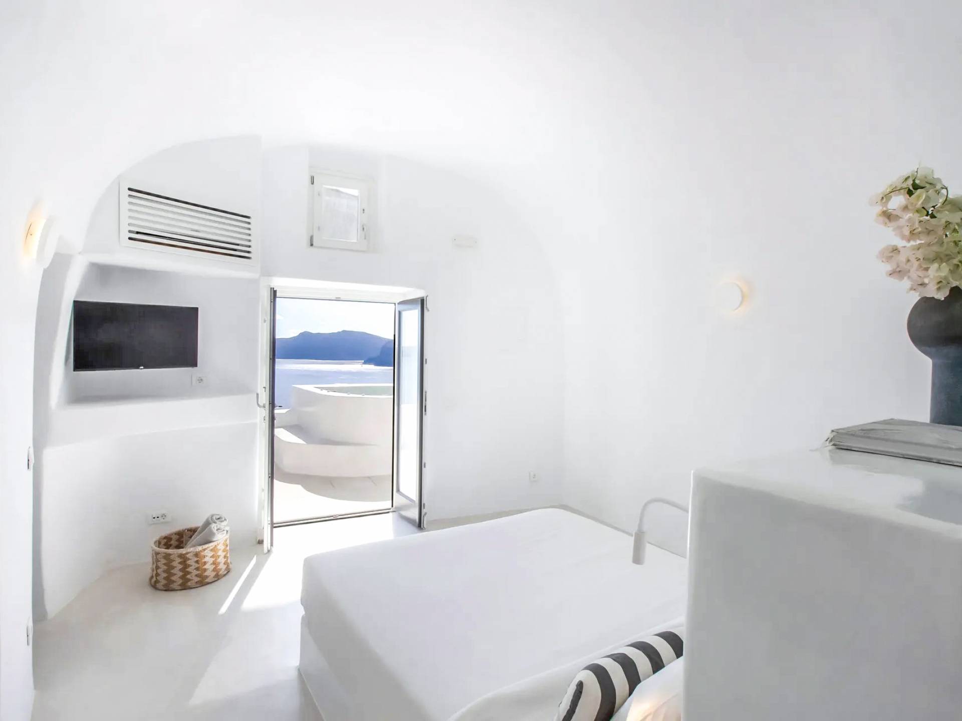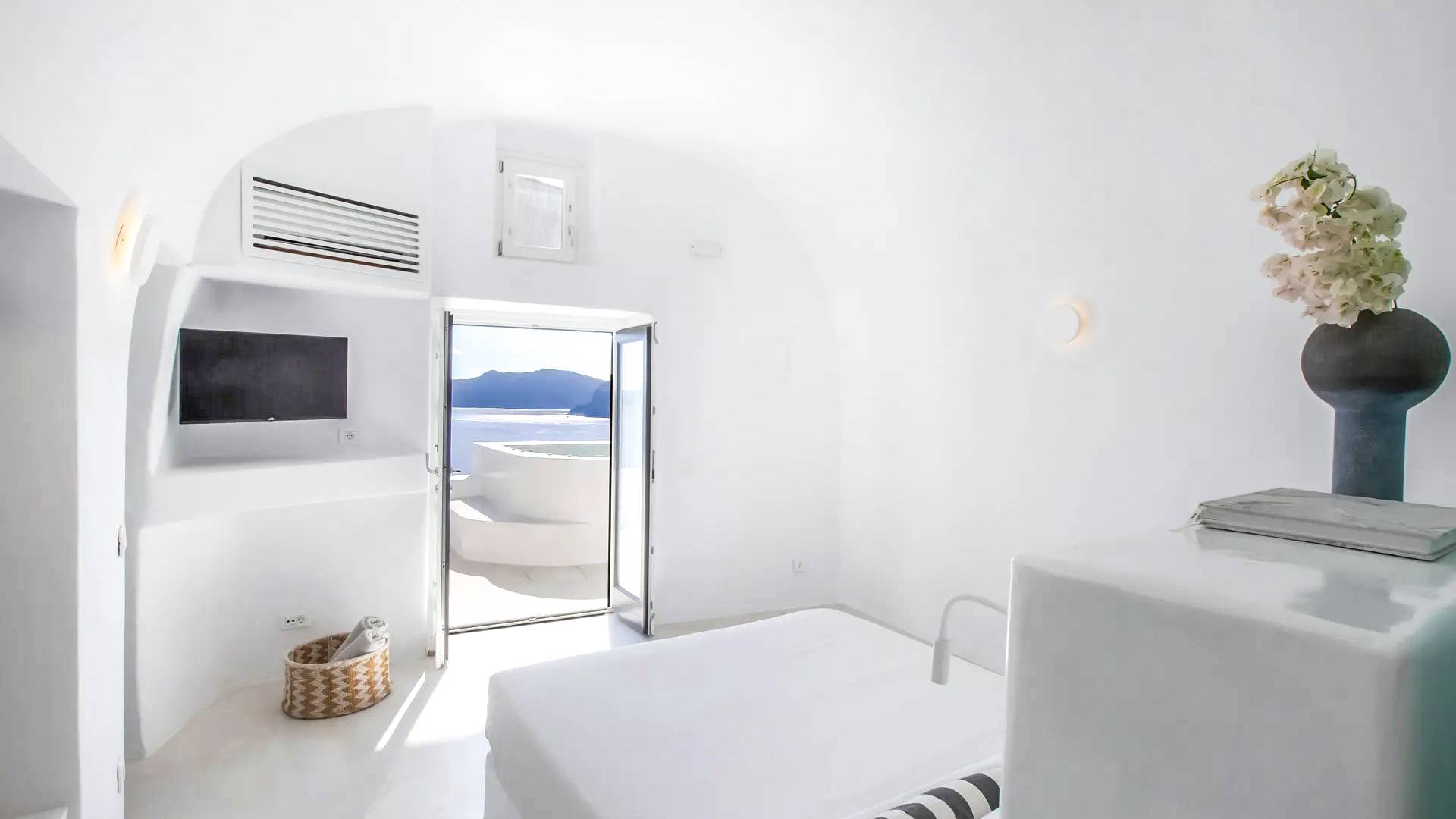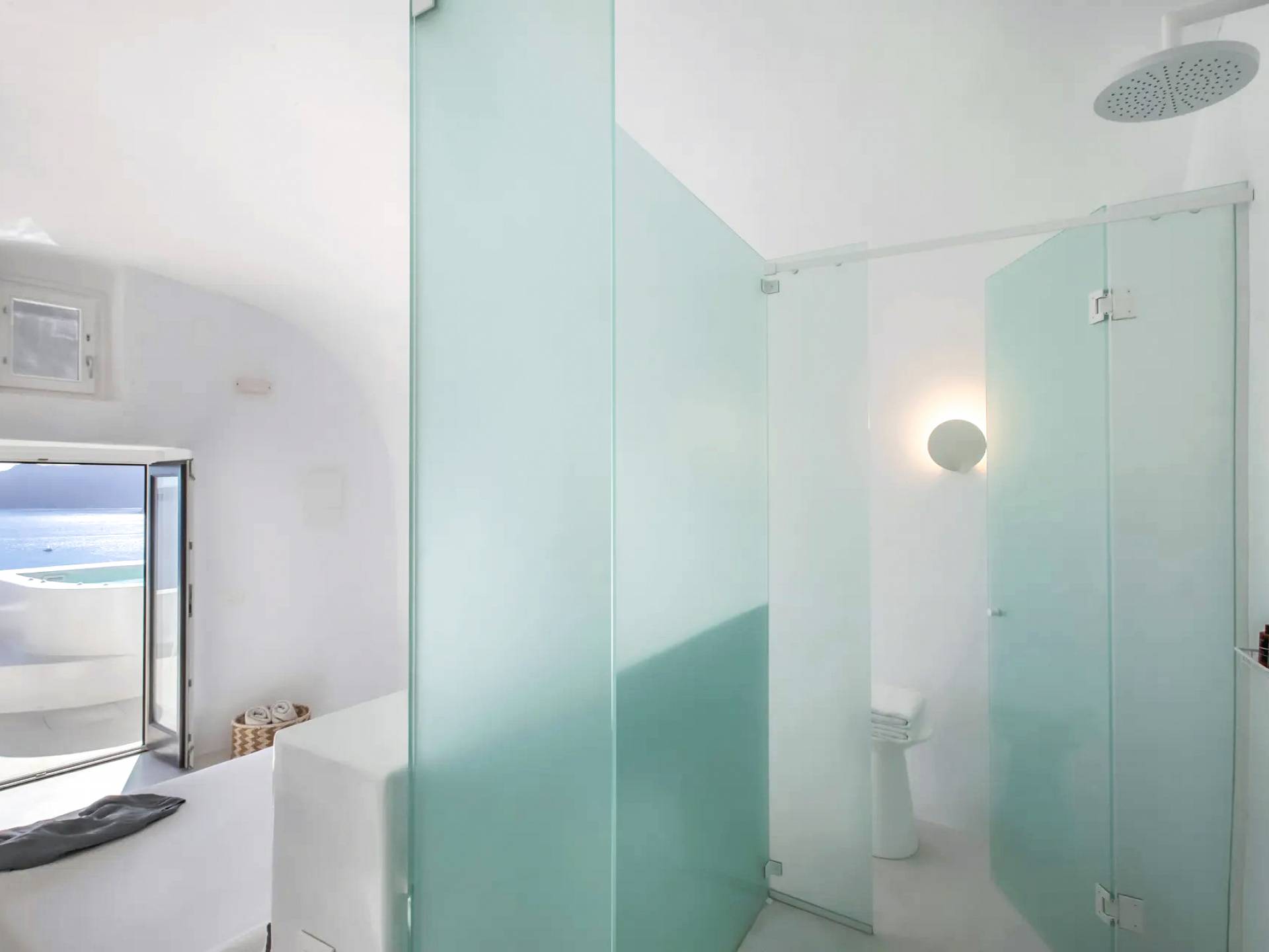 Le patio surplombe la caldeira avec une vue imprenable sur le volcan et la mer Égée en toute intimité, un luxe particulièrement rare compte tenu de la structure architecturale d'Oia. L'histoire de la propriété en tant que canava à vin a également été préservée et des éléments tels qu'un four traditionnel (hors service) et un plateau en verre affichant l'ancienne réserve de vin dans le sol où les raisins pressés étaient conservés sont exposés. L'Apanema Cavehouse comprend une chambre et un coin repas extérieur. La suite se compose d'un lit queen-size. Le grand patio dispose d'un jacuzzi chauffé et de nombreux coins salons pour se détendre et profiter de la vue confortablement.