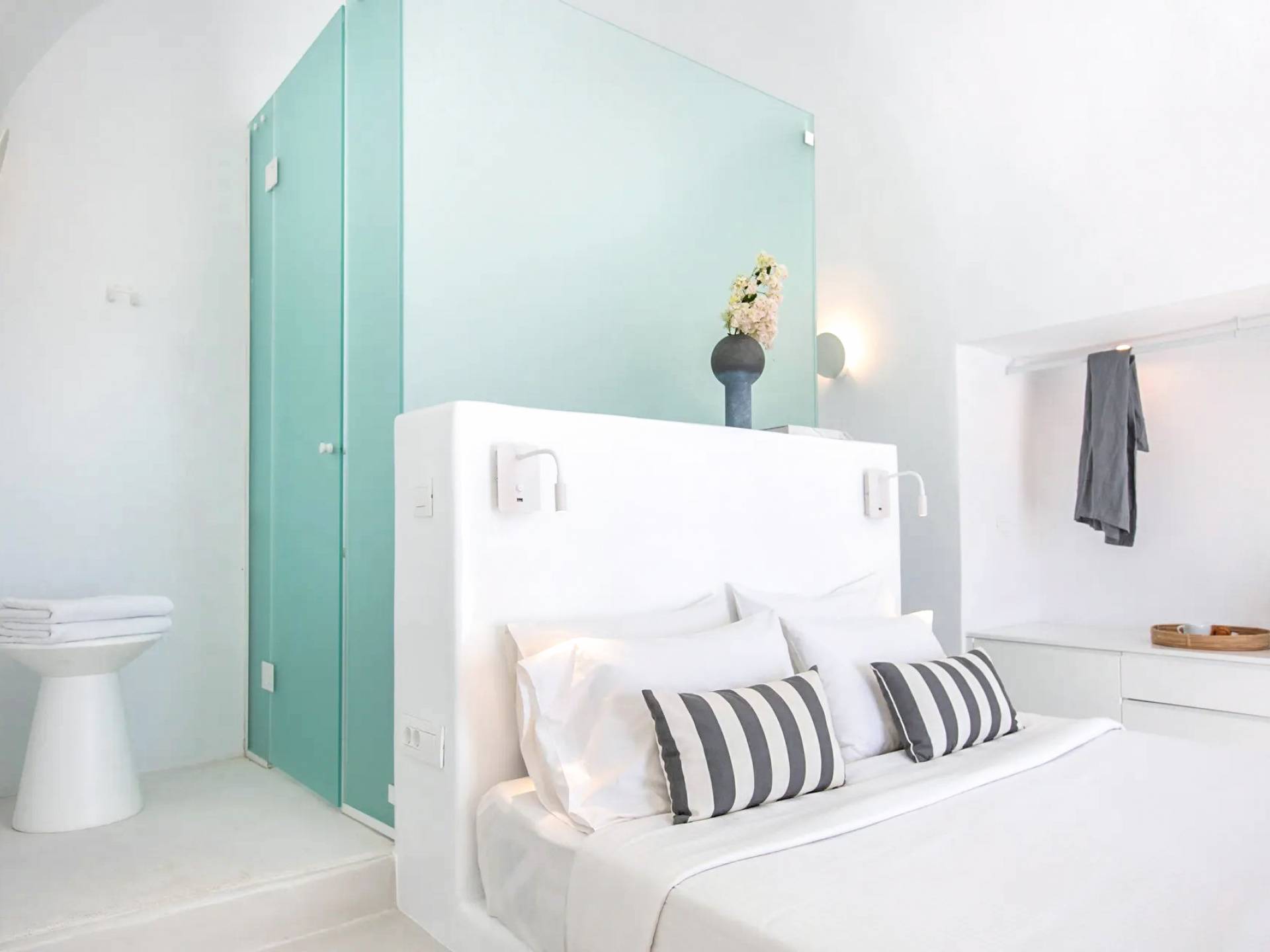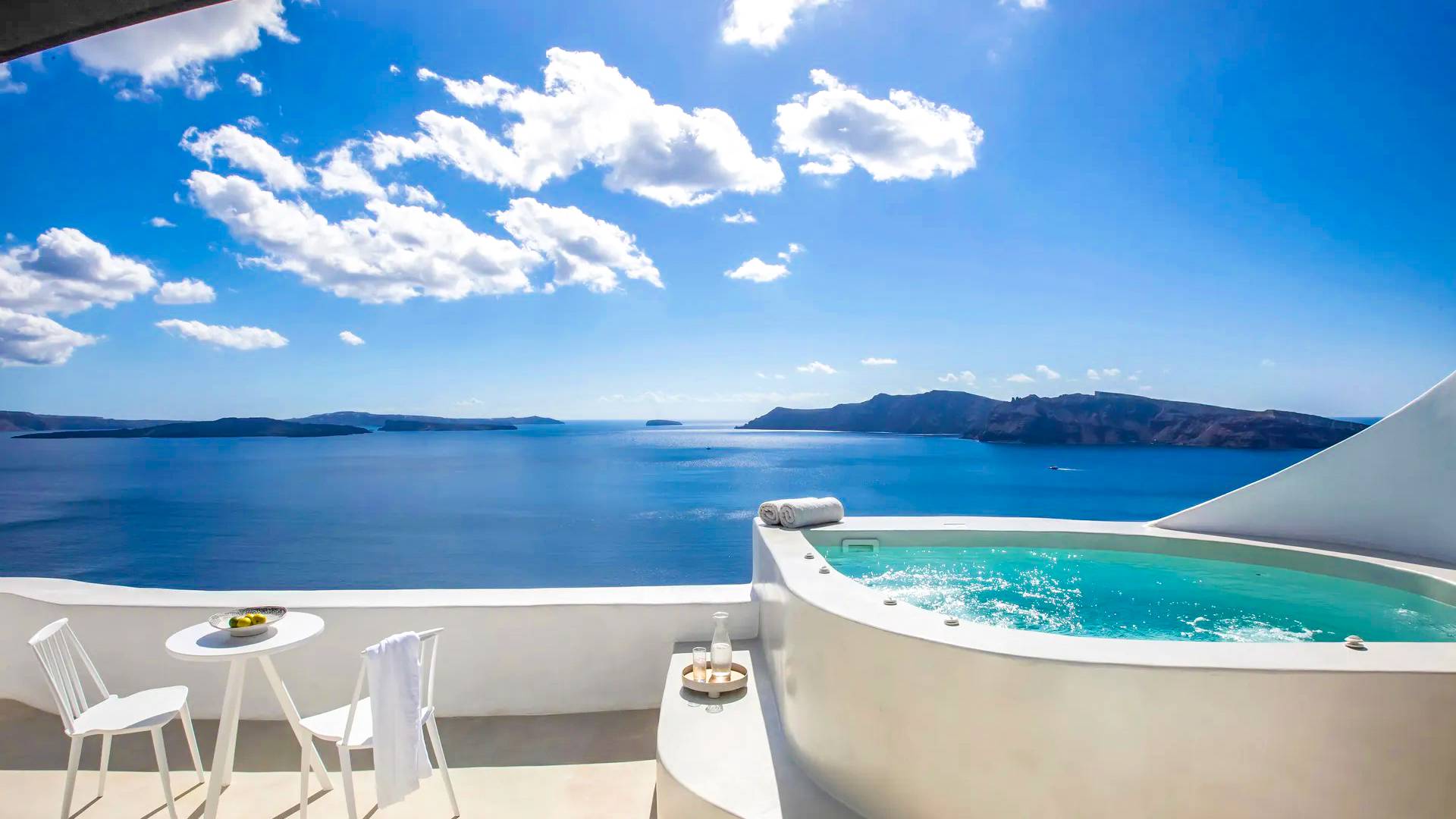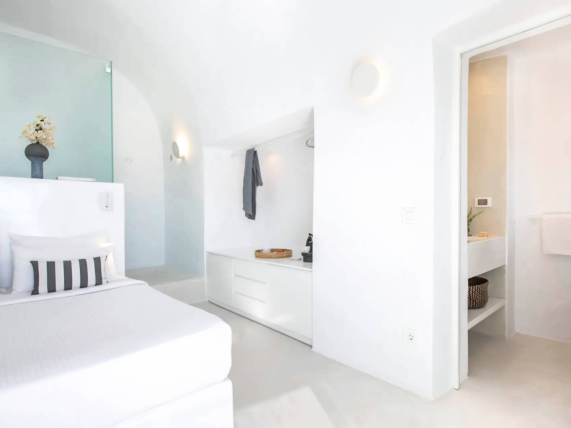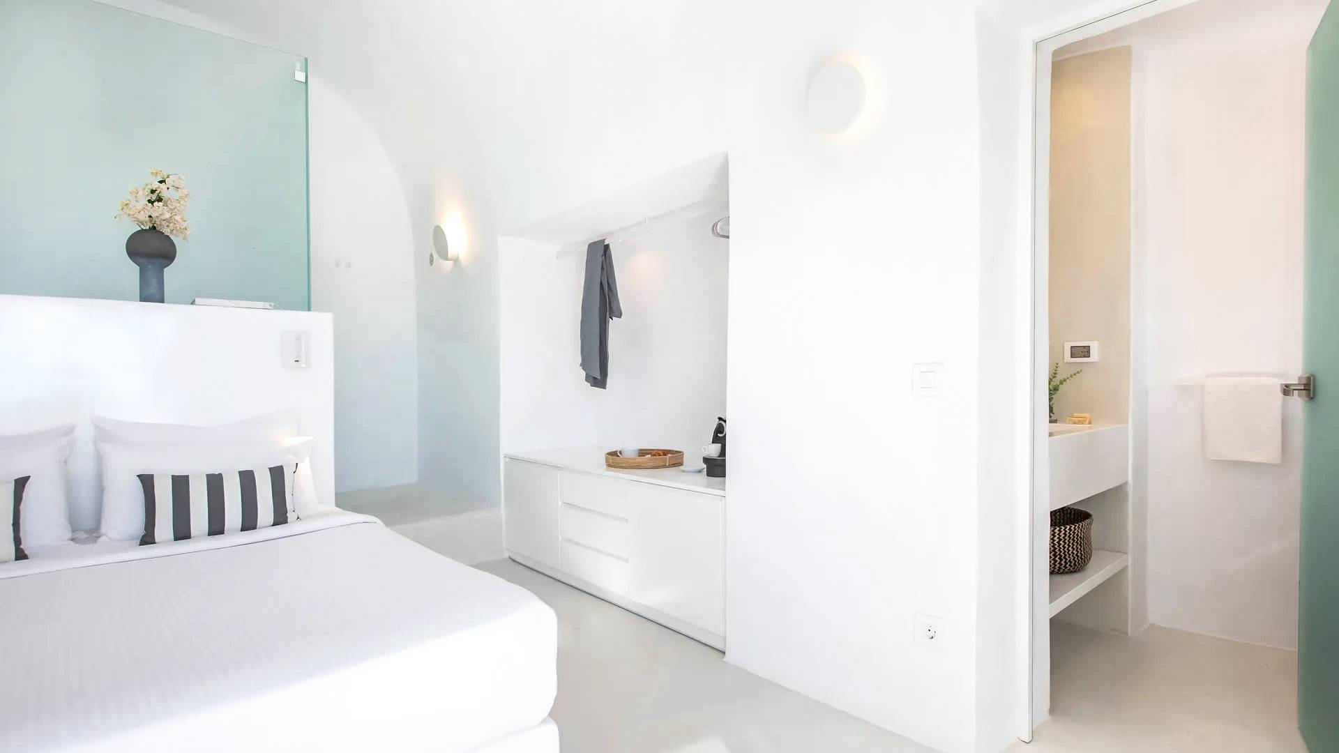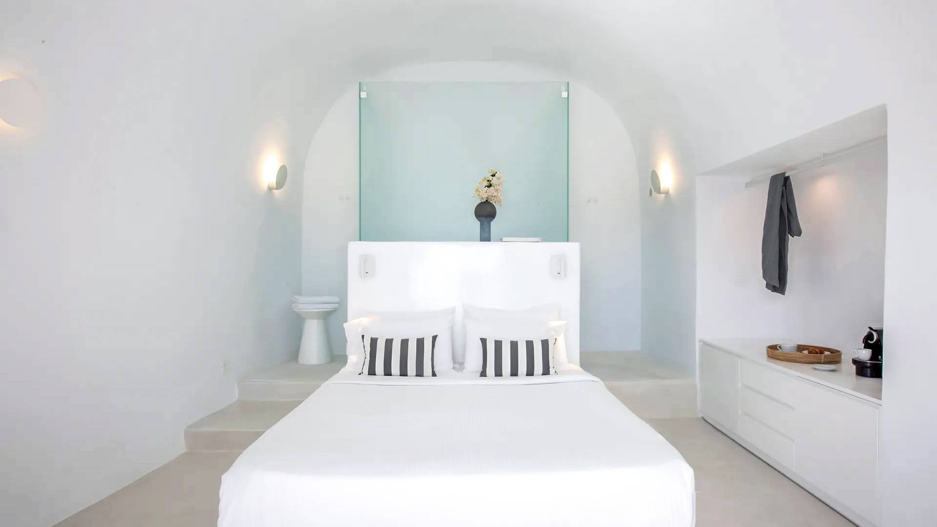 Le patio surplombe la caldeira avec une vue imprenable sur le volcan et la mer Égée en toute intimité, un luxe particulièrement rare compte tenu de la structure architecturale d'Oia. L'histoire de la propriété en tant que canava à vin a également été préservée et des éléments tels qu'un four traditionnel (hors service) et un plateau en verre affichant l'ancienne réserve de vin dans le sol où les raisins pressés étaient conservés sont exposés. L'Apanema Cavehouse comprend une chambre et un coin repas extérieur. La suite se compose d'un lit queen-size. Le grand patio dispose d'un jacuzzi chauffé et de nombreux coins salons pour se détendre et profiter de la vue confortablement.