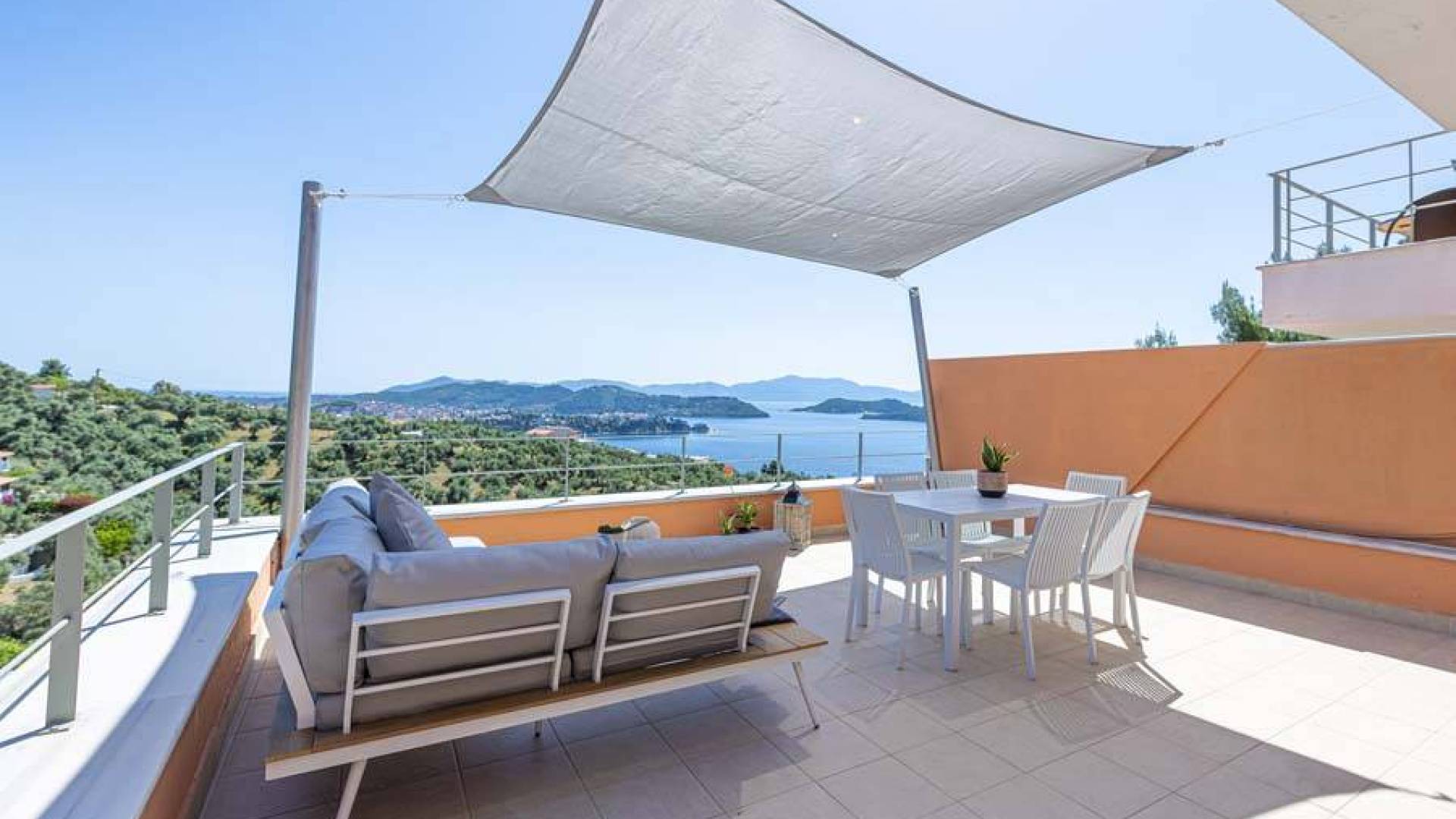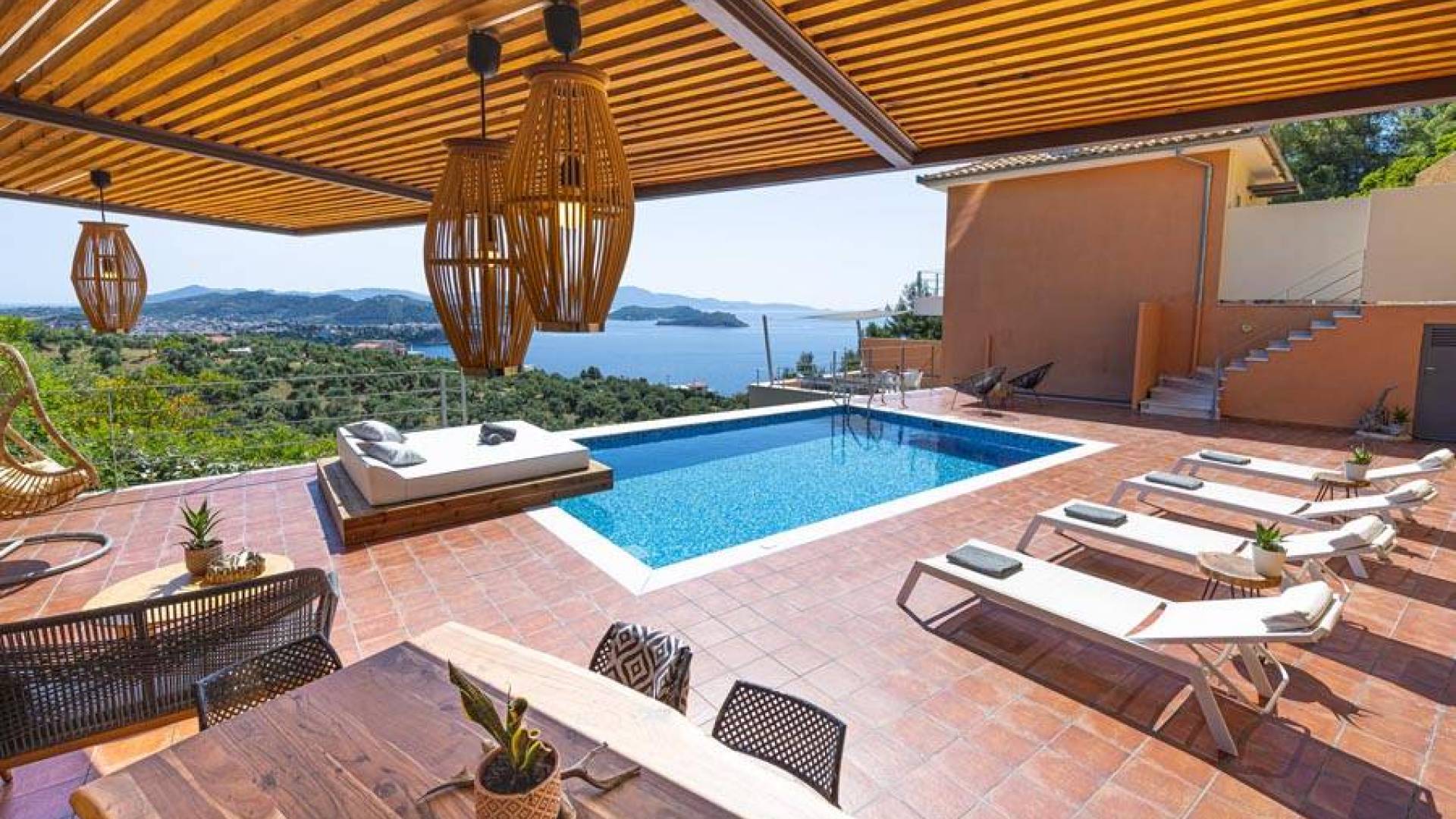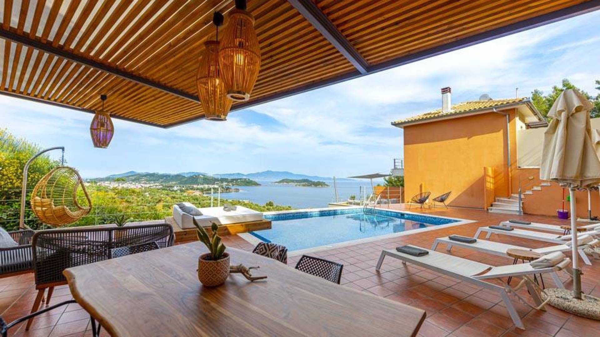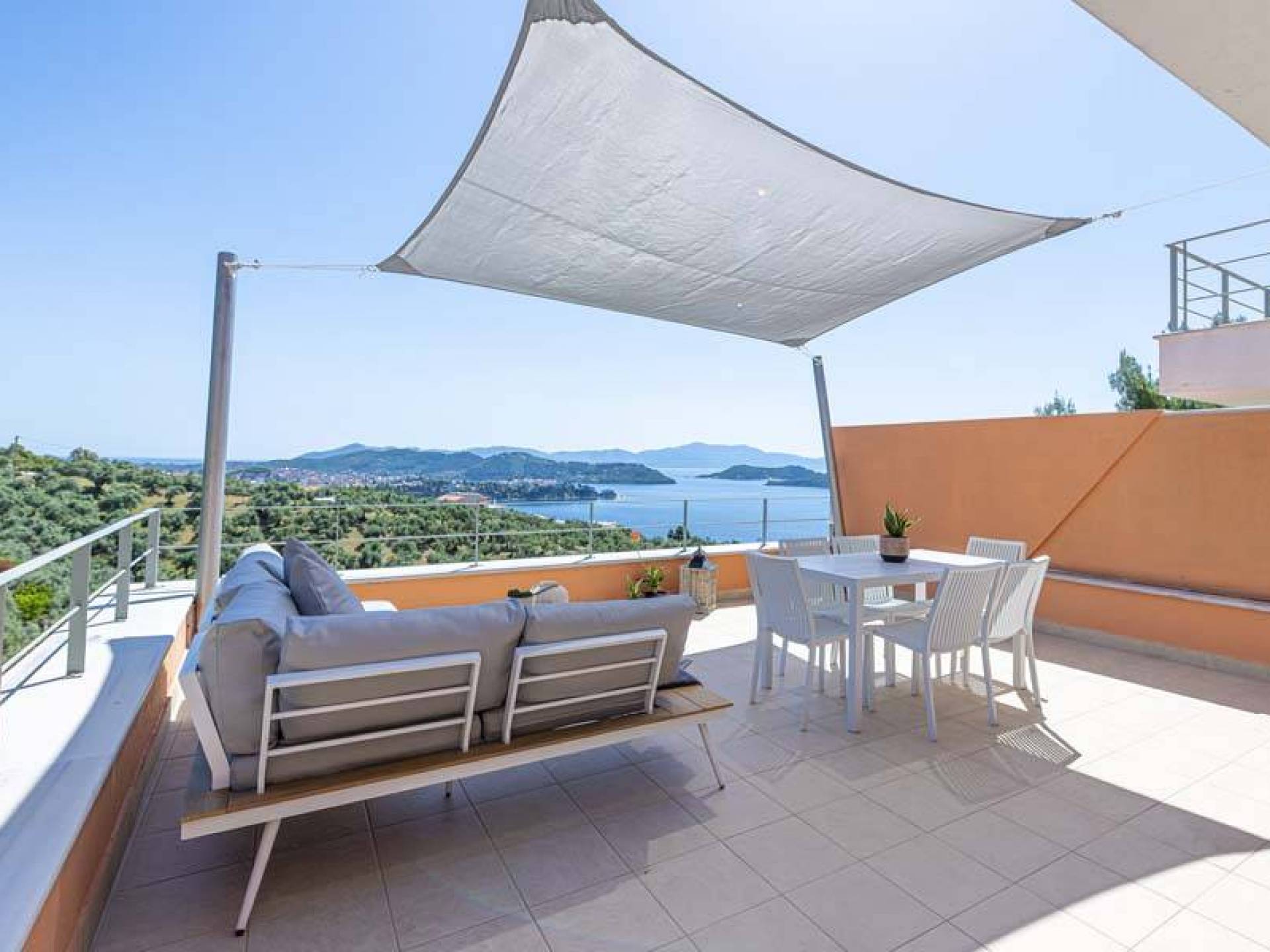 En bas, au rez-de-chaussée, vous trouverez une cuisine moderne entièrement équipée, un coin repas avec une grande table à manger moderne, un salon avec des canapés confortables et une agréable cheminée. Les canapés la nuit peuvent devenir un lit double et un lit simple, donc jusqu'à sept personnes peuvent dormir. Il y a aussi une belle salle de bain luxueuse et relaxante avec une baignoire. Le rez-de-chaussée mène à une spacieuse véranda face à la mer avec une vue mer exceptionnelle. Des meubles de jardin avec un grand parasol sont fournis. Occupants d'Io, profitez de l'usage exclusif d'une piscine privée (5x7x1,5m nichée sur un espace privatif de 100m² qui offre généreusement une superbe vue mer également. Un bbq maçonné est également à votre disposition.