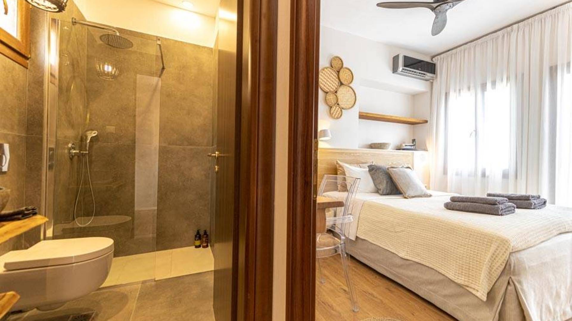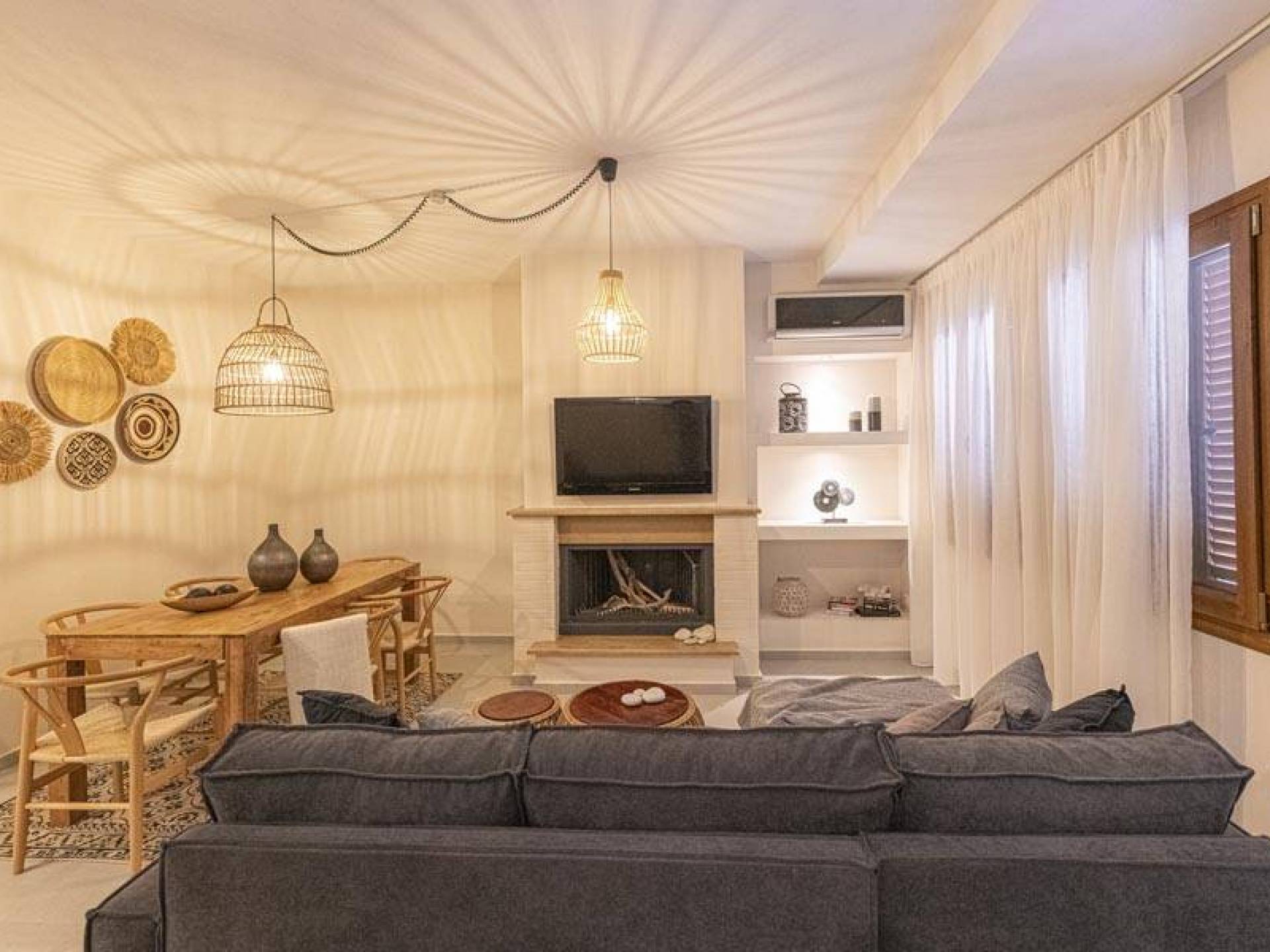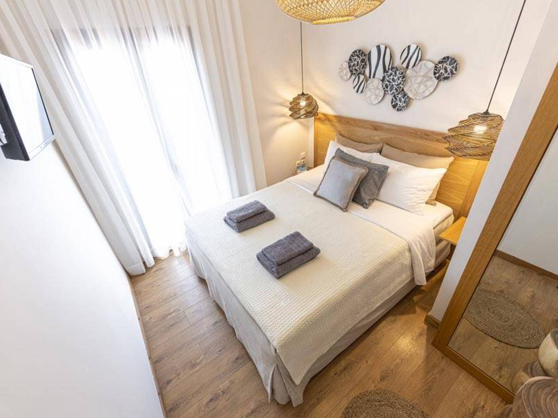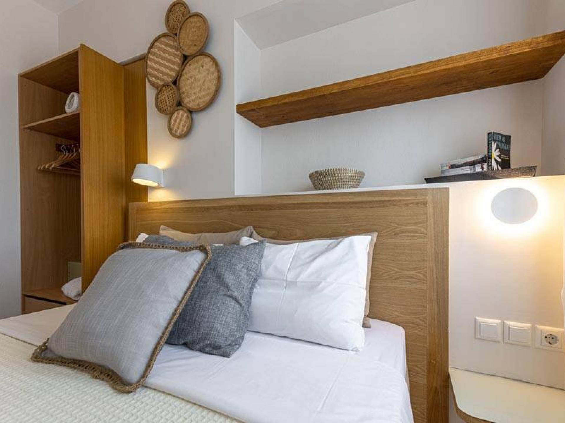 En bas, au rez-de-chaussée, vous trouverez une cuisine moderne entièrement équipée, un coin repas avec une grande table à manger moderne, un salon avec des canapés confortables et une agréable cheminée. Les canapés la nuit peuvent devenir un lit double et un lit simple, donc jusqu'à sept personnes peuvent dormir. Il y a aussi une belle salle de bain luxueuse et relaxante avec une baignoire. Le rez-de-chaussée mène à une spacieuse véranda face à la mer avec une vue mer exceptionnelle. Des meubles de jardin avec un grand parasol sont fournis. Occupants d'Io, profitez de l'usage exclusif d'une piscine privée (5x7x1,5m nichée sur un espace privatif de 100m² qui offre généreusement une superbe vue mer également. Un bbq maçonné est également à votre disposition.