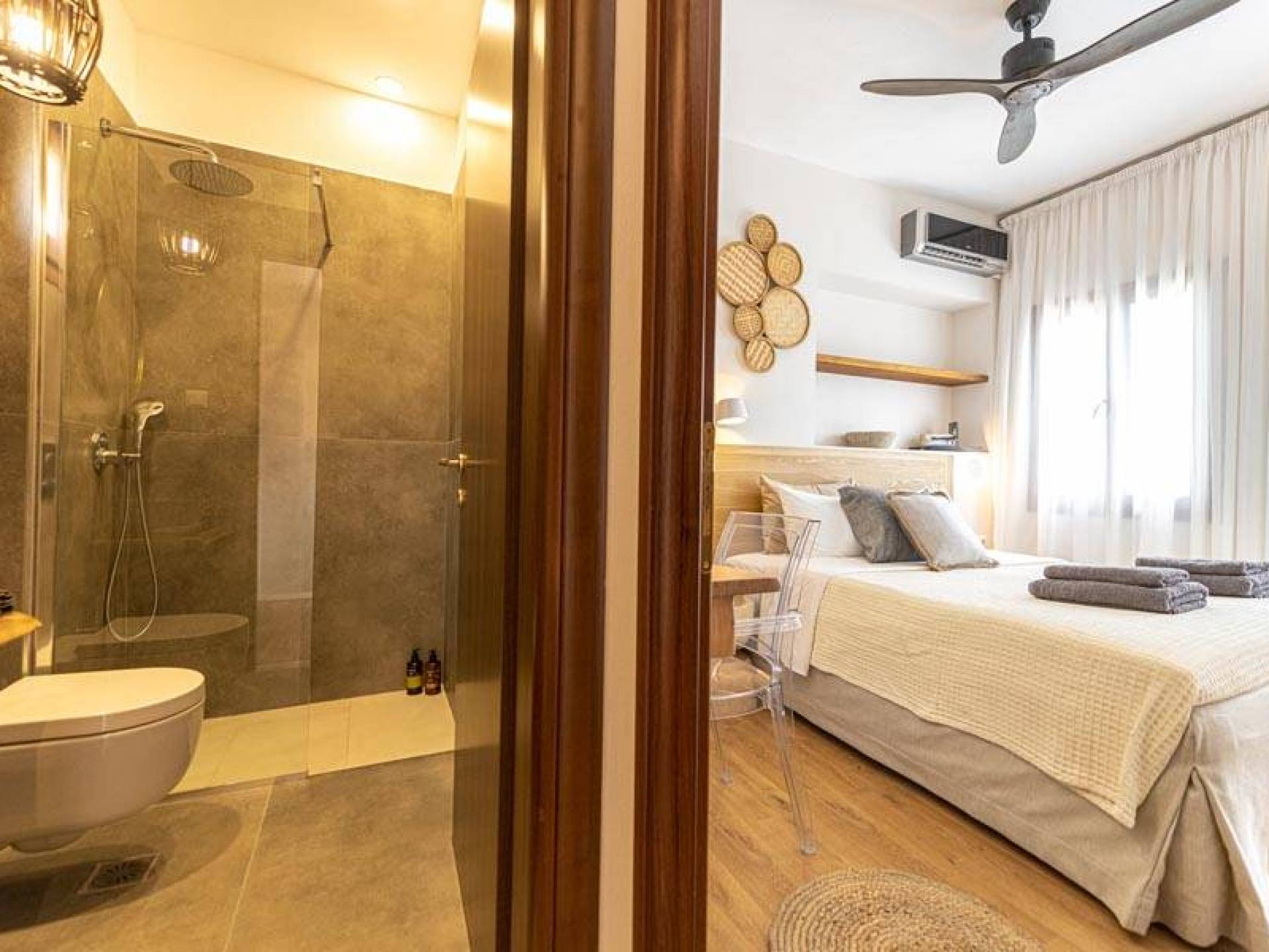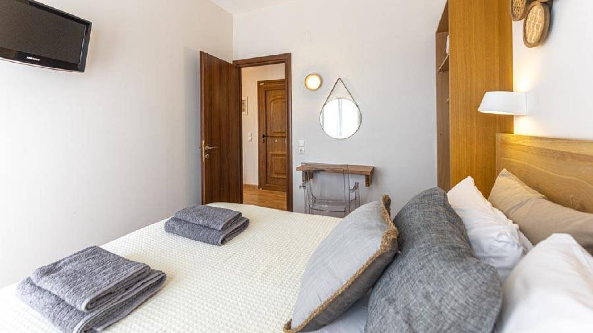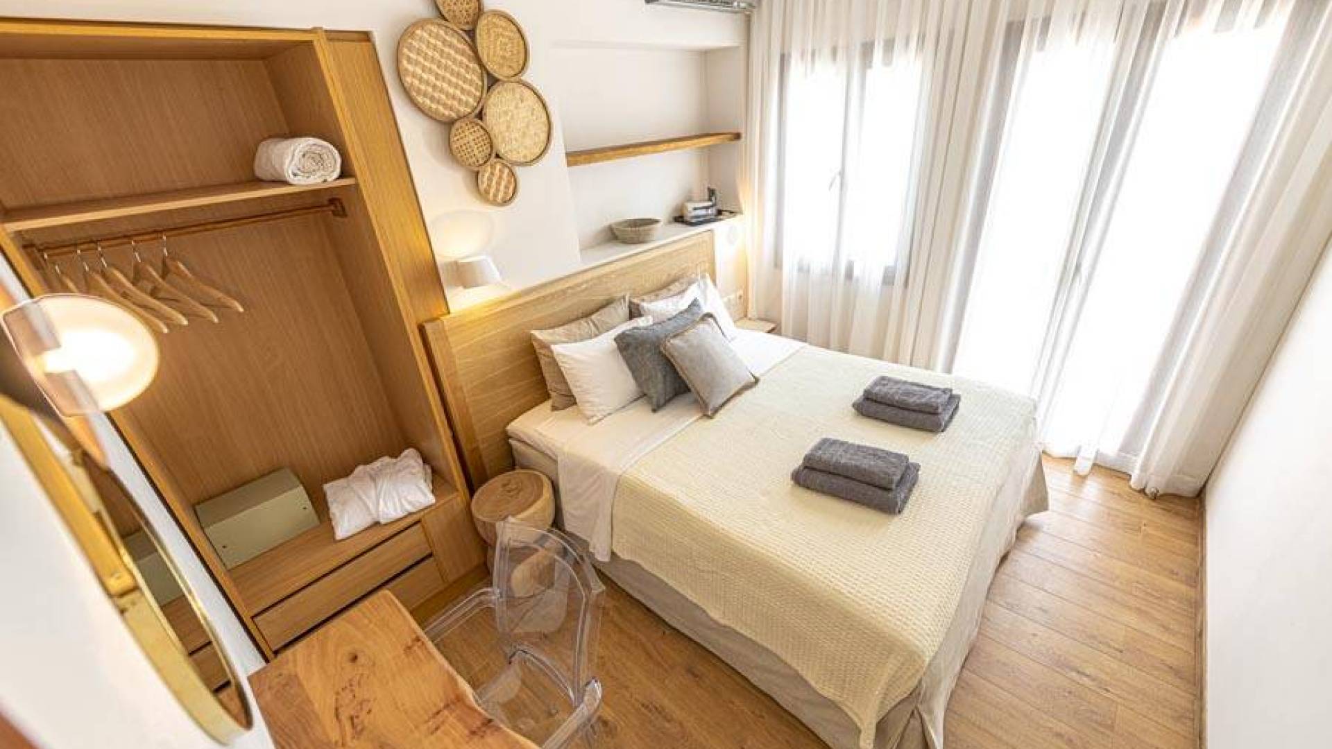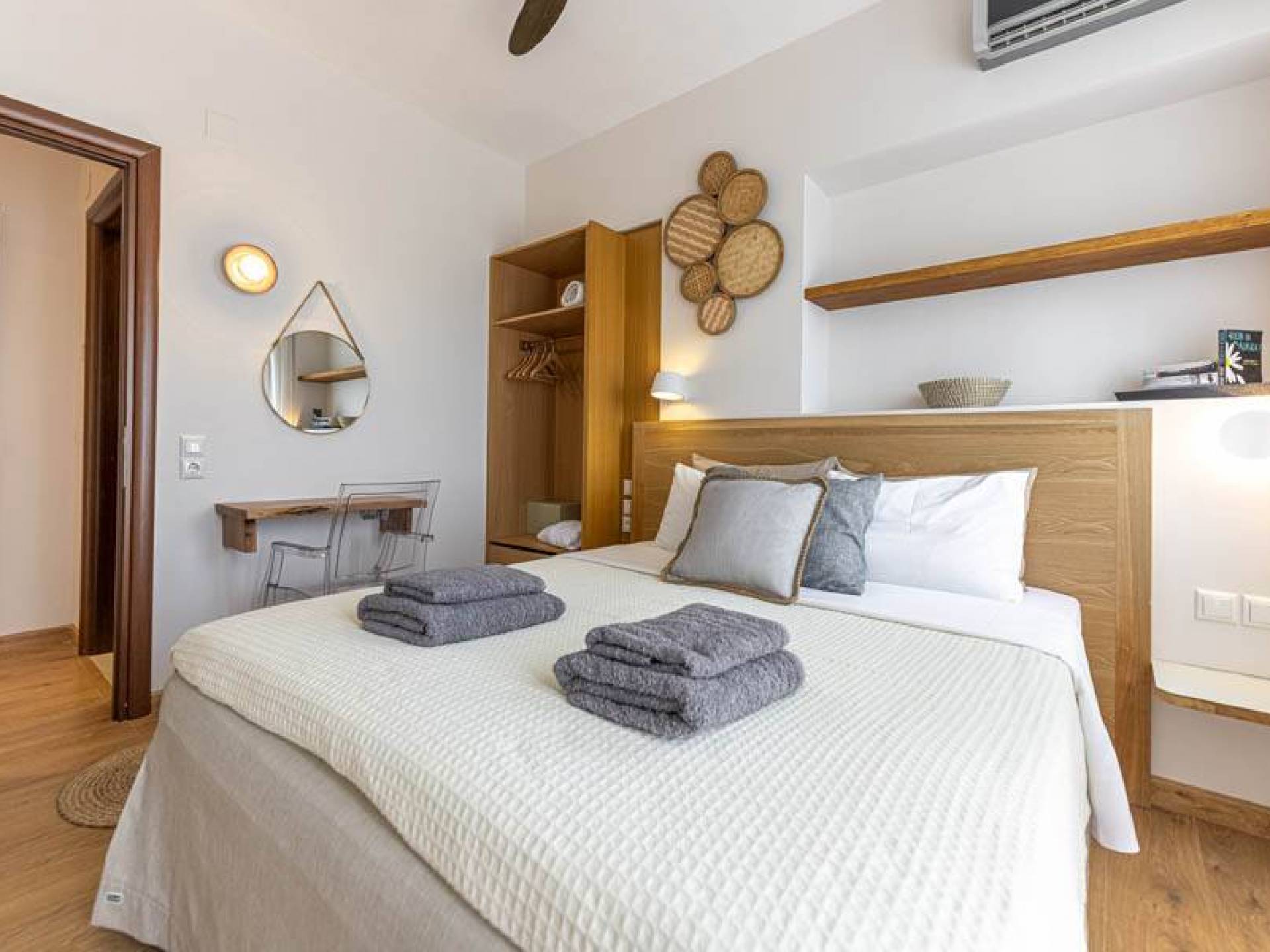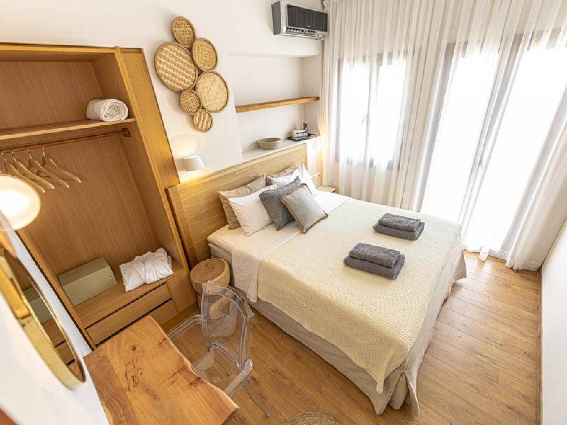 En bas, au rez-de-chaussée, vous trouverez une cuisine moderne entièrement équipée, un coin repas avec une grande table à manger moderne, un salon avec des canapés confortables et une agréable cheminée. Les canapés la nuit peuvent devenir un lit double et un lit simple, donc jusqu'à sept personnes peuvent dormir. Il y a aussi une belle salle de bain luxueuse et relaxante avec une baignoire. Le rez-de-chaussée mène à une spacieuse véranda face à la mer avec une vue mer exceptionnelle. Des meubles de jardin avec un grand parasol sont fournis. Occupants d'Io, profitez de l'usage exclusif d'une piscine privée (5x7x1,5m nichée sur un espace privatif de 100m² qui offre généreusement une superbe vue mer également. Un bbq maçonné est également à votre disposition.