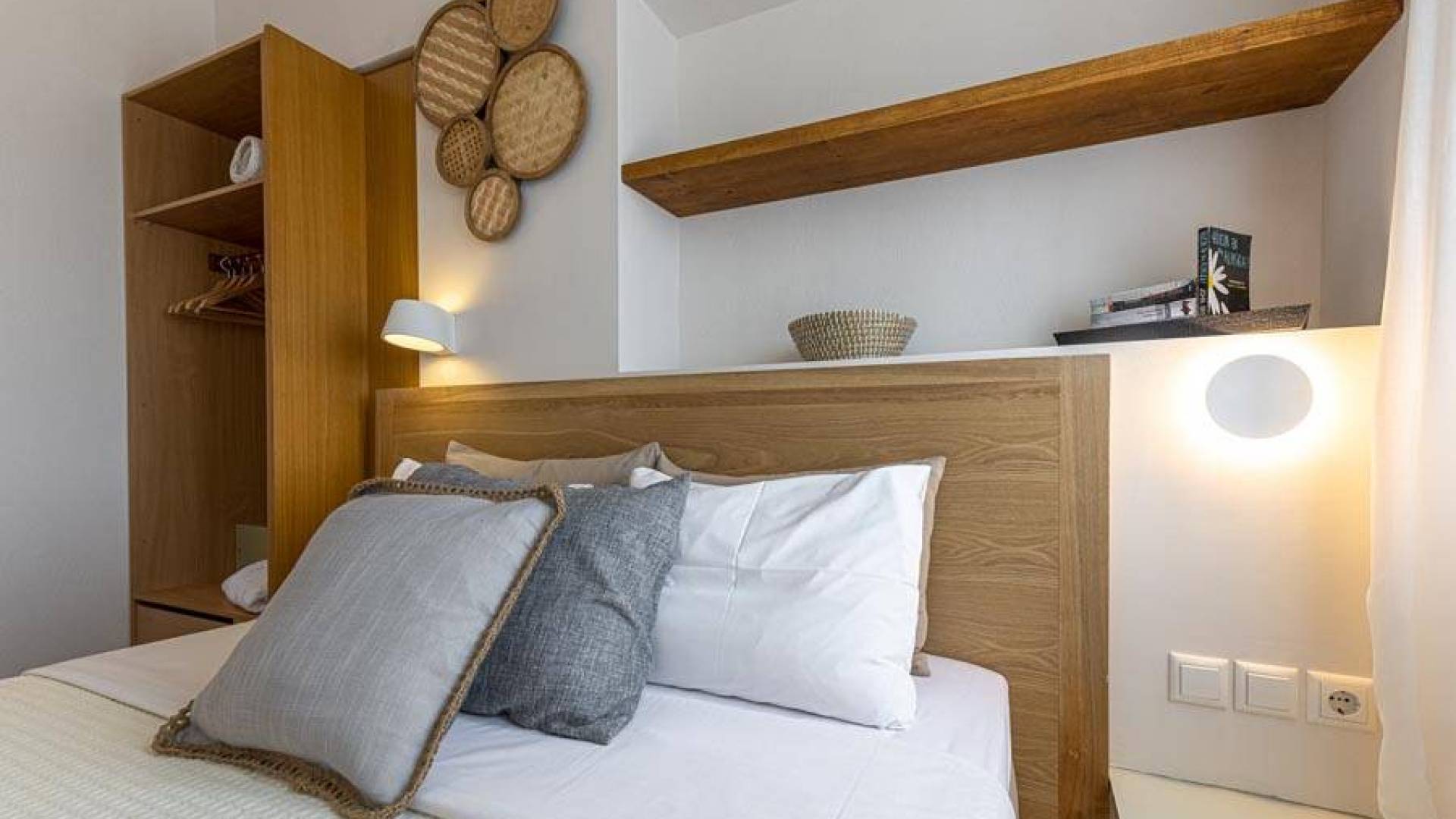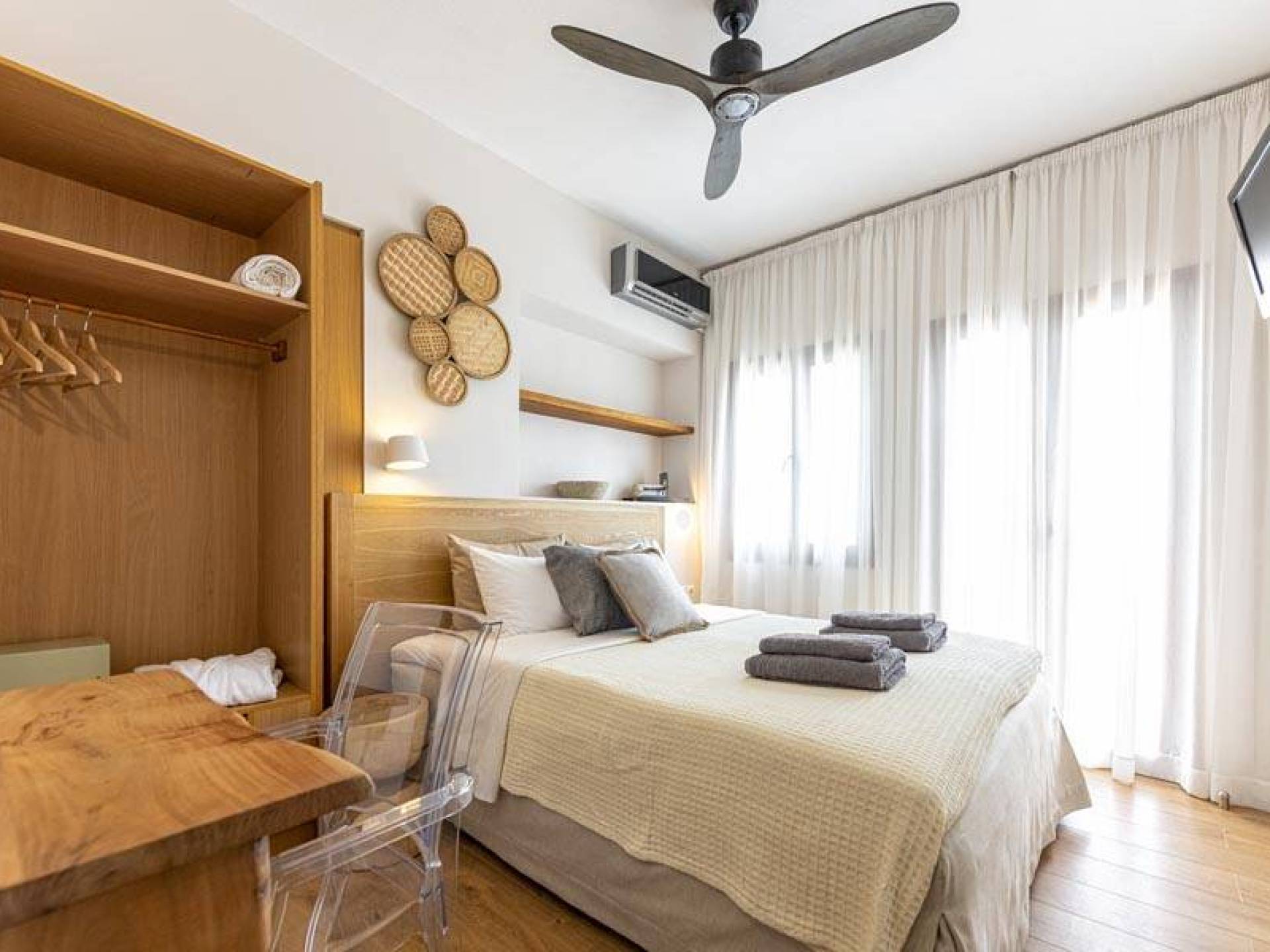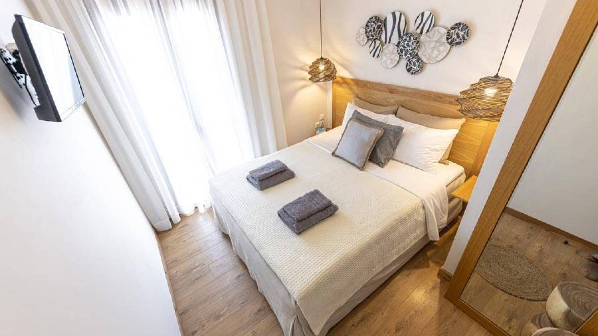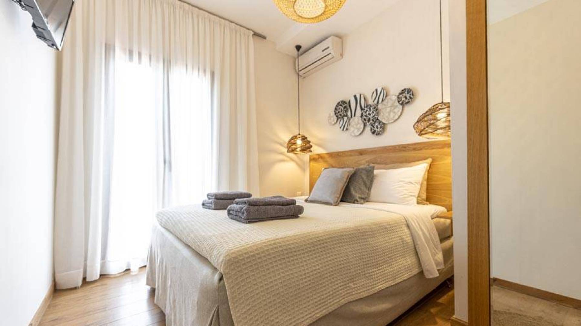 En bas, au rez-de-chaussée, vous trouverez une cuisine moderne entièrement équipée, un coin repas avec une grande table à manger moderne, un salon avec des canapés confortables et une agréable cheminée. Les canapés la nuit peuvent devenir un lit double et un lit simple, donc jusqu'à sept personnes peuvent dormir. Il y a aussi une belle salle de bain luxueuse et relaxante avec une baignoire. Le rez-de-chaussée mène à une spacieuse véranda face à la mer avec une vue mer exceptionnelle. Des meubles de jardin avec un grand parasol sont fournis. Occupants d'Io, profitez de l'usage exclusif d'une piscine privée (5x7x1,5m nichée sur un espace privatif de 100m² qui offre généreusement une superbe vue mer également. Un bbq maçonné est également à votre disposition.