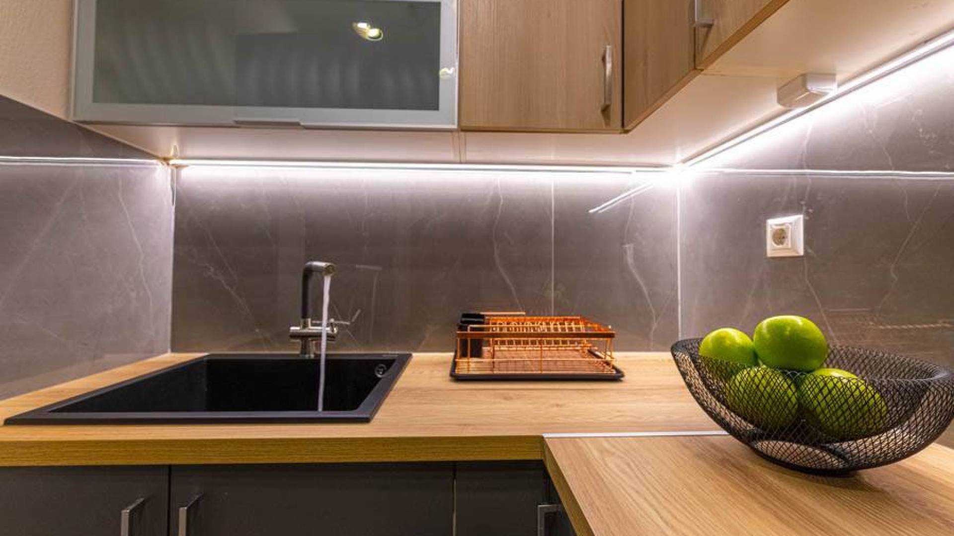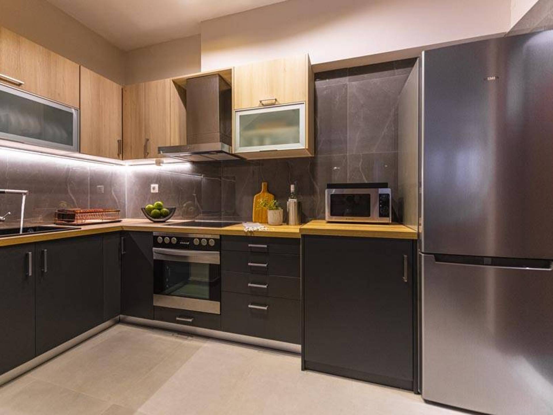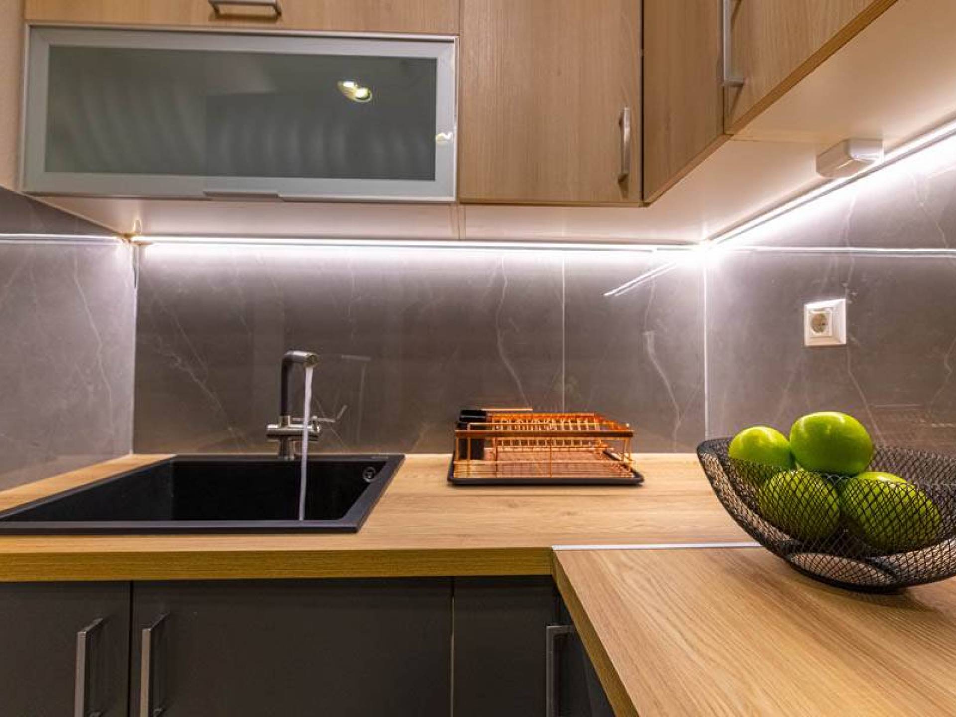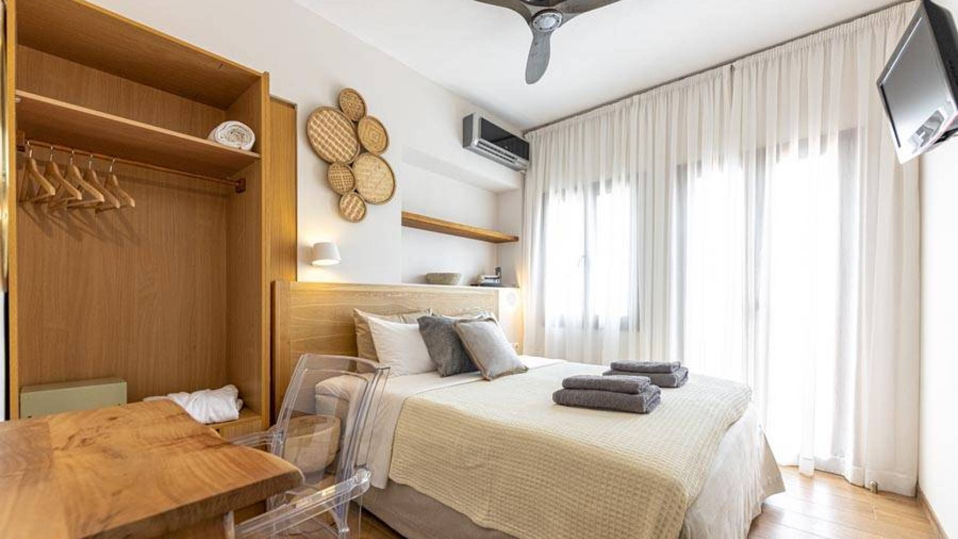 En bas, au rez-de-chaussée, vous trouverez une cuisine moderne entièrement équipée, un coin repas avec une grande table à manger moderne, un salon avec des canapés confortables et une agréable cheminée. Les canapés la nuit peuvent devenir un lit double et un lit simple, donc jusqu'à sept personnes peuvent dormir. Il y a aussi une belle salle de bain luxueuse et relaxante avec une baignoire. Le rez-de-chaussée mène à une spacieuse véranda face à la mer avec une vue mer exceptionnelle. Des meubles de jardin avec un grand parasol sont fournis. Occupants d'Io, profitez de l'usage exclusif d'une piscine privée (5x7x1,5m nichée sur un espace privatif de 100m² qui offre généreusement une superbe vue mer également. Un bbq maçonné est également à votre disposition.