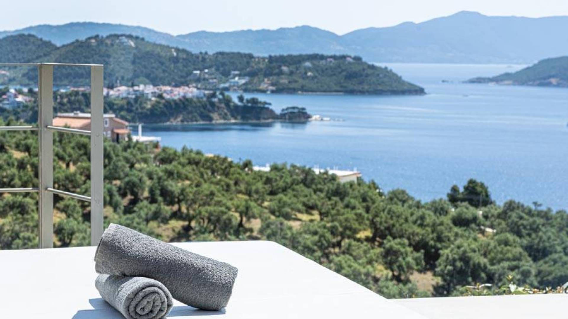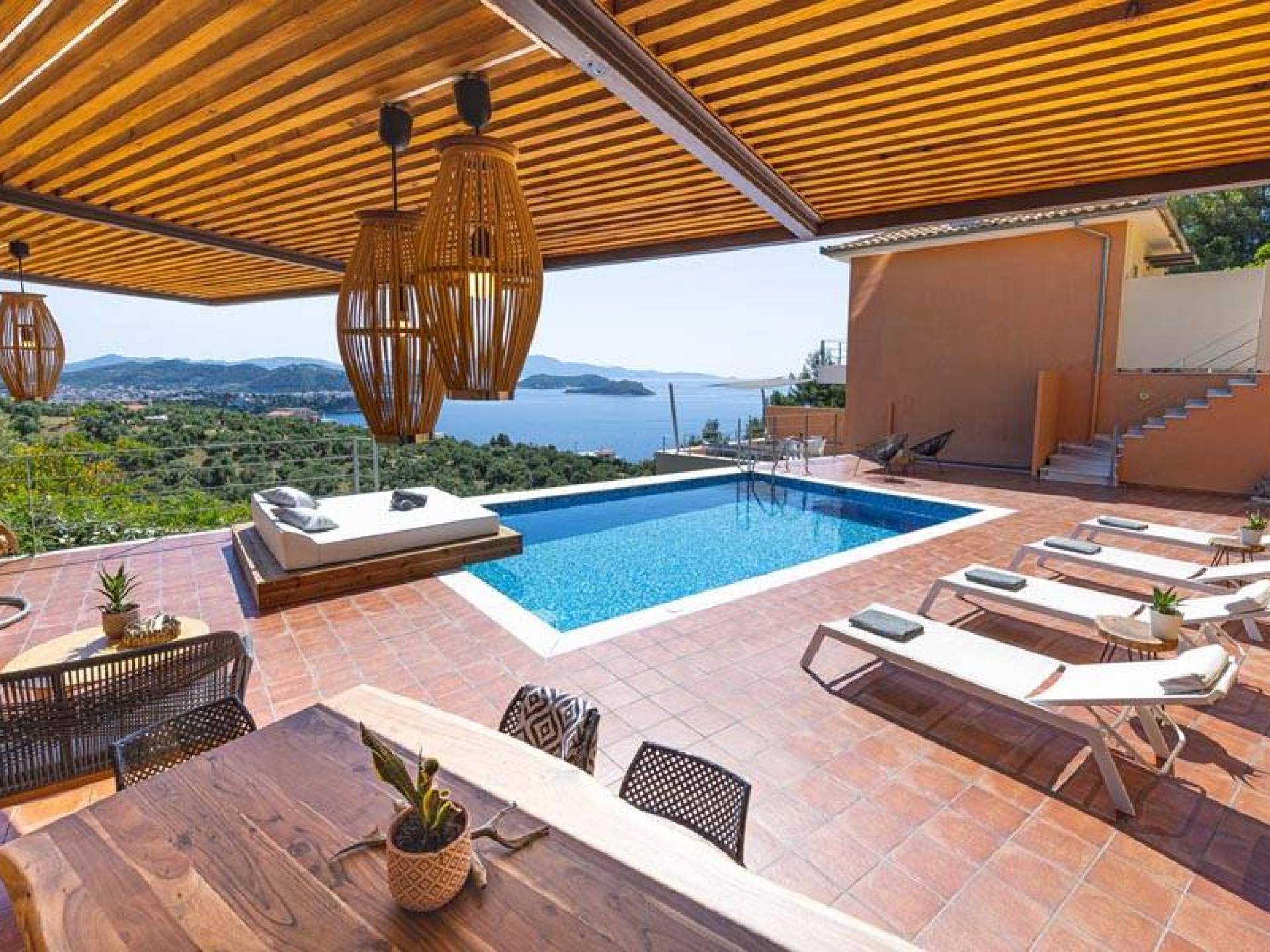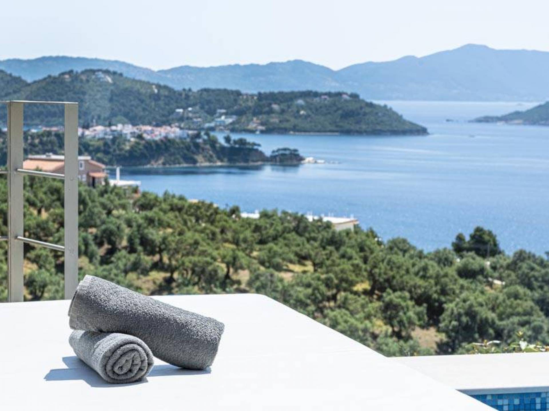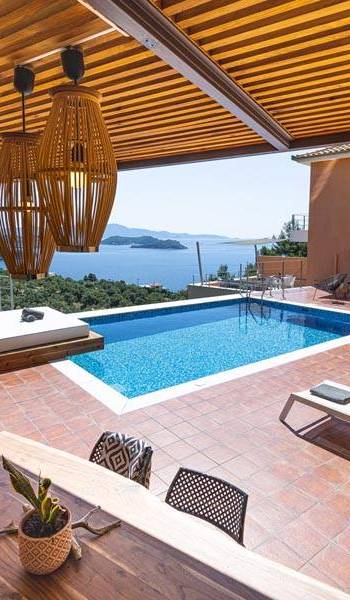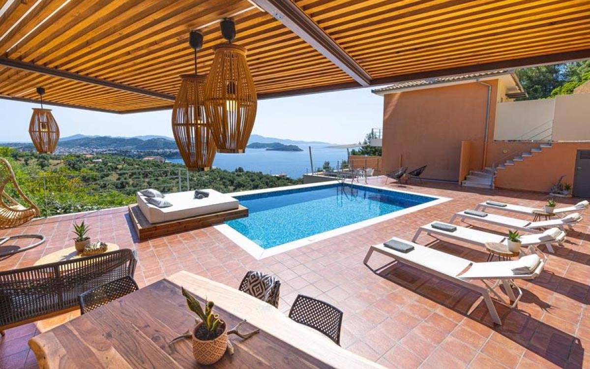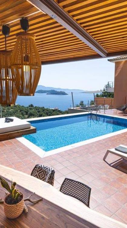 Villa Io Skiathos est une location de villa de luxe avec 2 chambres et une piscine privée. En entrant au dernier étage de la villa Io, le grand espace de 45 m² se compose de deux chambres séparées avec un lit double queen chacune avec une salle de bain entièrement équipée et un joli balcon face à la mer.