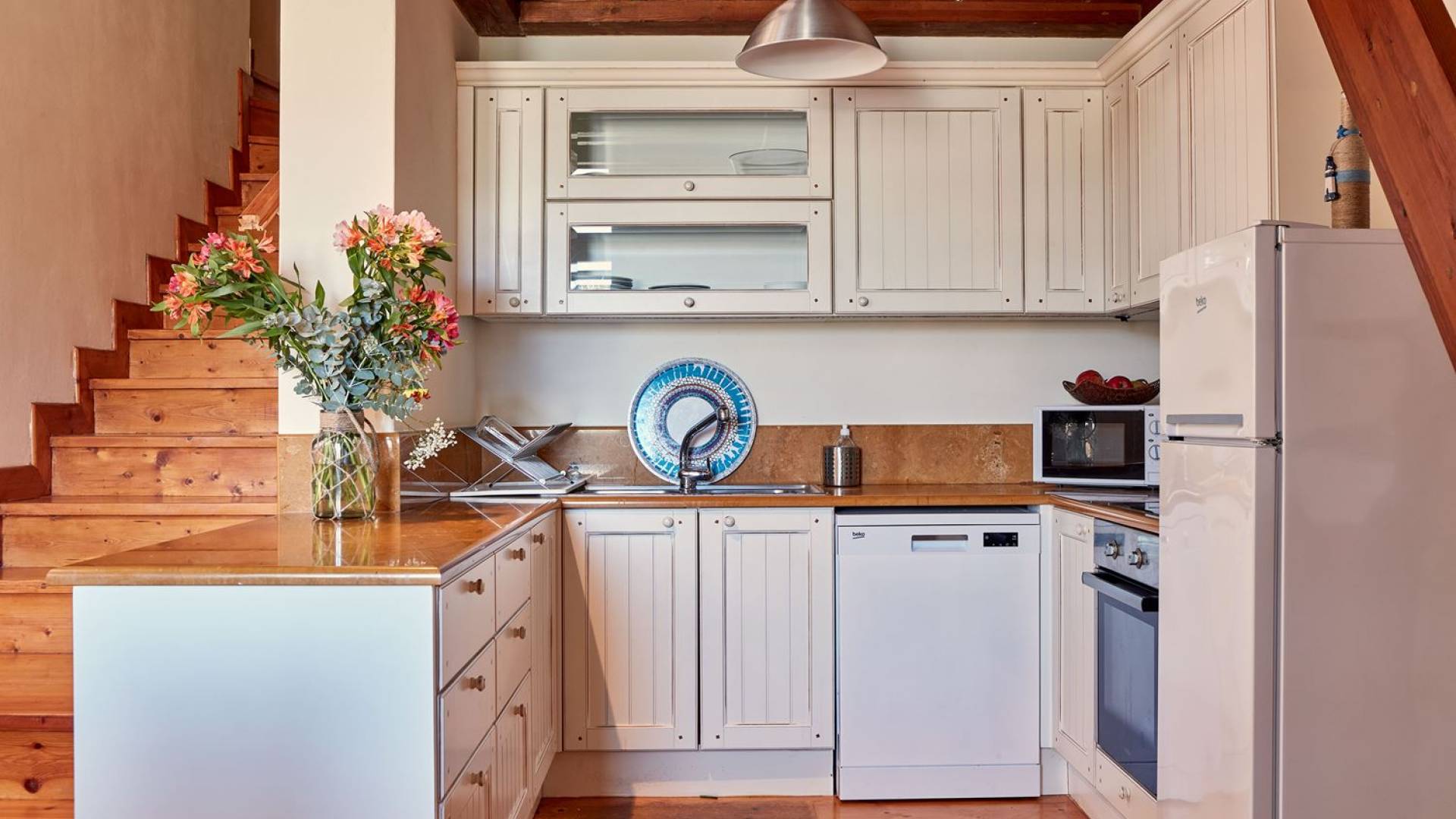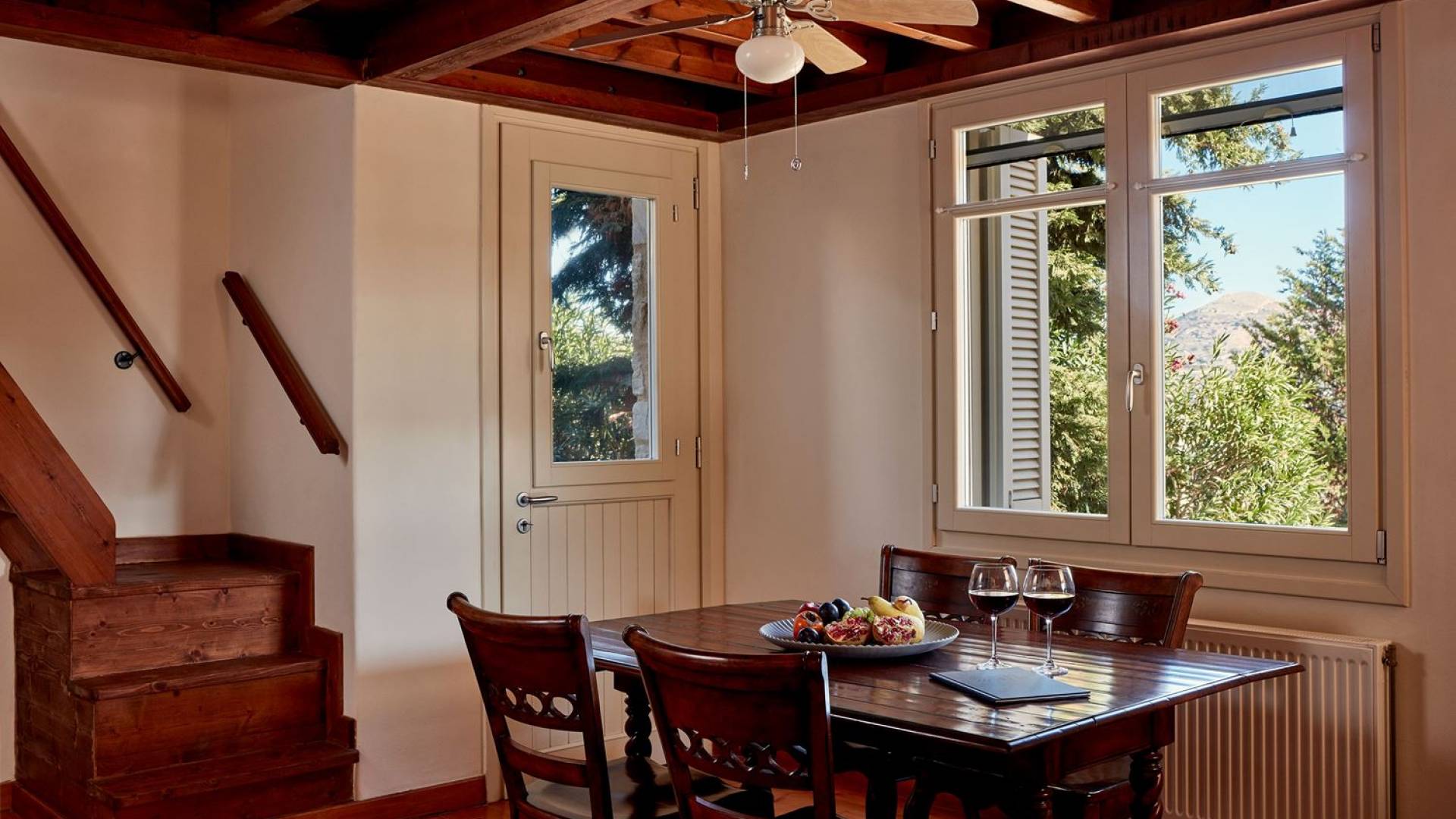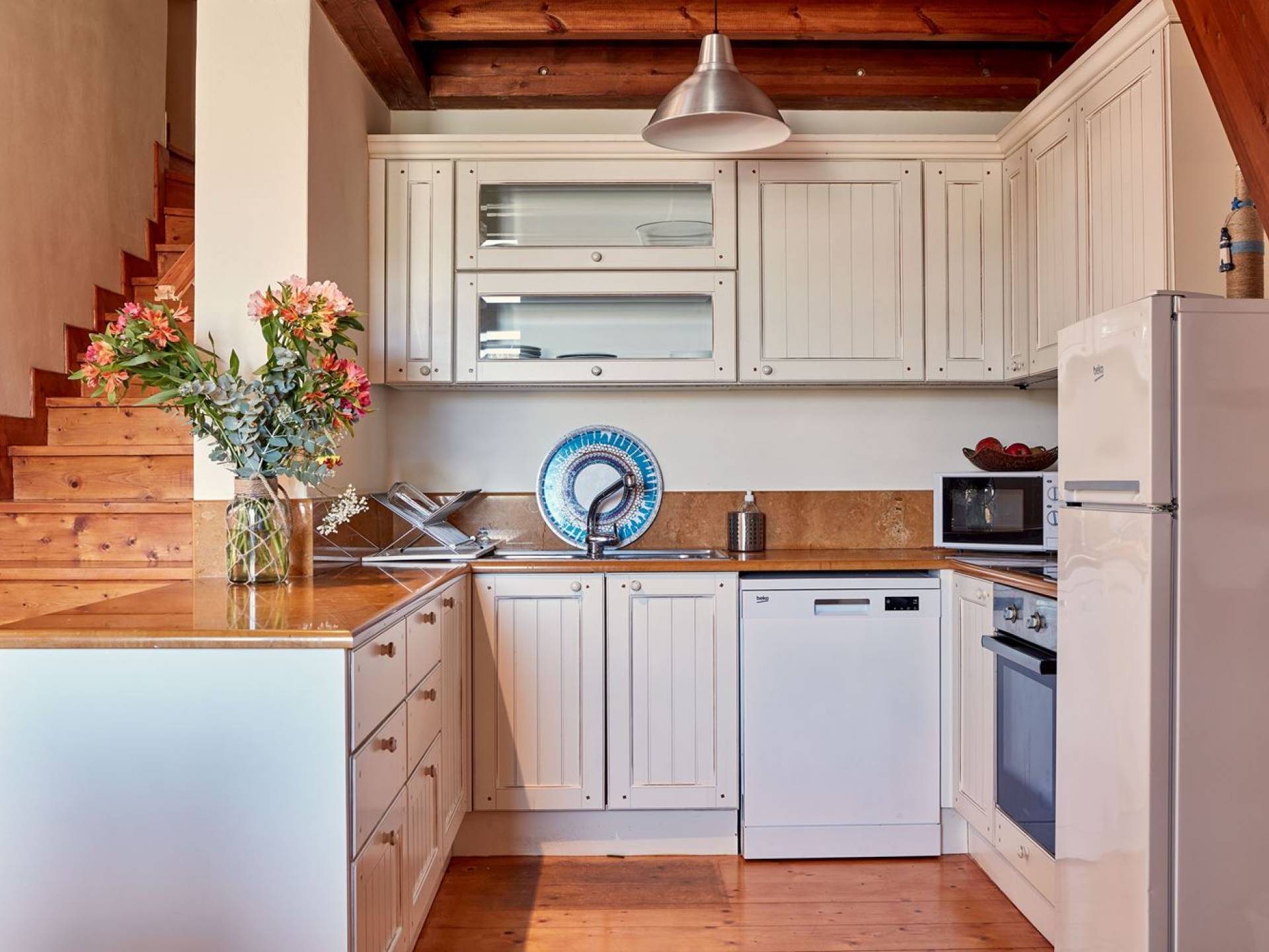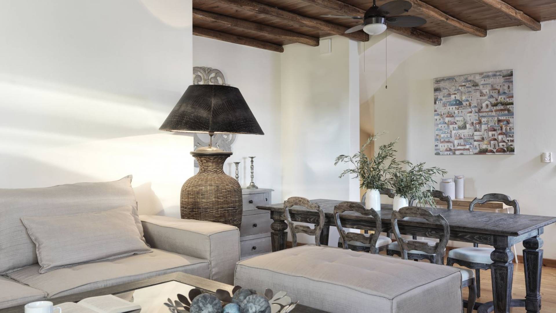 1er étage Comprend 3 chambres avec balcon offrant des vues panoramiques spectaculaires et air conditionné. La chambre principale dispose d'un lit queen-size, d'un placard, d'un plafond à poutres apparentes et d'une salle de bains privative. Les deux autres chambres sont desservies par une salle de bain commune entièrement équipée. La deuxième chambre dispose d'un lit queen-size et la troisième est équipée d'un lit simple. Les deux chambres comprennent des ventilateurs de plafond et toute la villa est équipée de la climatisation.