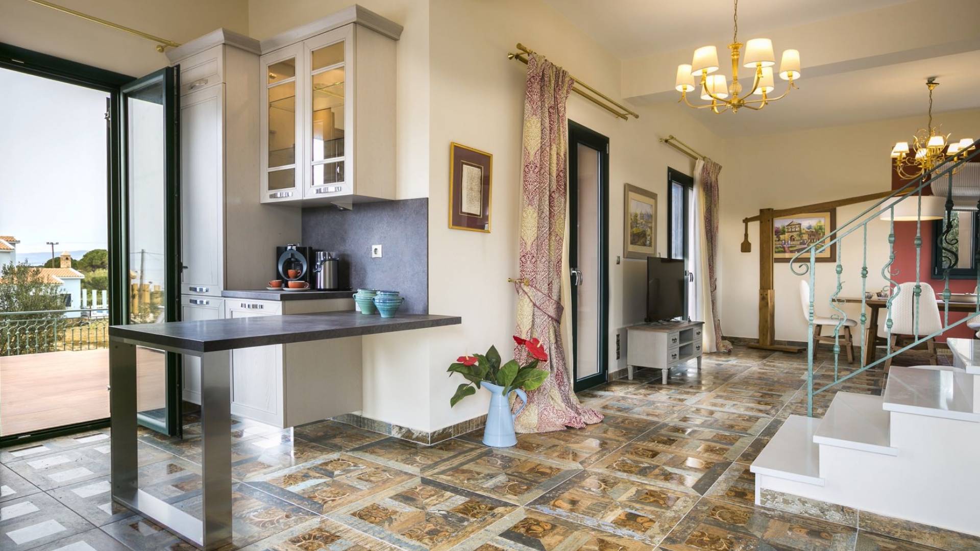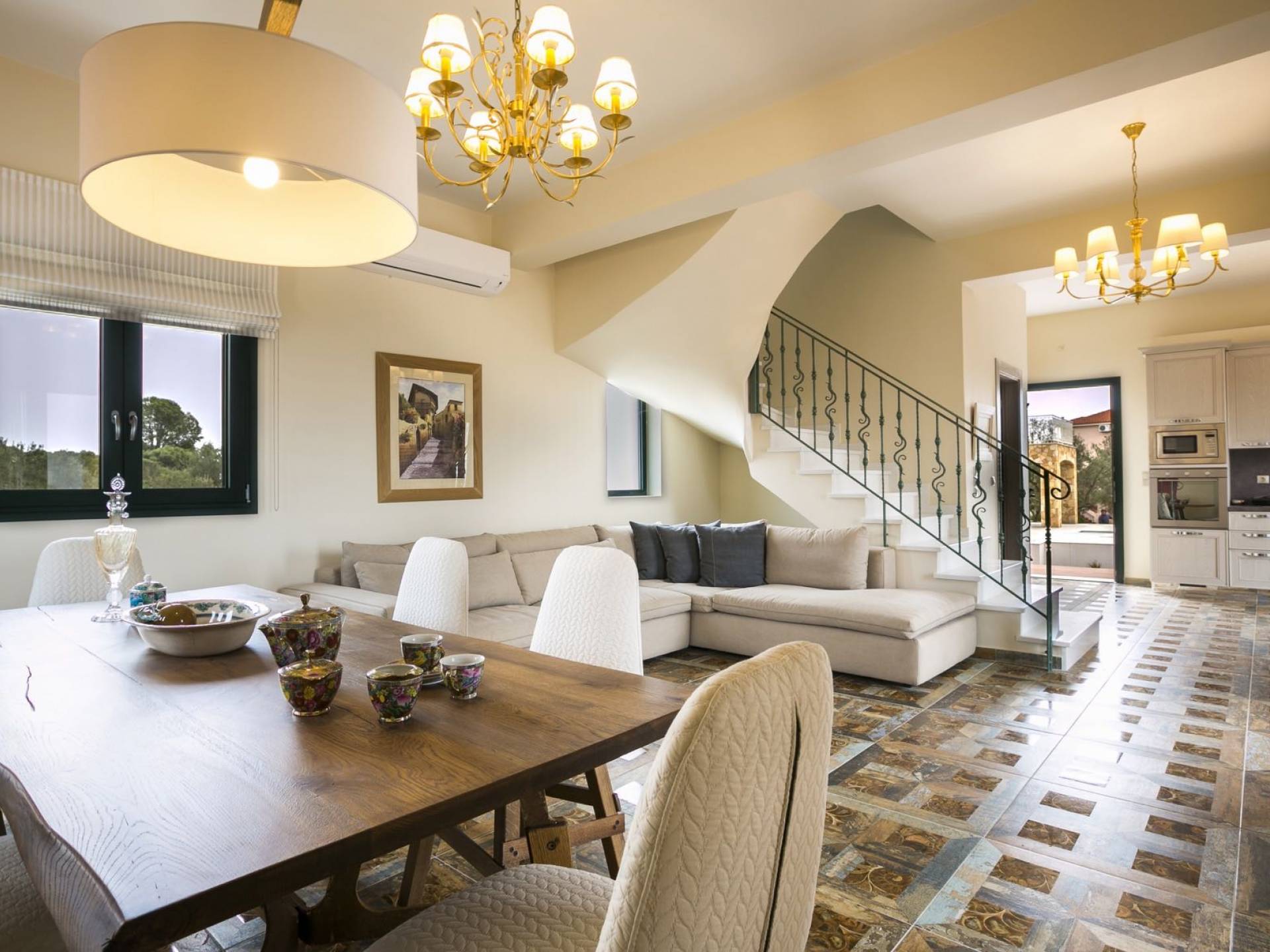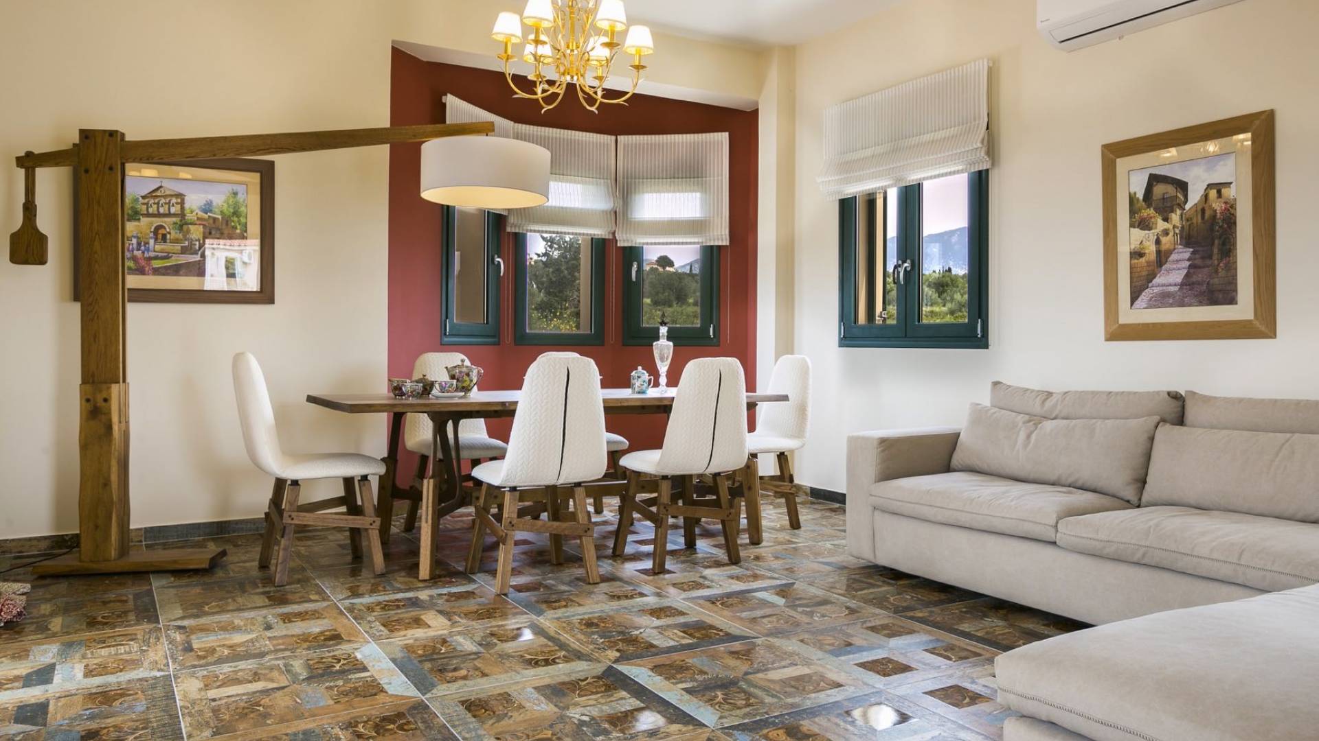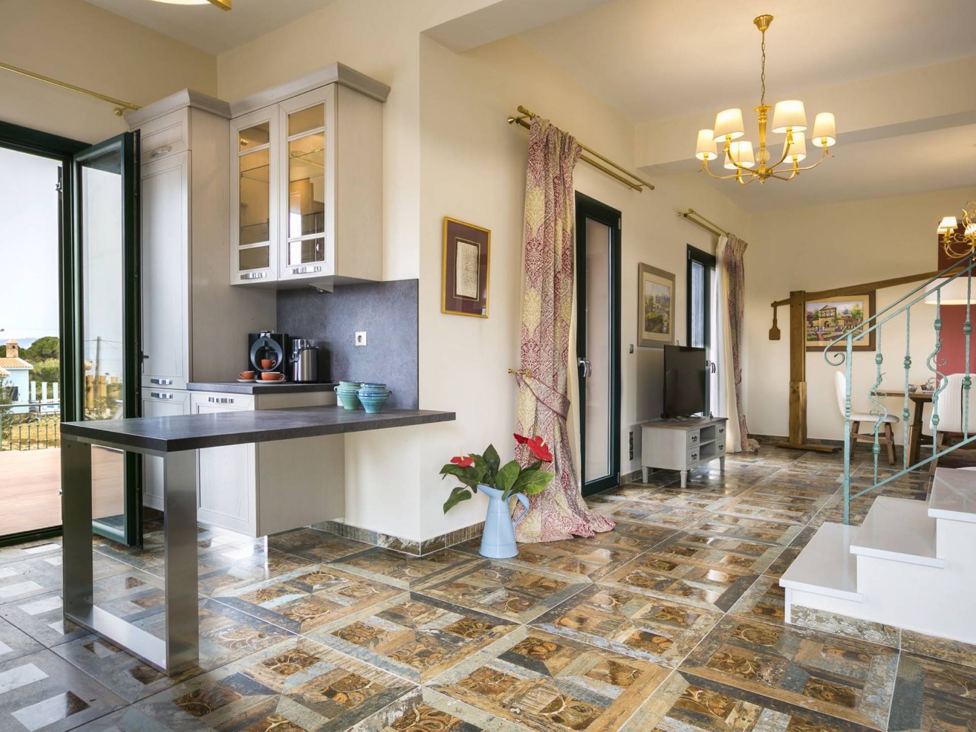 Pleiades Villa est conçue dans un style authentique de Céphalonie, avec des intérieurs en bois riche, en pierre, en draps impeccables et une combinaison d'imprimés et de couleurs terreux et audacieux. De beaux meubles ornent la salle à manger et la cuisine, tandis que les carreaux, les peintures et les tissus d'ameublement ajoutent des touches de couleur florale. Dans le salon, vous pourrez vous détendre sur un immense canapé, et les chefs amateurs et professionnels seront attirés par les appareils haut de gamme de la cuisine gastronomique.