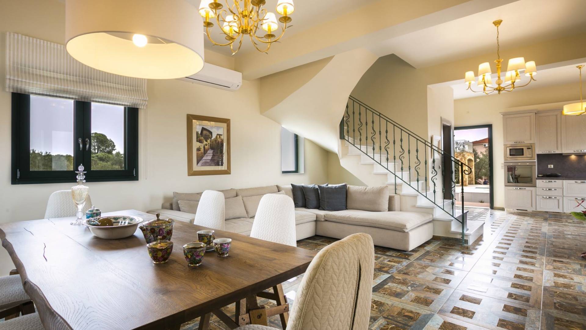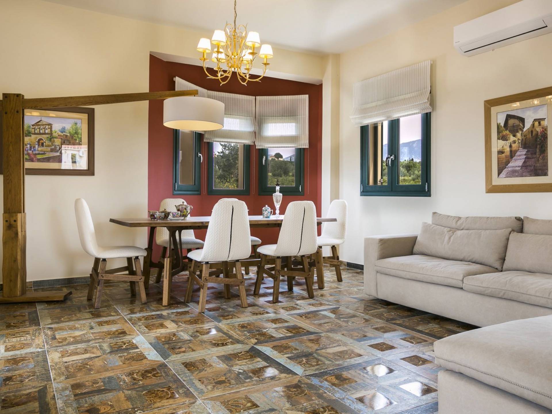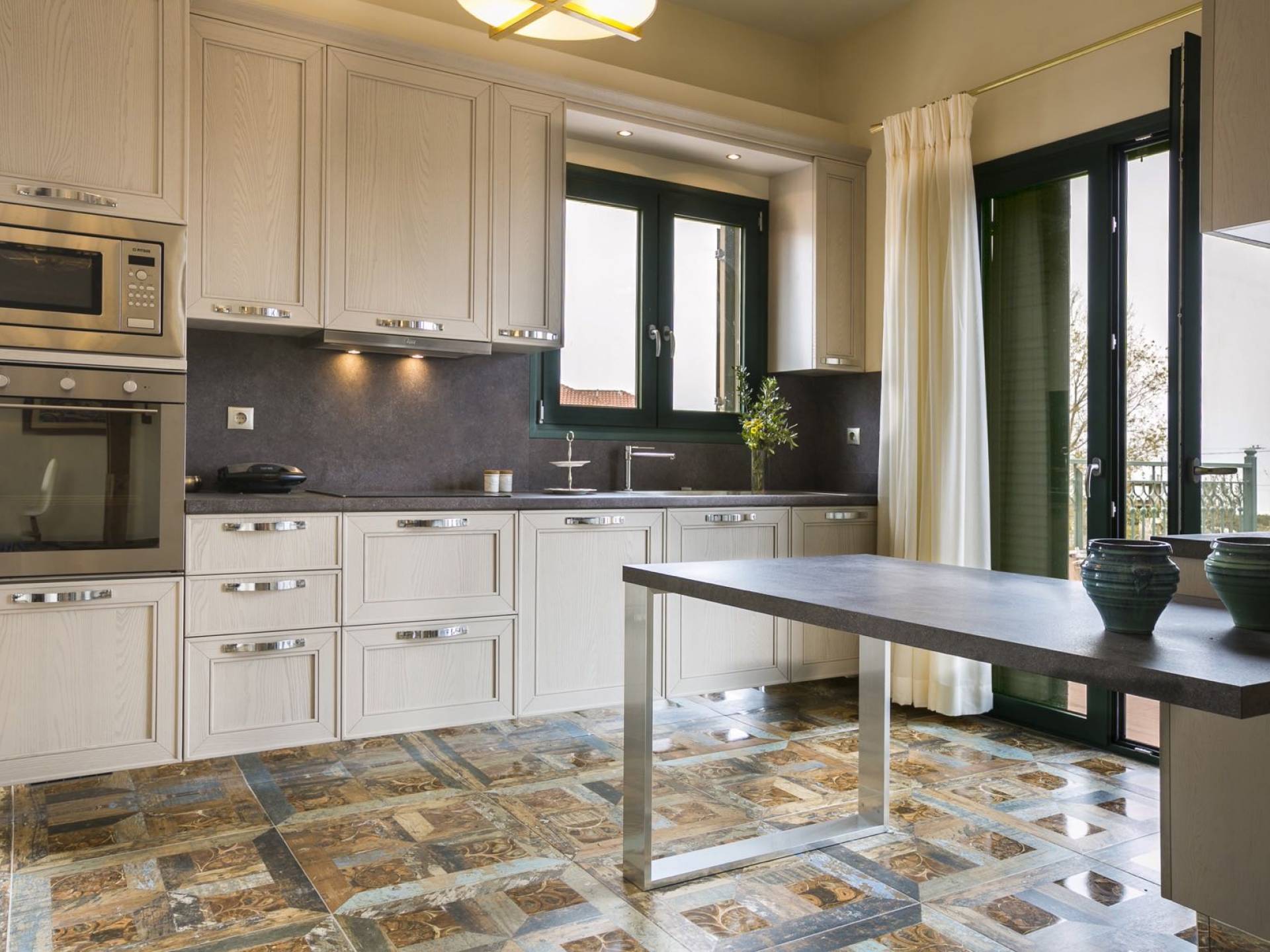 Pleiades Villa est conçue dans un style authentique de Céphalonie, avec des intérieurs en bois riche, en pierre, en draps impeccables et une combinaison d'imprimés et de couleurs terreux et audacieux. De beaux meubles ornent la salle à manger et la cuisine, tandis que les carreaux, les peintures et les tissus d'ameublement ajoutent des touches de couleur florale. Dans le salon, vous pourrez vous détendre sur un immense canapé, et les chefs amateurs et professionnels seront attirés par les appareils haut de gamme de la cuisine gastronomique.