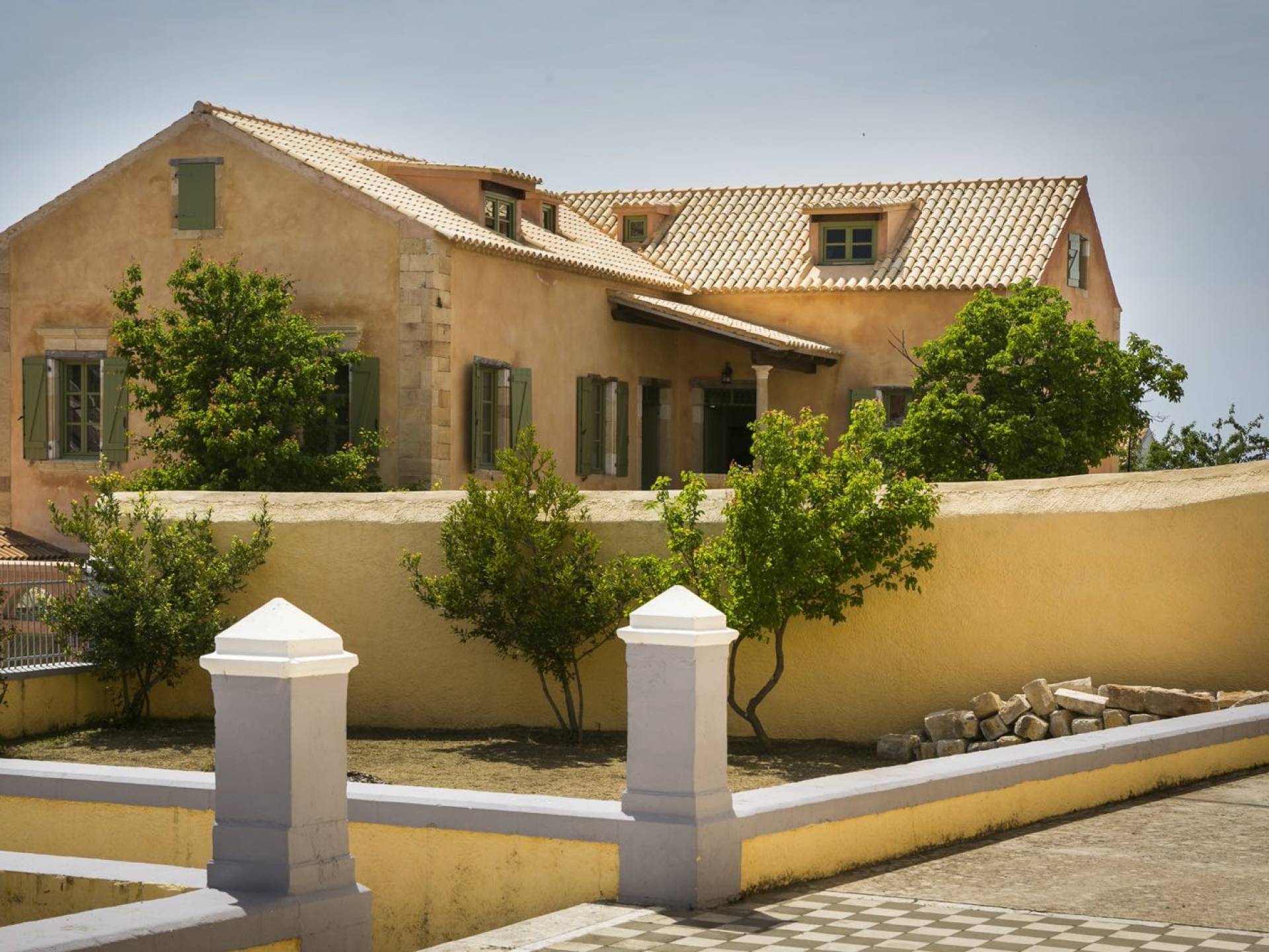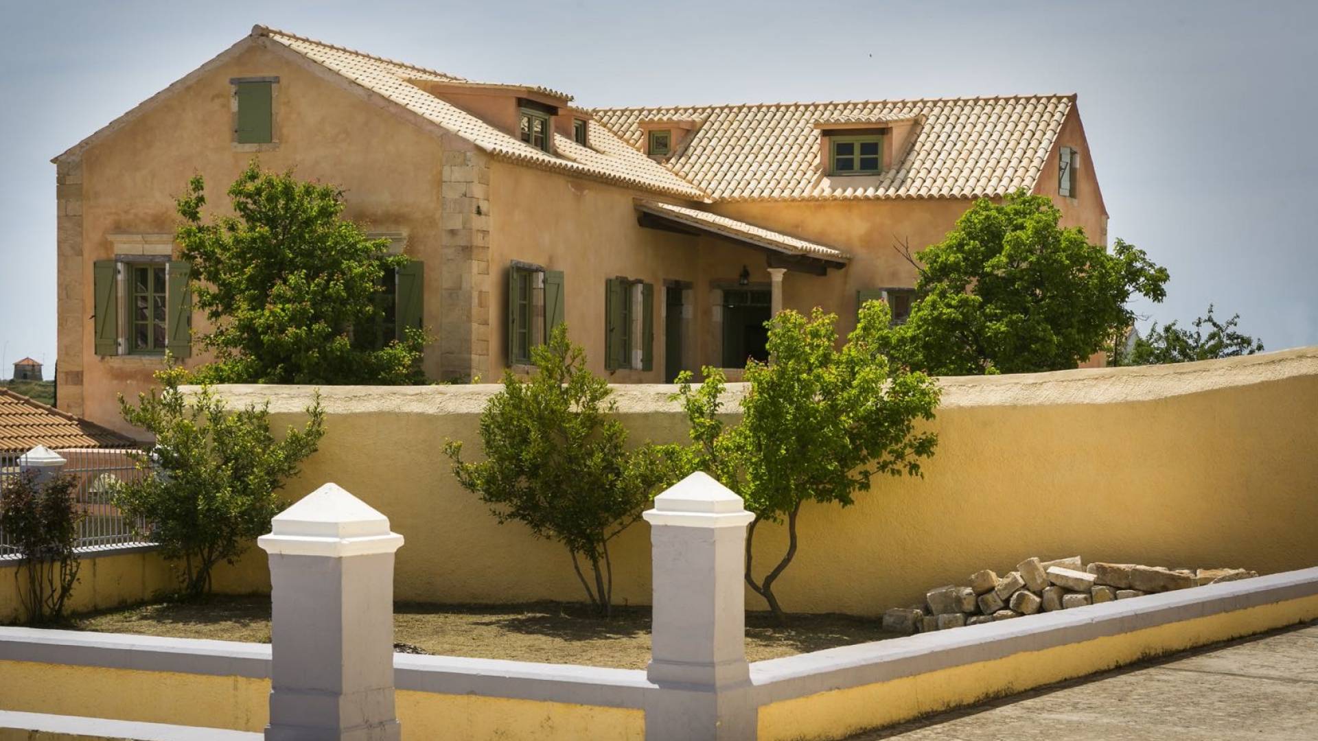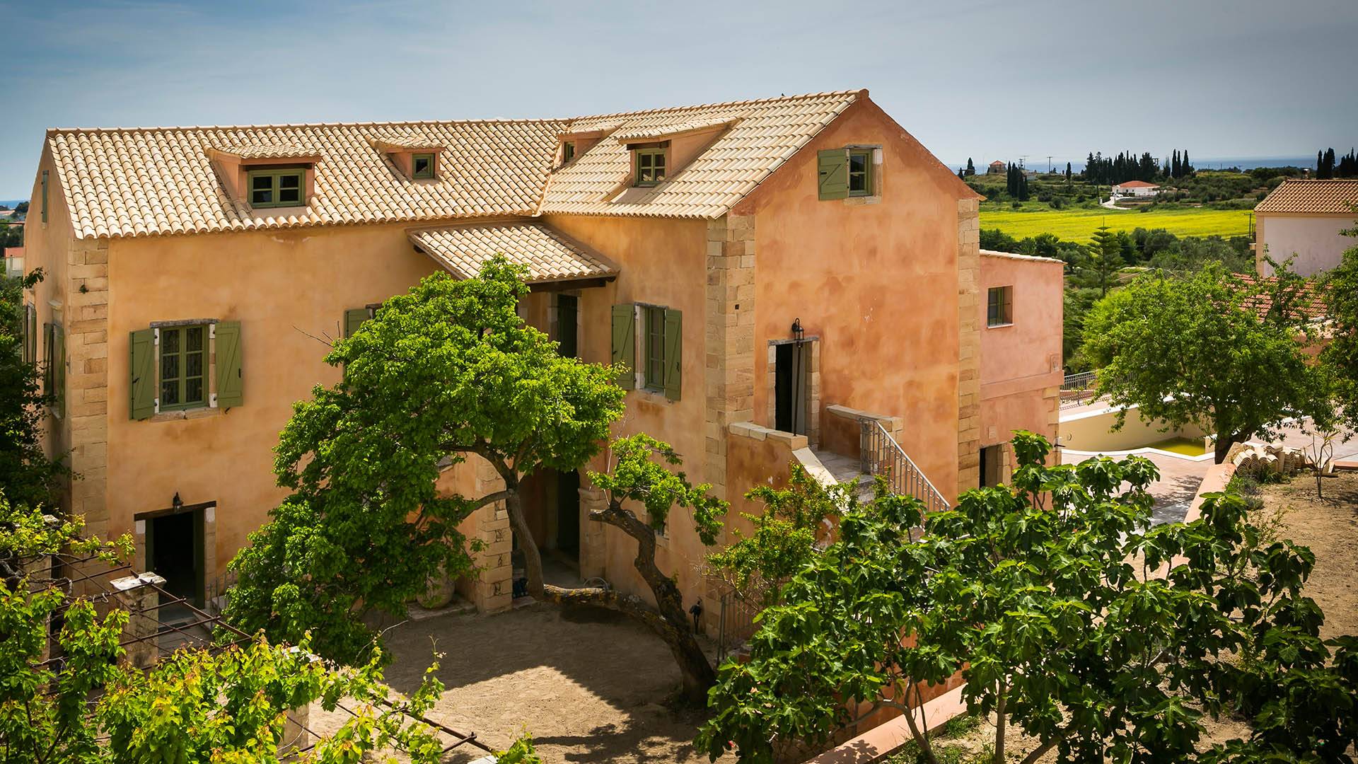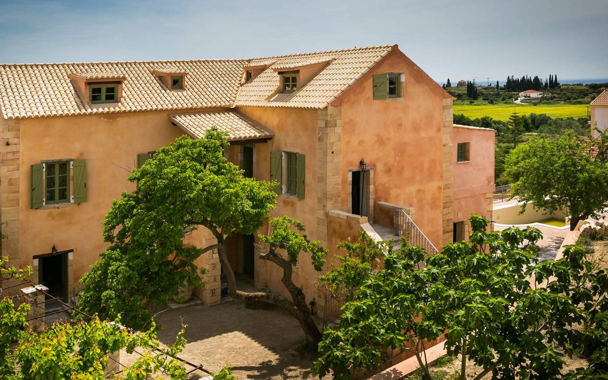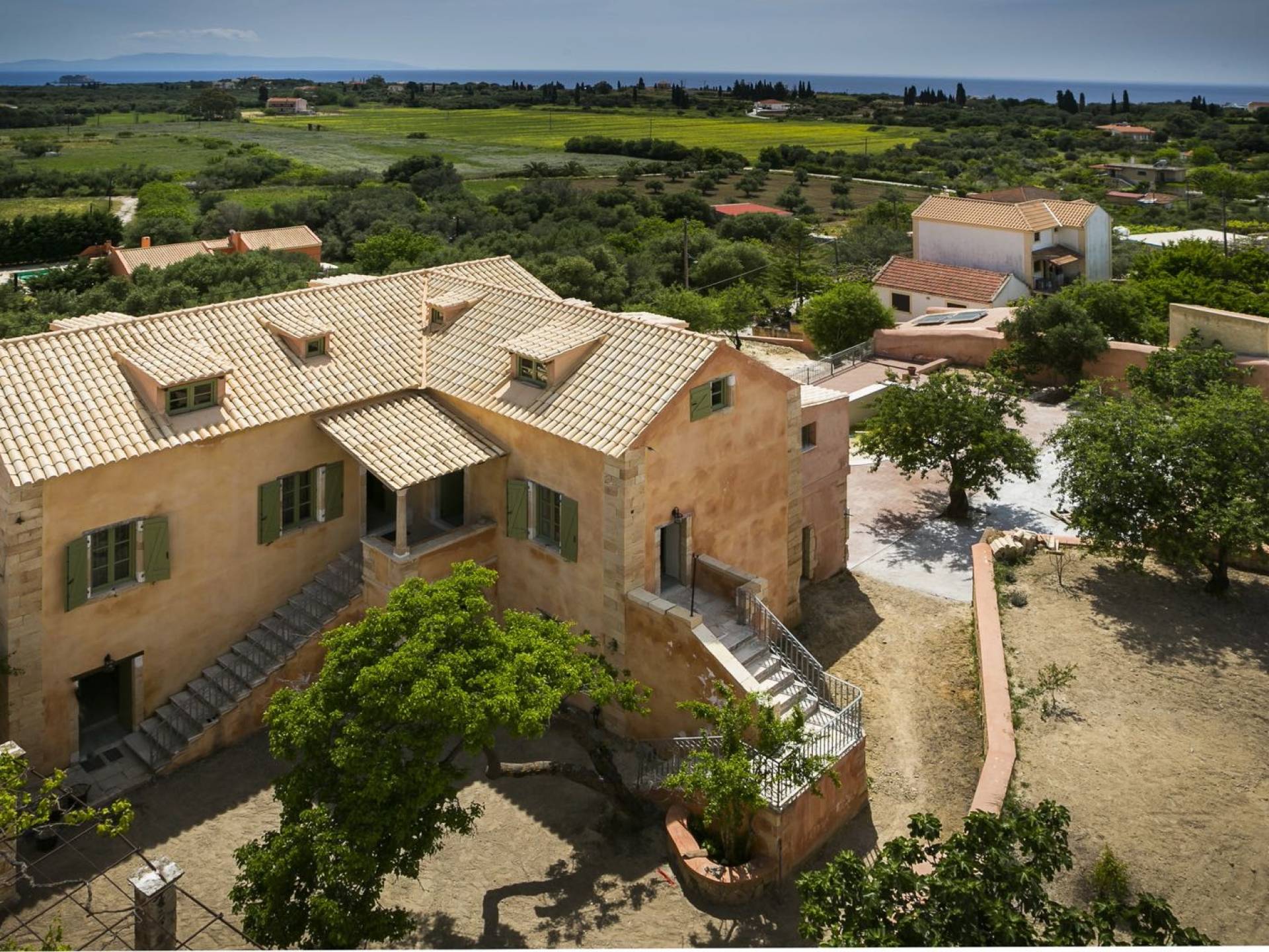 Dans les environs, il y a une piscine privée de 45 m² avec parasols, chaises longues et un coin repas extérieur, tandis que l'espace restant est aménagé avec de la pelouse, des arbres fruitiers et un potager biologique pour l'usage personnel des résidents. Des places de parking privées sont réservées aux locataires. Entourée de hauts murs de trois côtés différents pour assurer l'intimité, la propriété offre une vue panoramique sur l'île de Zakynthos depuis son quatrième côté. L'ensemble du domaine est décoré de meubles et de pièces de collection sélectionnés, à la fois utilitaires et décoratifs, provenant à la fois de Céphalonie et des îles Ioniennes, mais aussi de nombreux pays du monde, ainsi que de peintures originales d'algues de tapis persans. Les pièces ont été apportées au domaine par les propriétaires et ont été collectées et trouvées lors de leurs voyages à l'étranger.