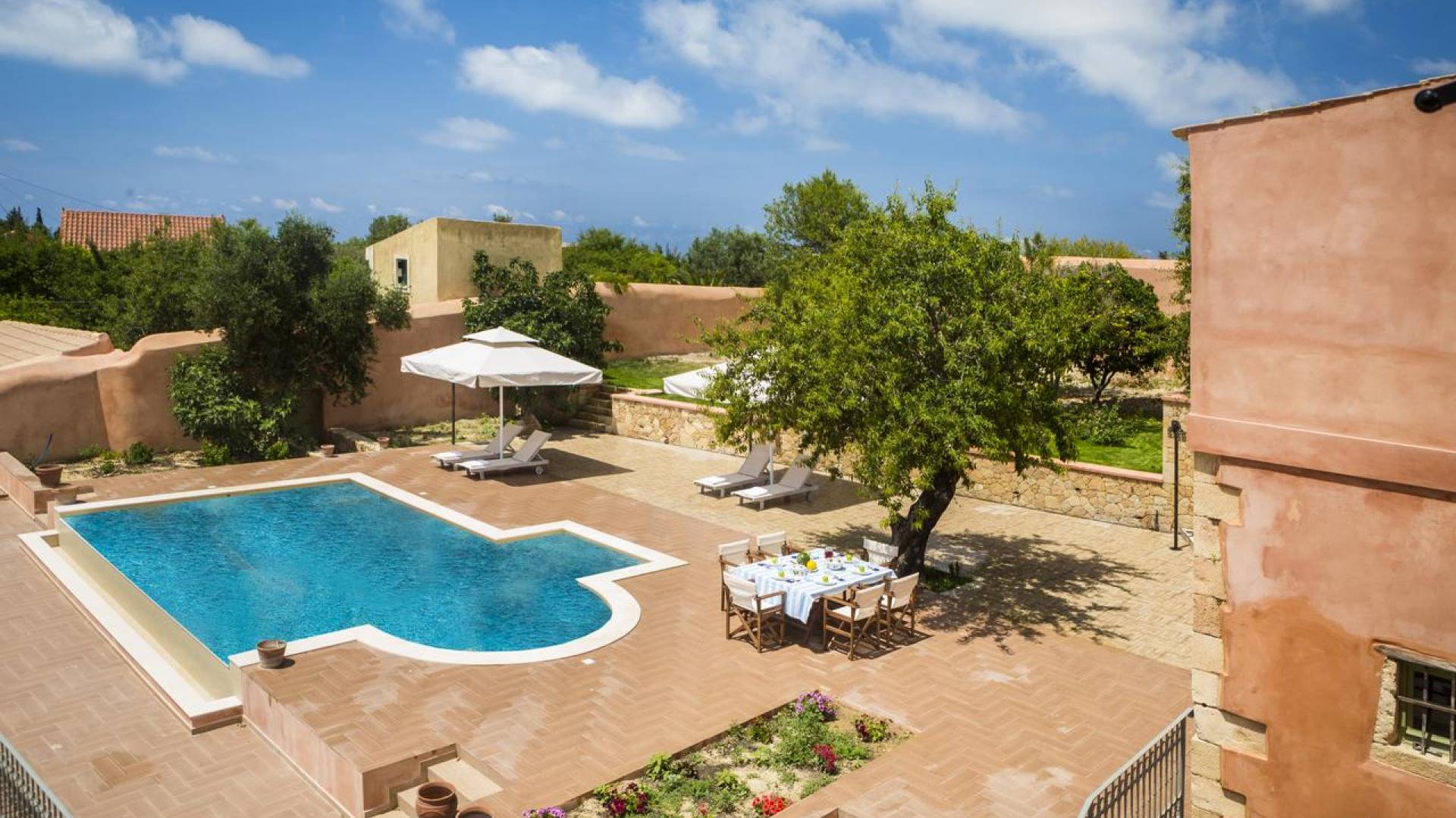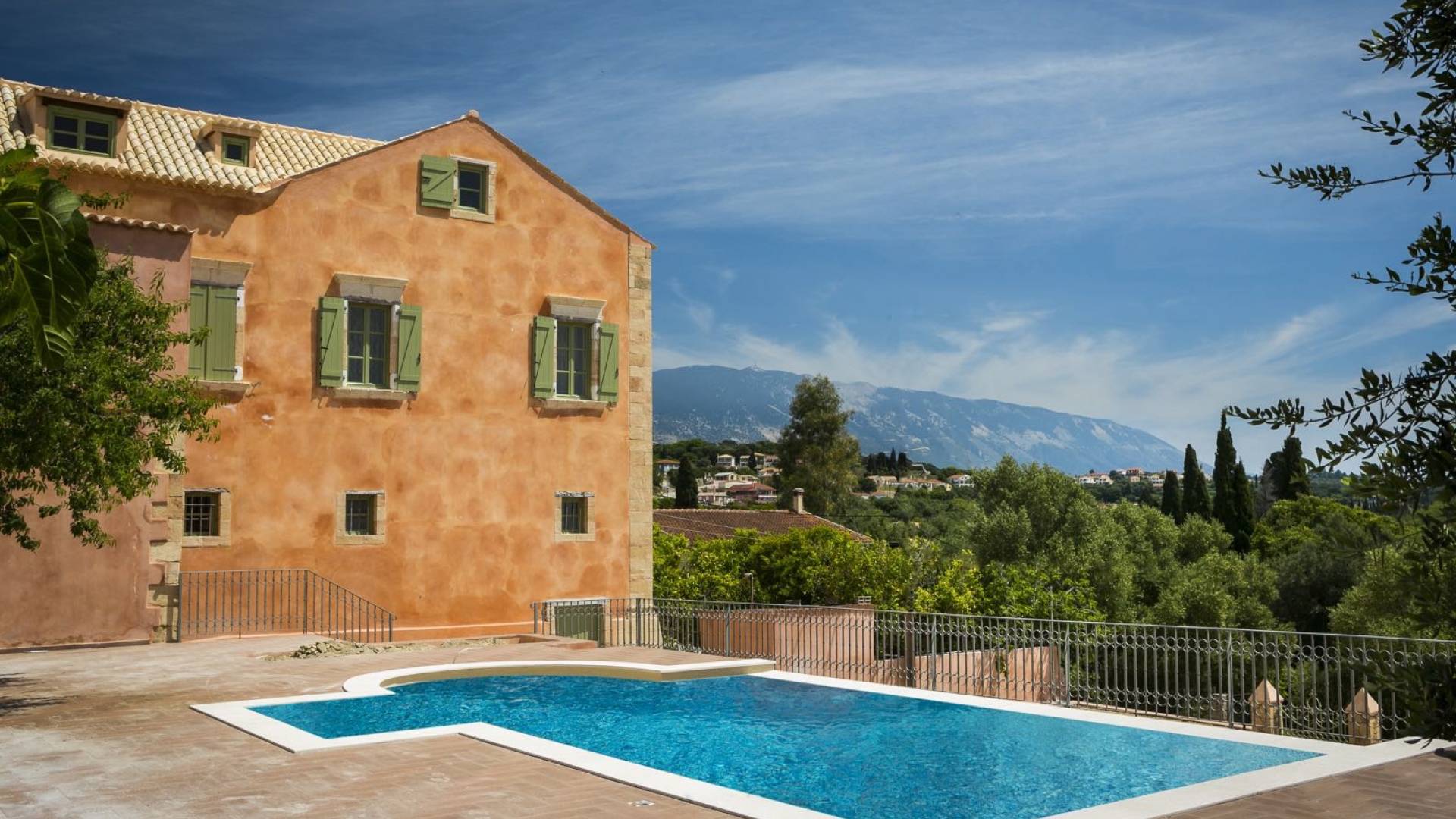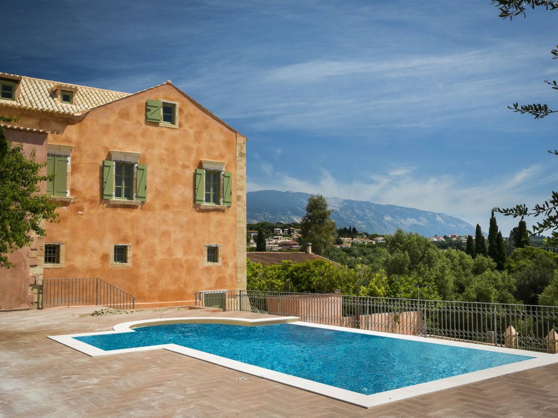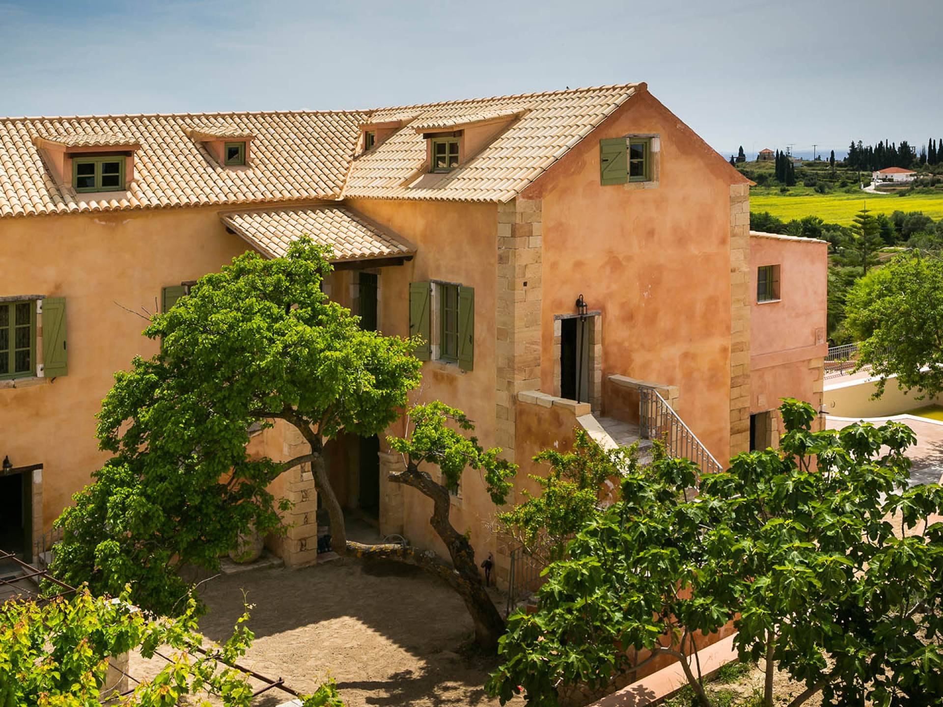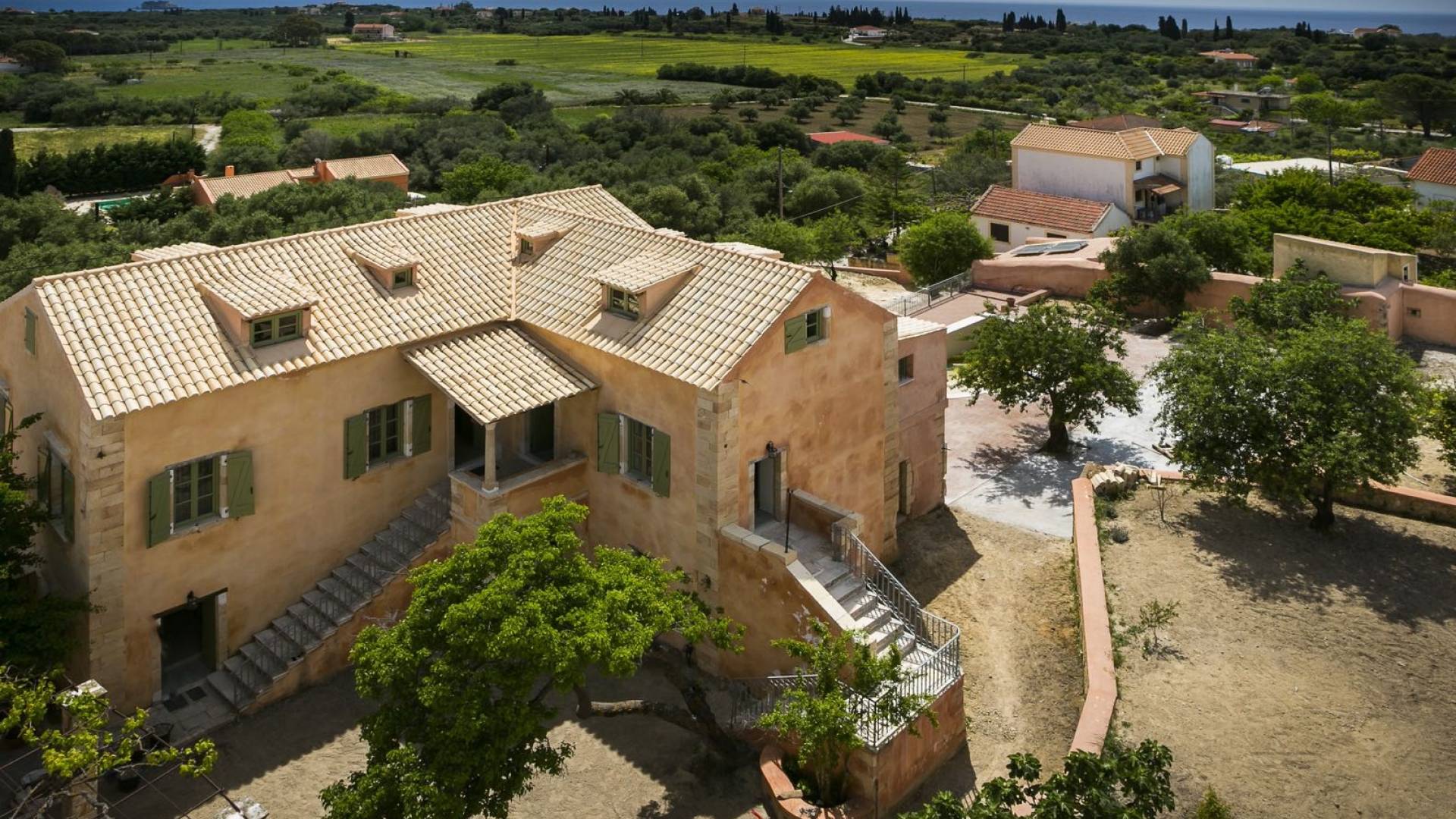 Dans les environs, il y a une piscine privée de 45 m² avec parasols, chaises longues et un coin repas extérieur, tandis que l'espace restant est aménagé avec de la pelouse, des arbres fruitiers et un potager biologique pour l'usage personnel des résidents. Des places de parking privées sont réservées aux locataires. Entourée de hauts murs de trois côtés différents pour assurer l'intimité, la propriété offre une vue panoramique sur l'île de Zakynthos depuis son quatrième côté. L'ensemble du domaine est décoré de meubles et de pièces de collection sélectionnés, à la fois utilitaires et décoratifs, provenant à la fois de Céphalonie et des îles Ioniennes, mais aussi de nombreux pays du monde, ainsi que de peintures originales d'algues de tapis persans. Les pièces ont été apportées au domaine par les propriétaires et ont été collectées et trouvées lors de leurs voyages à l'étranger.