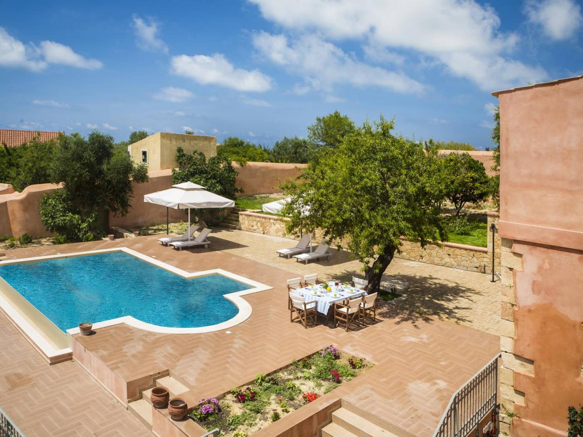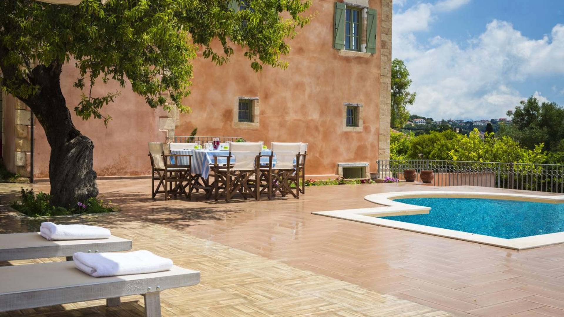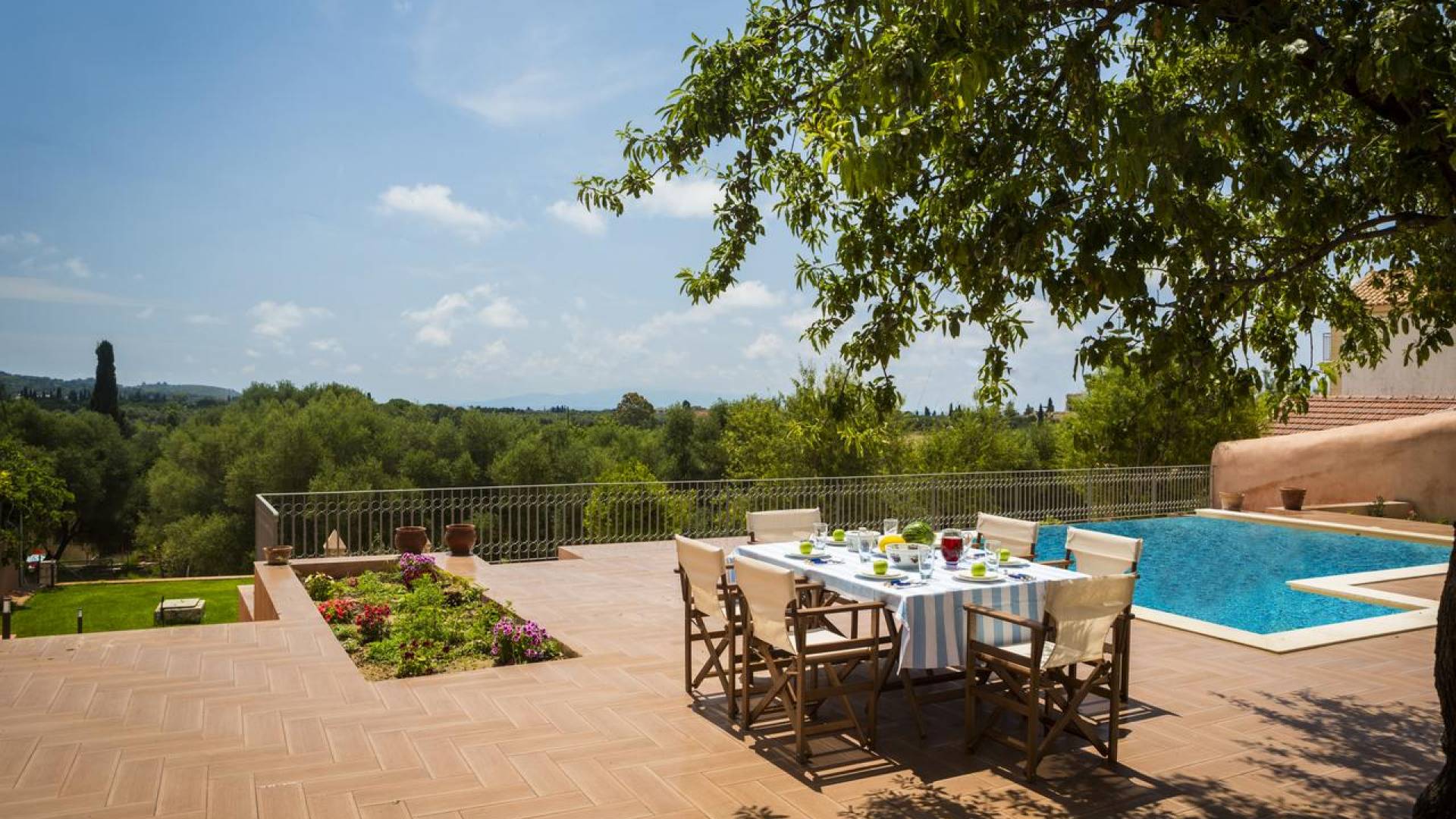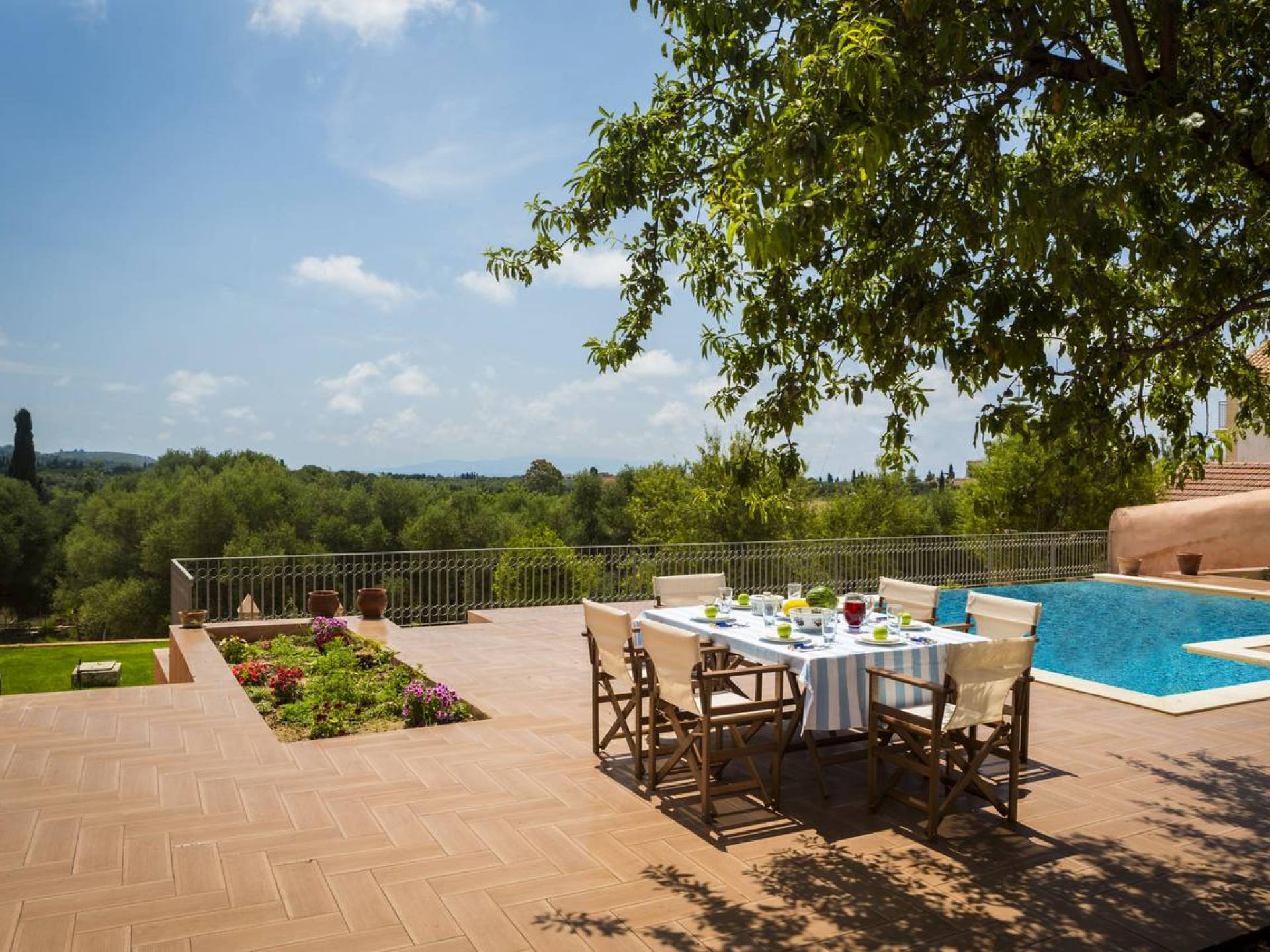 Dans les environs, il y a une piscine privée de 45 m² avec parasols, chaises longues et un coin repas extérieur, tandis que l'espace restant est aménagé avec de la pelouse, des arbres fruitiers et un potager biologique pour l'usage personnel des résidents. Des places de parking privées sont réservées aux locataires. Entourée de hauts murs de trois côtés différents pour assurer l'intimité, la propriété offre une vue panoramique sur l'île de Zakynthos depuis son quatrième côté. L'ensemble du domaine est décoré de meubles et de pièces de collection sélectionnés, à la fois utilitaires et décoratifs, provenant à la fois de Céphalonie et des îles Ioniennes, mais aussi de nombreux pays du monde, ainsi que de peintures originales d'algues de tapis persans. Les pièces ont été apportées au domaine par les propriétaires et ont été collectées et trouvées lors de leurs voyages à l'étranger.