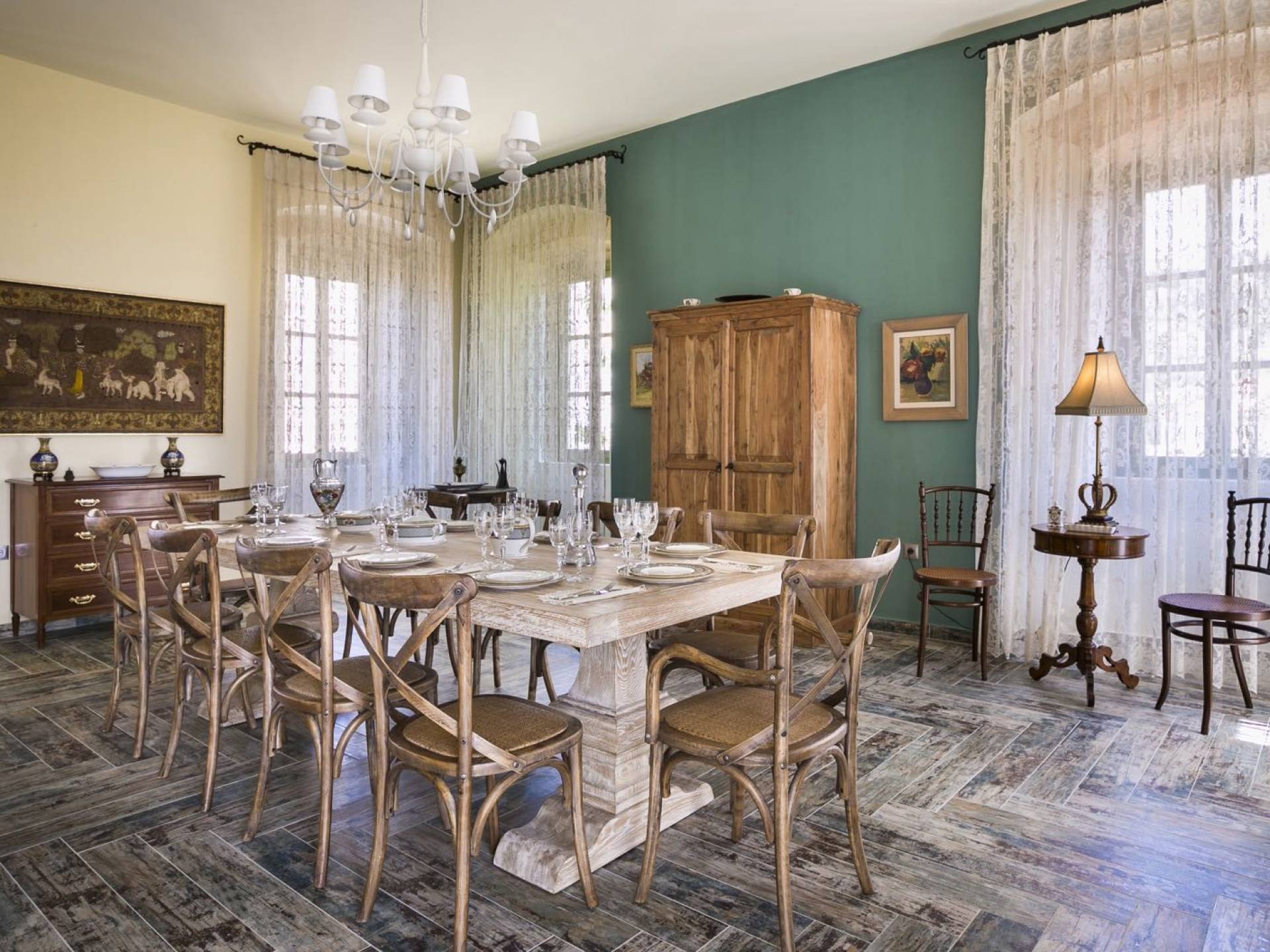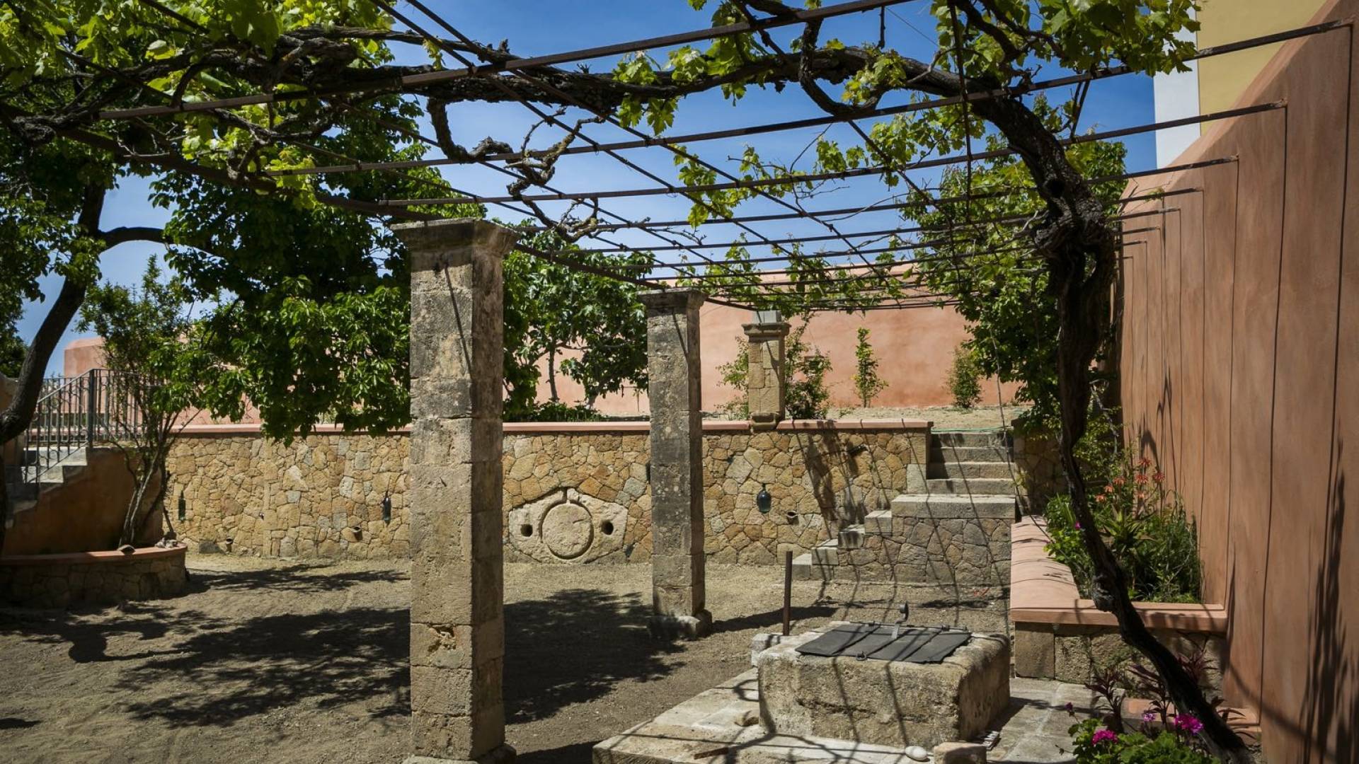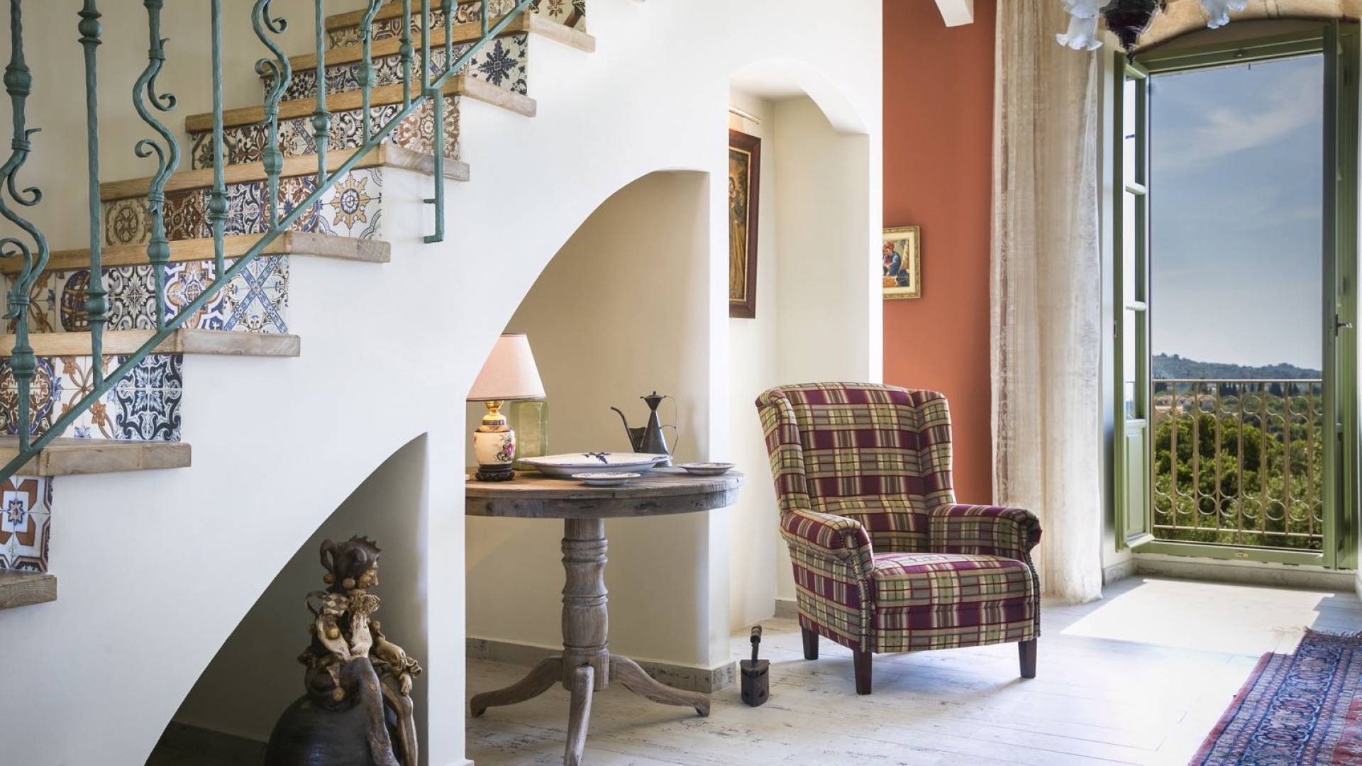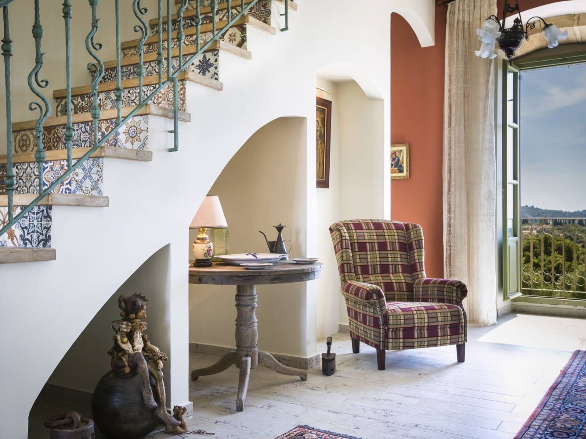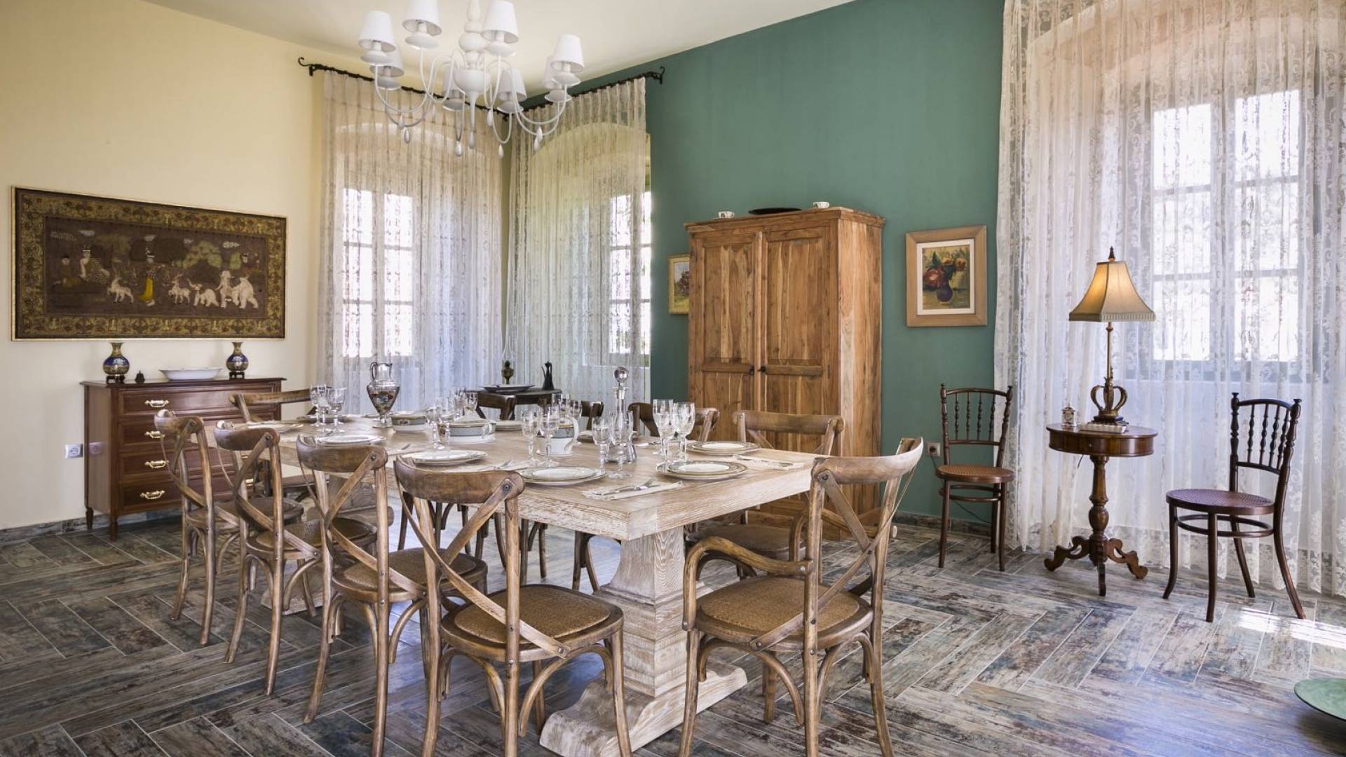Dans les environs, il y a une piscine privée de 45 m² avec parasols, chaises longues et un coin repas extérieur, tandis que l'espace restant est aménagé avec de la pelouse, des arbres fruitiers et un potager biologique pour l'usage personnel des résidents. Des places de parking privées sont réservées aux locataires. Entourée de hauts murs de trois côtés différents pour assurer l'intimité, la propriété offre une vue panoramique sur l'île de Zakynthos depuis son quatrième côté. L'ensemble du domaine est décoré de meubles et de pièces de collection sélectionnés, à la fois utilitaires et décoratifs, provenant à la fois de Céphalonie et des îles Ioniennes, mais aussi de nombreux pays du monde, ainsi que de peintures originales d'algues de tapis persans. Les pièces ont été apportées au domaine par les propriétaires et ont été collectées et trouvées lors de leurs voyages à l'étranger.