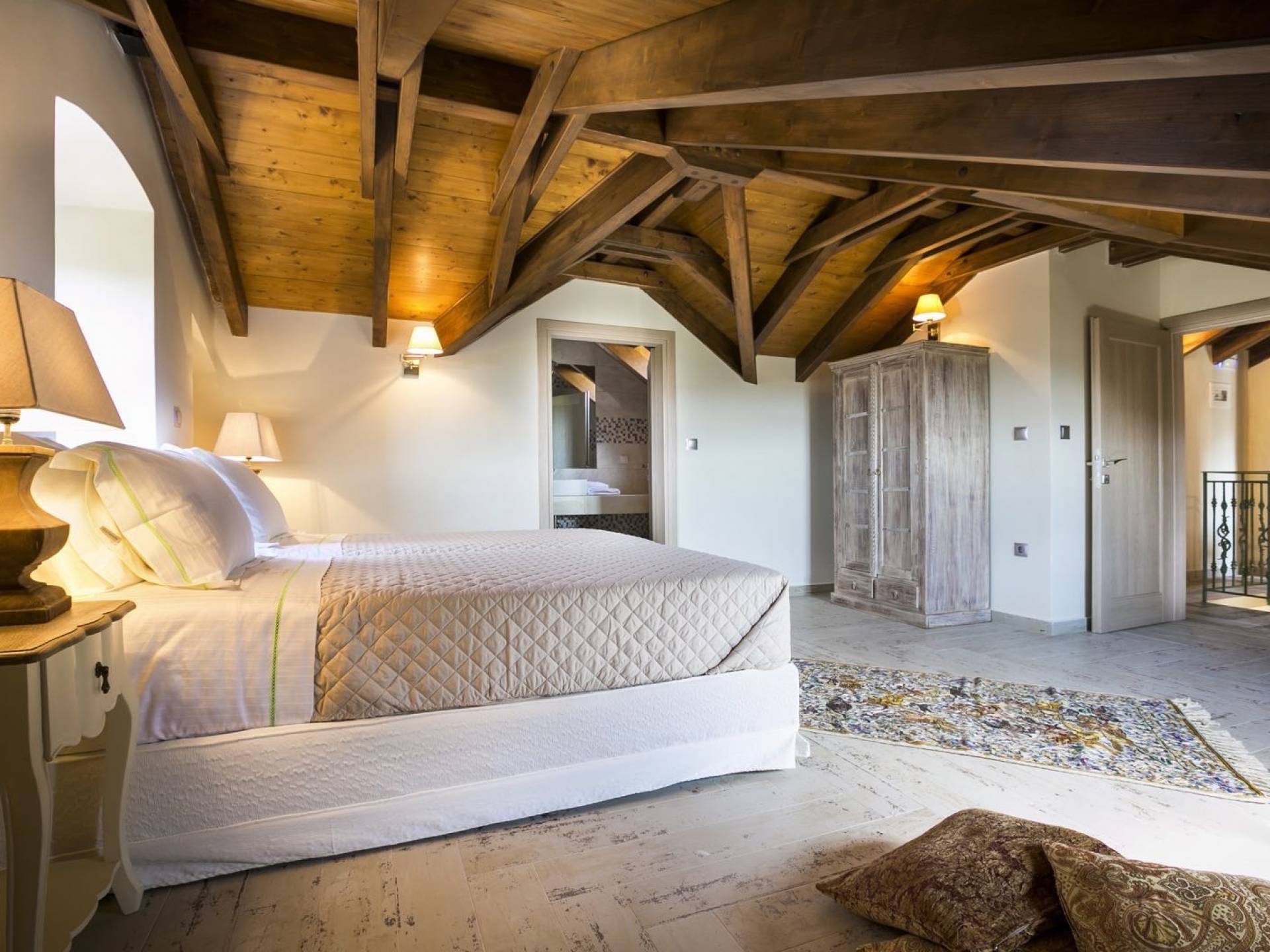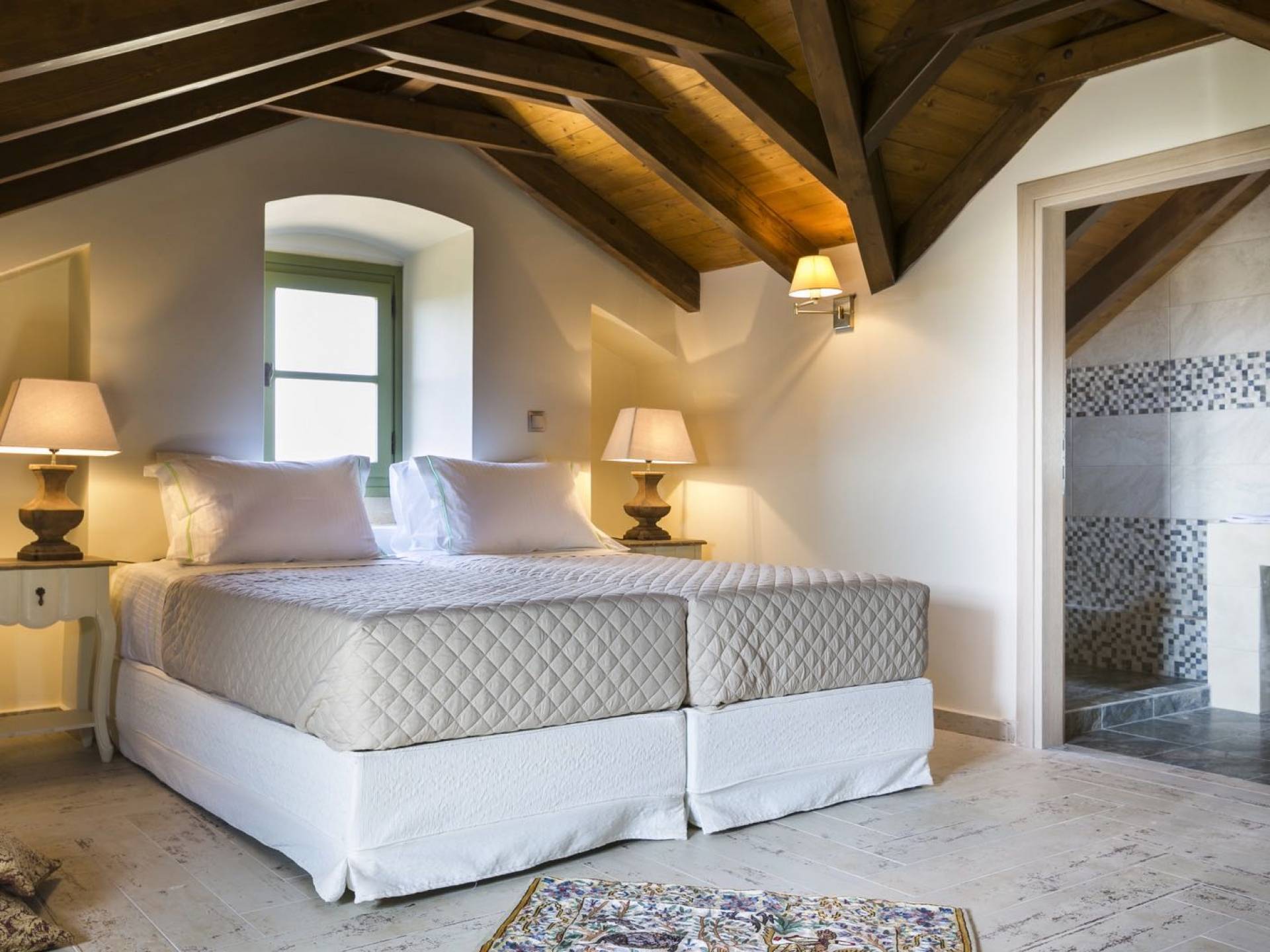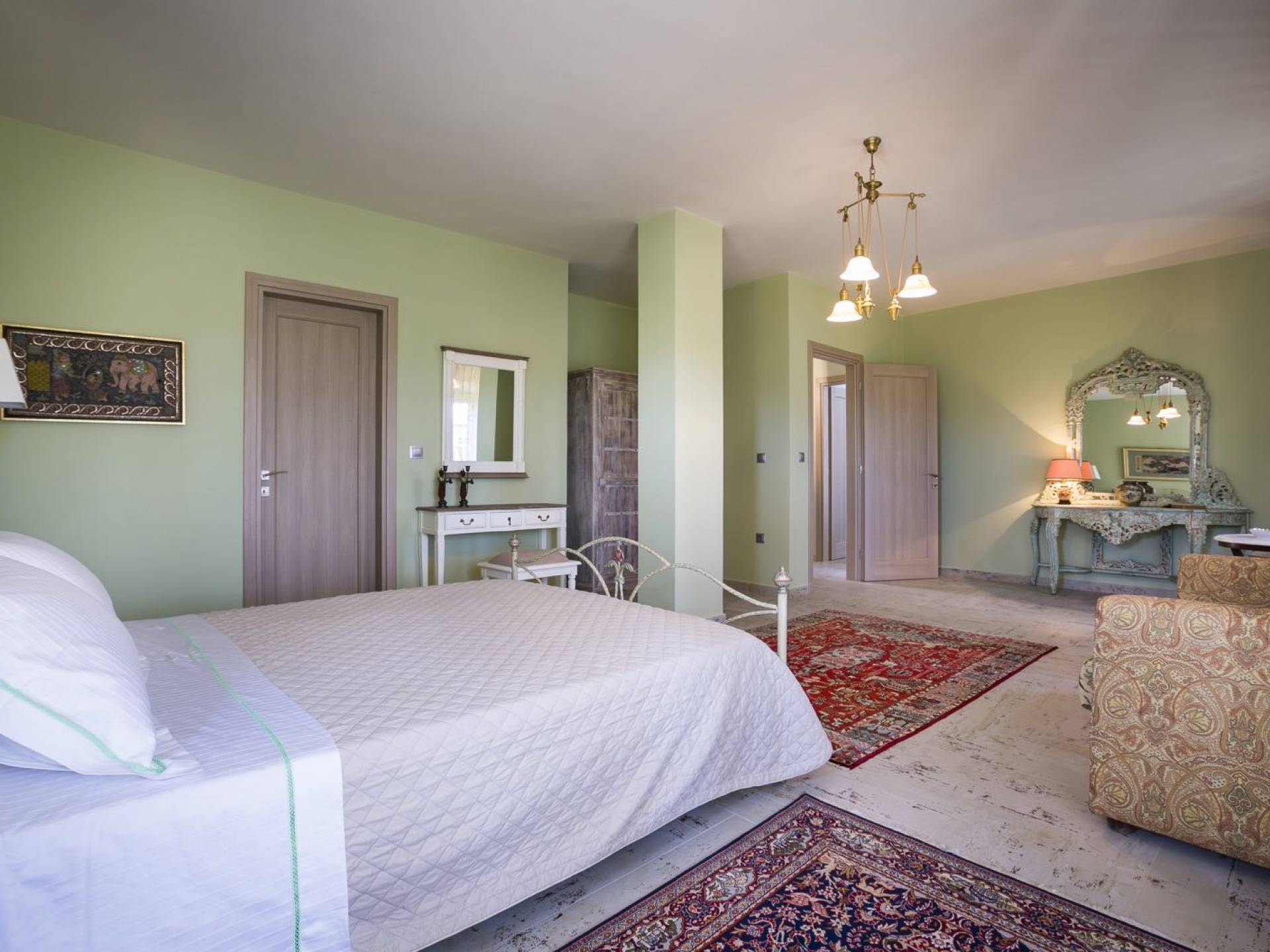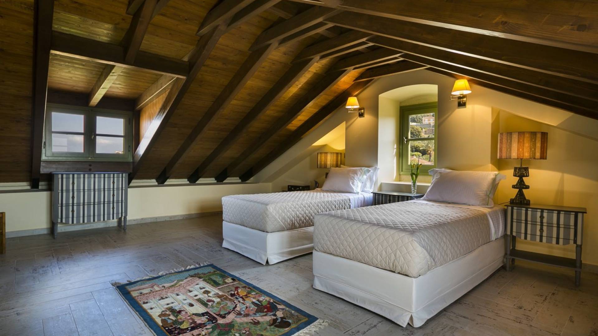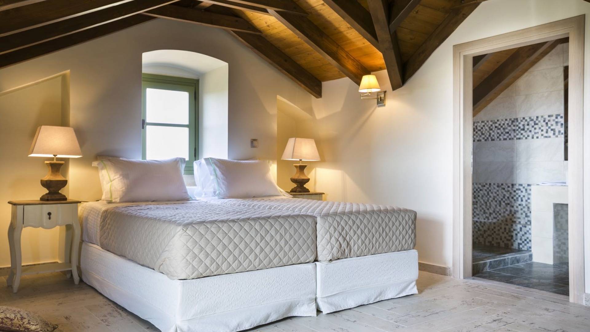 Au rez-de-chaussée, il y a deux suites, chacune avec une grande salle de bain, un lit queen-size, un coin salon et un coffre-fort. Il y a aussi un espace indépendant avec un bureau et une bibliothèque avec un PC, un Fax et une connexion Wi-Fi gratuite. Au rez-de-chaussée, il y a aussi une petite église privée dédiée à Saint-Nicolas et Saint-Georges, avec une entrée séparée et un point d'accès depuis les environs. A l'étage, il y a deux grands salons, une salle à manger pour un total de 12 personnes, une cuisine entièrement équipée avec une deuxième grande salle à manger avec télévision par satellite et une salle de bain supplémentaire pour les invités. Dans les combles, il y a trois chambres, chacune avec une salle de bain en suite, avec des lits jumeaux qui peuvent être réunis pour faire un lit queen-size et une vue panoramique. Toutes les chambres disposent de draps de luxe et d'articles de toilette Anne Semonin gratuits.