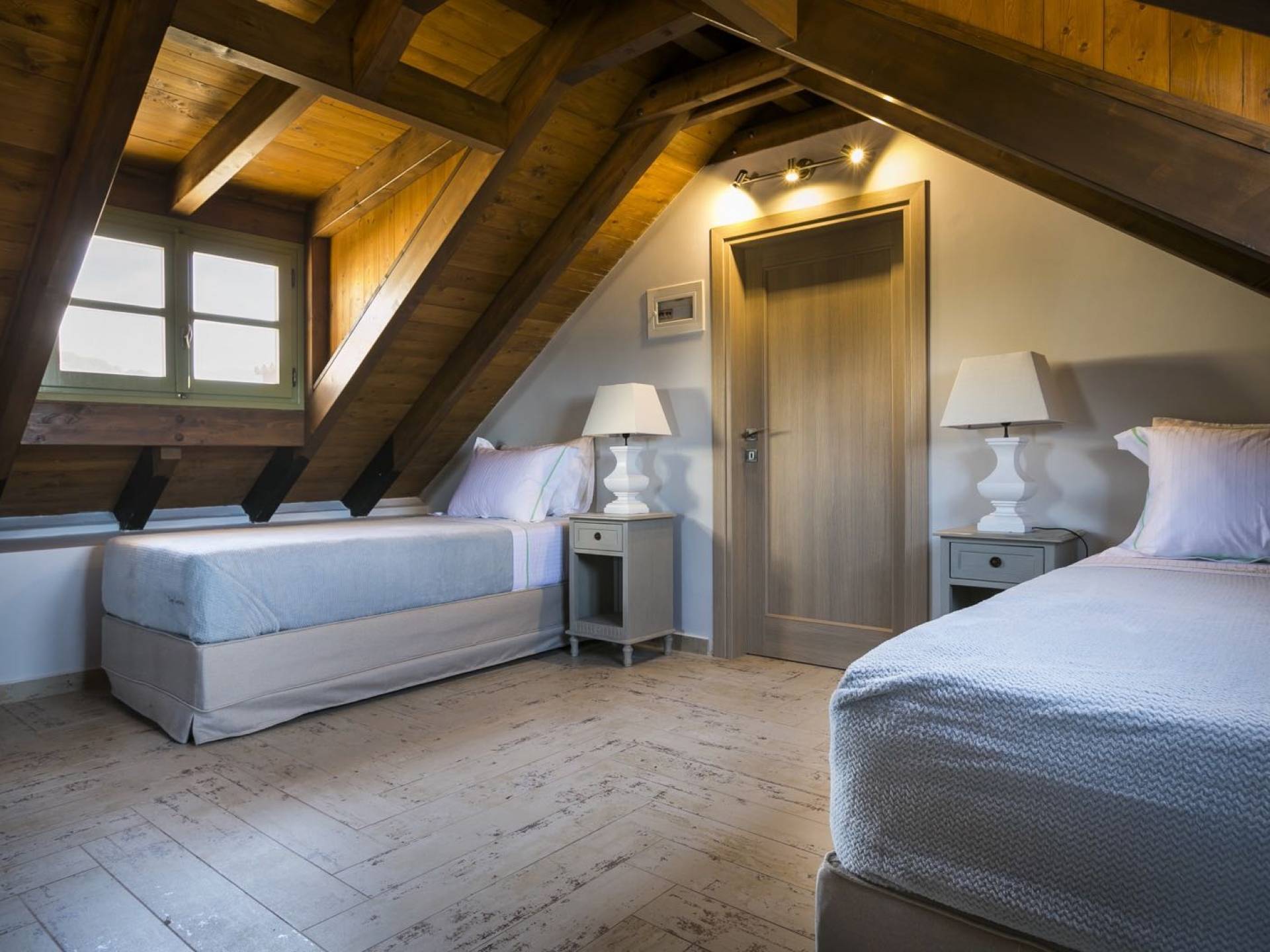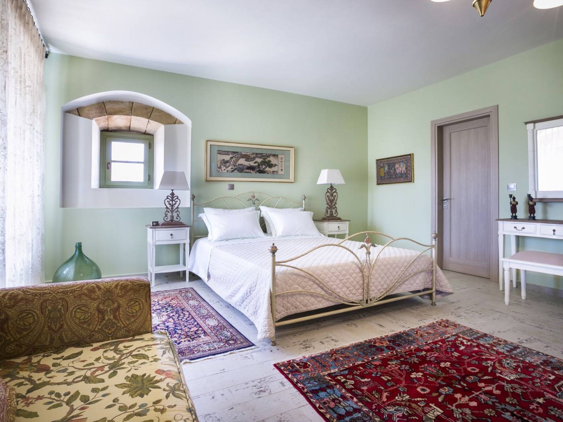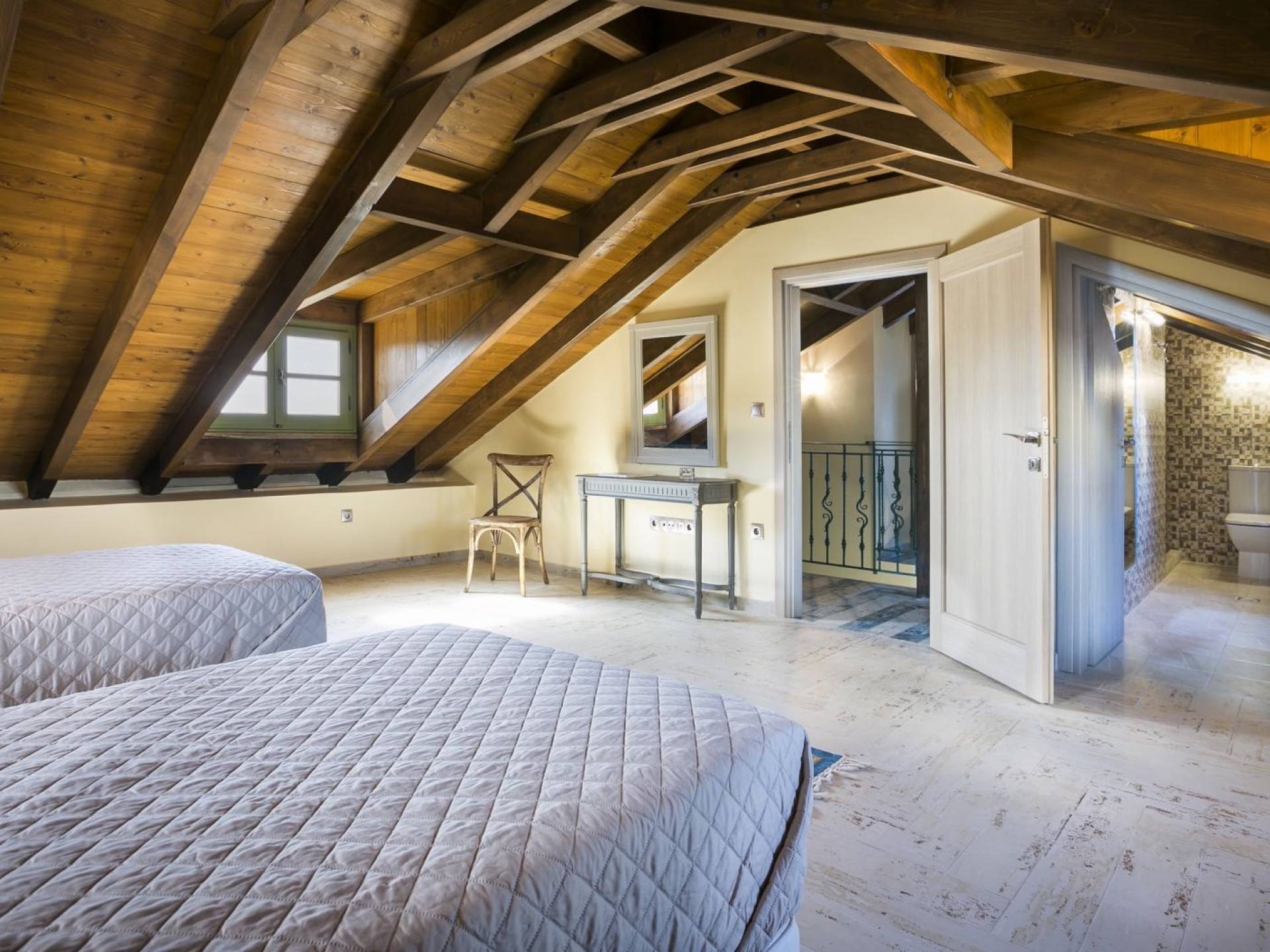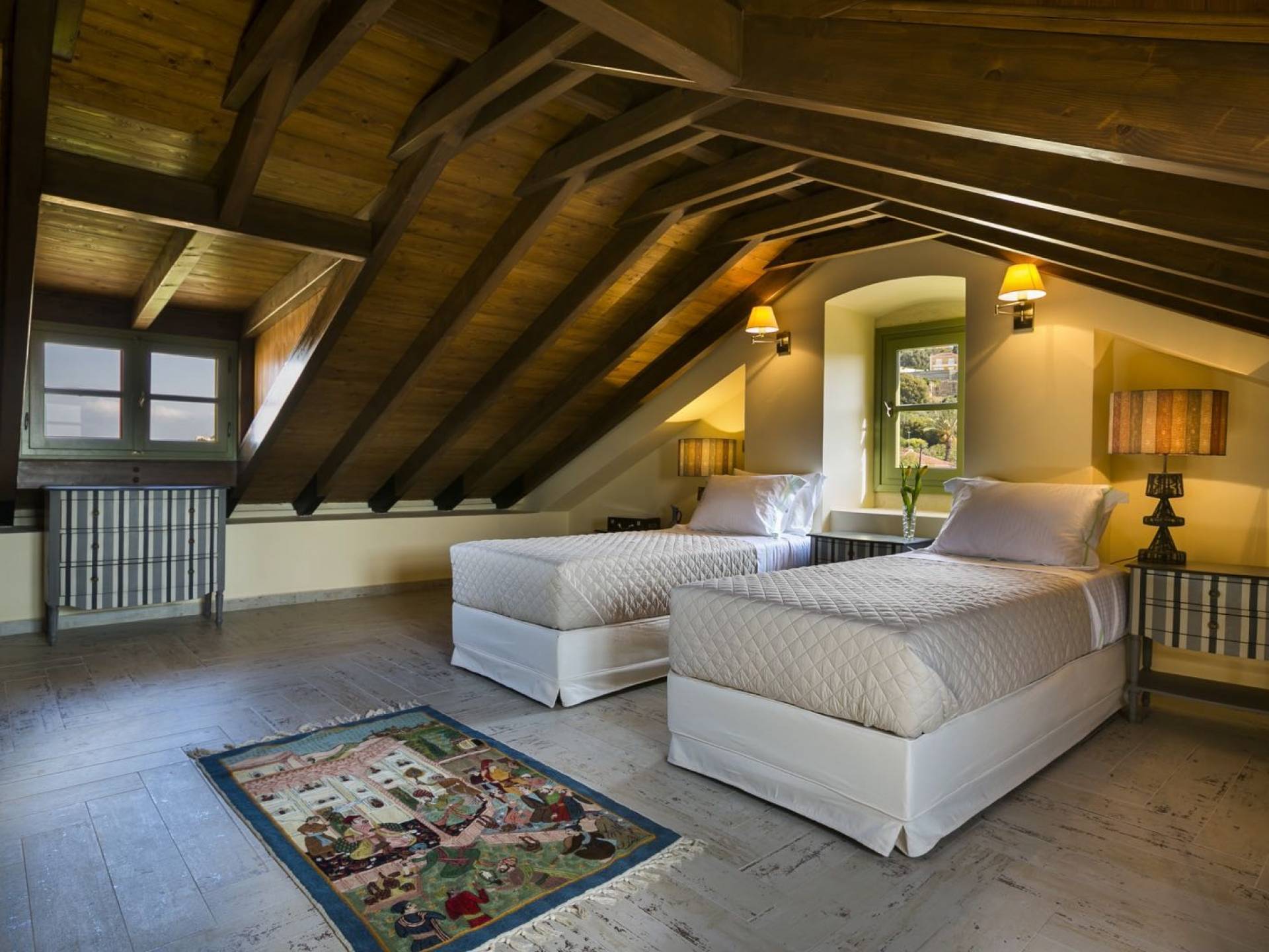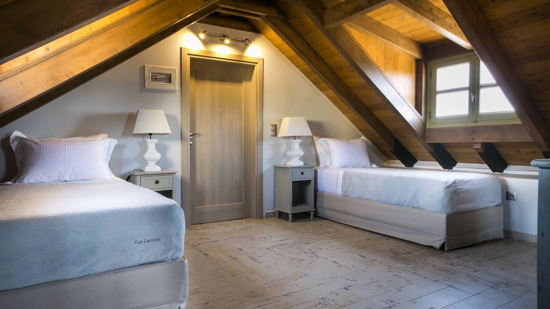 Au rez-de-chaussée, il y a deux suites, chacune avec une grande salle de bain, un lit queen-size, un coin salon et un coffre-fort. Il y a aussi un espace indépendant avec un bureau et une bibliothèque avec un PC, un Fax et une connexion Wi-Fi gratuite. Au rez-de-chaussée, il y a aussi une petite église privée dédiée à Saint-Nicolas et Saint-Georges, avec une entrée séparée et un point d'accès depuis les environs. A l'étage, il y a deux grands salons, une salle à manger pour un total de 12 personnes, une cuisine entièrement équipée avec une deuxième grande salle à manger avec télévision par satellite et une salle de bain supplémentaire pour les invités. Dans les combles, il y a trois chambres, chacune avec une salle de bain en suite, avec des lits jumeaux qui peuvent être réunis pour faire un lit queen-size et une vue panoramique. Toutes les chambres disposent de draps de luxe et d'articles de toilette Anne Semonin gratuits.