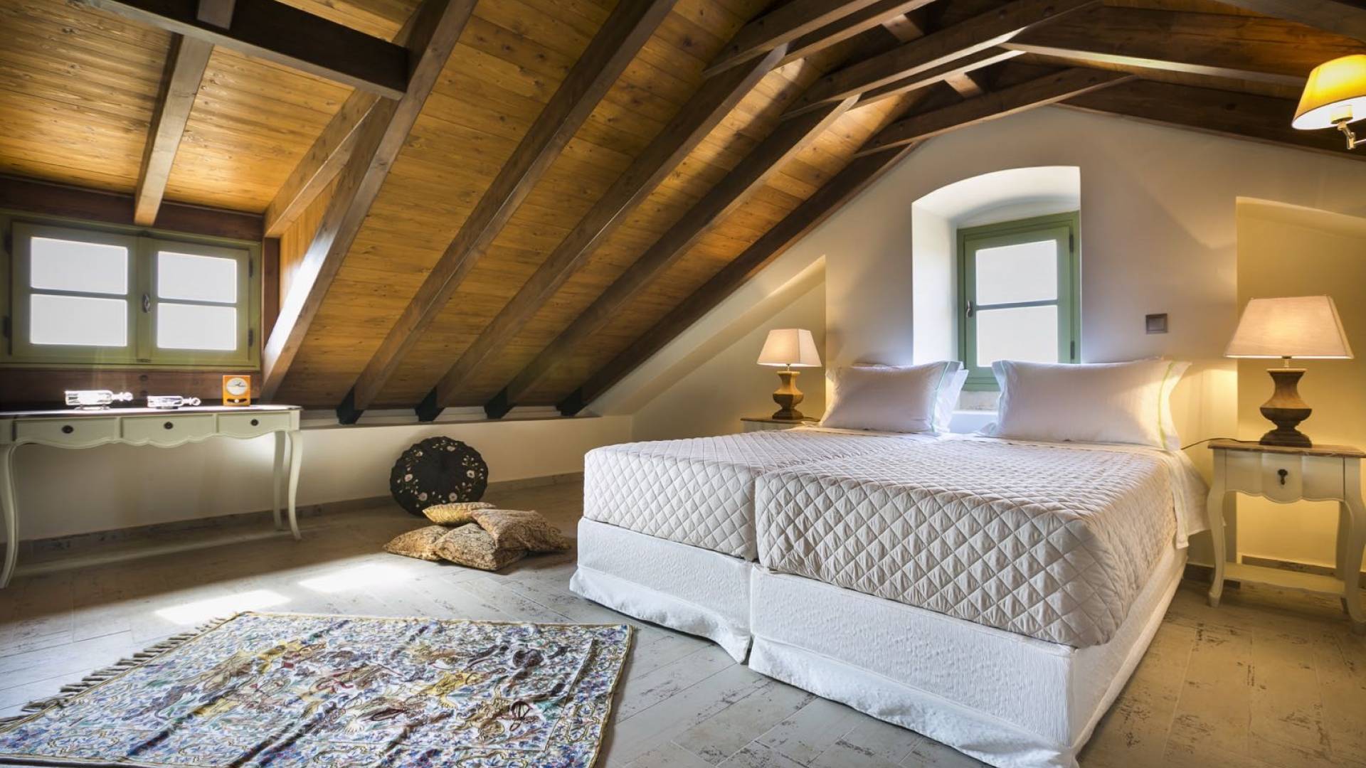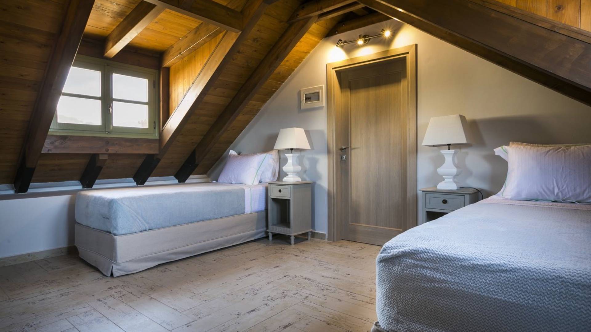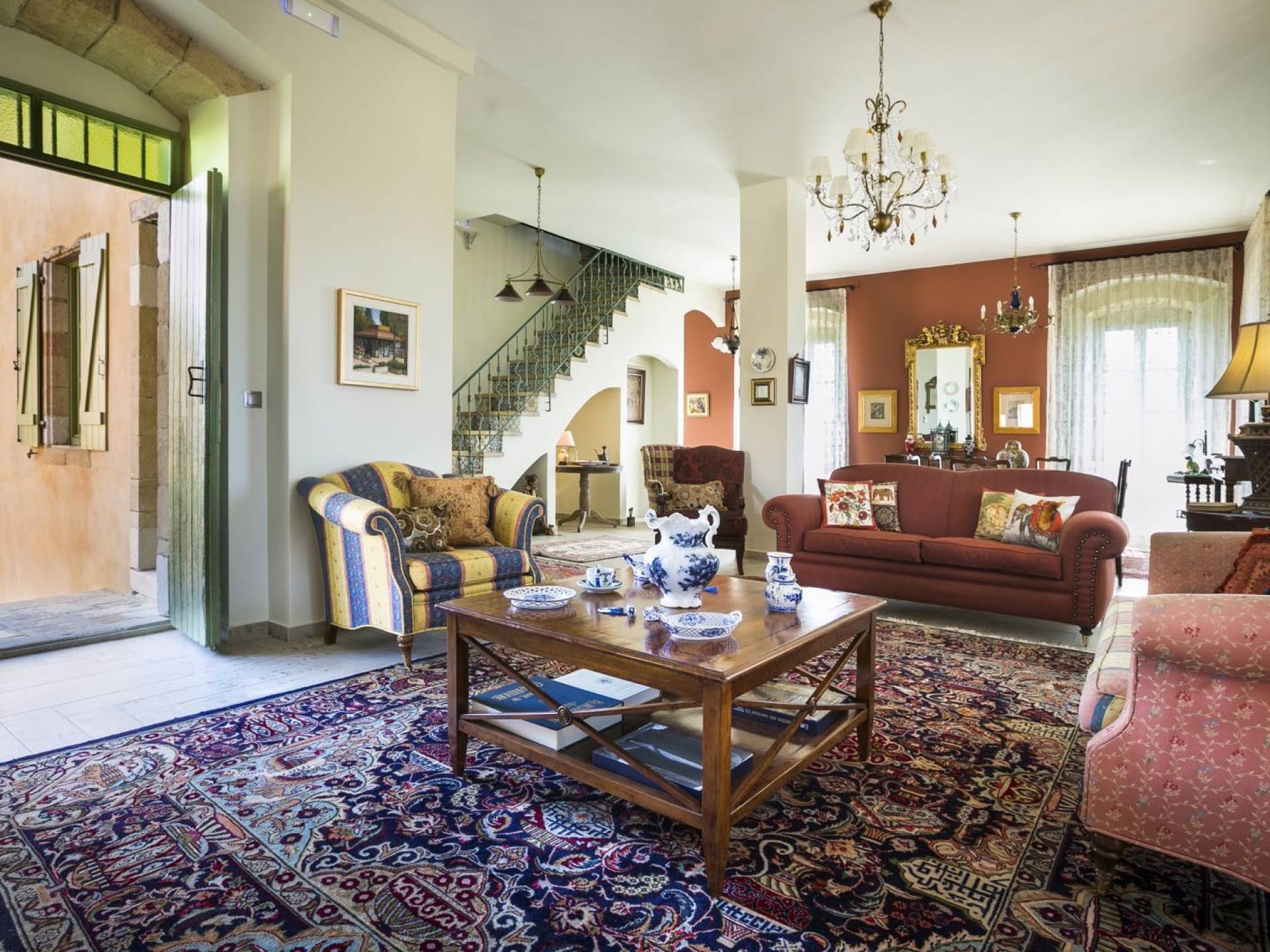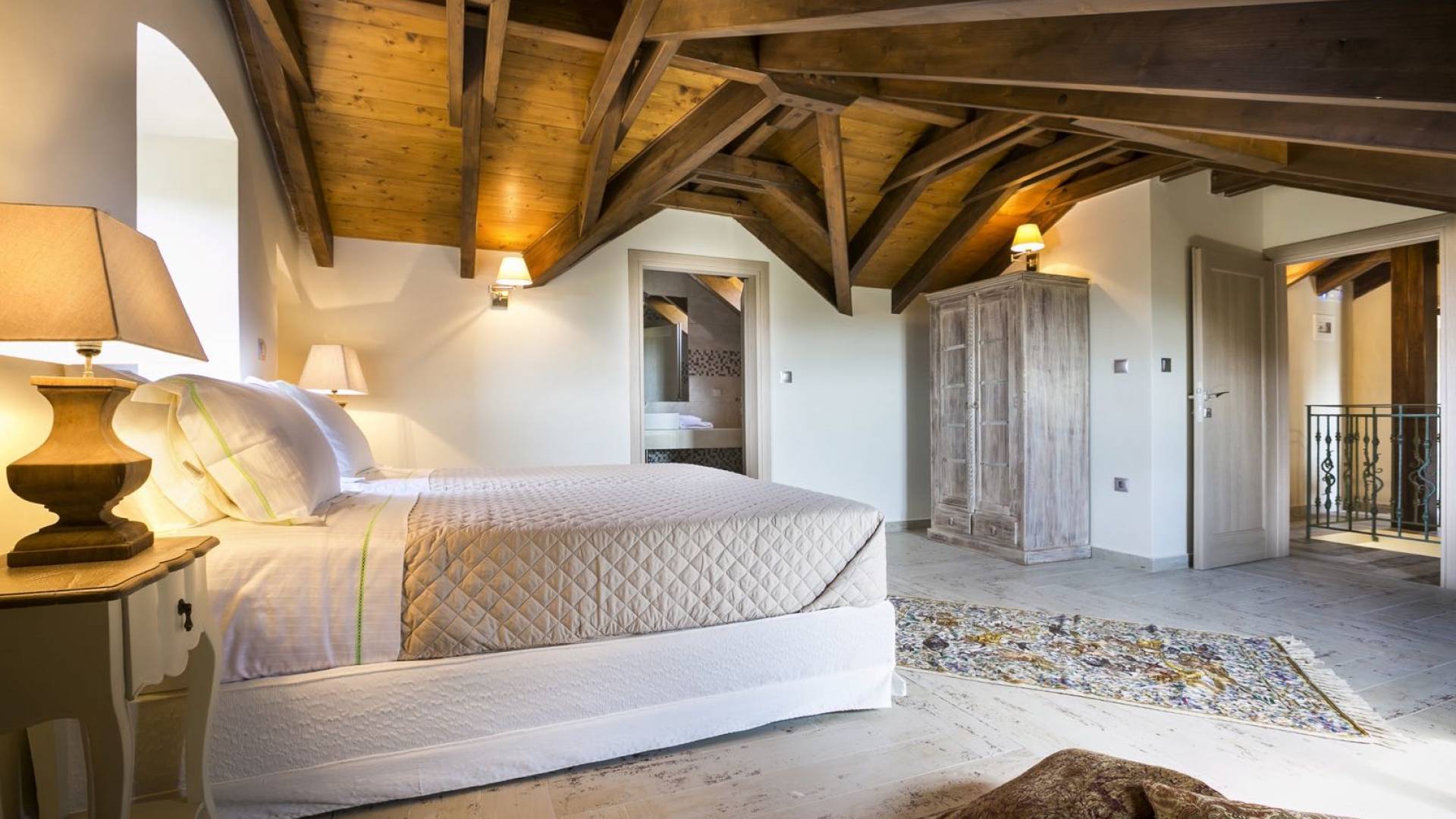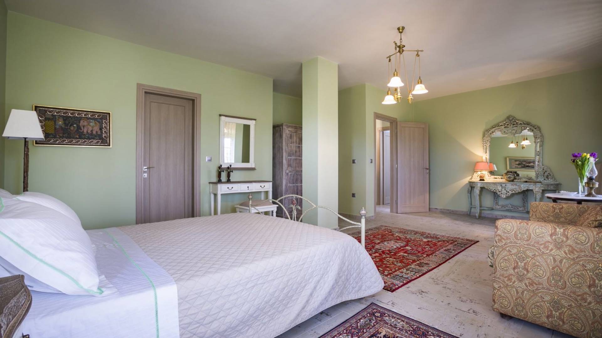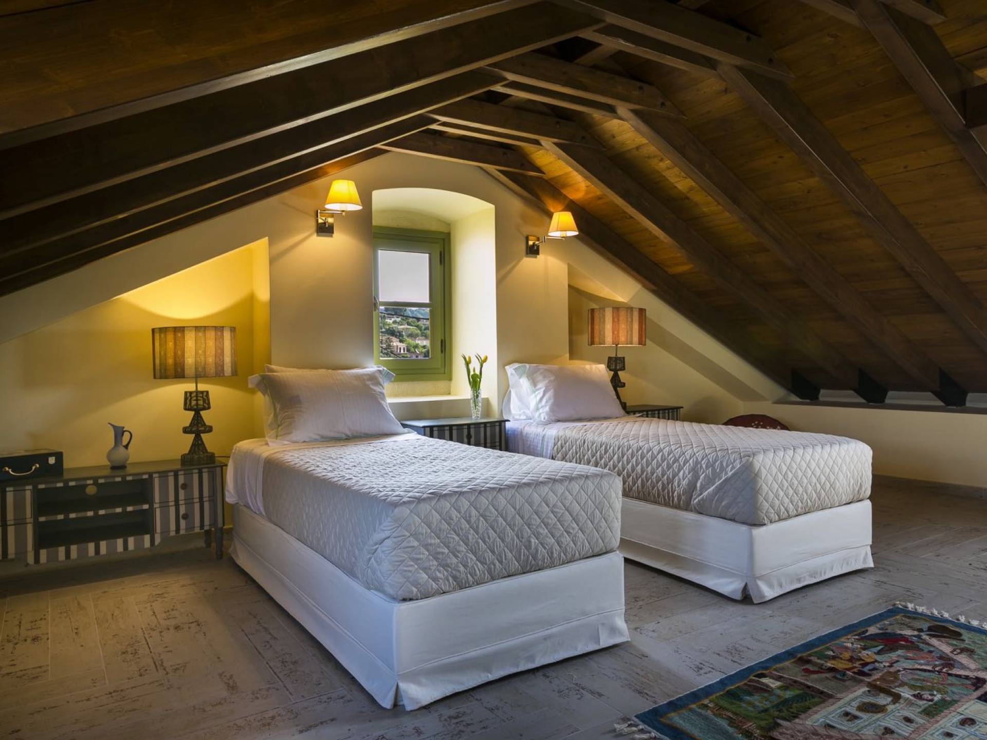 Au rez-de-chaussée, il y a deux suites, chacune avec une grande salle de bain, un lit queen-size, un coin salon et un coffre-fort. Il y a aussi un espace indépendant avec un bureau et une bibliothèque avec un PC, un Fax et une connexion Wi-Fi gratuite. Au rez-de-chaussée, il y a aussi une petite église privée dédiée à Saint-Nicolas et Saint-Georges, avec une entrée séparée et un point d'accès depuis les environs. A l'étage, il y a deux grands salons, une salle à manger pour un total de 12 personnes, une cuisine entièrement équipée avec une deuxième grande salle à manger avec télévision par satellite et une salle de bain supplémentaire pour les invités. Dans les combles, il y a trois chambres, chacune avec une salle de bain en suite, avec des lits jumeaux qui peuvent être réunis pour faire un lit queen-size et une vue panoramique. Toutes les chambres disposent de draps de luxe et d'articles de toilette Anne Semonin gratuits.