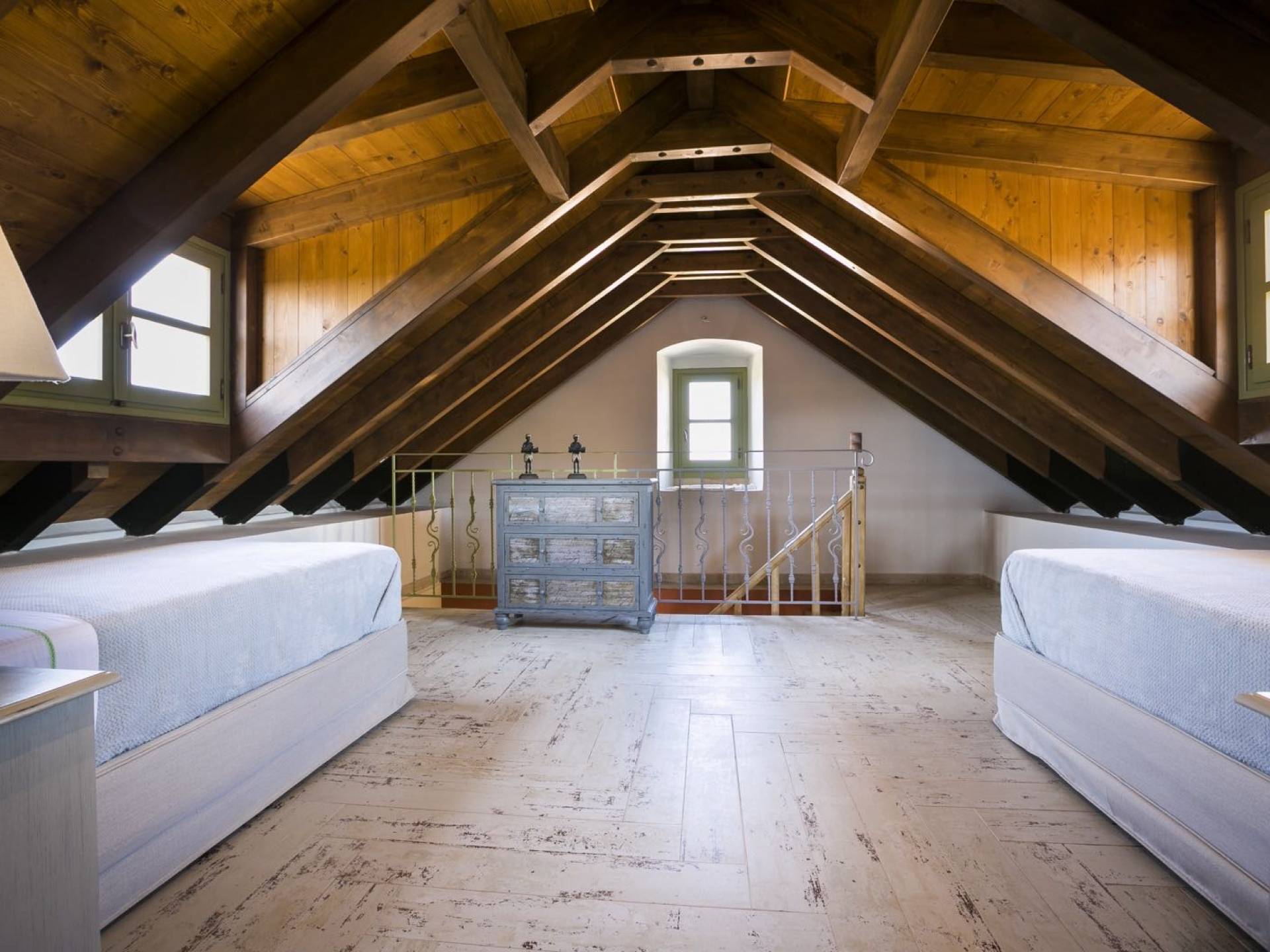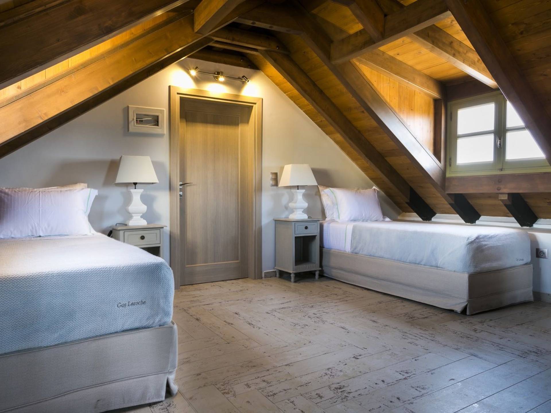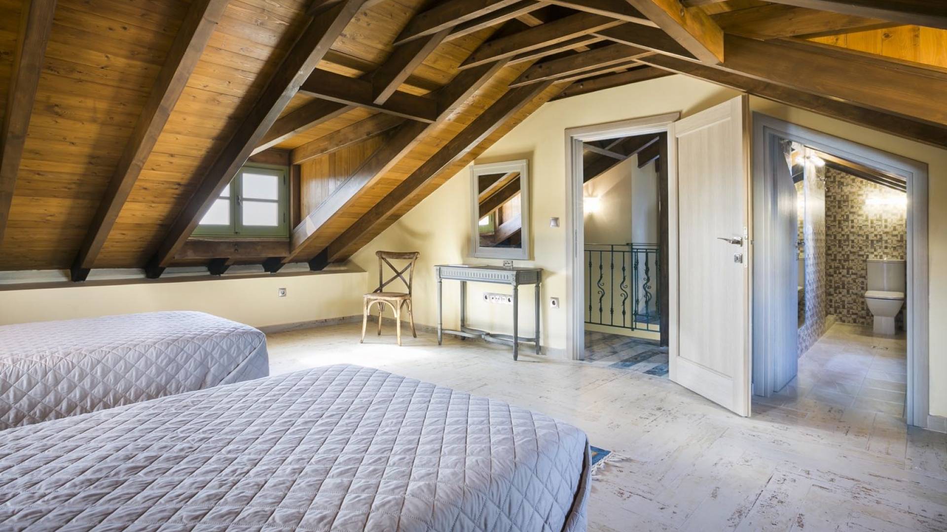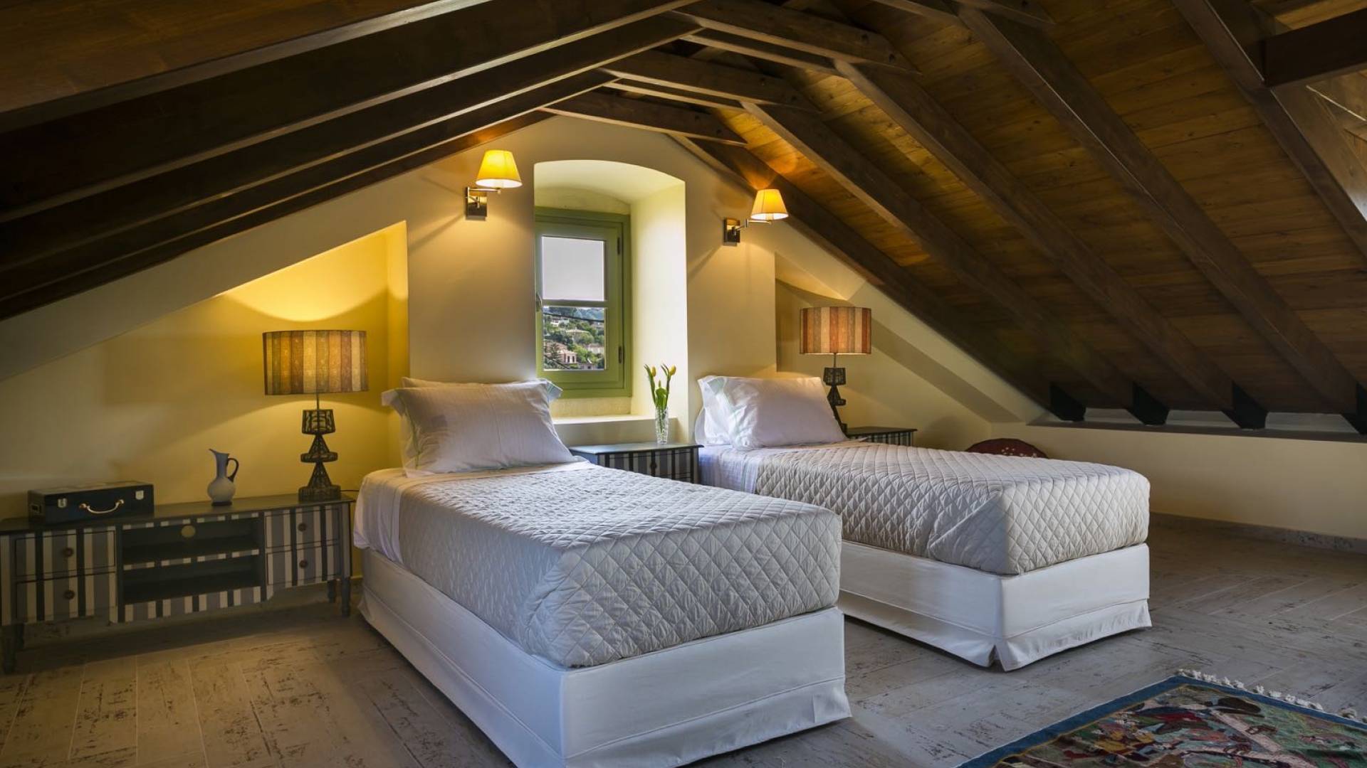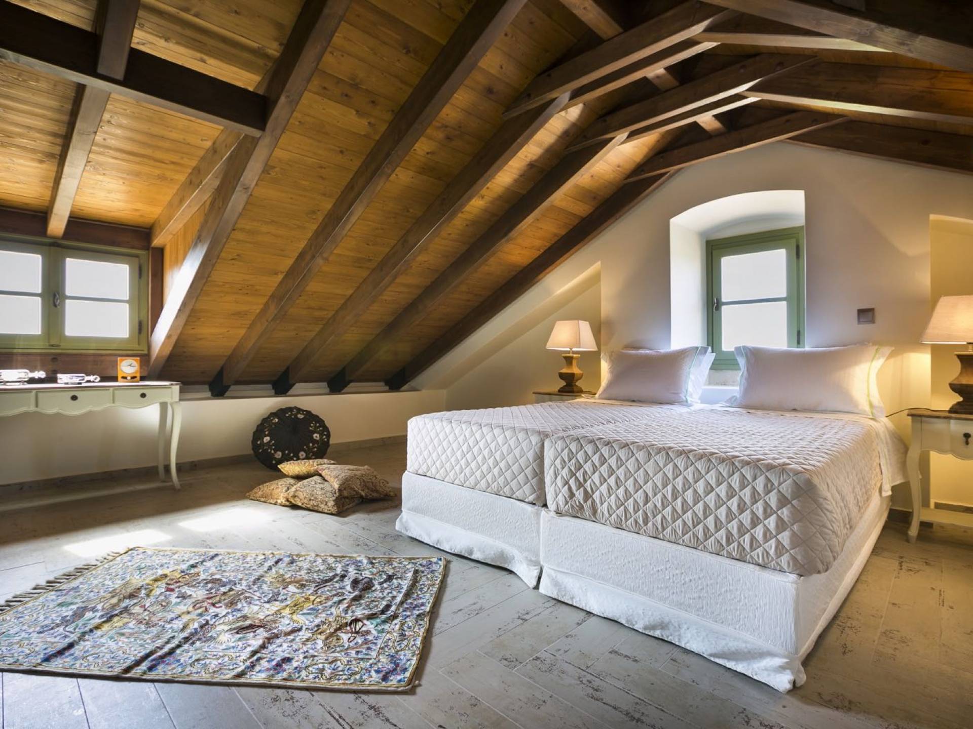 Au rez-de-chaussée, il y a deux suites, chacune avec une grande salle de bain, un lit queen-size, un coin salon et un coffre-fort. Il y a aussi un espace indépendant avec un bureau et une bibliothèque avec un PC, un Fax et une connexion Wi-Fi gratuite. Au rez-de-chaussée, il y a aussi une petite église privée dédiée à Saint-Nicolas et Saint-Georges, avec une entrée séparée et un point d'accès depuis les environs. A l'étage, il y a deux grands salons, une salle à manger pour un total de 12 personnes, une cuisine entièrement équipée avec une deuxième grande salle à manger avec télévision par satellite et une salle de bain supplémentaire pour les invités. Dans les combles, il y a trois chambres, chacune avec une salle de bain en suite, avec des lits jumeaux qui peuvent être réunis pour faire un lit queen-size et une vue panoramique. Toutes les chambres disposent de draps de luxe et d'articles de toilette Anne Semonin gratuits.