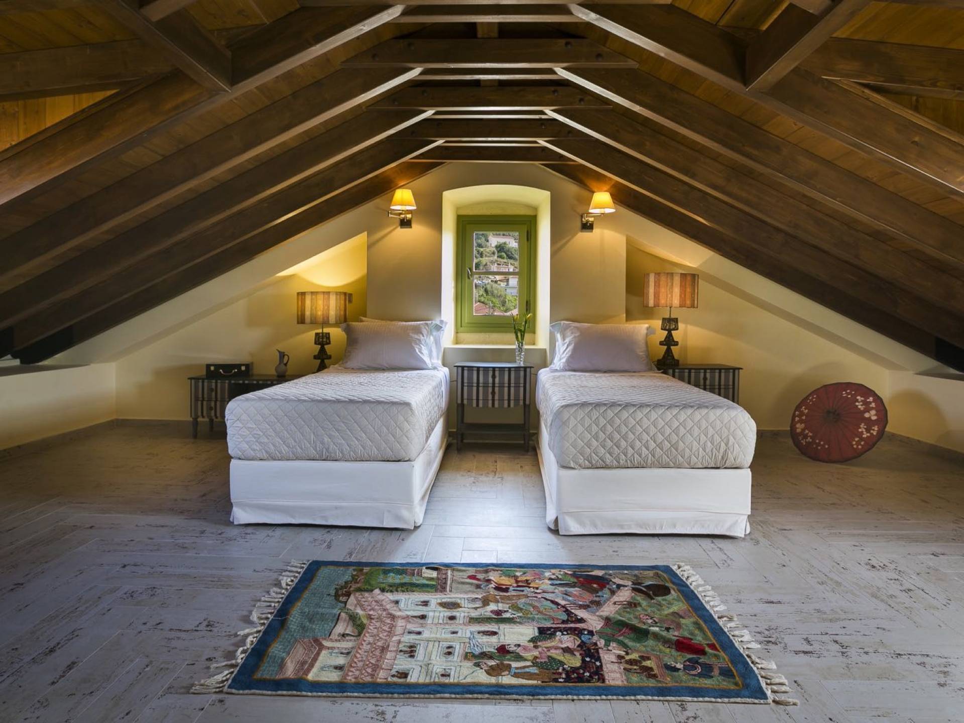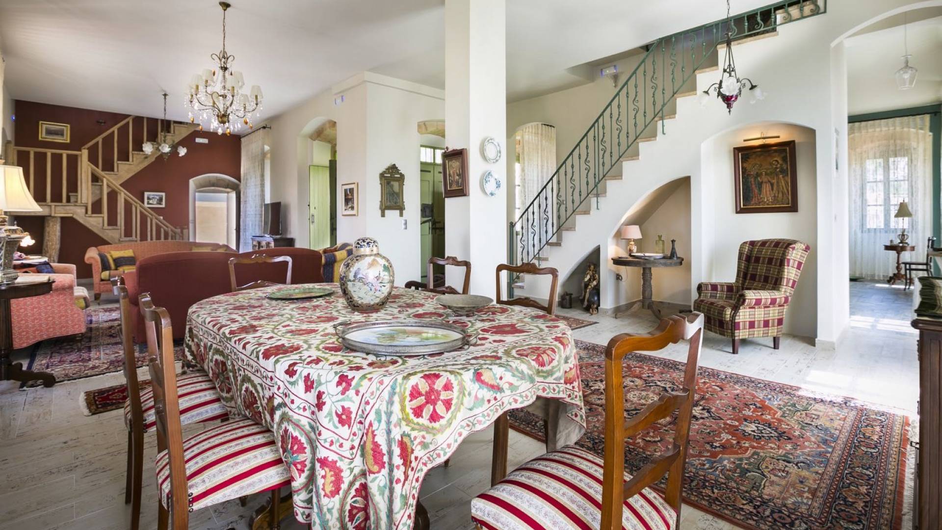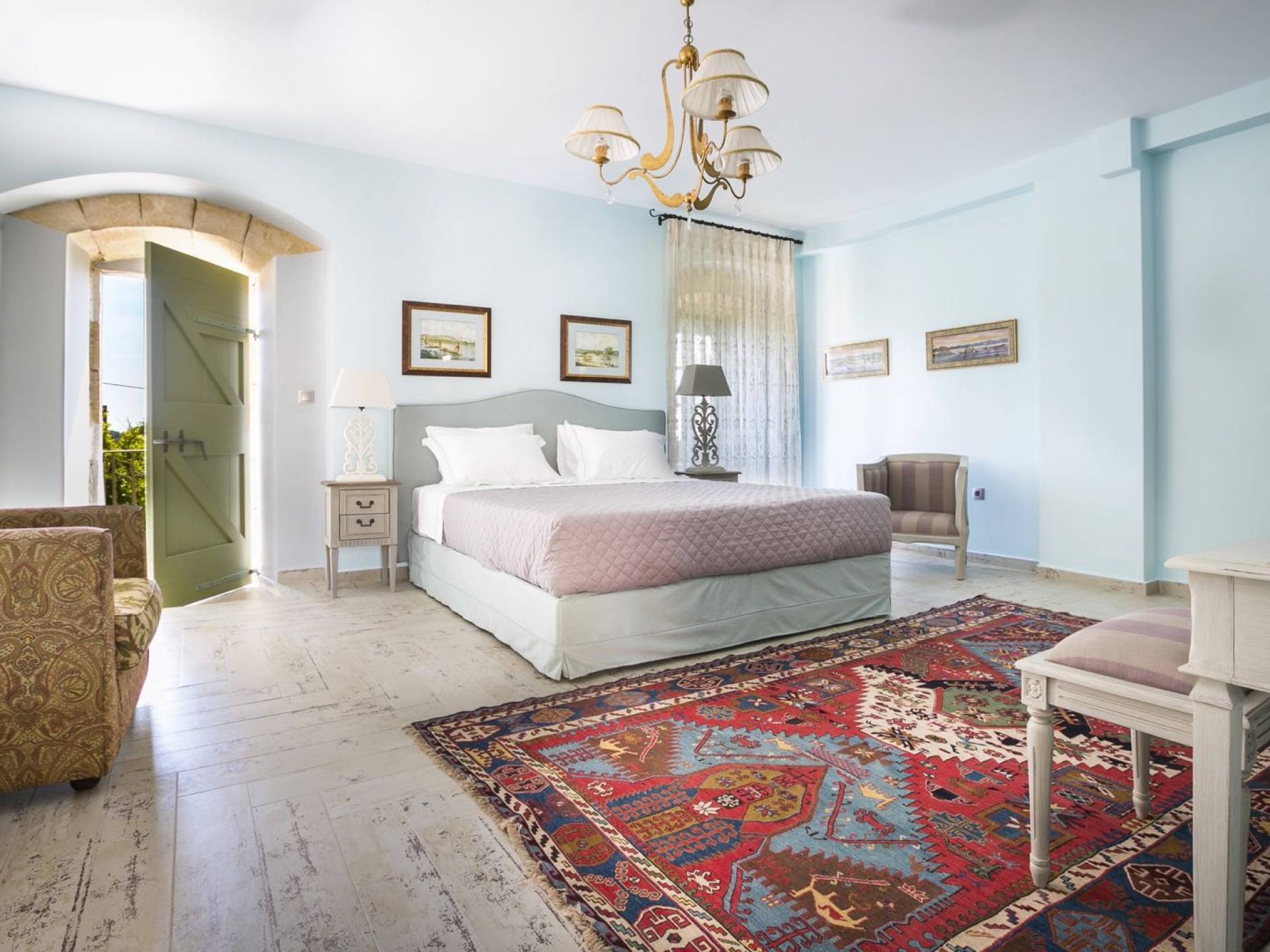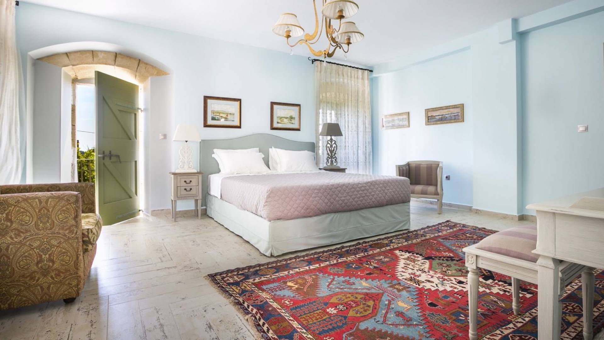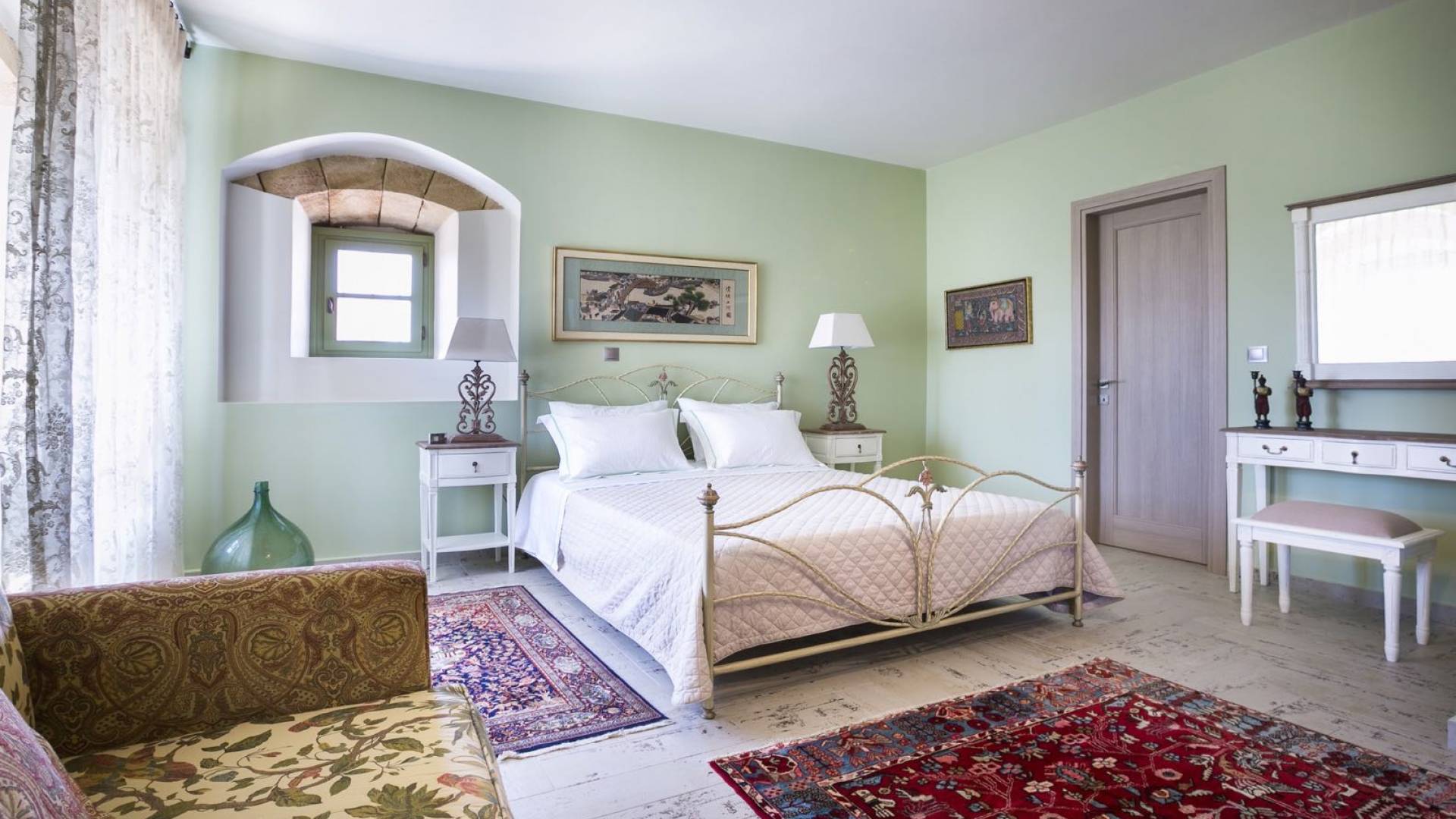 Au rez-de-chaussée, il y a deux suites, chacune avec une grande salle de bain, un lit queen-size, un coin salon et un coffre-fort. Il y a aussi un espace indépendant avec un bureau et une bibliothèque avec un PC, un Fax et une connexion Wi-Fi gratuite. Au rez-de-chaussée, il y a aussi une petite église privée dédiée à Saint-Nicolas et Saint-Georges, avec une entrée séparée et un point d'accès depuis les environs. A l'étage, il y a deux grands salons, une salle à manger pour un total de 12 personnes, une cuisine entièrement équipée avec une deuxième grande salle à manger avec télévision par satellite et une salle de bain supplémentaire pour les invités. Dans les combles, il y a trois chambres, chacune avec une salle de bain en suite, avec des lits jumeaux qui peuvent être réunis pour faire un lit queen-size et une vue panoramique. Toutes les chambres disposent de draps de luxe et d'articles de toilette Anne Semonin gratuits.