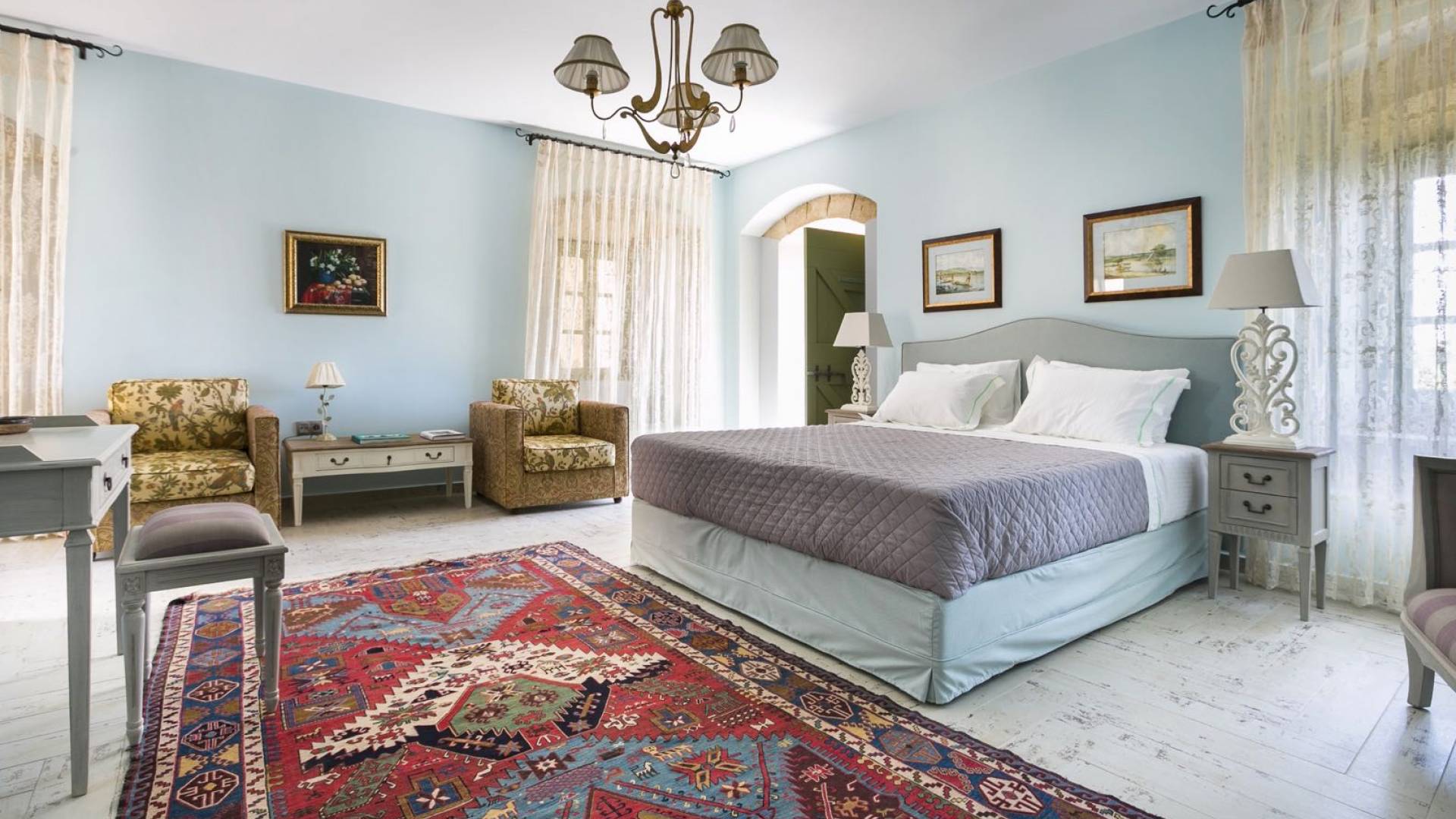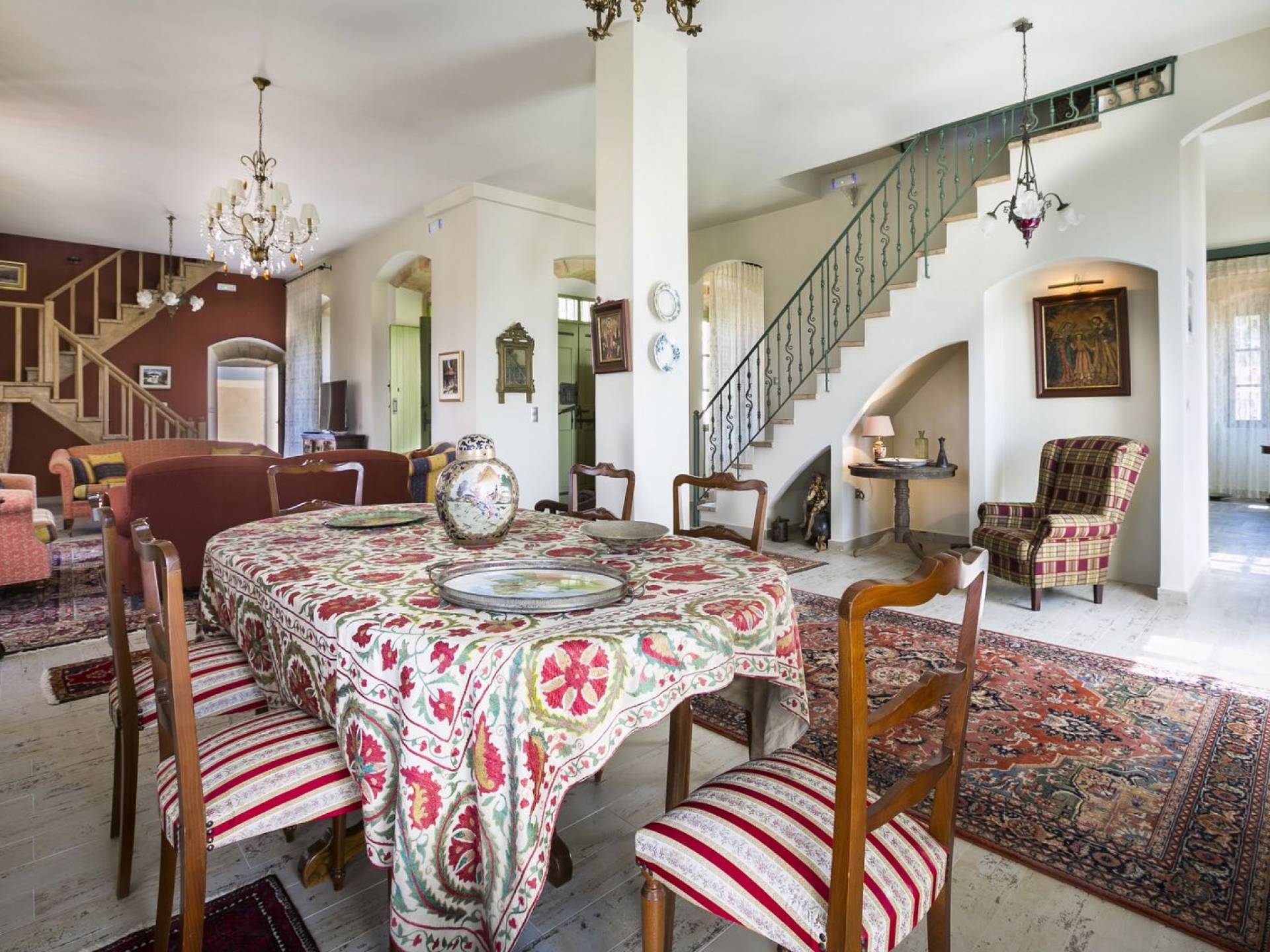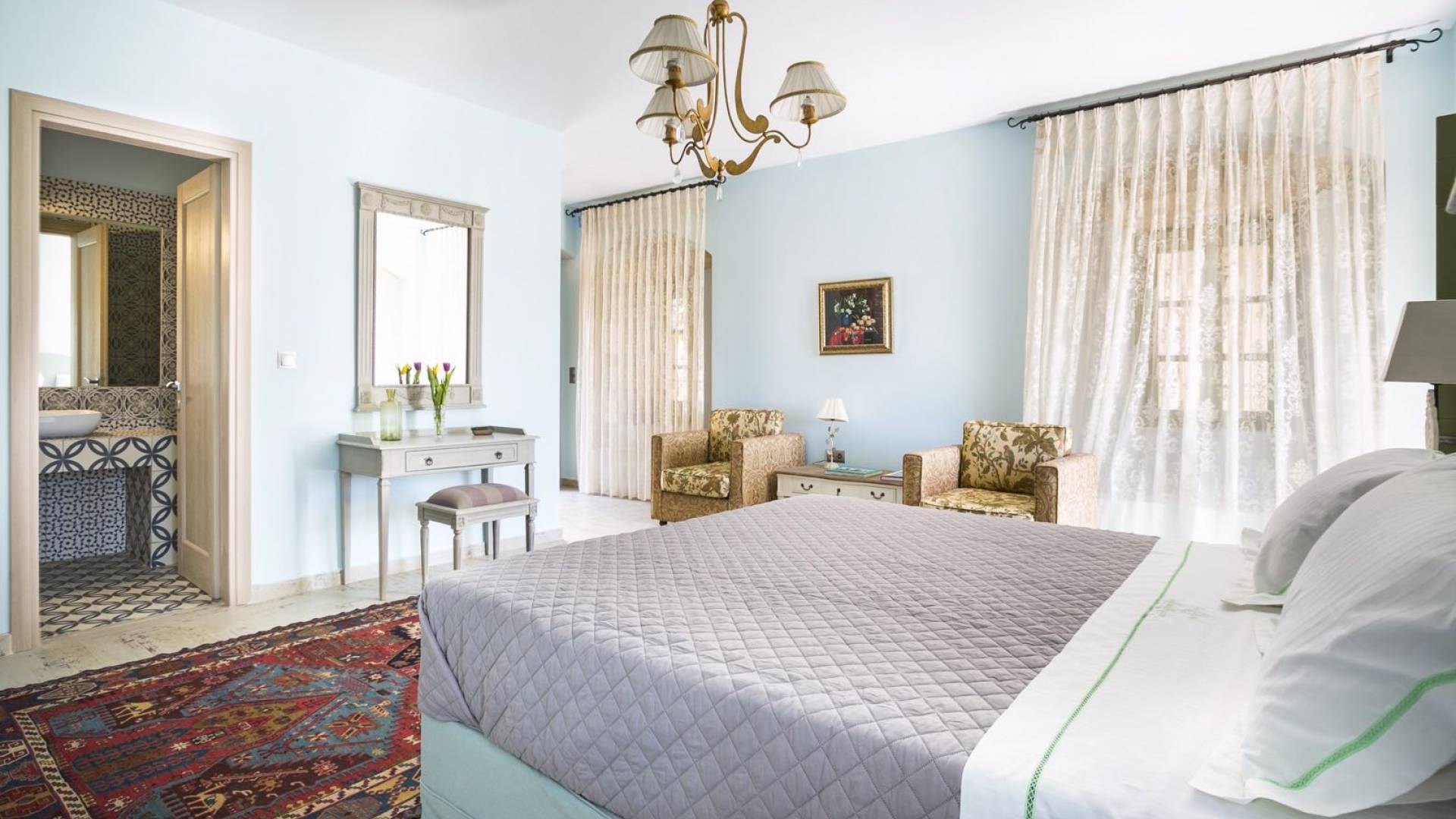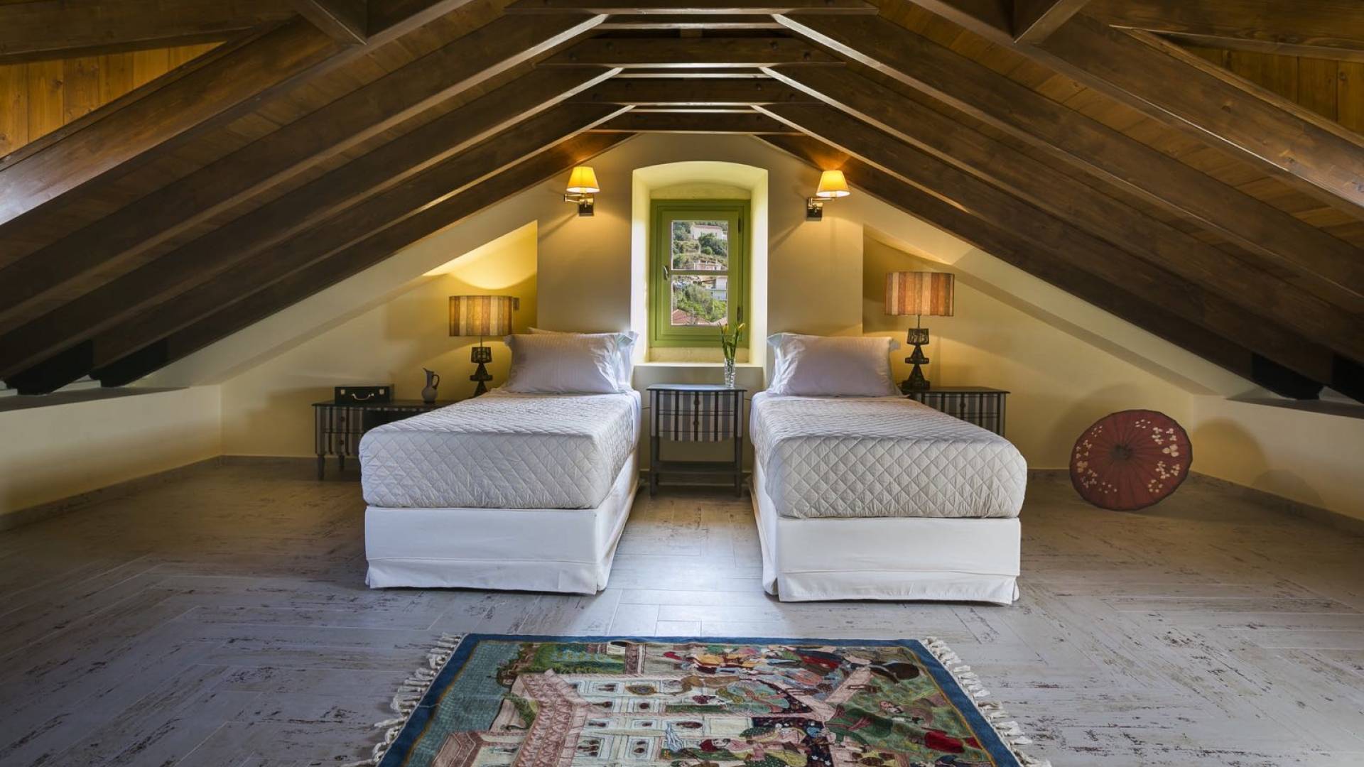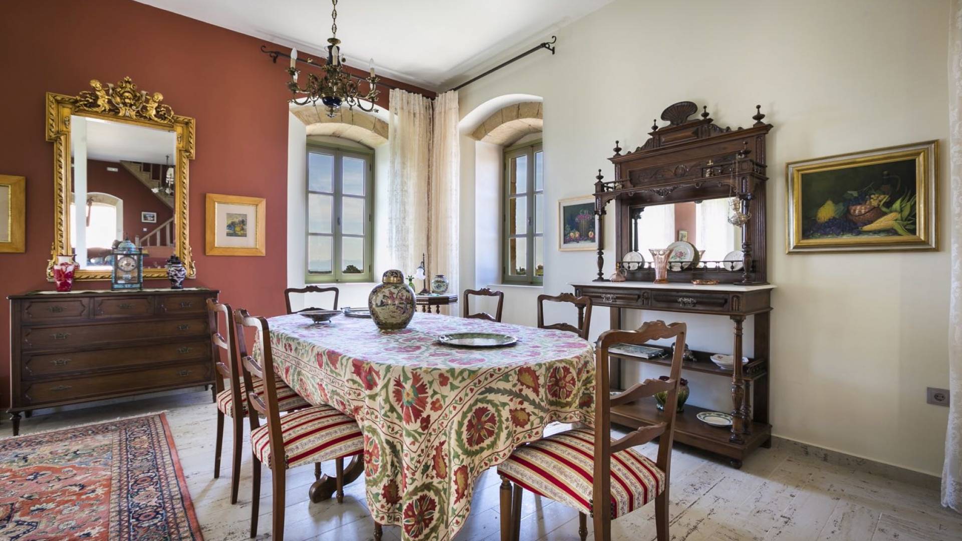 Au rez-de-chaussée, il y a deux suites, chacune avec une grande salle de bain, un lit queen-size, un coin salon et un coffre-fort. Il y a aussi un espace indépendant avec un bureau et une bibliothèque avec un PC, un Fax et une connexion Wi-Fi gratuite. Au rez-de-chaussée, il y a aussi une petite église privée dédiée à Saint-Nicolas et Saint-Georges, avec une entrée séparée et un point d'accès depuis les environs. A l'étage, il y a deux grands salons, une salle à manger pour un total de 12 personnes, une cuisine entièrement équipée avec une deuxième grande salle à manger avec télévision par satellite et une salle de bain supplémentaire pour les invités. Dans les combles, il y a trois chambres, chacune avec une salle de bain en suite, avec des lits jumeaux qui peuvent être réunis pour faire un lit queen-size et une vue panoramique. Toutes les chambres disposent de draps de luxe et d'articles de toilette Anne Semonin gratuits.