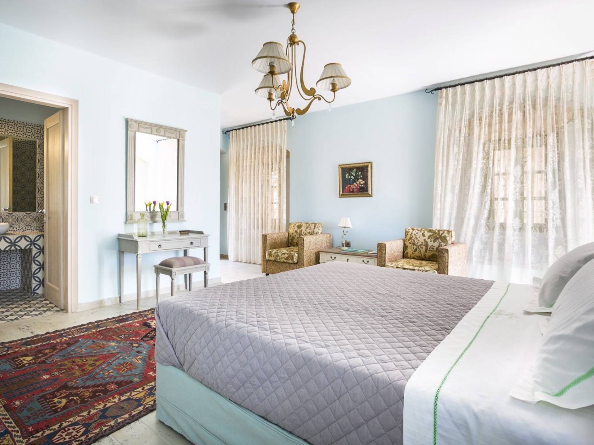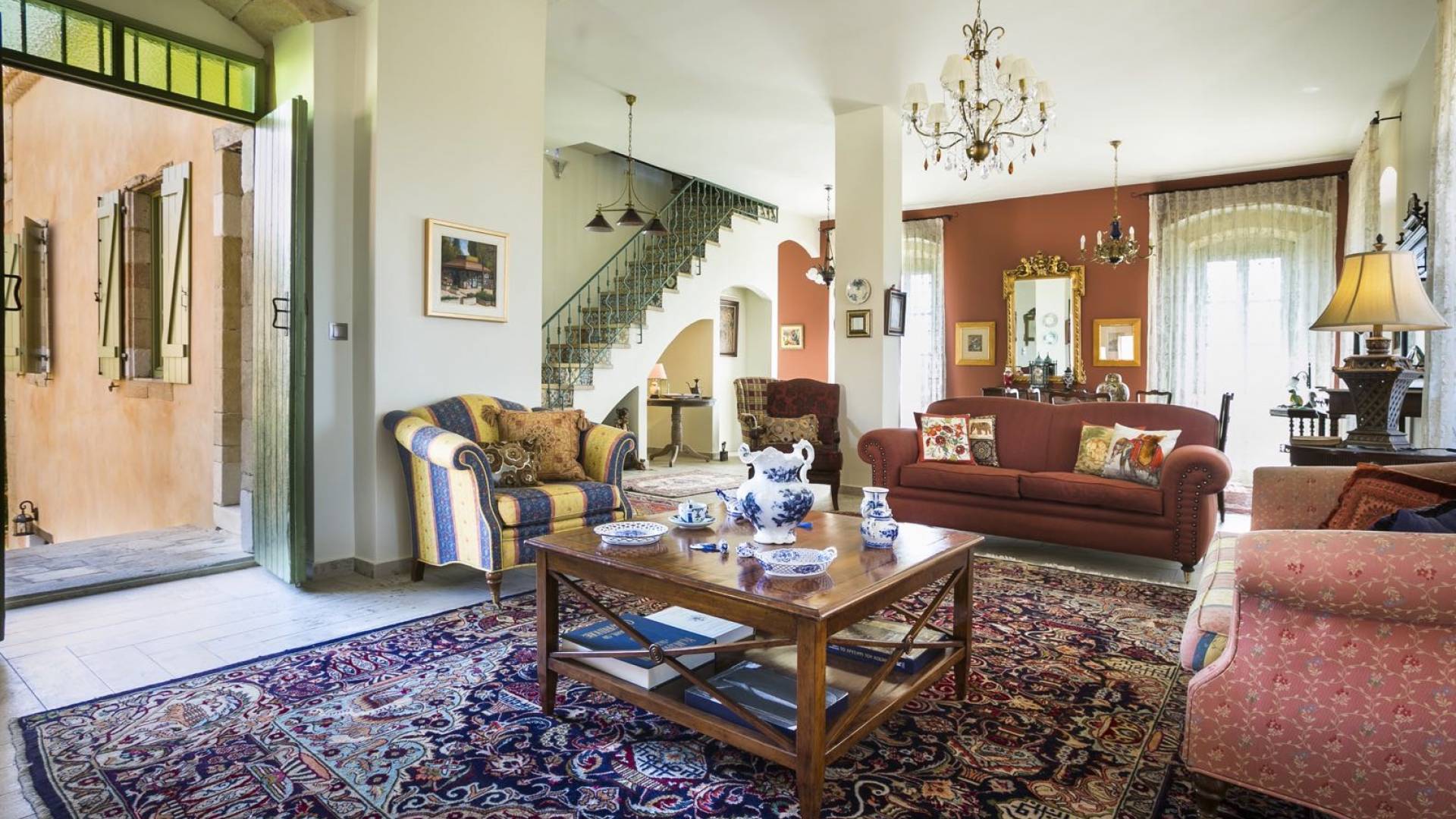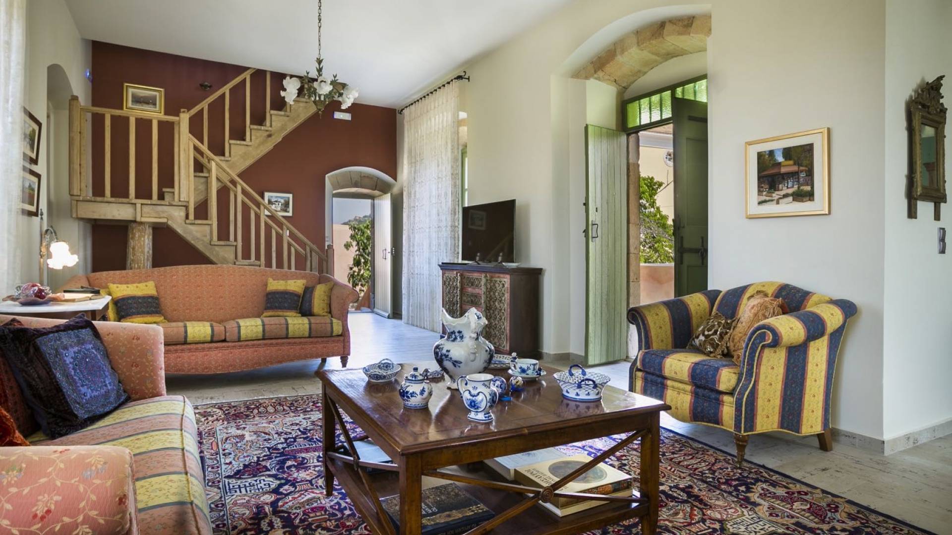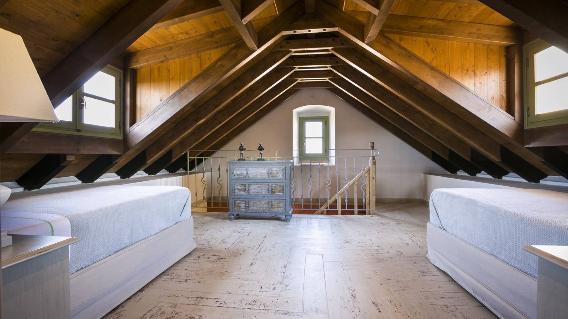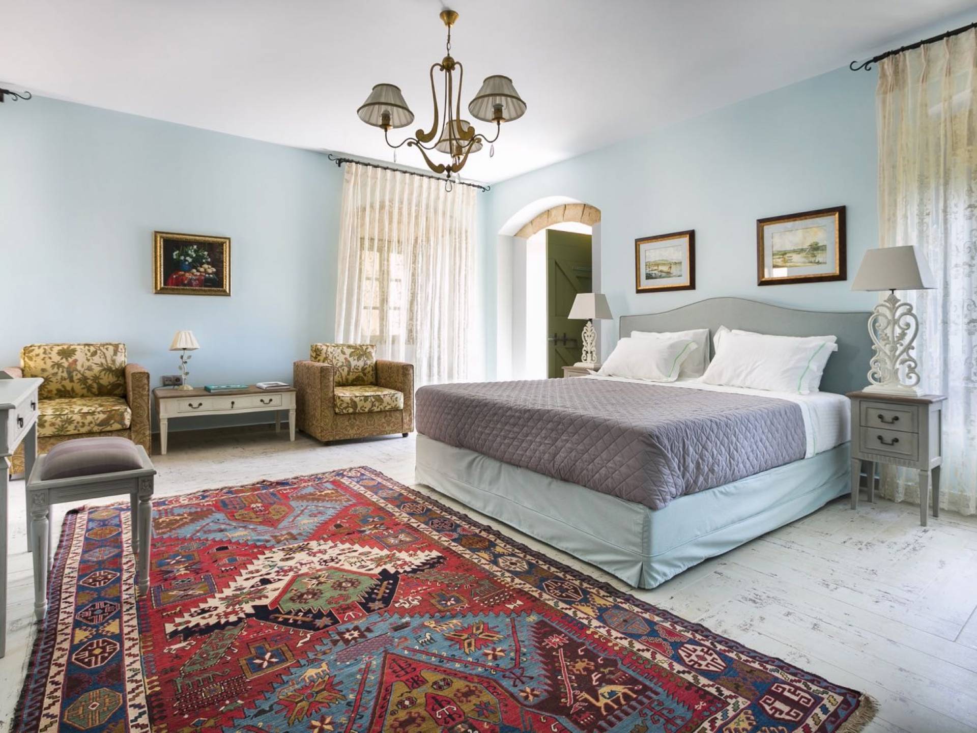 Au rez-de-chaussée, il y a deux suites, chacune avec une grande salle de bain, un lit queen-size, un coin salon et un coffre-fort. Il y a aussi un espace indépendant avec un bureau et une bibliothèque avec un PC, un Fax et une connexion Wi-Fi gratuite. Au rez-de-chaussée, il y a aussi une petite église privée dédiée à Saint-Nicolas et Saint-Georges, avec une entrée séparée et un point d'accès depuis les environs. A l'étage, il y a deux grands salons, une salle à manger pour un total de 12 personnes, une cuisine entièrement équipée avec une deuxième grande salle à manger avec télévision par satellite et une salle de bain supplémentaire pour les invités. Dans les combles, il y a trois chambres, chacune avec une salle de bain en suite, avec des lits jumeaux qui peuvent être réunis pour faire un lit queen-size et une vue panoramique. Toutes les chambres disposent de draps de luxe et d'articles de toilette Anne Semonin gratuits.