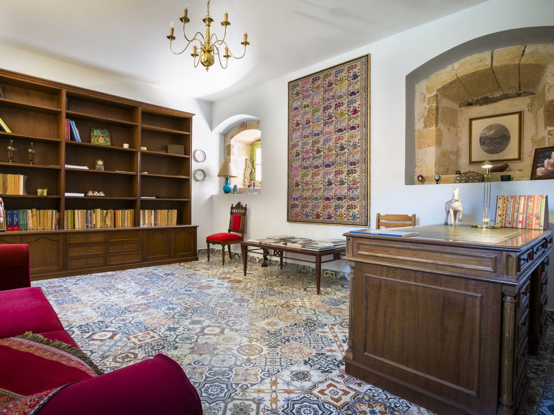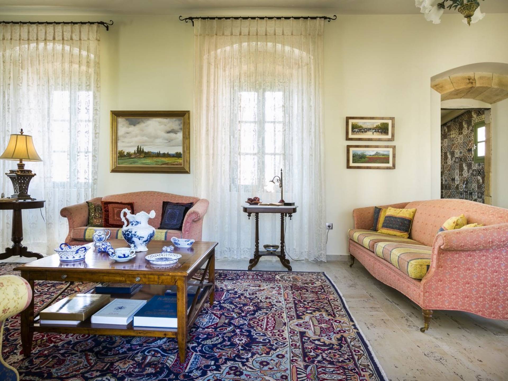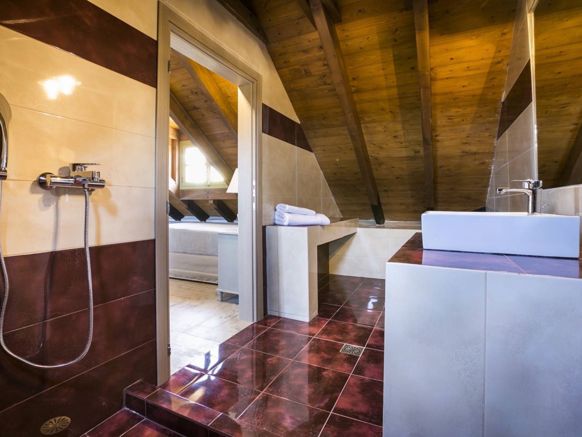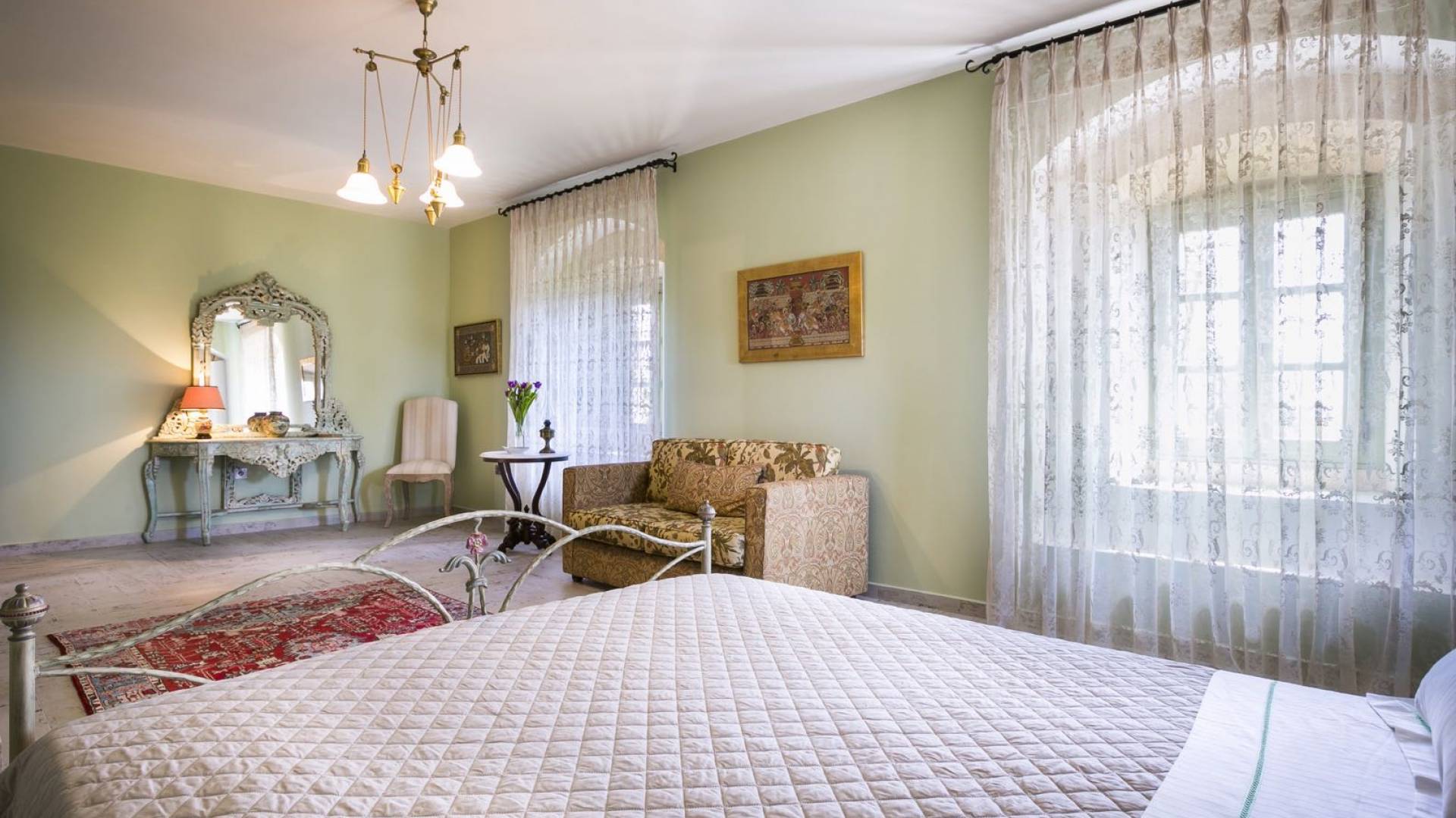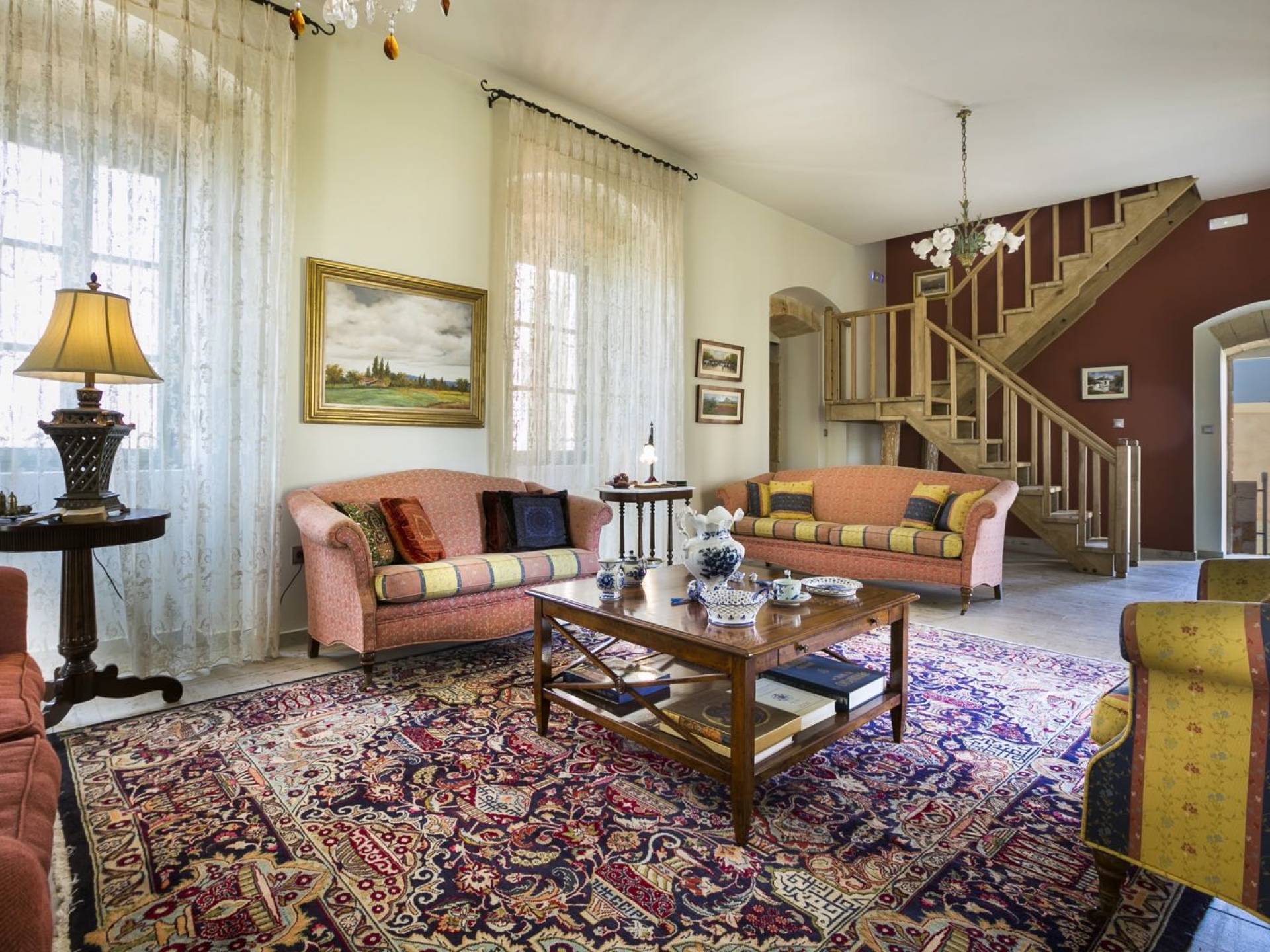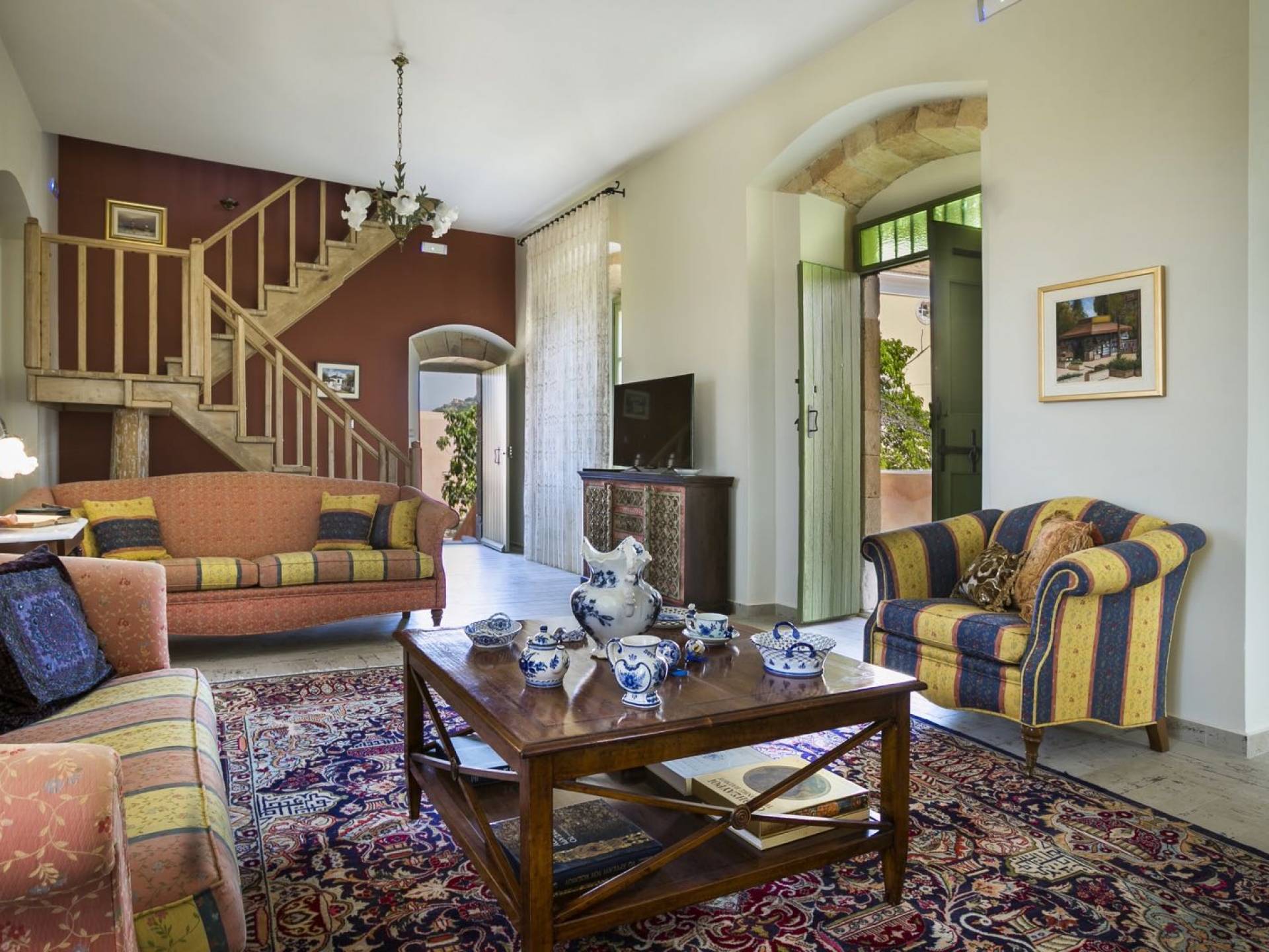 Au rez-de-chaussée, il y a deux suites, chacune avec une grande salle de bain, un lit queen-size, un coin salon et un coffre-fort. Il y a aussi un espace indépendant avec un bureau et une bibliothèque avec un PC, un Fax et une connexion Wi-Fi gratuite. Au rez-de-chaussée, il y a aussi une petite église privée dédiée à Saint-Nicolas et Saint-Georges, avec une entrée séparée et un point d'accès depuis les environs. A l'étage, il y a deux grands salons, une salle à manger pour un total de 12 personnes, une cuisine entièrement équipée avec une deuxième grande salle à manger avec télévision par satellite et une salle de bain supplémentaire pour les invités. Dans les combles, il y a trois chambres, chacune avec une salle de bain en suite, avec des lits jumeaux qui peuvent être réunis pour faire un lit queen-size et une vue panoramique. Toutes les chambres disposent de draps de luxe et d'articles de toilette Anne Semonin gratuits.