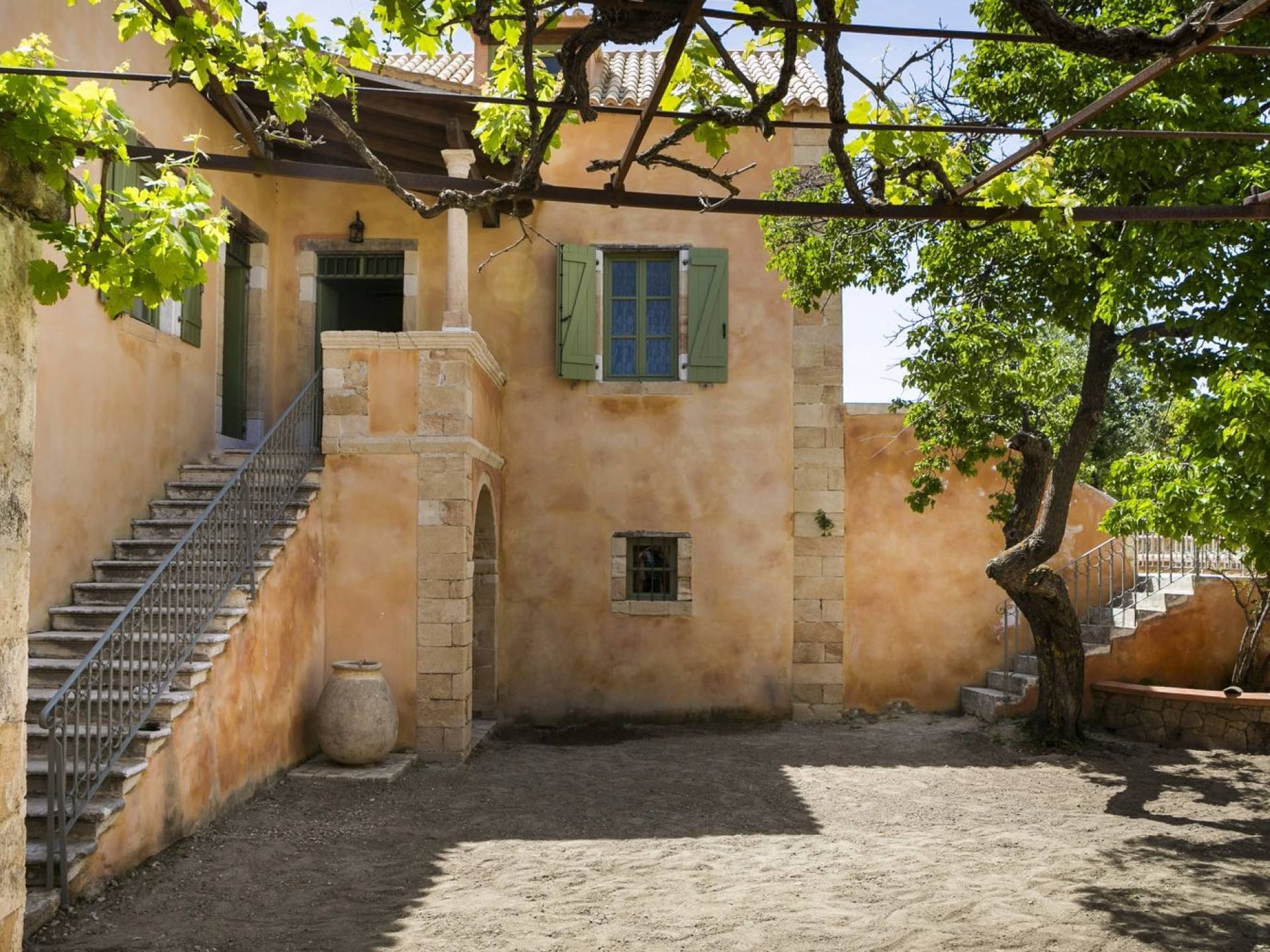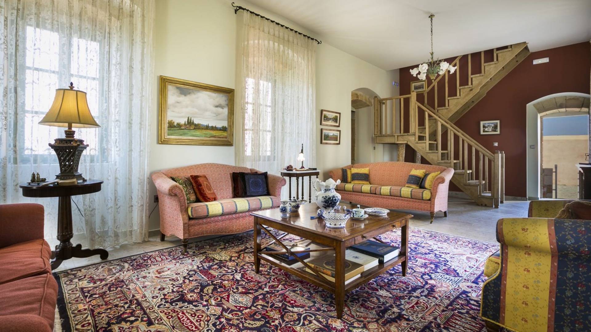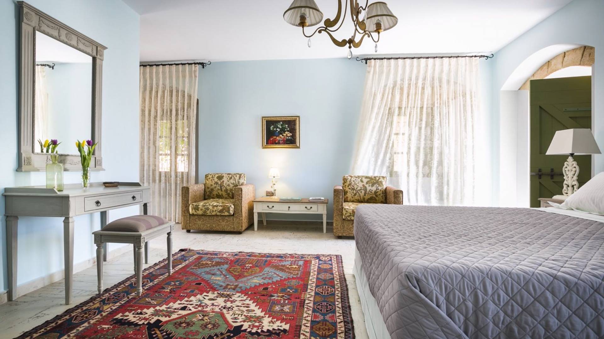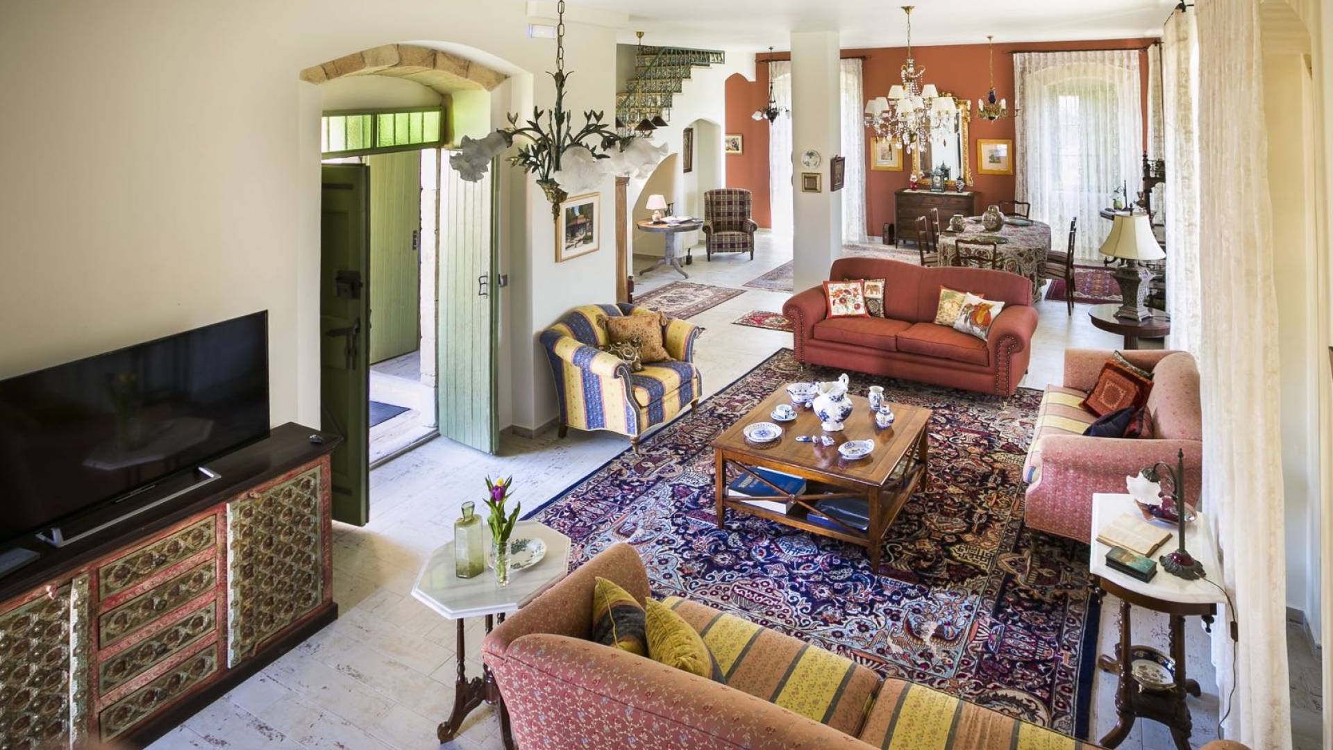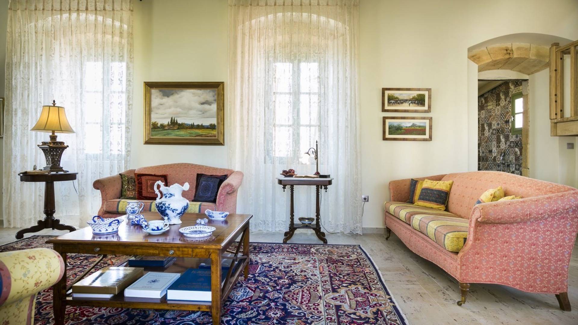 Au rez-de-chaussée, il y a deux suites, chacune avec une grande salle de bain, un lit queen-size, un coin salon et un coffre-fort. Il y a aussi un espace indépendant avec un bureau et une bibliothèque avec un PC, un Fax et une connexion Wi-Fi gratuite. Au rez-de-chaussée, il y a aussi une petite église privée dédiée à Saint-Nicolas et Saint-Georges, avec une entrée séparée et un point d'accès depuis les environs. A l'étage, il y a deux grands salons, une salle à manger pour un total de 12 personnes, une cuisine entièrement équipée avec une deuxième grande salle à manger avec télévision par satellite et une salle de bain supplémentaire pour les invités. Dans les combles, il y a trois chambres, chacune avec une salle de bain en suite, avec des lits jumeaux qui peuvent être réunis pour faire un lit queen-size et une vue panoramique. Toutes les chambres disposent de draps de luxe et d'articles de toilette Anne Semonin gratuits.