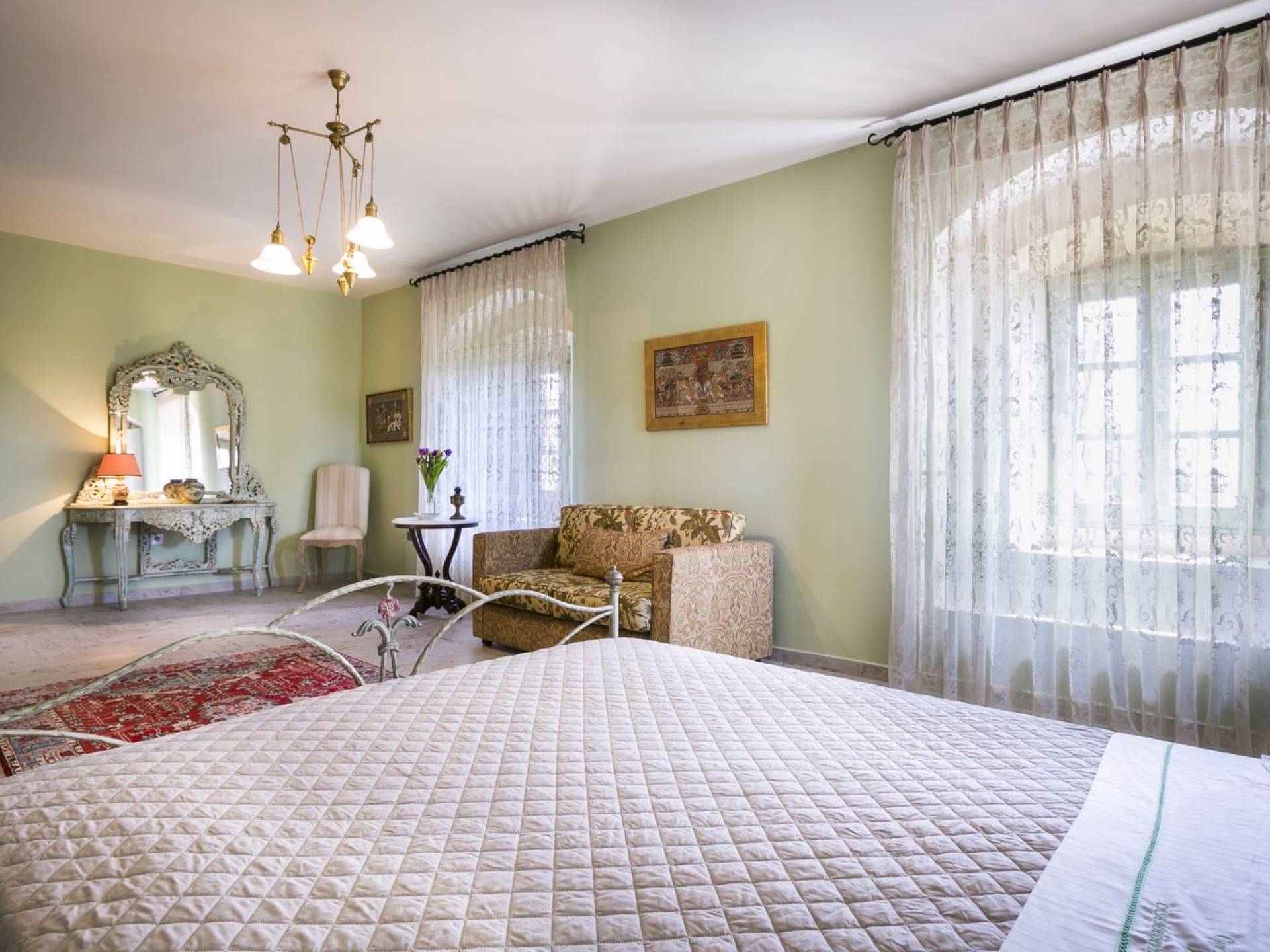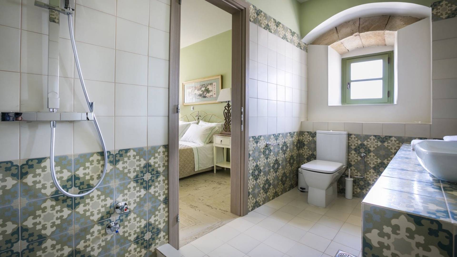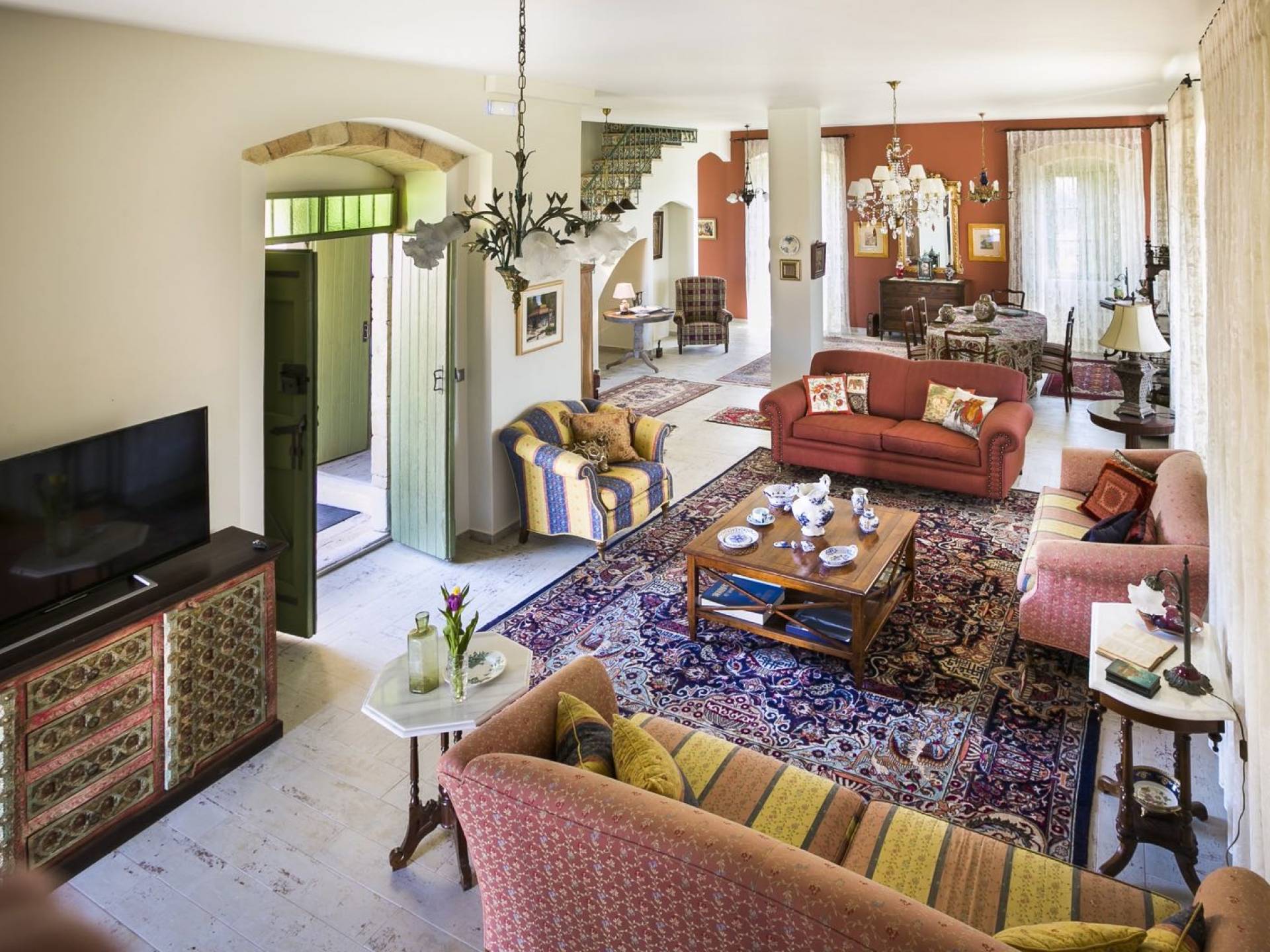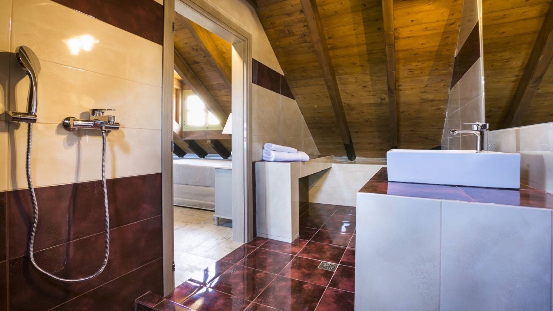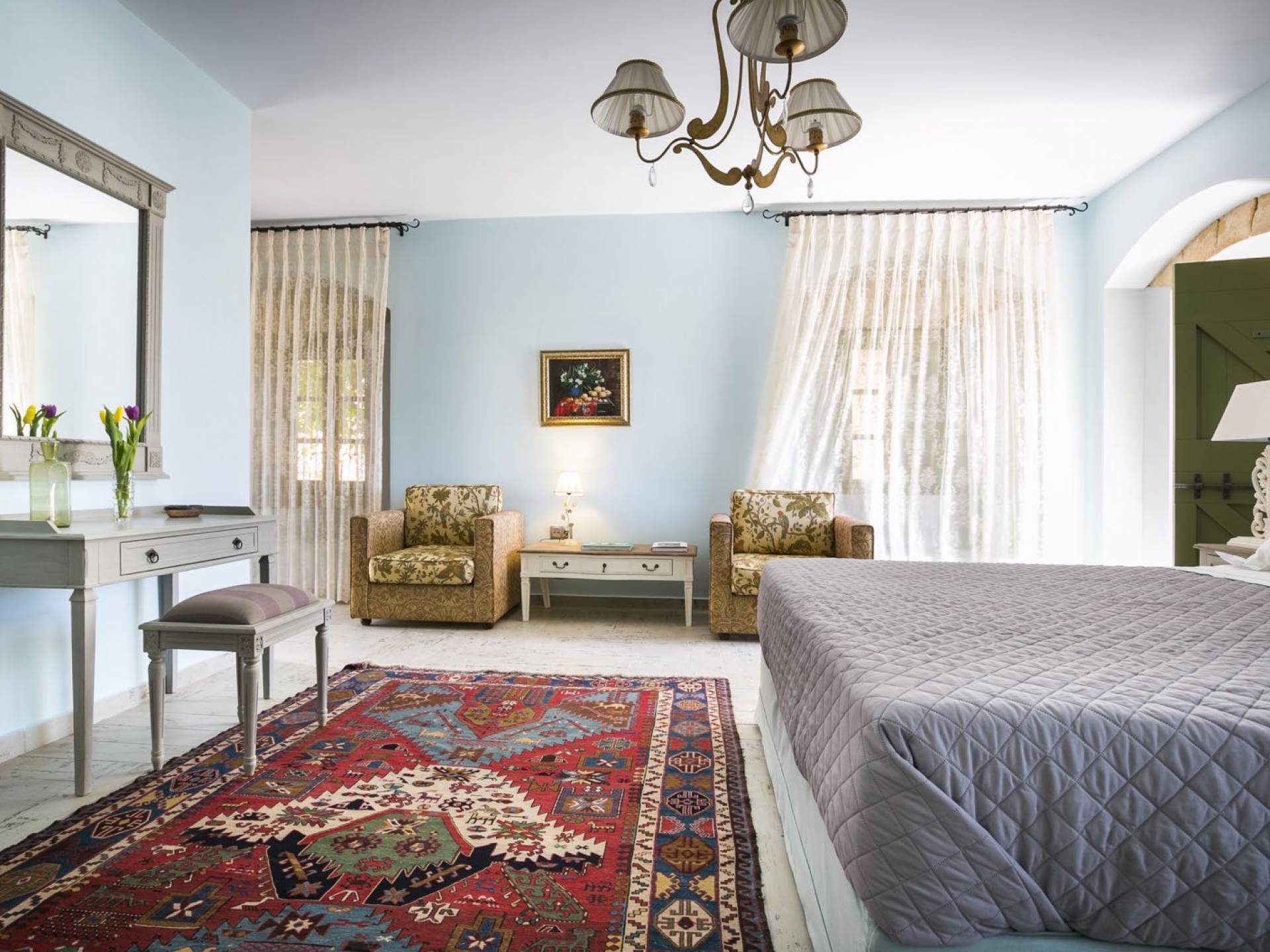 Au rez-de-chaussée, il y a deux suites, chacune avec une grande salle de bain, un lit queen-size, un coin salon et un coffre-fort. Il y a aussi un espace indépendant avec un bureau et une bibliothèque avec un PC, un Fax et une connexion Wi-Fi gratuite. Au rez-de-chaussée, il y a aussi une petite église privée dédiée à Saint-Nicolas et Saint-Georges, avec une entrée séparée et un point d'accès depuis les environs. A l'étage, il y a deux grands salons, une salle à manger pour un total de 12 personnes, une cuisine entièrement équipée avec une deuxième grande salle à manger avec télévision par satellite et une salle de bain supplémentaire pour les invités. Dans les combles, il y a trois chambres, chacune avec une salle de bain en suite, avec des lits jumeaux qui peuvent être réunis pour faire un lit queen-size et une vue panoramique. Toutes les chambres disposent de draps de luxe et d'articles de toilette Anne Semonin gratuits.