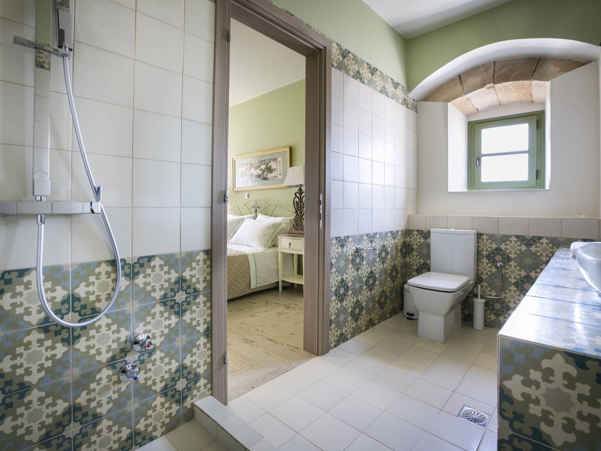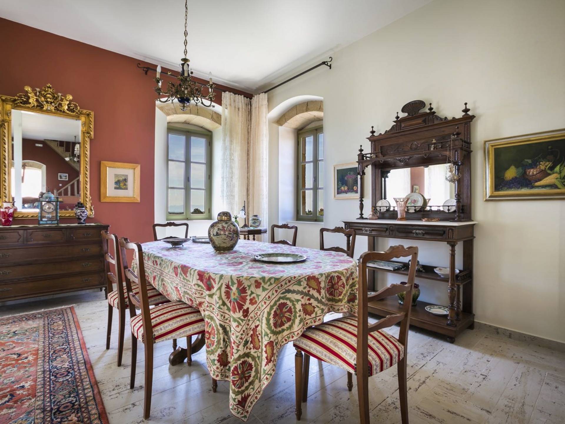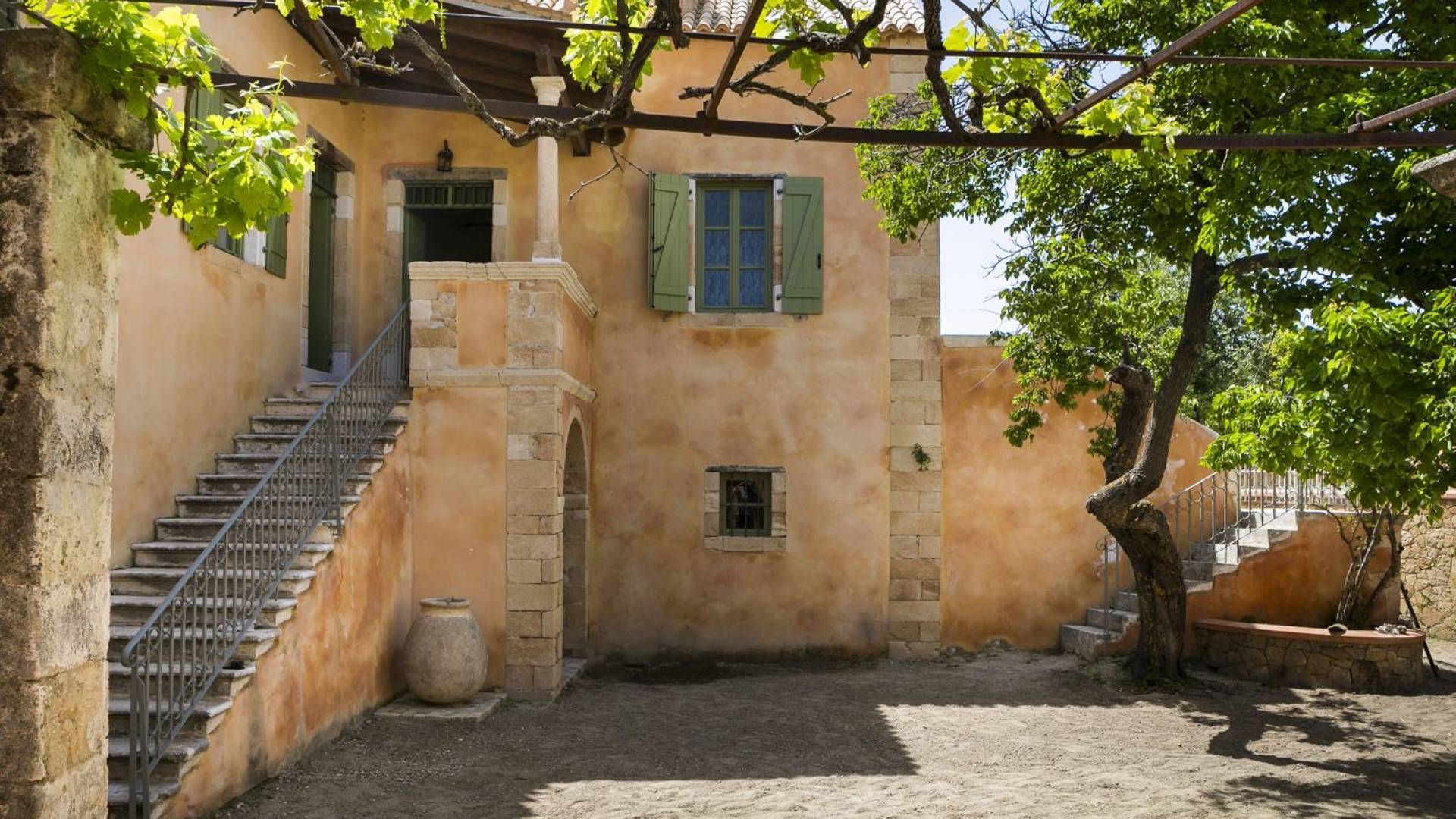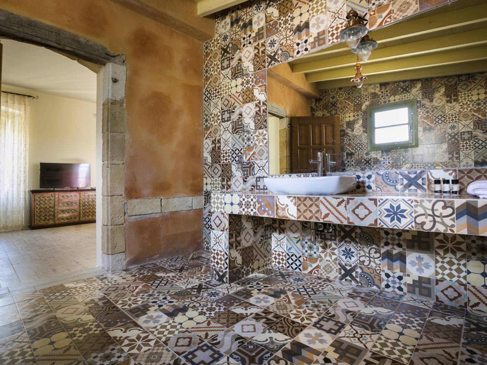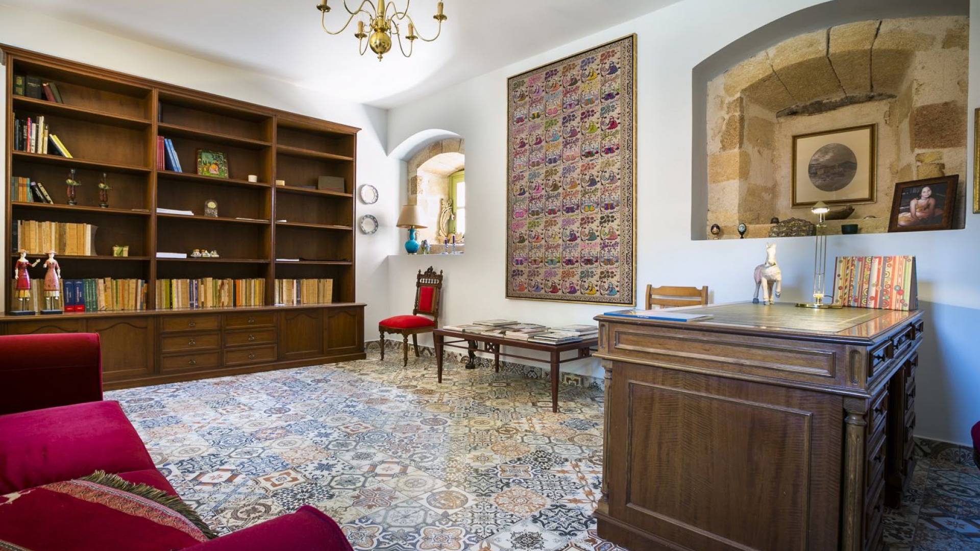 Au rez-de-chaussée, il y a deux suites, chacune avec une grande salle de bain, un lit queen-size, un coin salon et un coffre-fort. Il y a aussi un espace indépendant avec un bureau et une bibliothèque avec un PC, un Fax et une connexion Wi-Fi gratuite. Au rez-de-chaussée, il y a aussi une petite église privée dédiée à Saint-Nicolas et Saint-Georges, avec une entrée séparée et un point d'accès depuis les environs. A l'étage, il y a deux grands salons, une salle à manger pour un total de 12 personnes, une cuisine entièrement équipée avec une deuxième grande salle à manger avec télévision par satellite et une salle de bain supplémentaire pour les invités. Dans les combles, il y a trois chambres, chacune avec une salle de bain en suite, avec des lits jumeaux qui peuvent être réunis pour faire un lit queen-size et une vue panoramique. Toutes les chambres disposent de draps de luxe et d'articles de toilette Anne Semonin gratuits.