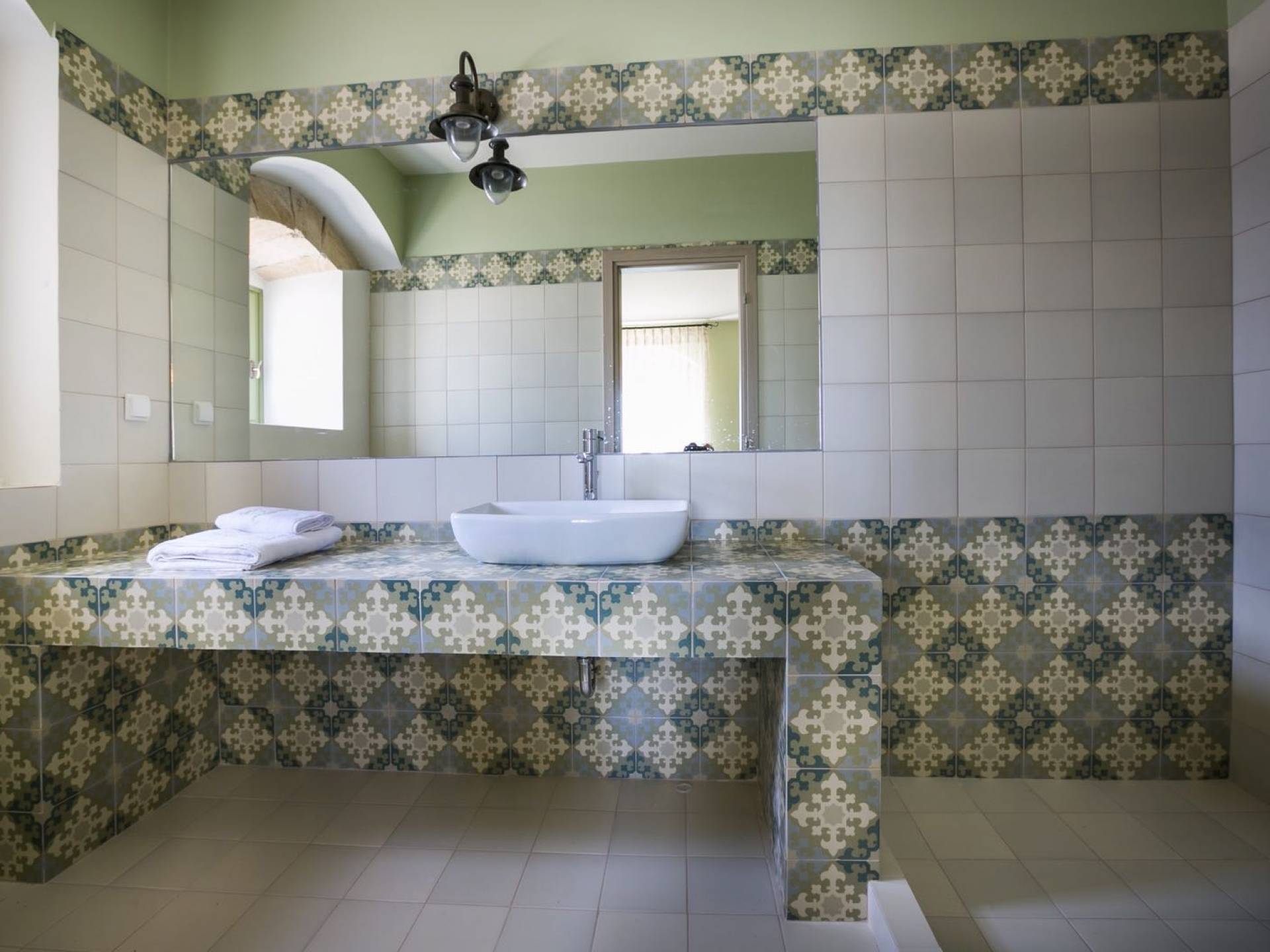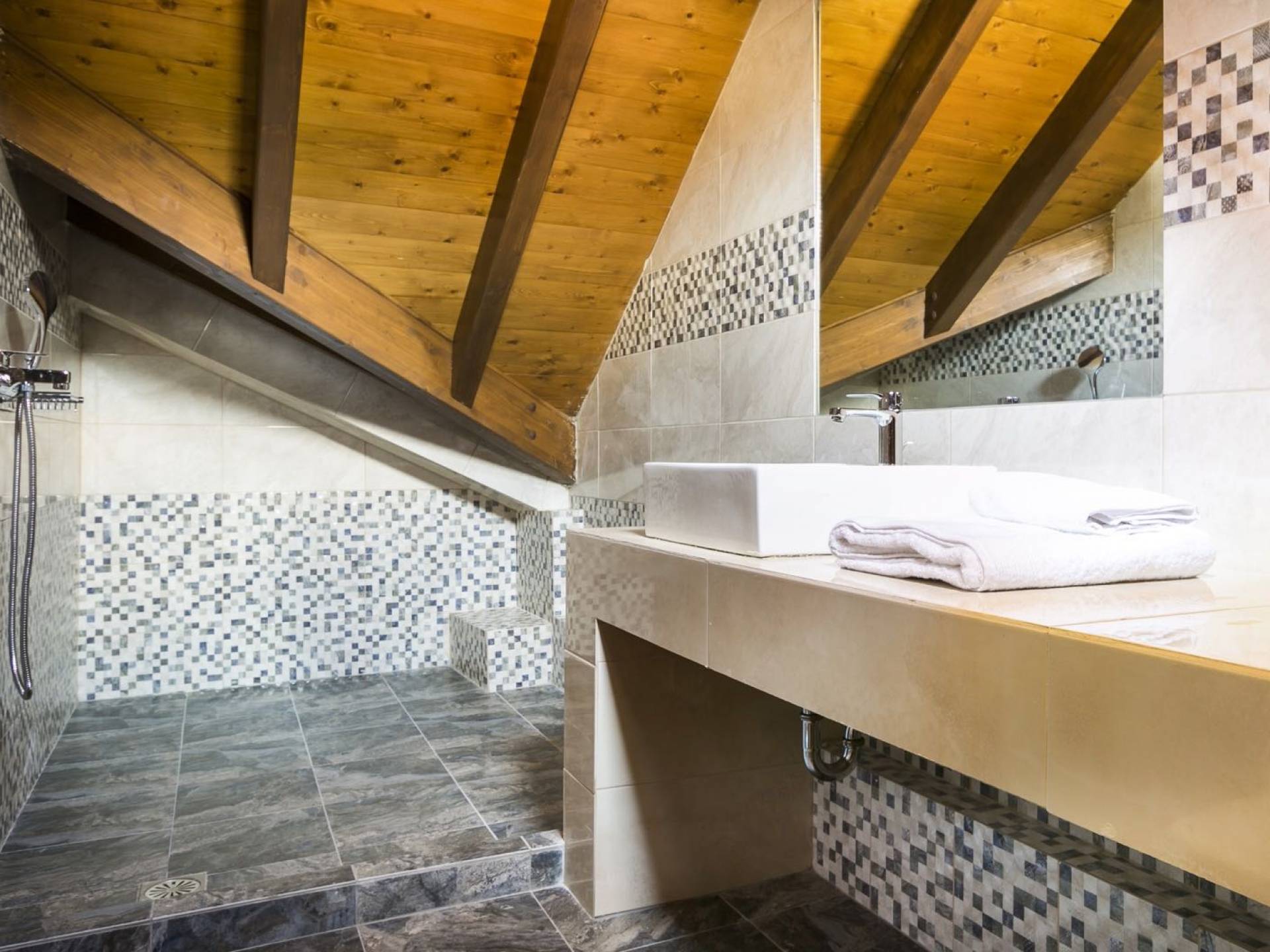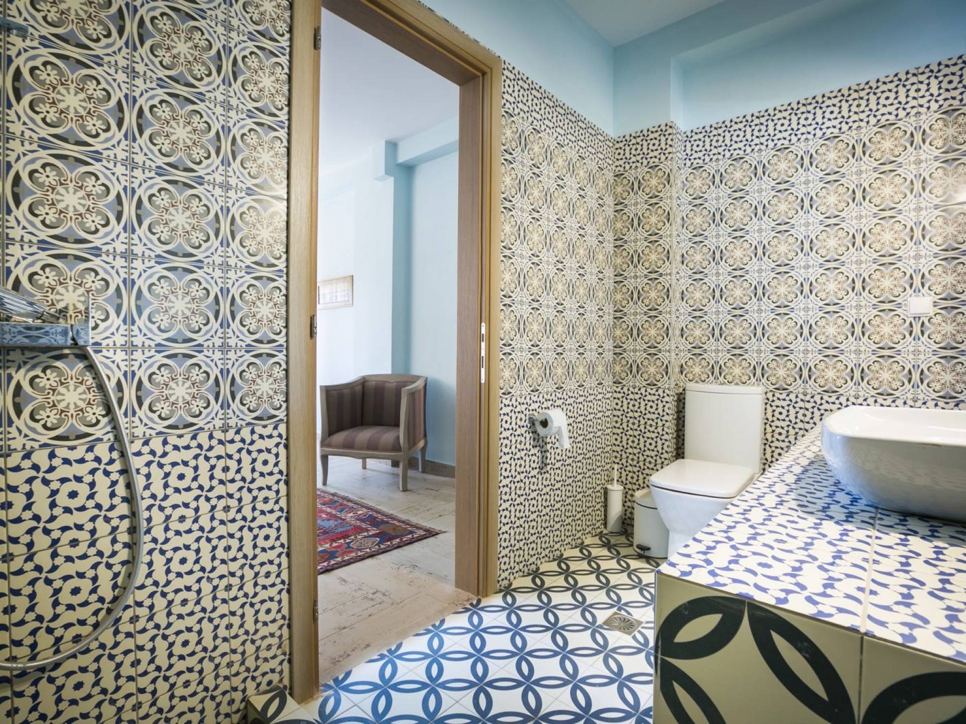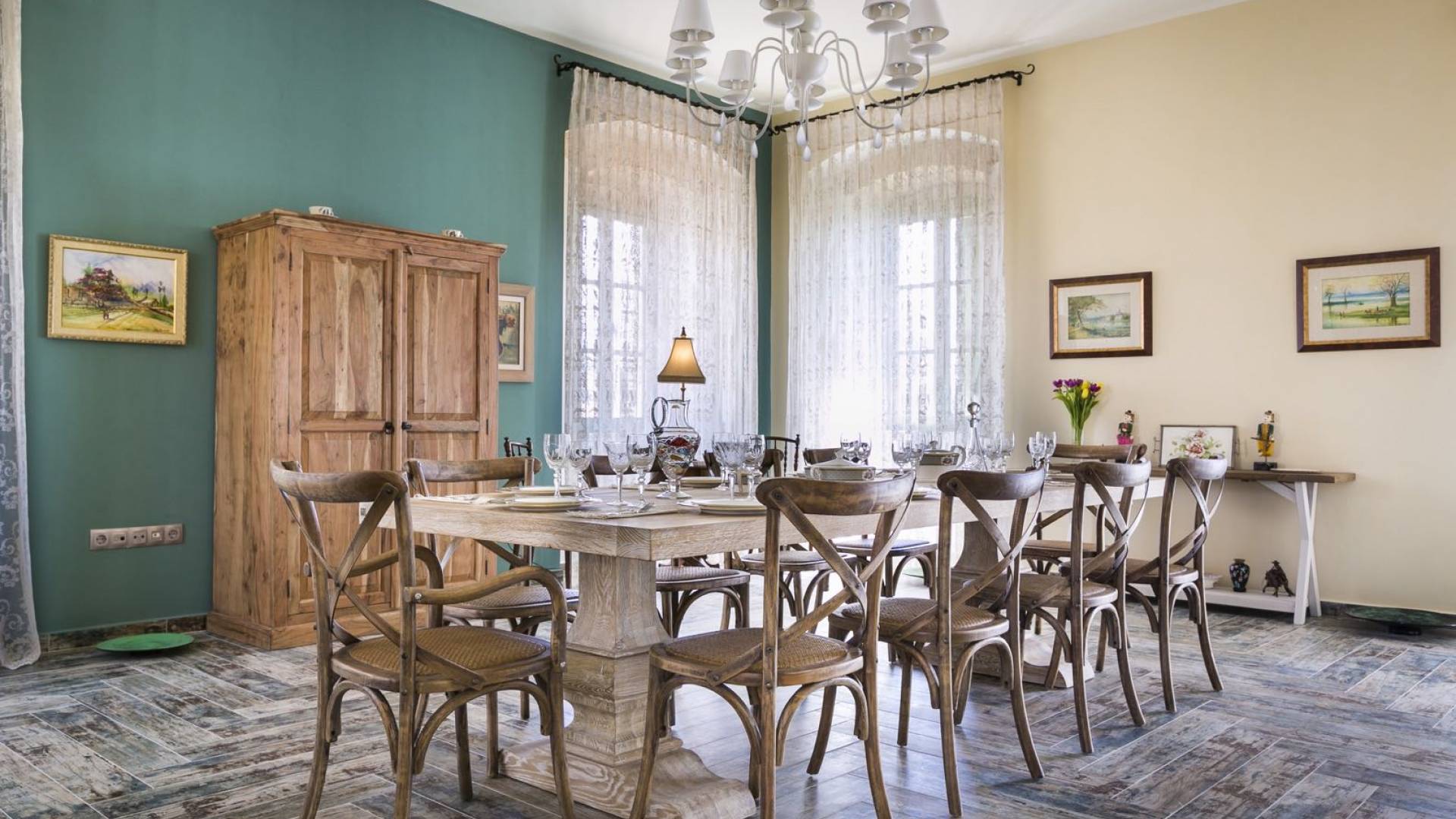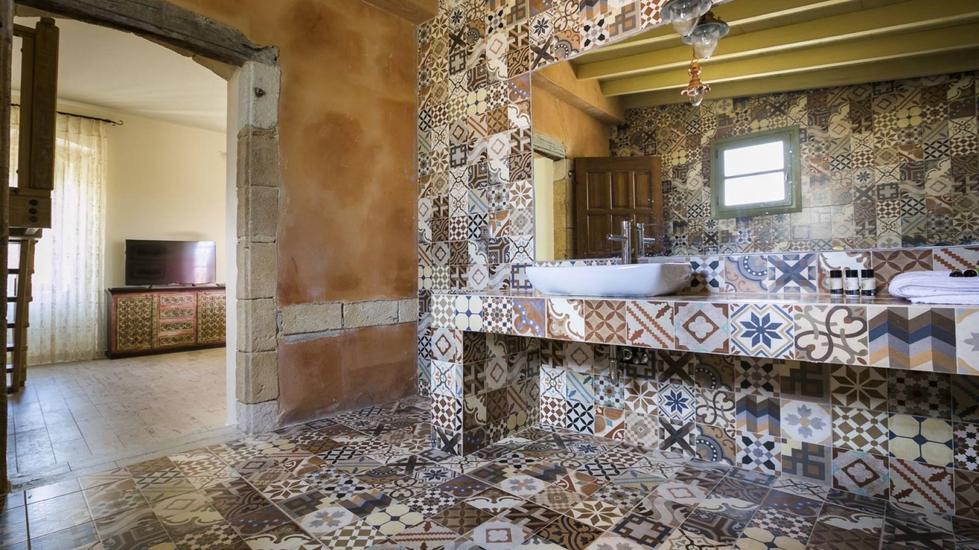 Au rez-de-chaussée, il y a deux suites, chacune avec une grande salle de bain, un lit queen-size, un coin salon et un coffre-fort. Il y a aussi un espace indépendant avec un bureau et une bibliothèque avec un PC, un Fax et une connexion Wi-Fi gratuite. Au rez-de-chaussée, il y a aussi une petite église privée dédiée à Saint-Nicolas et Saint-Georges, avec une entrée séparée et un point d'accès depuis les environs. A l'étage, il y a deux grands salons, une salle à manger pour un total de 12 personnes, une cuisine entièrement équipée avec une deuxième grande salle à manger avec télévision par satellite et une salle de bain supplémentaire pour les invités. Dans les combles, il y a trois chambres, chacune avec une salle de bain en suite, avec des lits jumeaux qui peuvent être réunis pour faire un lit queen-size et une vue panoramique. Toutes les chambres disposent de draps de luxe et d'articles de toilette Anne Semonin gratuits.