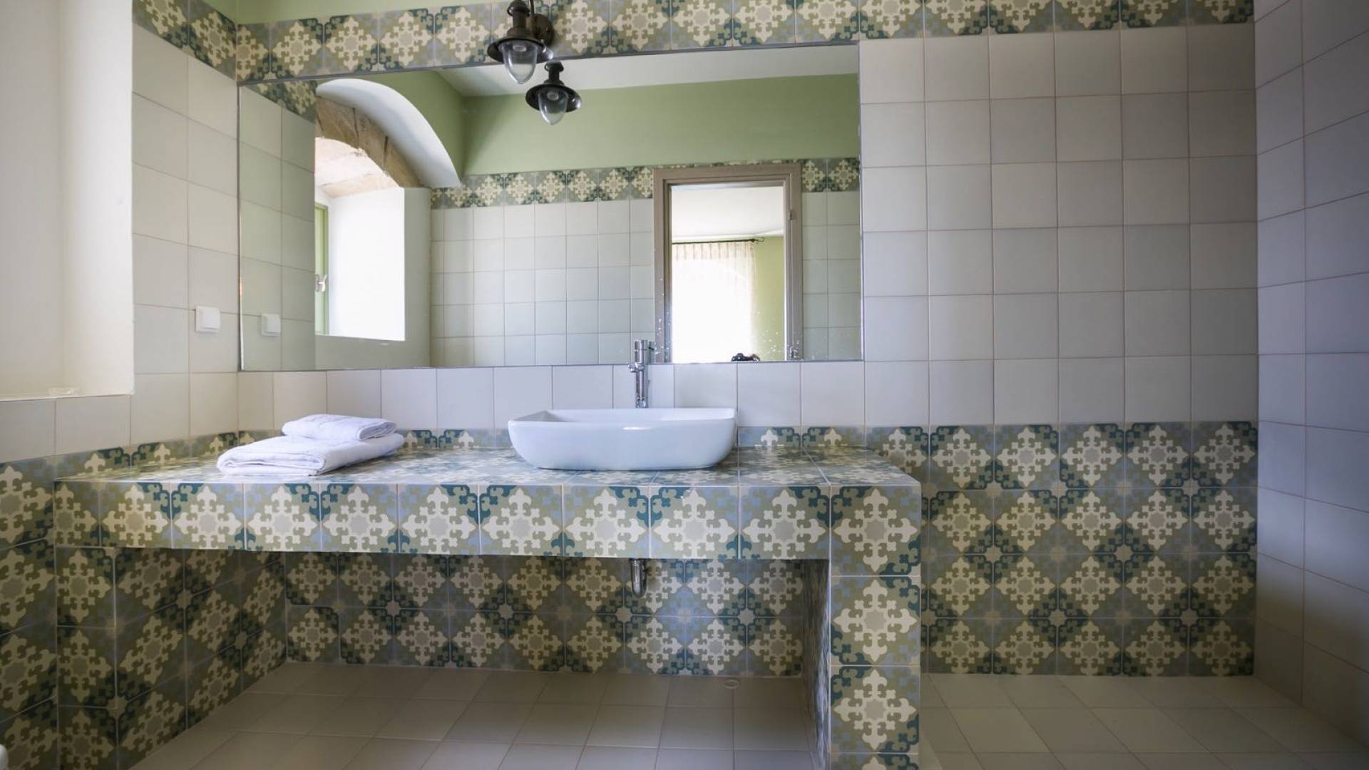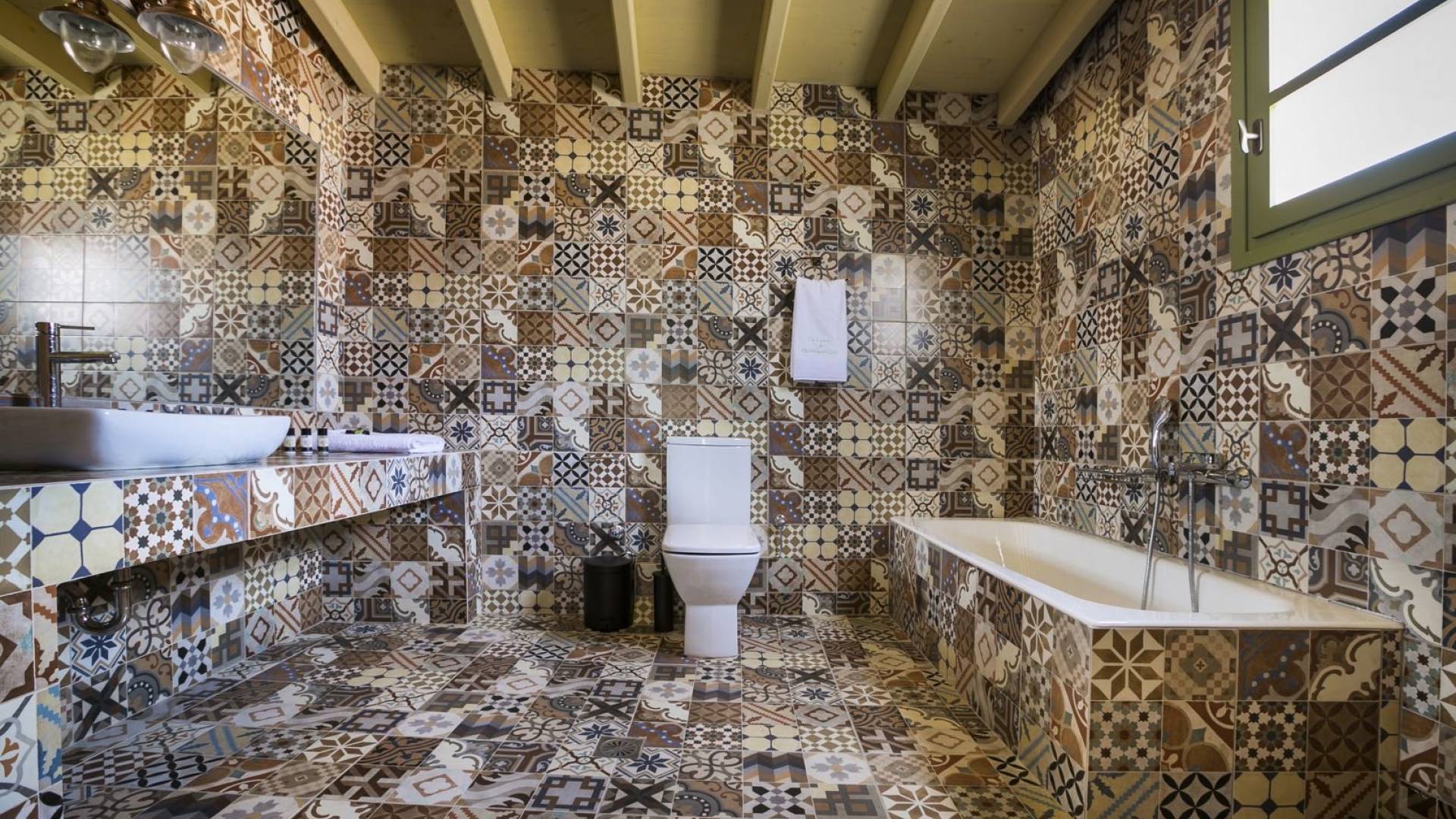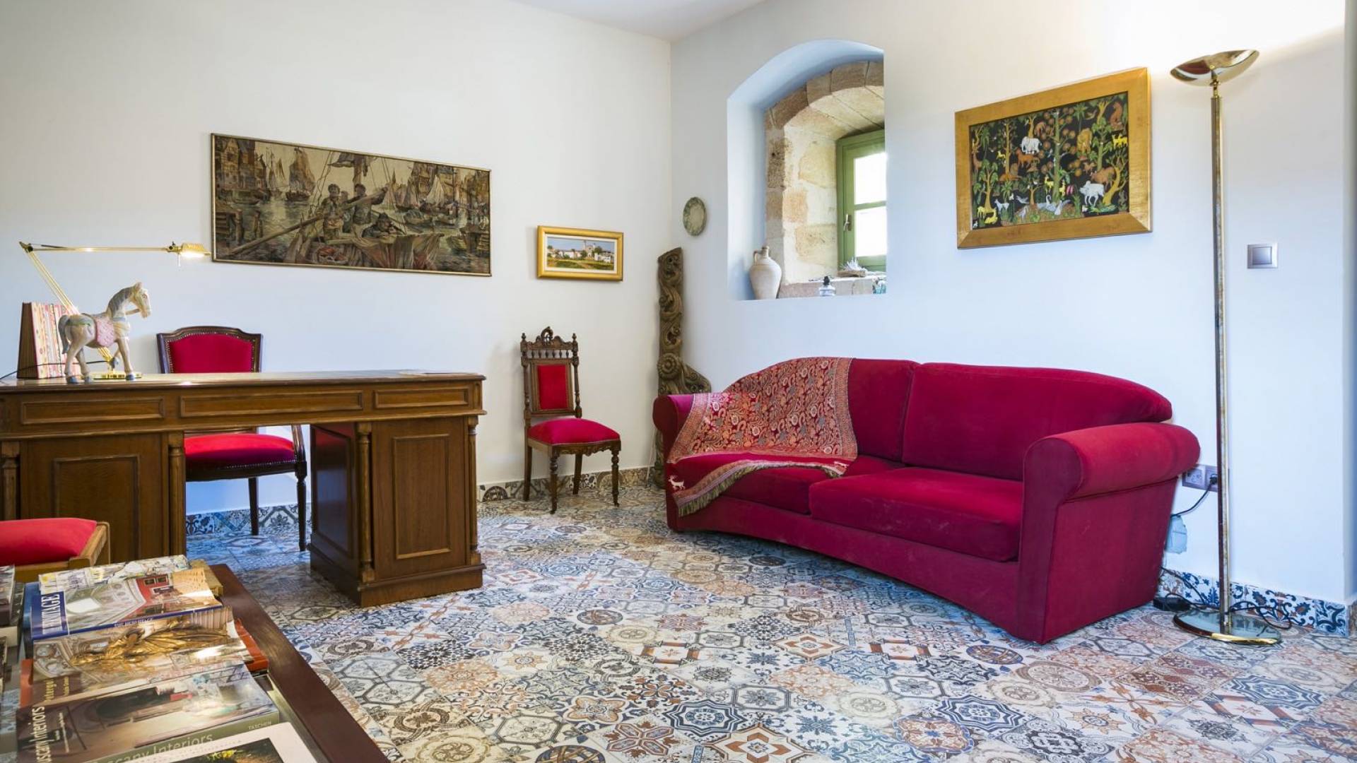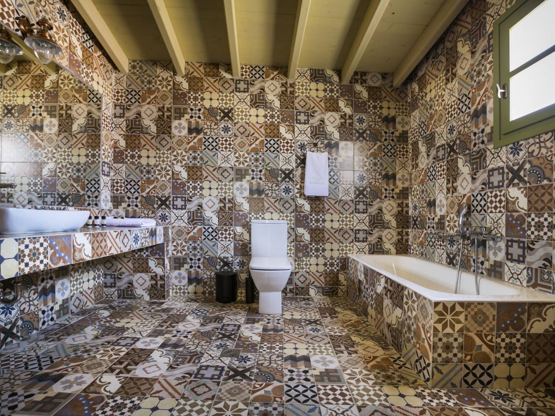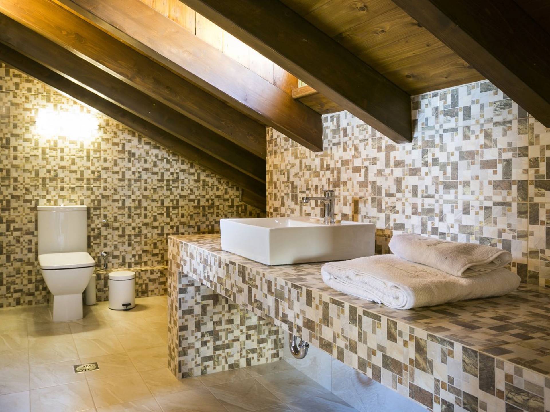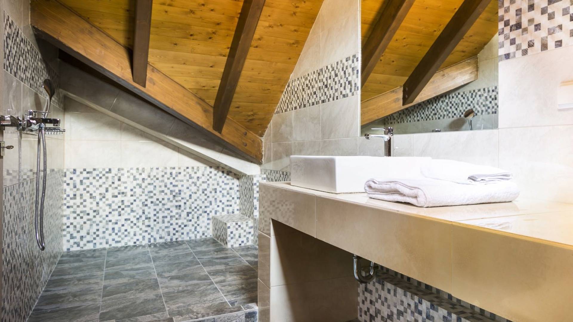 Au rez-de-chaussée, il y a deux suites, chacune avec une grande salle de bain, un lit queen-size, un coin salon et un coffre-fort. Il y a aussi un espace indépendant avec un bureau et une bibliothèque avec un PC, un Fax et une connexion Wi-Fi gratuite. Au rez-de-chaussée, il y a aussi une petite église privée dédiée à Saint-Nicolas et Saint-Georges, avec une entrée séparée et un point d'accès depuis les environs. A l'étage, il y a deux grands salons, une salle à manger pour un total de 12 personnes, une cuisine entièrement équipée avec une deuxième grande salle à manger avec télévision par satellite et une salle de bain supplémentaire pour les invités. Dans les combles, il y a trois chambres, chacune avec une salle de bain en suite, avec des lits jumeaux qui peuvent être réunis pour faire un lit queen-size et une vue panoramique. Toutes les chambres disposent de draps de luxe et d'articles de toilette Anne Semonin gratuits.
