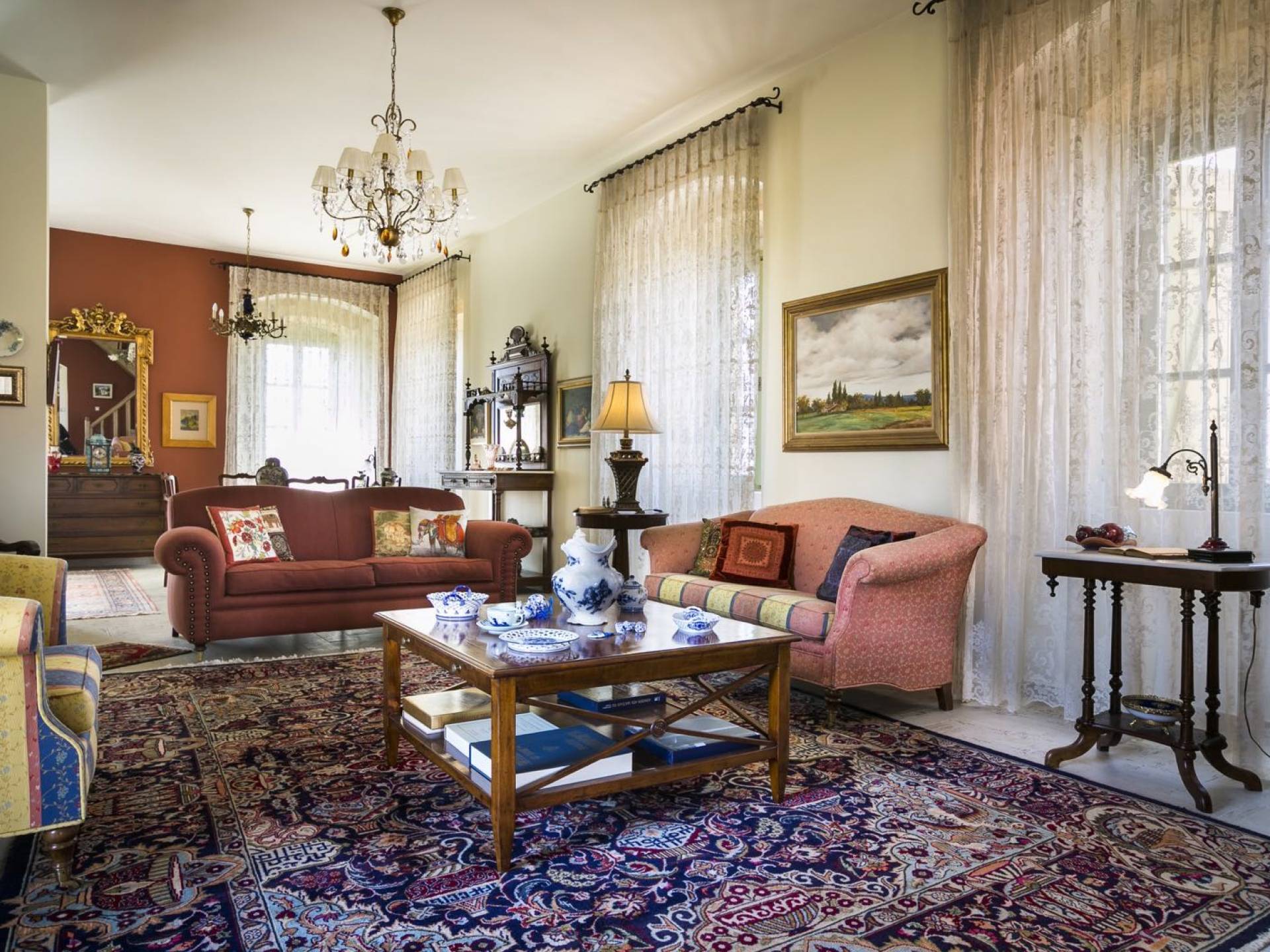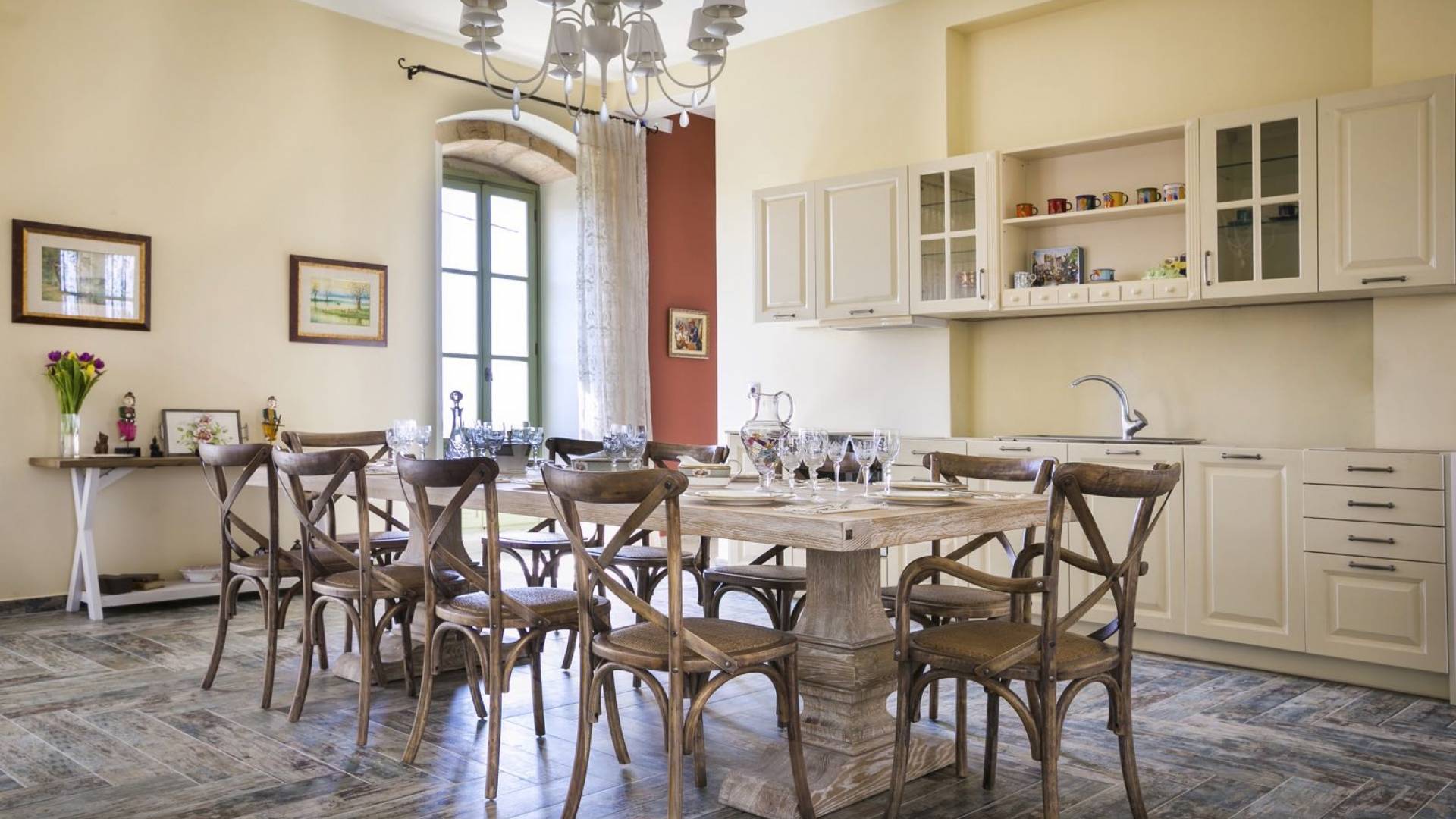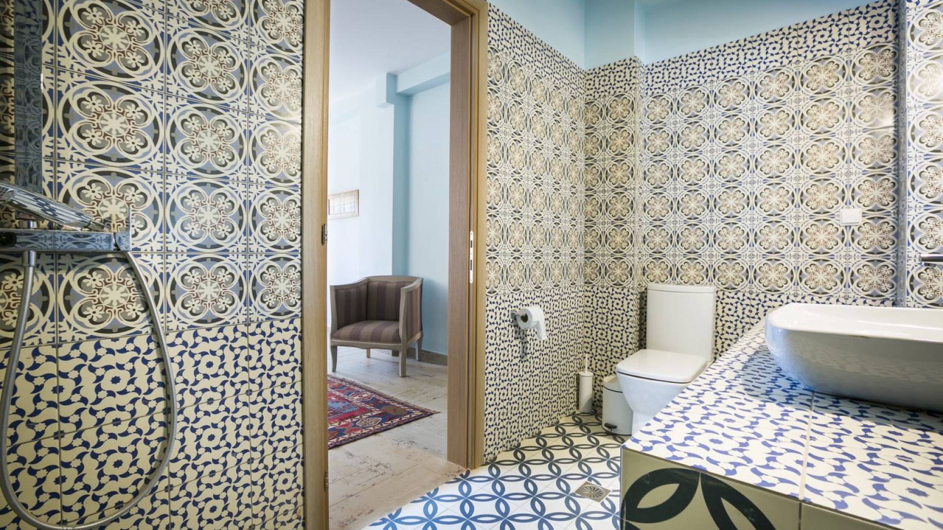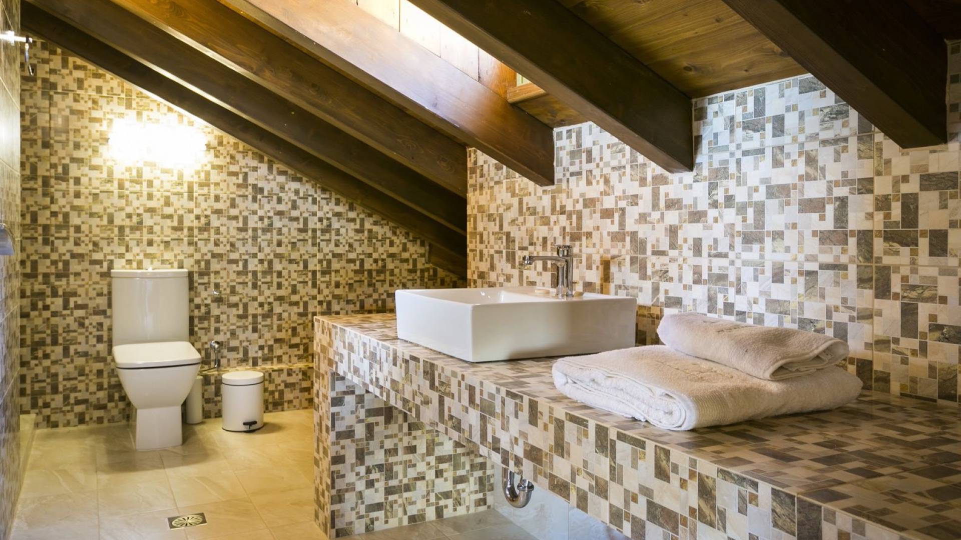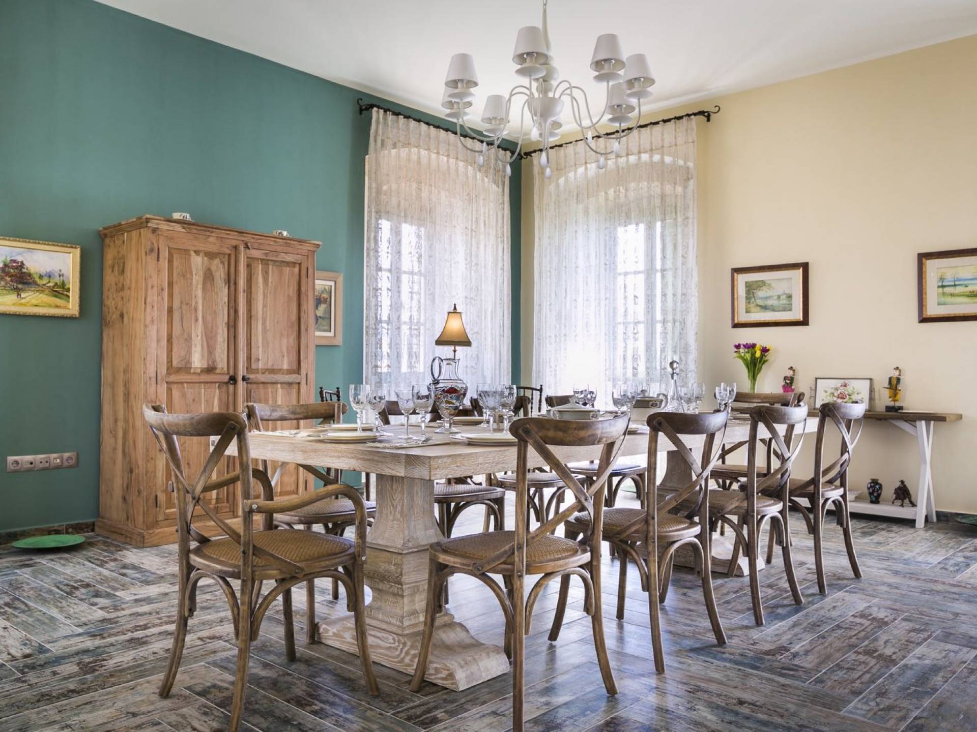 Au rez-de-chaussée, il y a deux suites, chacune avec une grande salle de bain, un lit queen-size, un coin salon et un coffre-fort. Il y a aussi un espace indépendant avec un bureau et une bibliothèque avec un PC, un Fax et une connexion Wi-Fi gratuite. Au rez-de-chaussée, il y a aussi une petite église privée dédiée à Saint-Nicolas et Saint-Georges, avec une entrée séparée et un point d'accès depuis les environs. A l'étage, il y a deux grands salons, une salle à manger pour un total de 12 personnes, une cuisine entièrement équipée avec une deuxième grande salle à manger avec télévision par satellite et une salle de bain supplémentaire pour les invités. Dans les combles, il y a trois chambres, chacune avec une salle de bain en suite, avec des lits jumeaux qui peuvent être réunis pour faire un lit queen-size et une vue panoramique. Toutes les chambres disposent de draps de luxe et d'articles de toilette Anne Semonin gratuits.