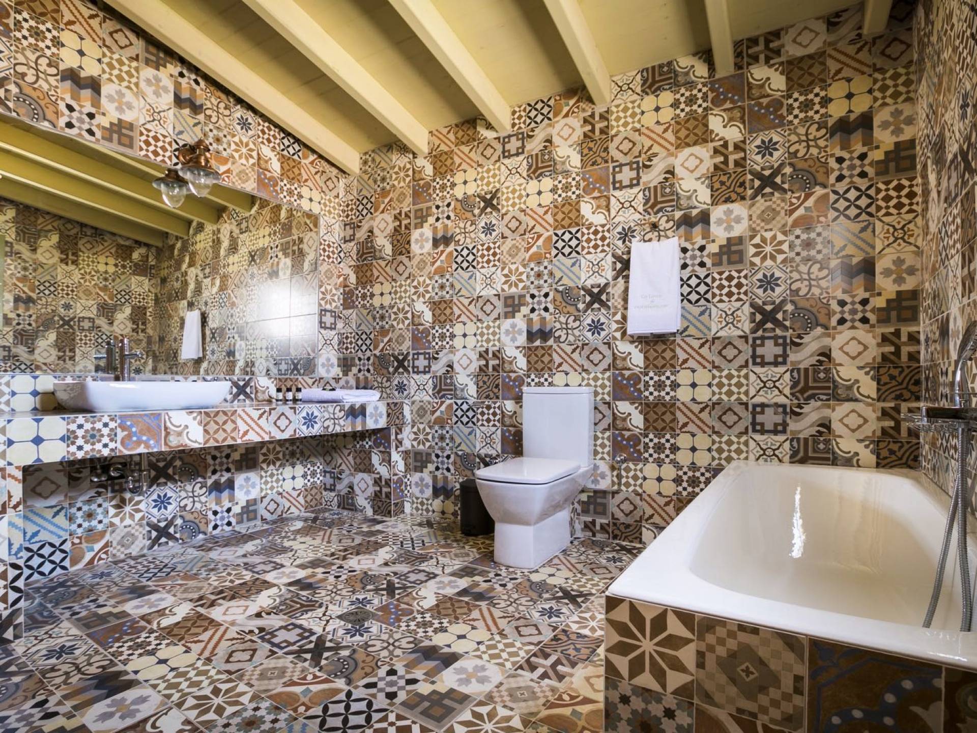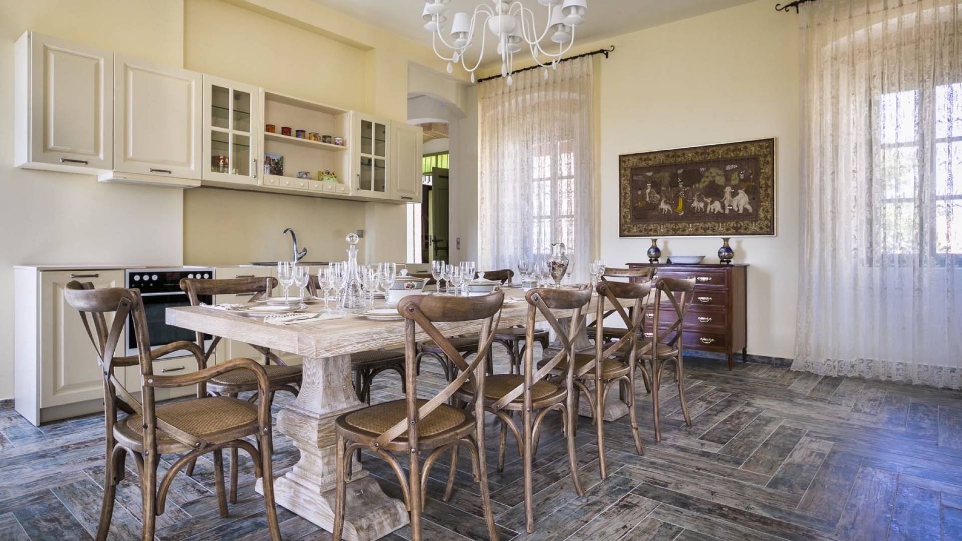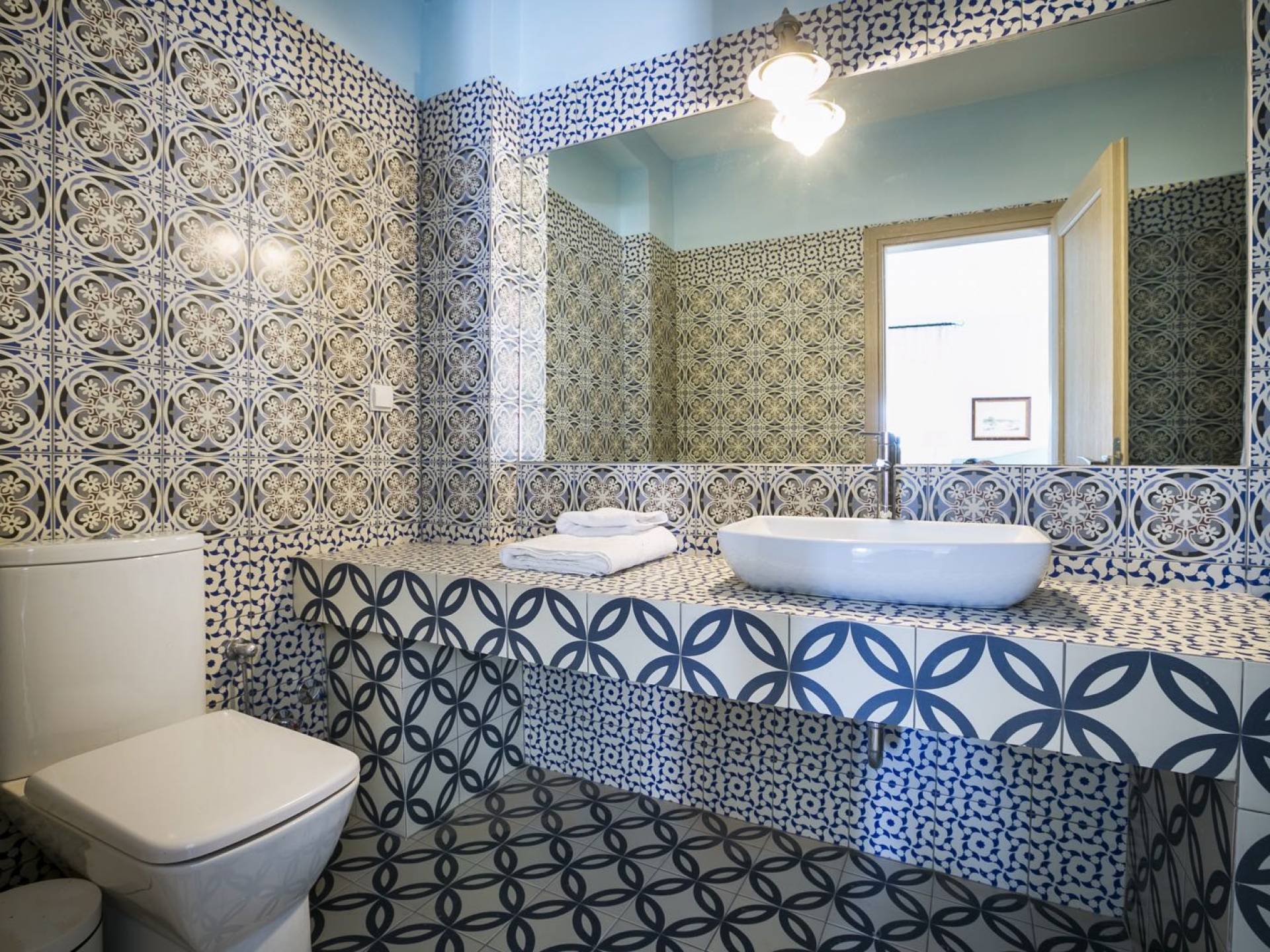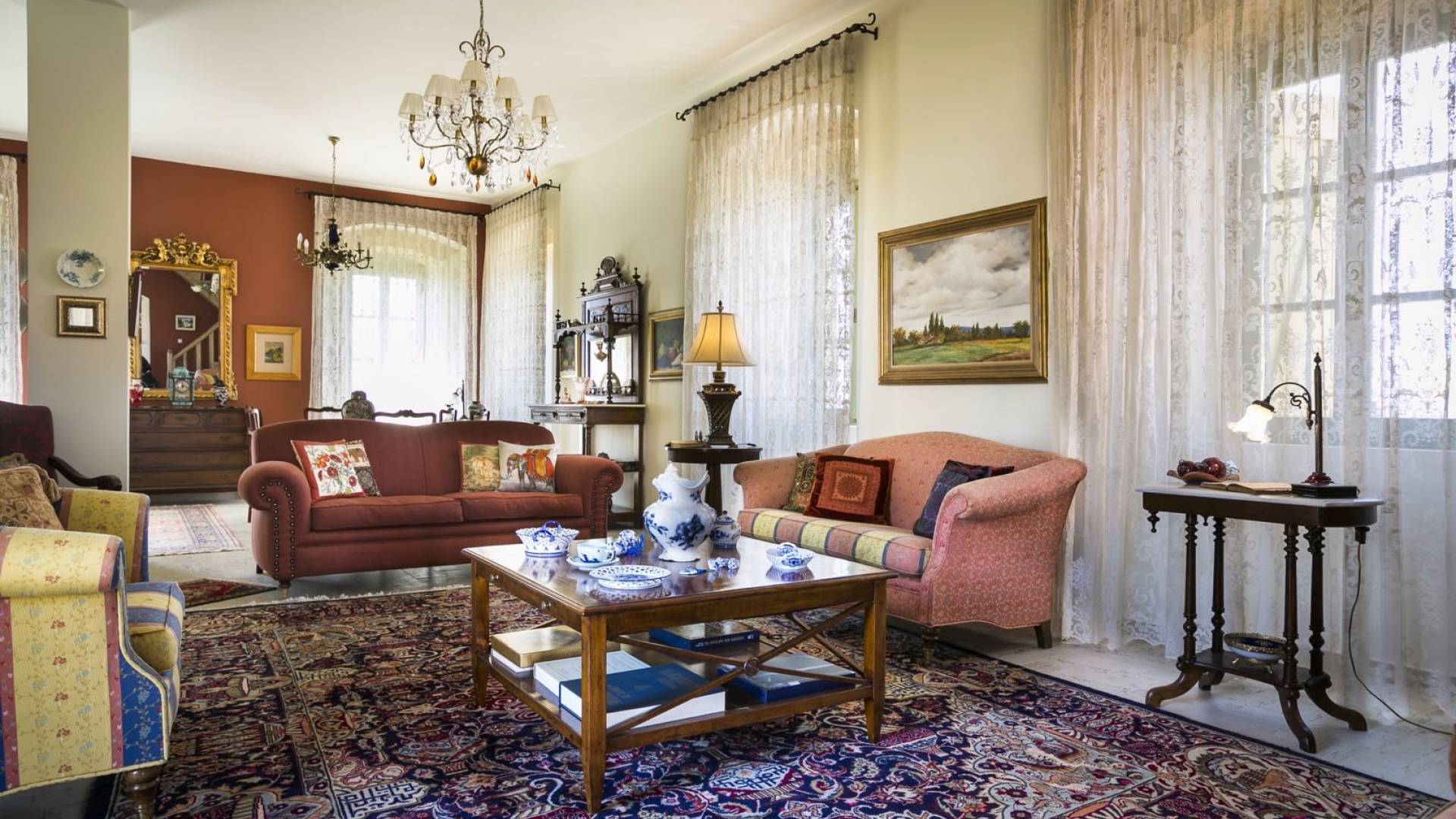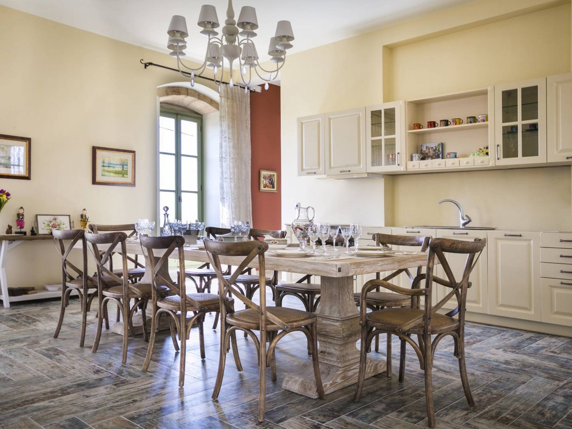 Au rez-de-chaussée, il y a deux suites, chacune avec une grande salle de bain, un lit queen-size, un coin salon et un coffre-fort. Il y a aussi un espace indépendant avec un bureau et une bibliothèque avec un PC, un Fax et une connexion Wi-Fi gratuite. Au rez-de-chaussée, il y a aussi une petite église privée dédiée à Saint-Nicolas et Saint-Georges, avec une entrée séparée et un point d'accès depuis les environs. A l'étage, il y a deux grands salons, une salle à manger pour un total de 12 personnes, une cuisine entièrement équipée avec une deuxième grande salle à manger avec télévision par satellite et une salle de bain supplémentaire pour les invités. Dans les combles, il y a trois chambres, chacune avec une salle de bain en suite, avec des lits jumeaux qui peuvent être réunis pour faire un lit queen-size et une vue panoramique. Toutes les chambres disposent de draps de luxe et d'articles de toilette Anne Semonin gratuits.