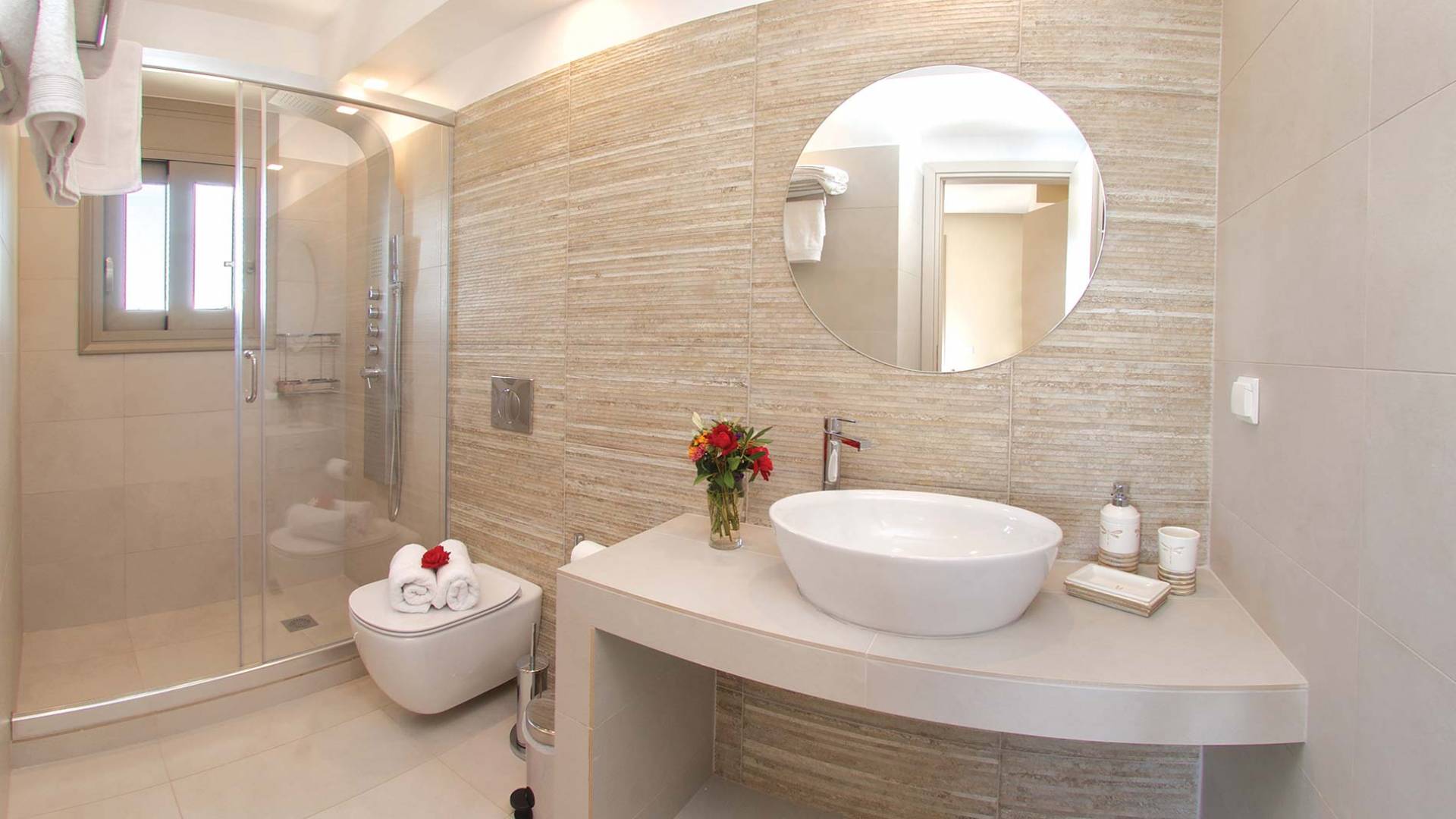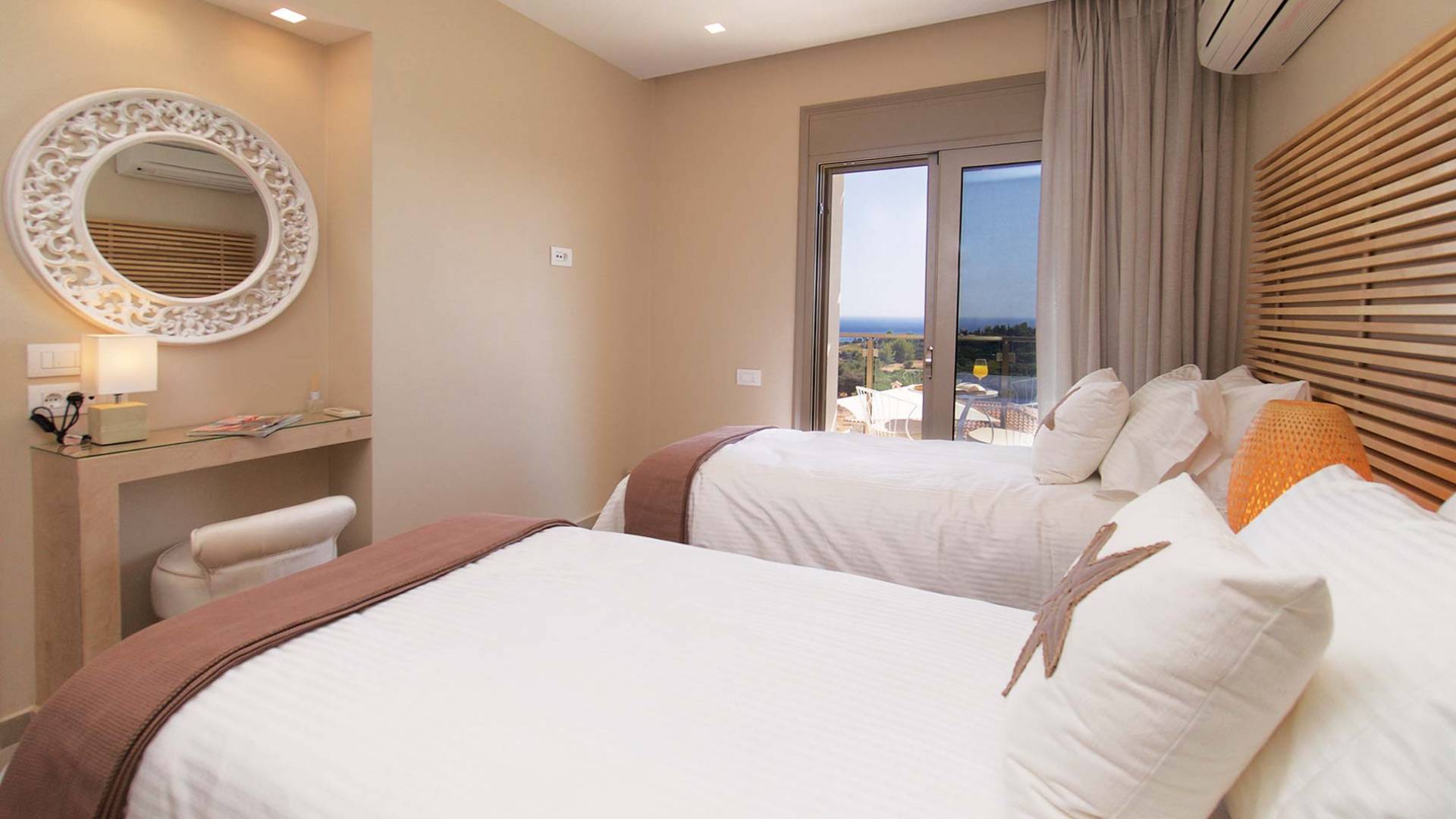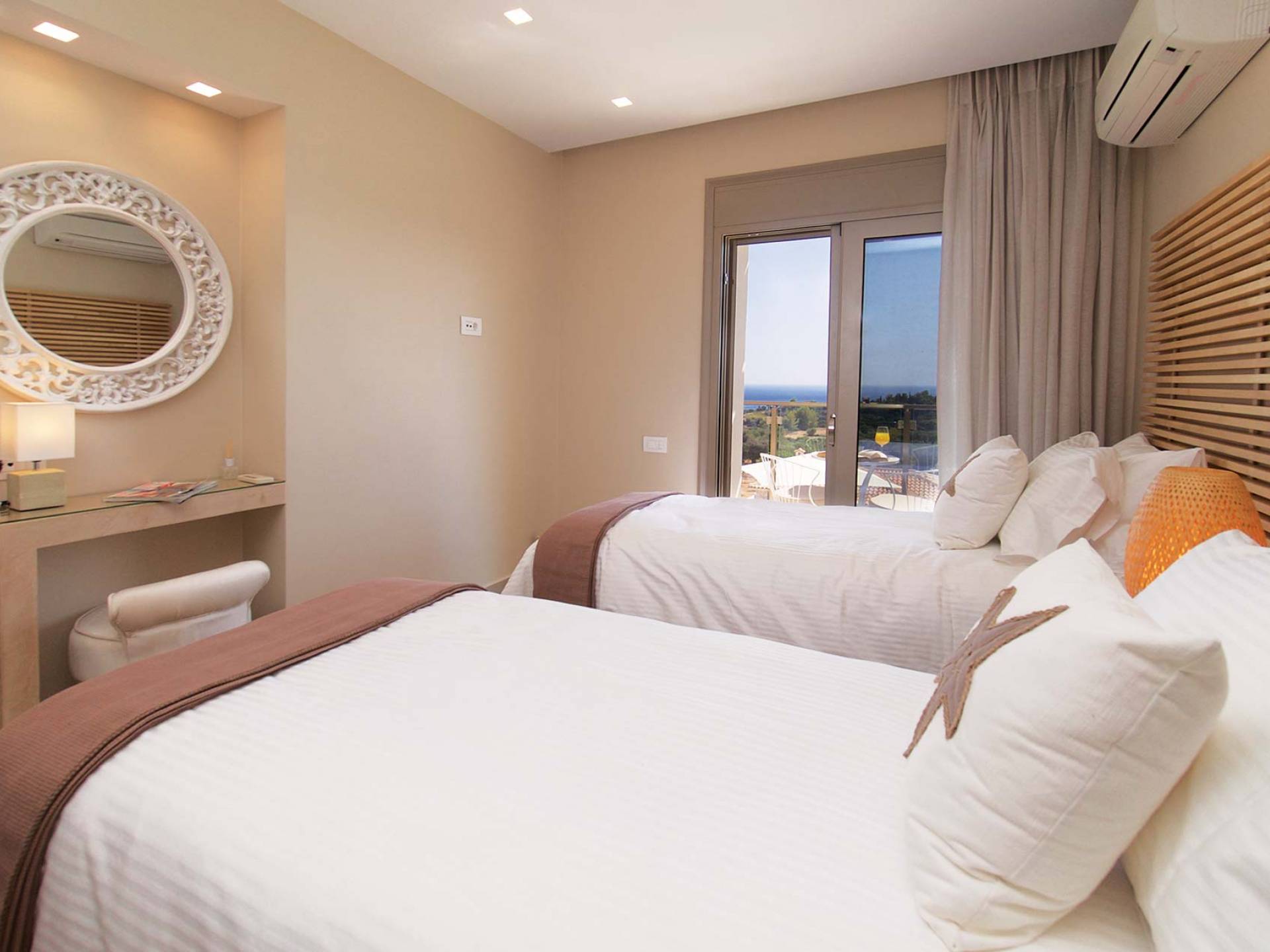 A l'étage, il y a deux chambres indépendantes, toutes deux avec salle de bain attenante et avec de belles vues sur la mer et la montagne. La chambre principale est équipée d'un lit double et la deuxième chambre de 2 lits simples (pouvant également être rapprochés pour un lit queen-size). Le grand balcon offre une vue panoramique imprenable sur la mer Ionienne, l'île de Zante et le magnifique coucher de soleil derrière le château de St George.