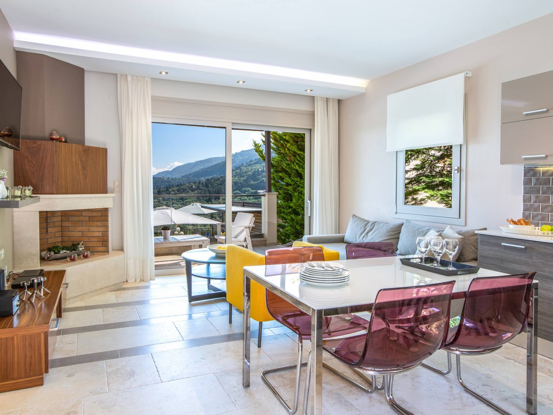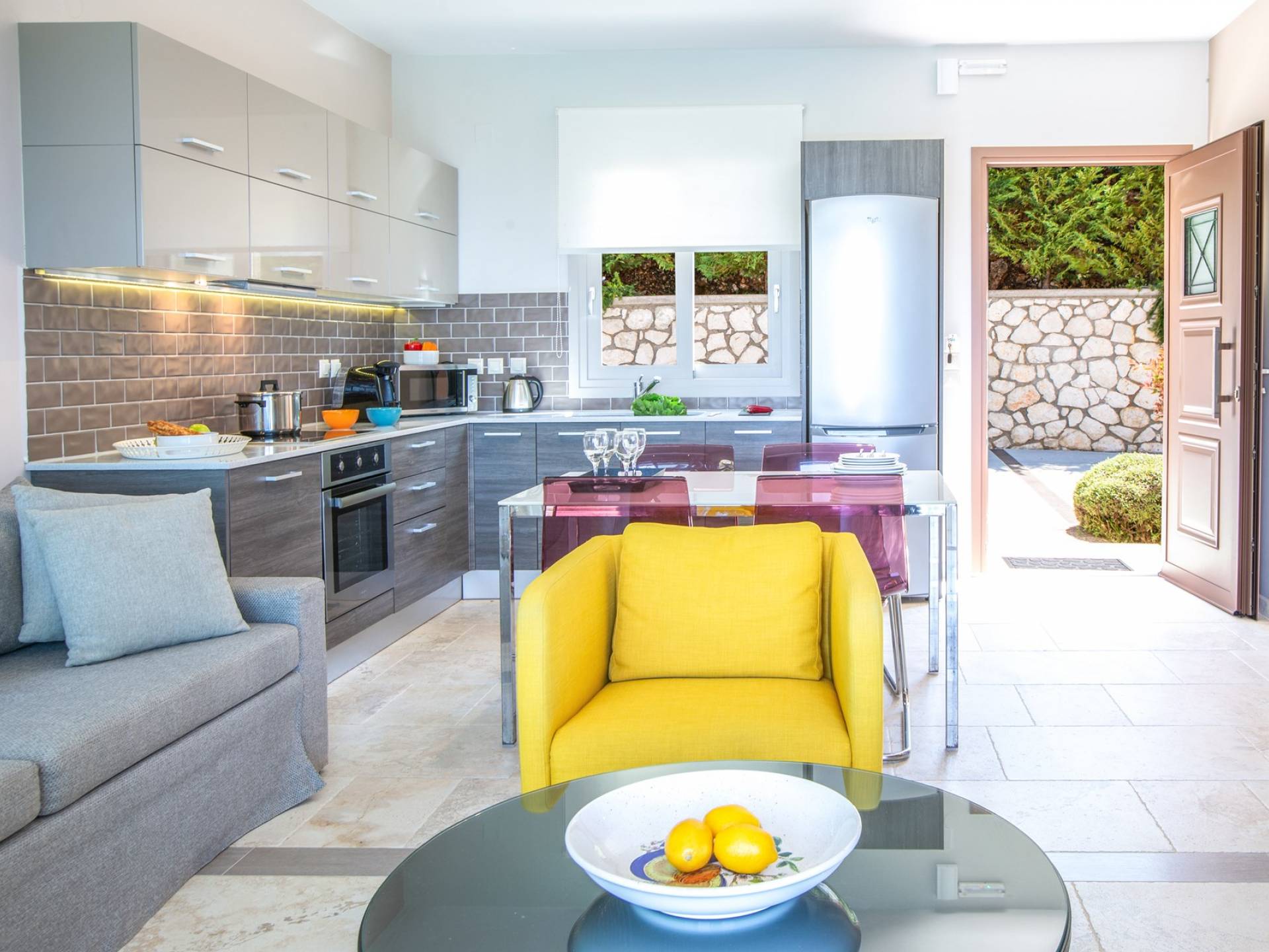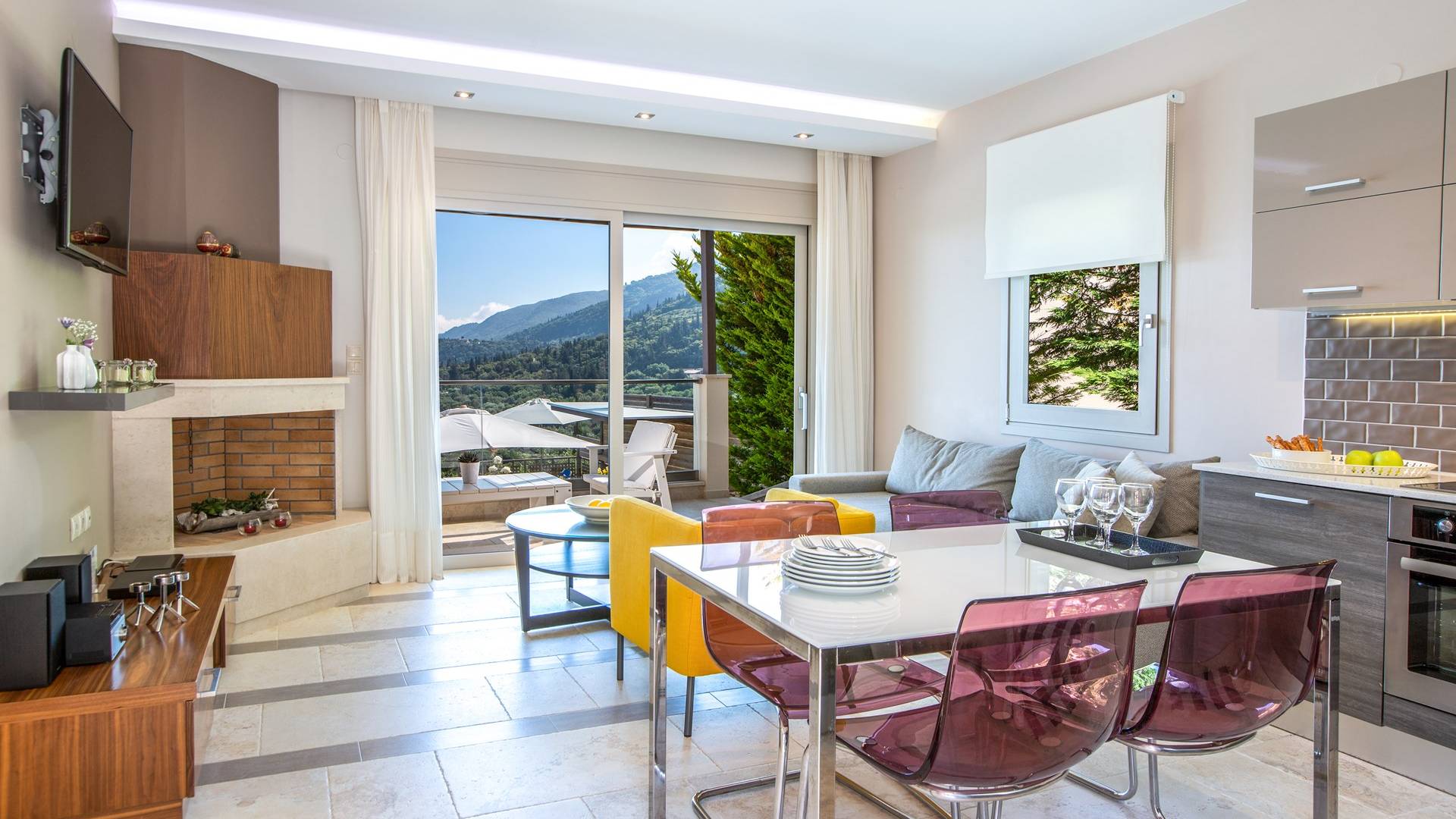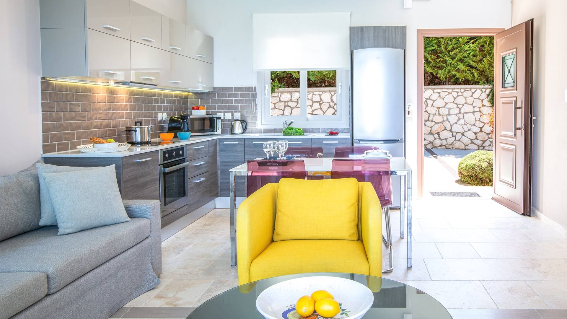 Il dispose de son parking individuel - disponible dans la propriété - et se compose d'une chambre avec un lit king-size, d'une unité individuelle climatisée, d'une salle de bain, et de tout un espace salon, avec un canapé pouvant être transformé en lit, le téléviseur, la cheminée et la grande porte coulissante avec la vue imprenable sur la mer Ionienne, la salle à manger et la cuisine entièrement équipée, le tout sur un seul niveau.