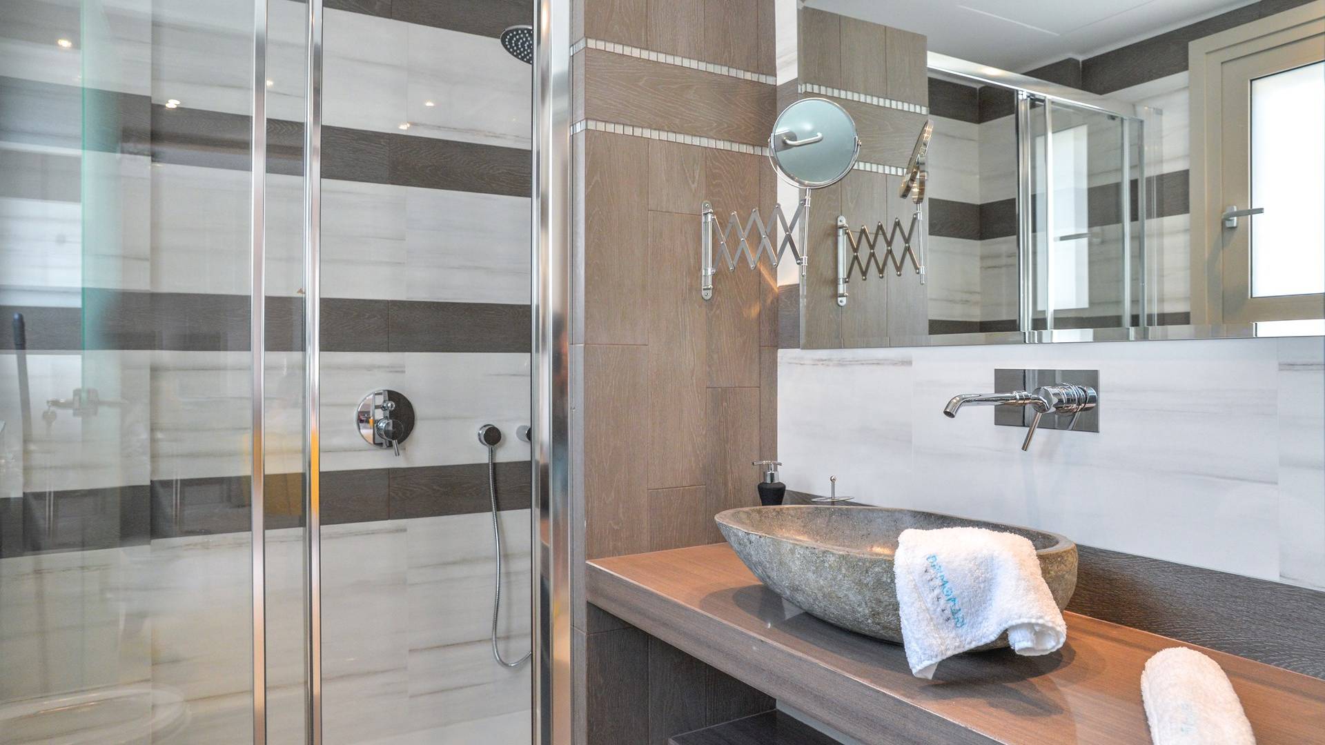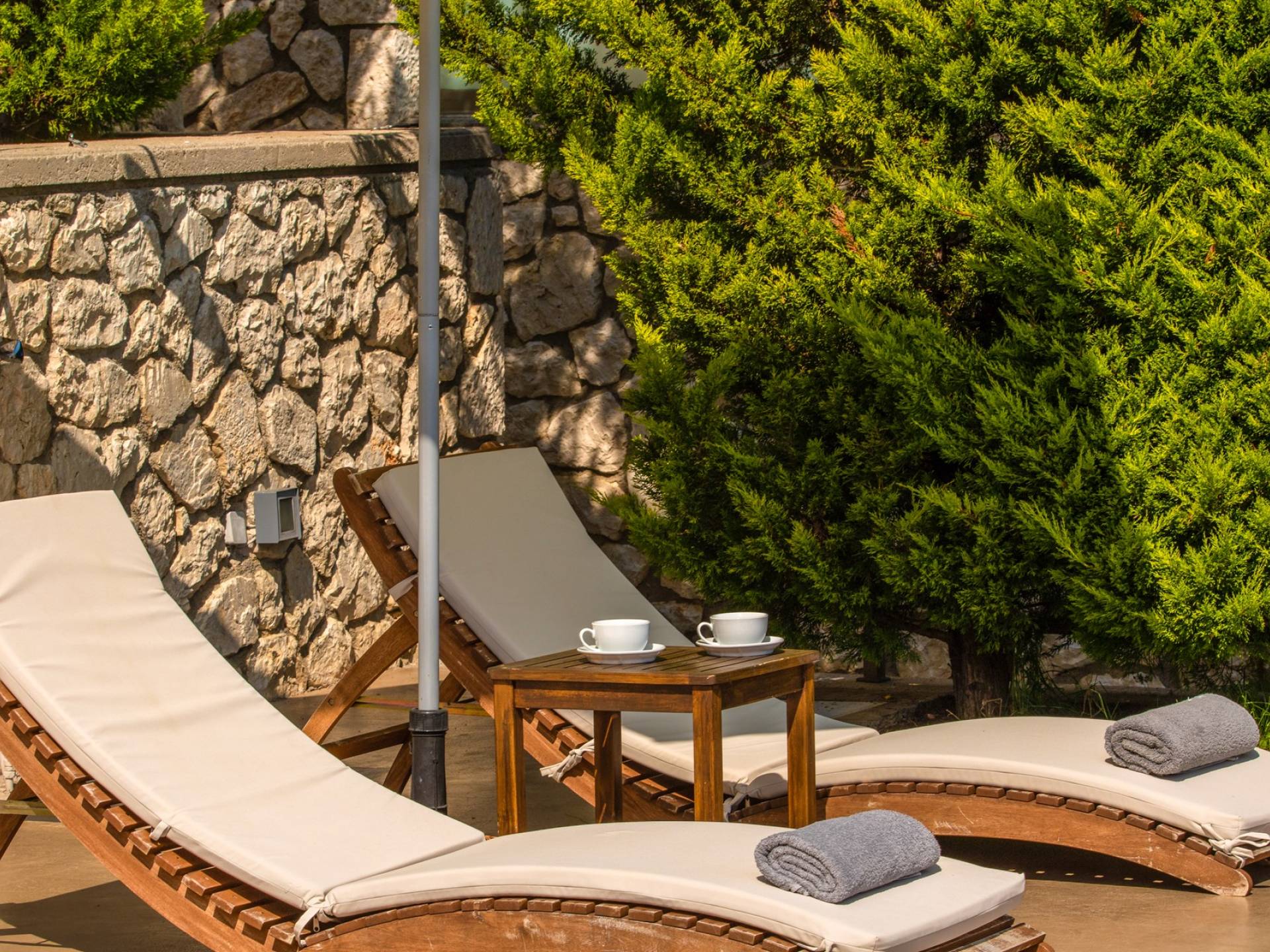 Seulement dans cette pièce, il y a un climatiseur individuel dissimulé au plafond. En sortant de la pièce et en descendant d'un étage, par un escalier extérieur depuis la terrasse, vous arrivez à l'espace piscine, où se trouvent des chaises longues et des parasols, une douche extérieure et une table avec le barbecue. Il y a aussi une piscine à débordement et un jacuzzi.