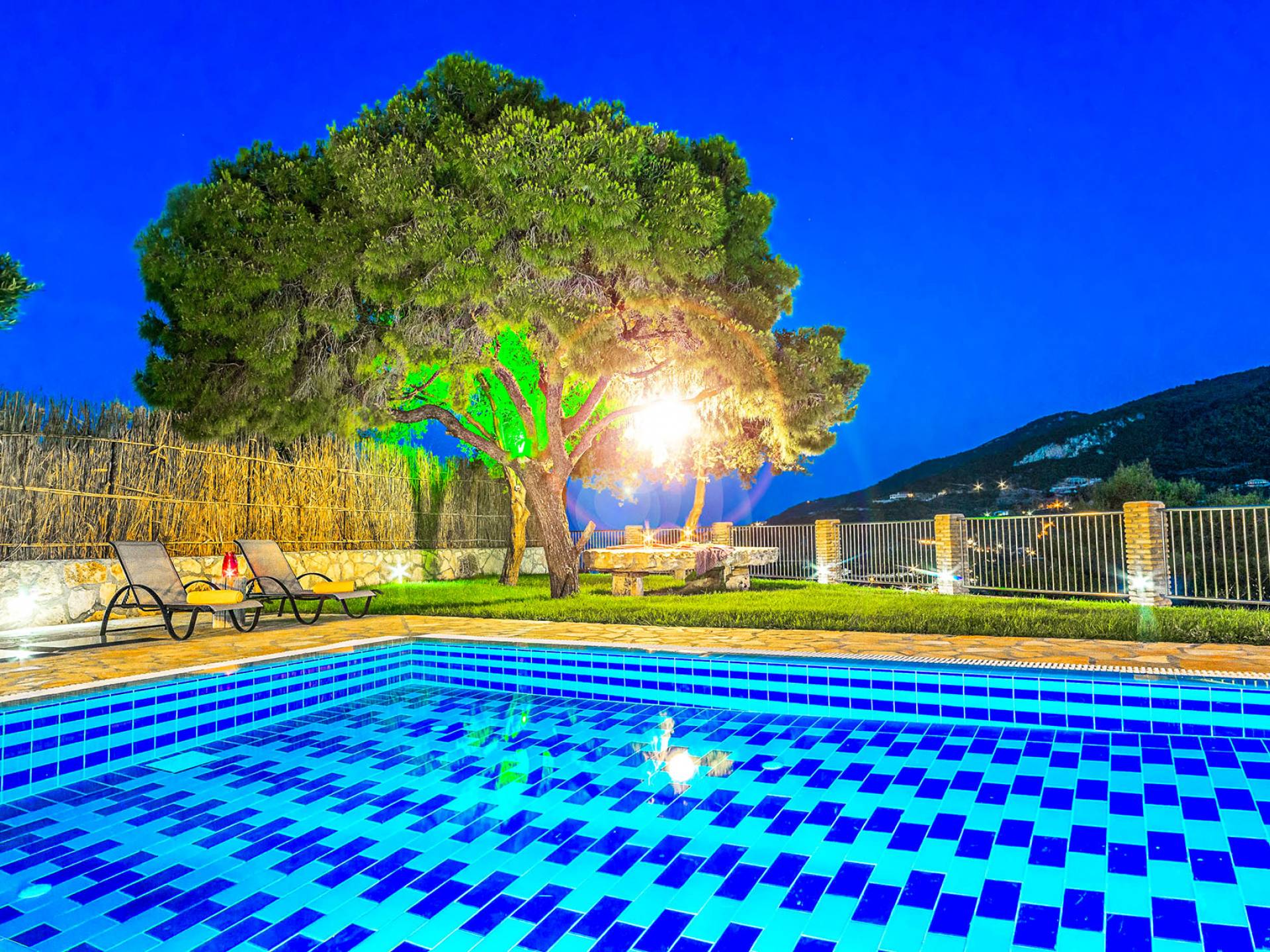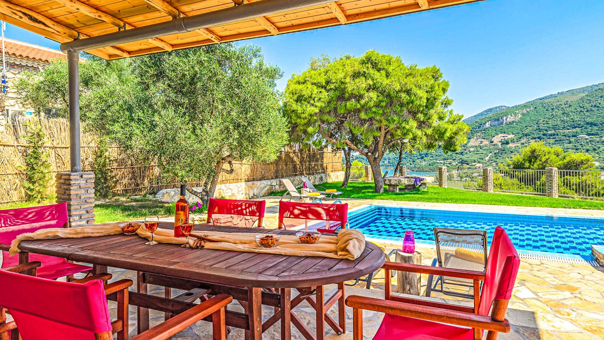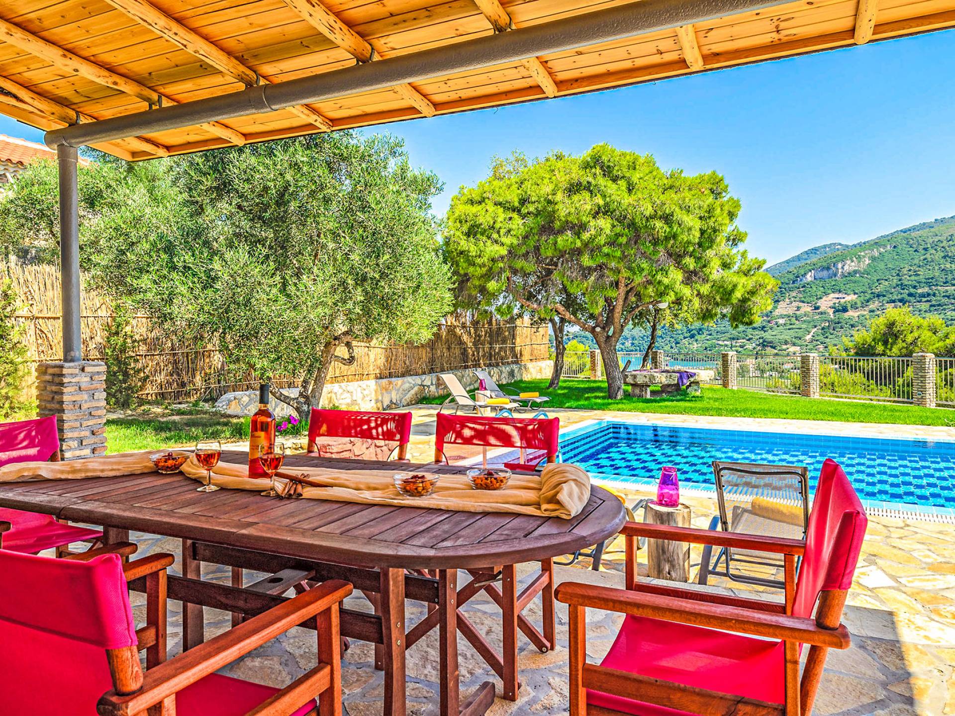 À l'extérieur, la villa offre une véranda spacieuse avec table et chaises où vous pourrez prendre votre petit-déjeuner, déjeuner ou dîner avec vue sur l'allure bleue de la mer. Une grande piscine entourée d'un jardin paysager coloré compose un décor unique, qui promet des moments inoubliables de détente et de paix.
