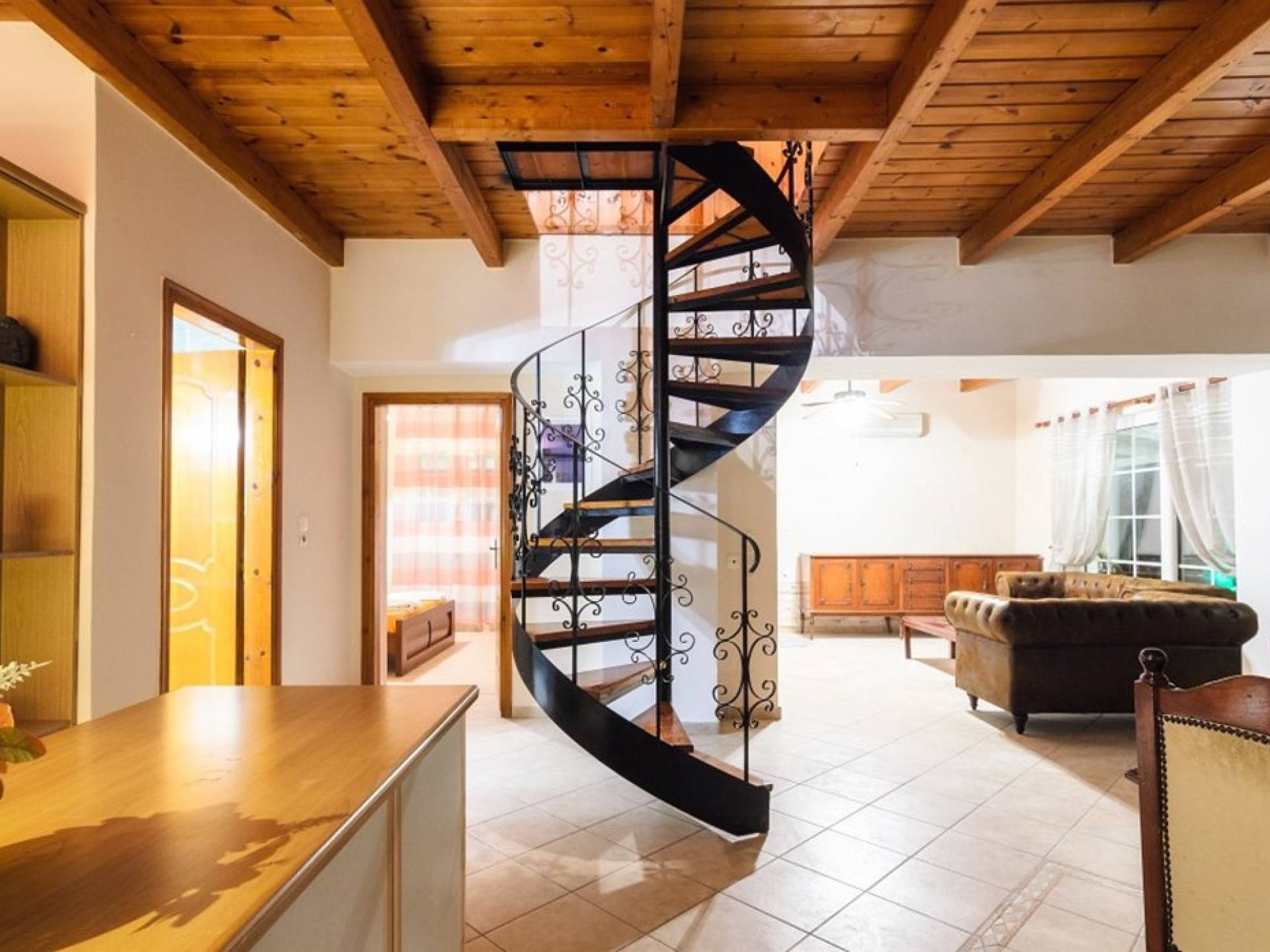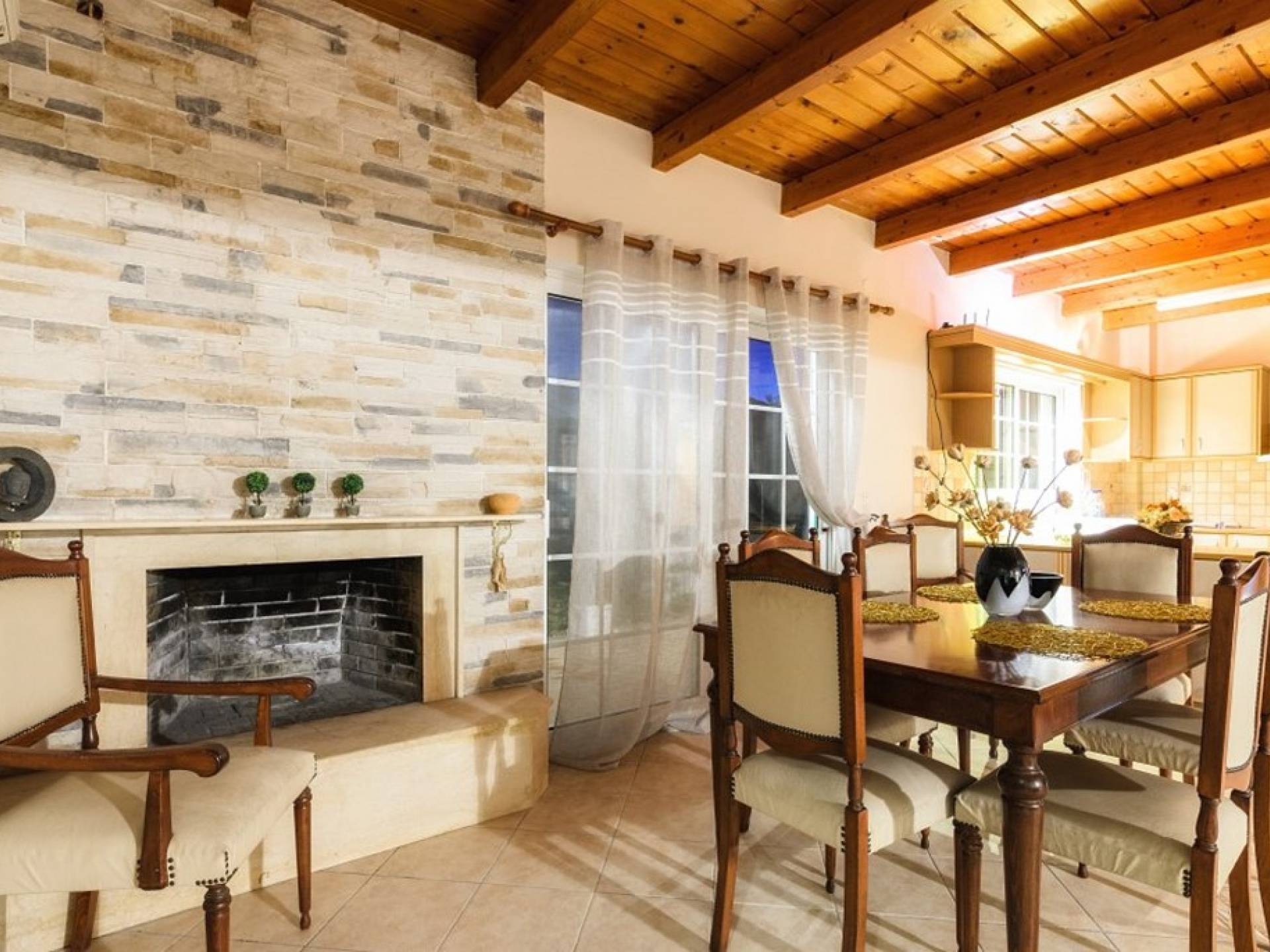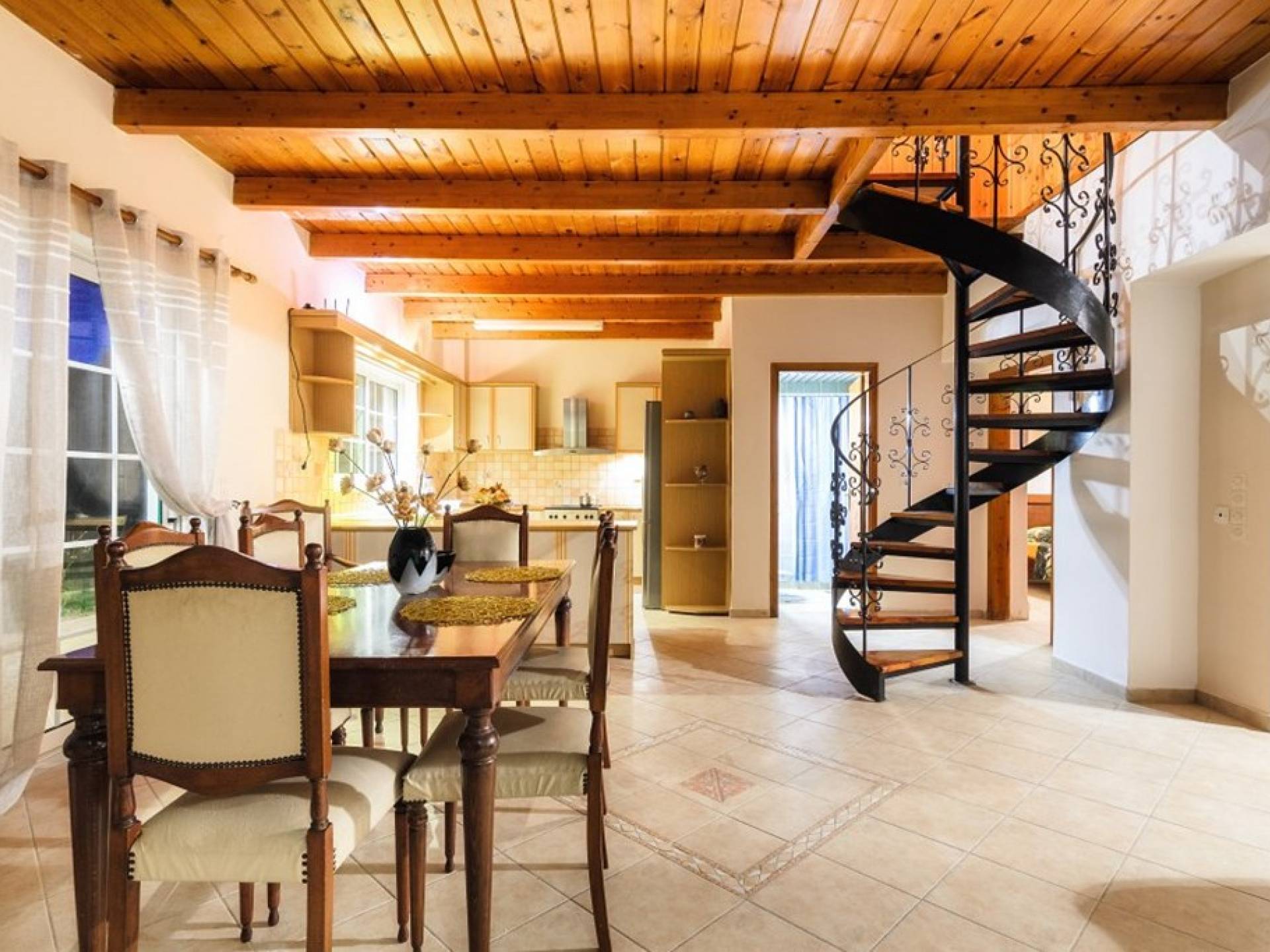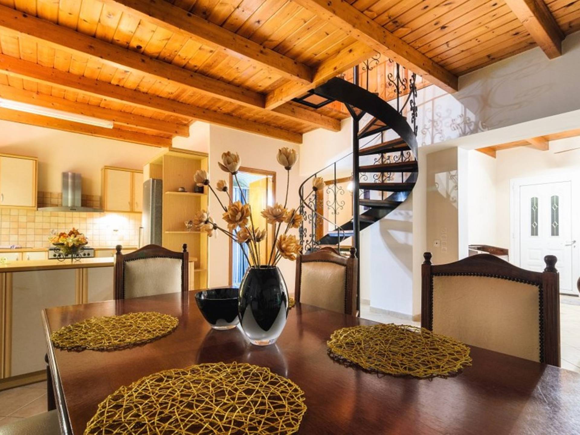 Au rez-de-chaussée il y a une cuisine entièrement équipée, un grand salon climatisé combiné avec un coin repas et une cheminée. Au même étage, il y a aussi une chambre avec un lit double et sa propre unité A / C, ainsi qu'une salle de bain séparée avec douche.