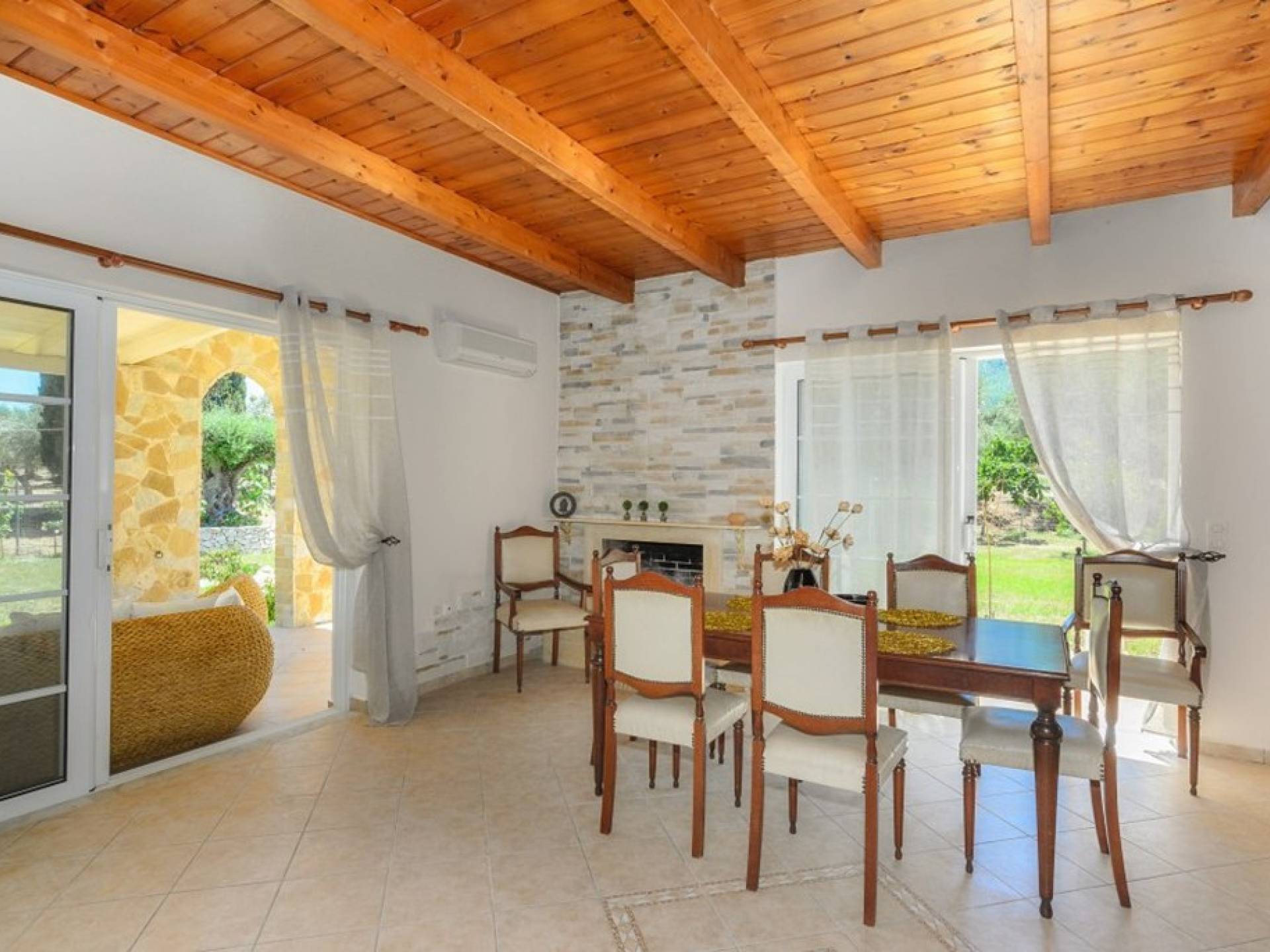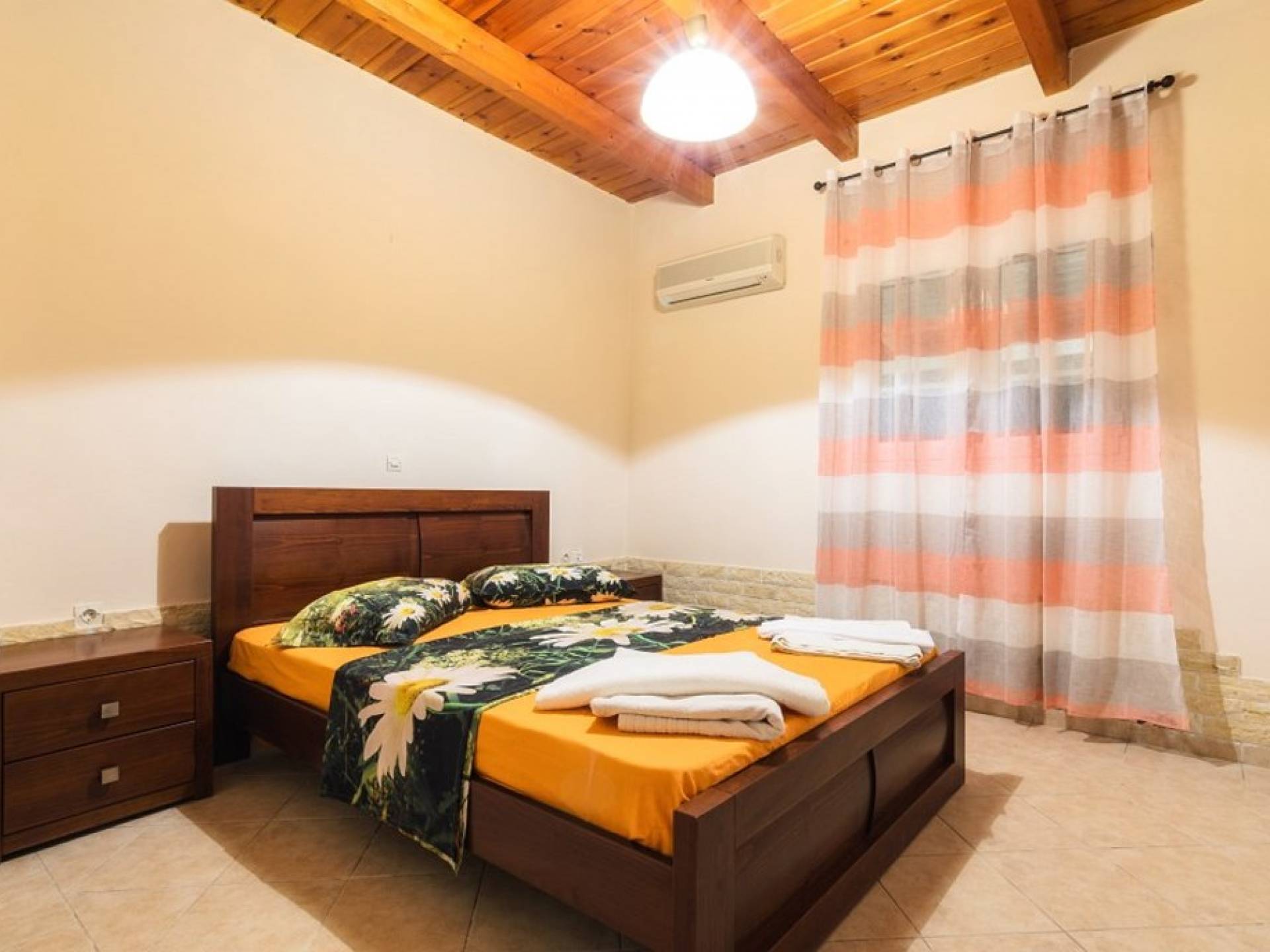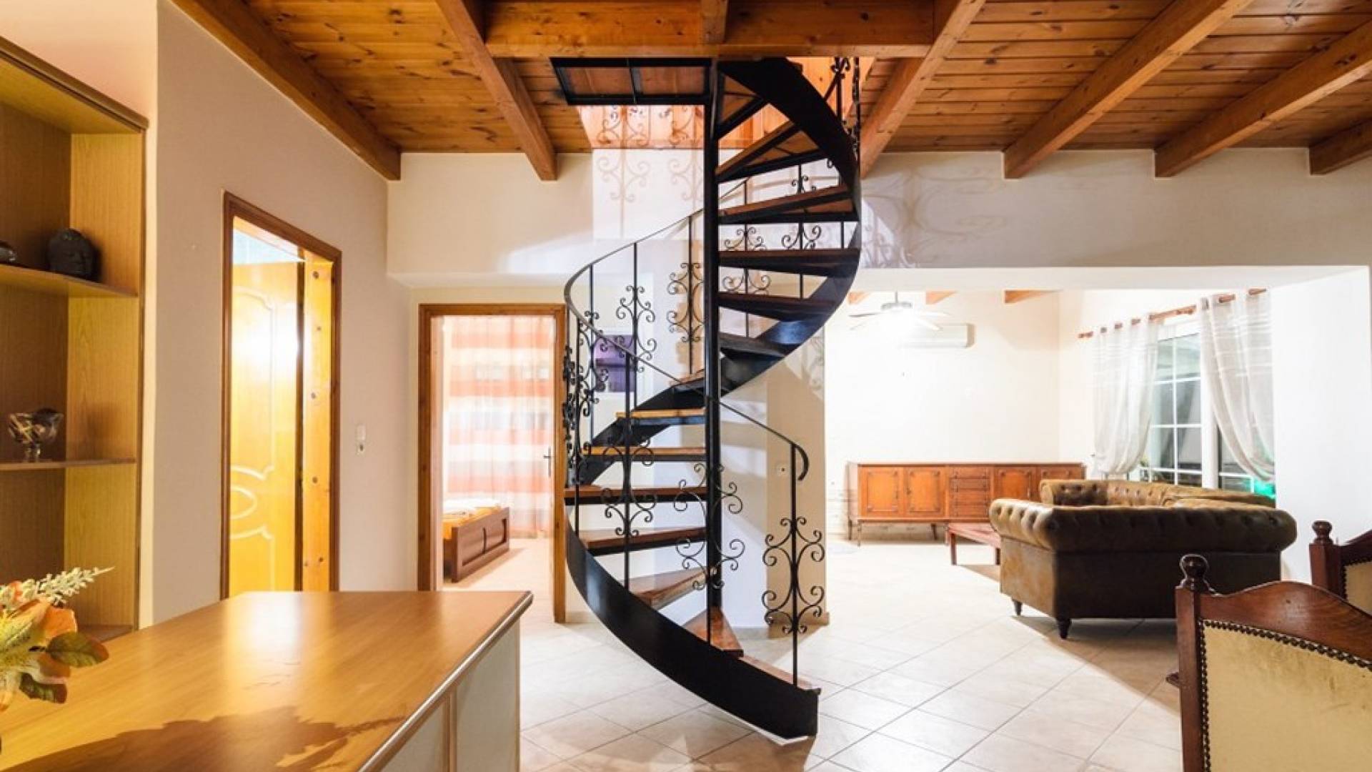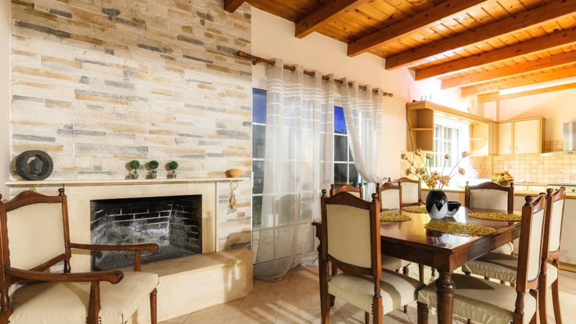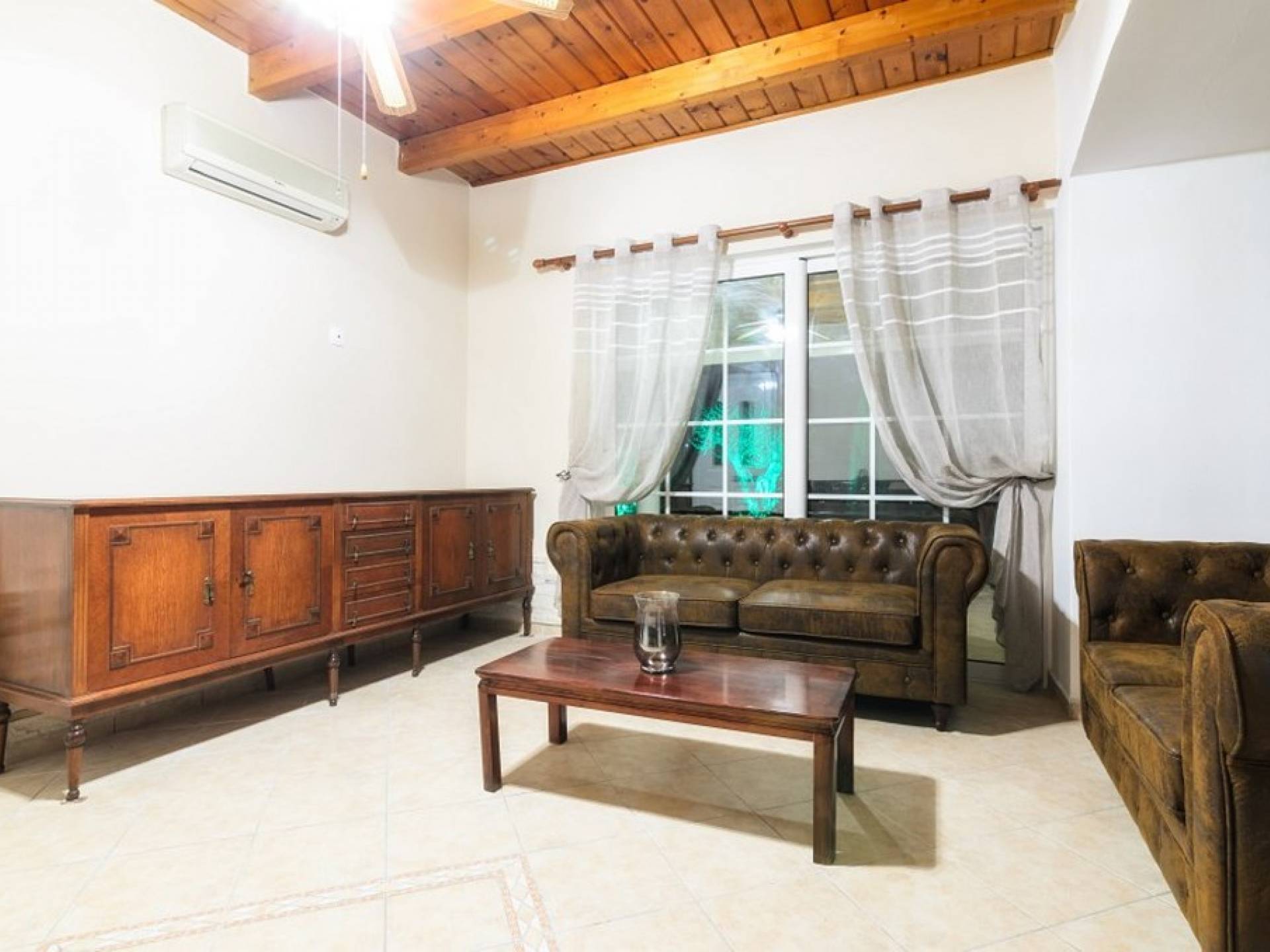 Au rez-de-chaussée il y a une cuisine entièrement équipée, un grand salon climatisé combiné avec un coin repas et une cheminée. Au même étage, il y a aussi une chambre avec un lit double et sa propre unité A / C, ainsi qu'une salle de bain séparée avec douche.