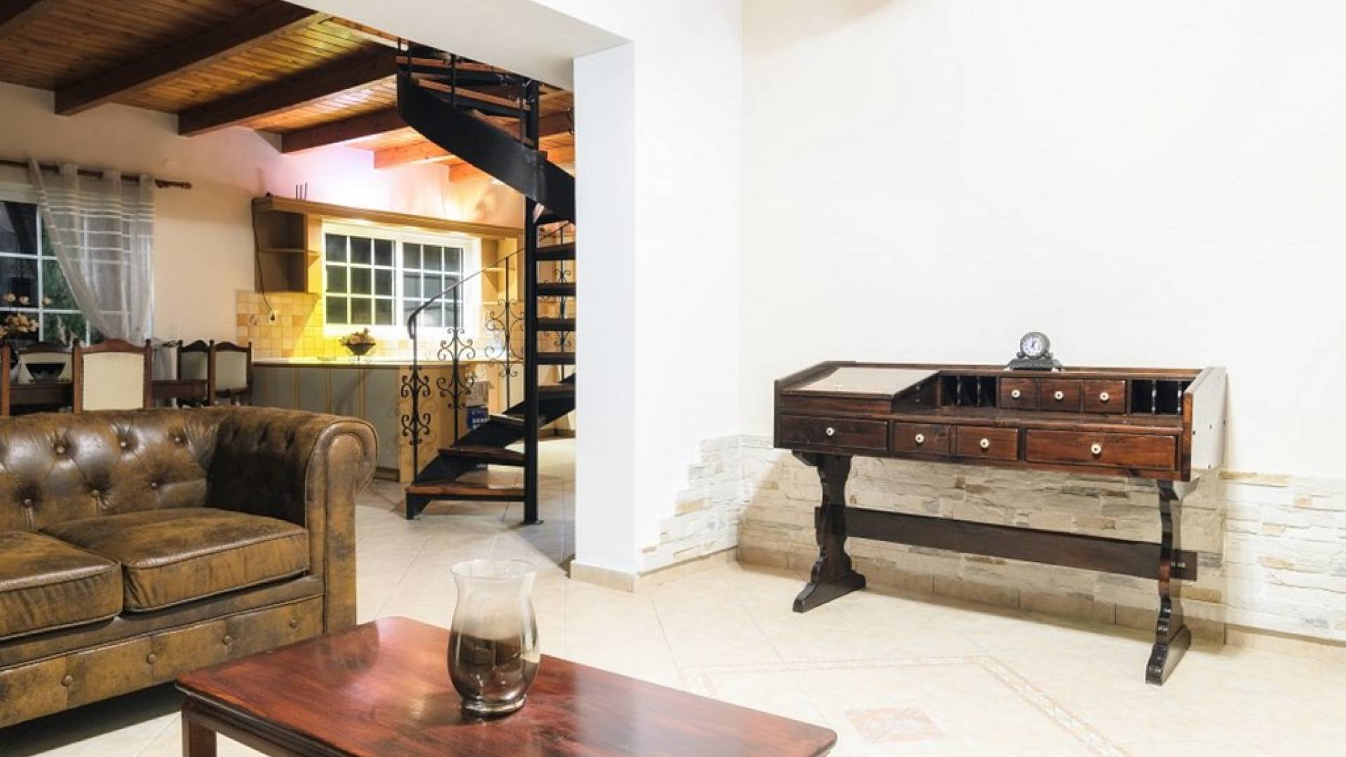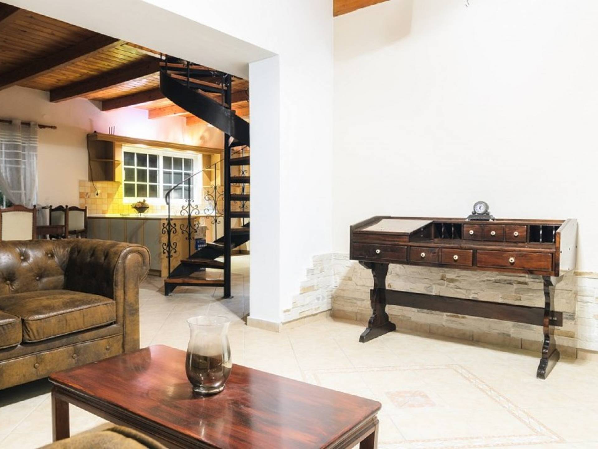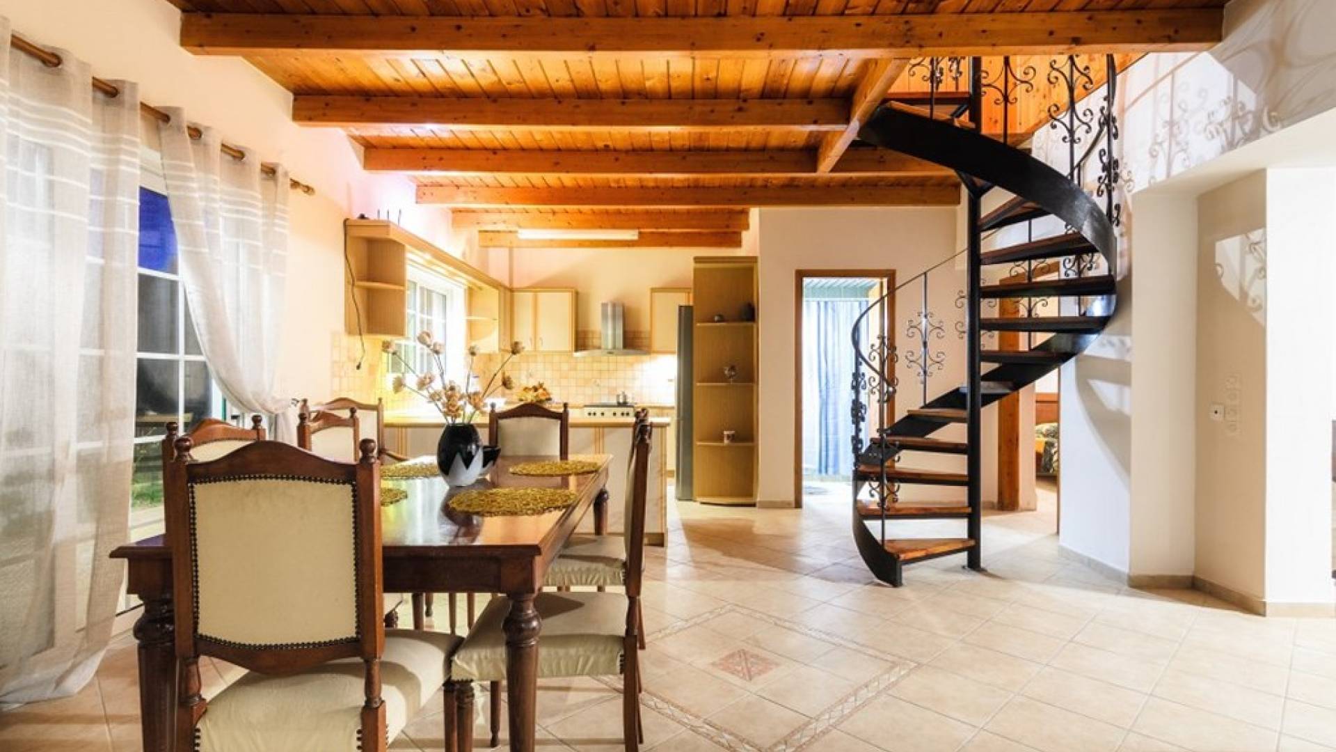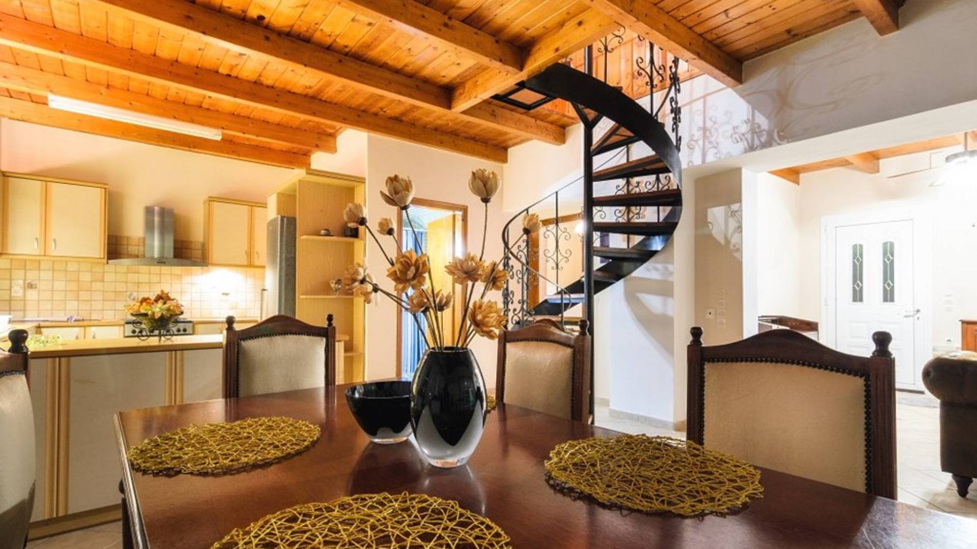 Au rez-de-chaussée il y a une cuisine entièrement équipée, un grand salon climatisé combiné avec un coin repas et une cheminée. Au même étage, il y a aussi une chambre avec un lit double et sa propre unité A / C, ainsi qu'une salle de bain séparée avec douche.