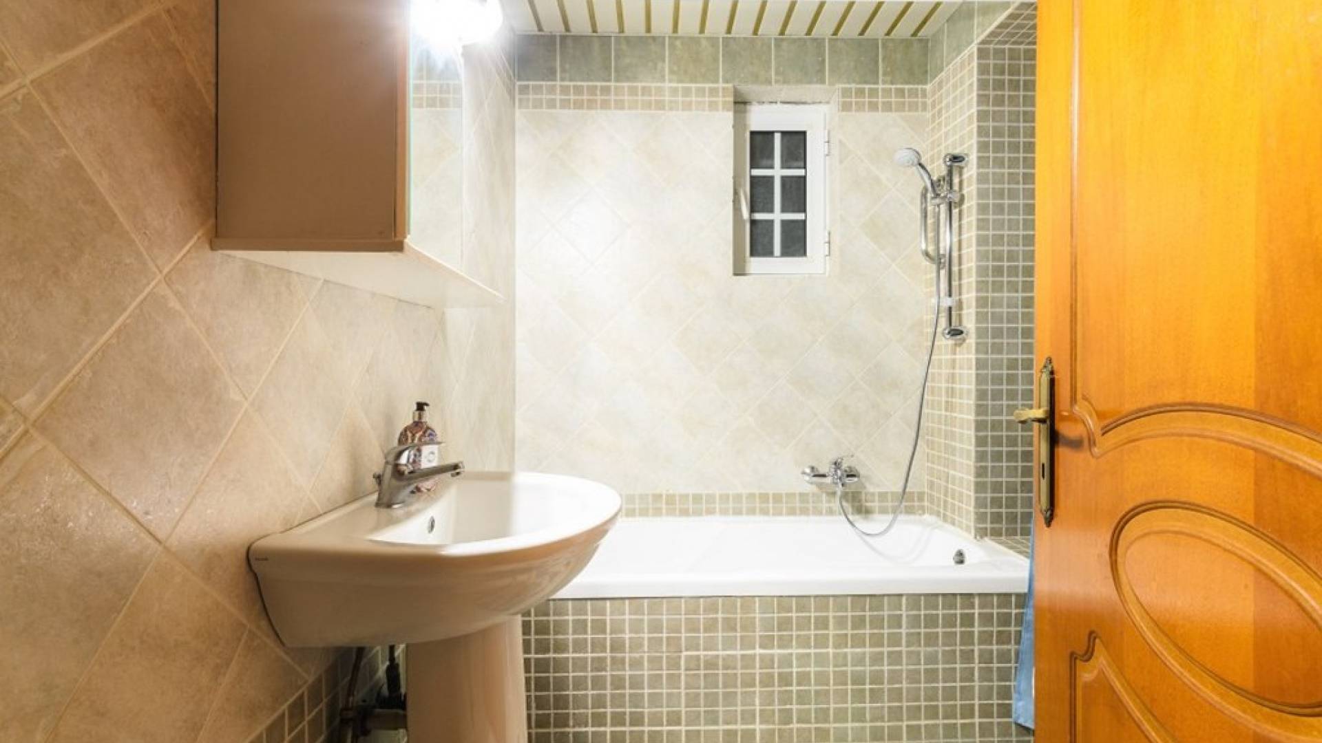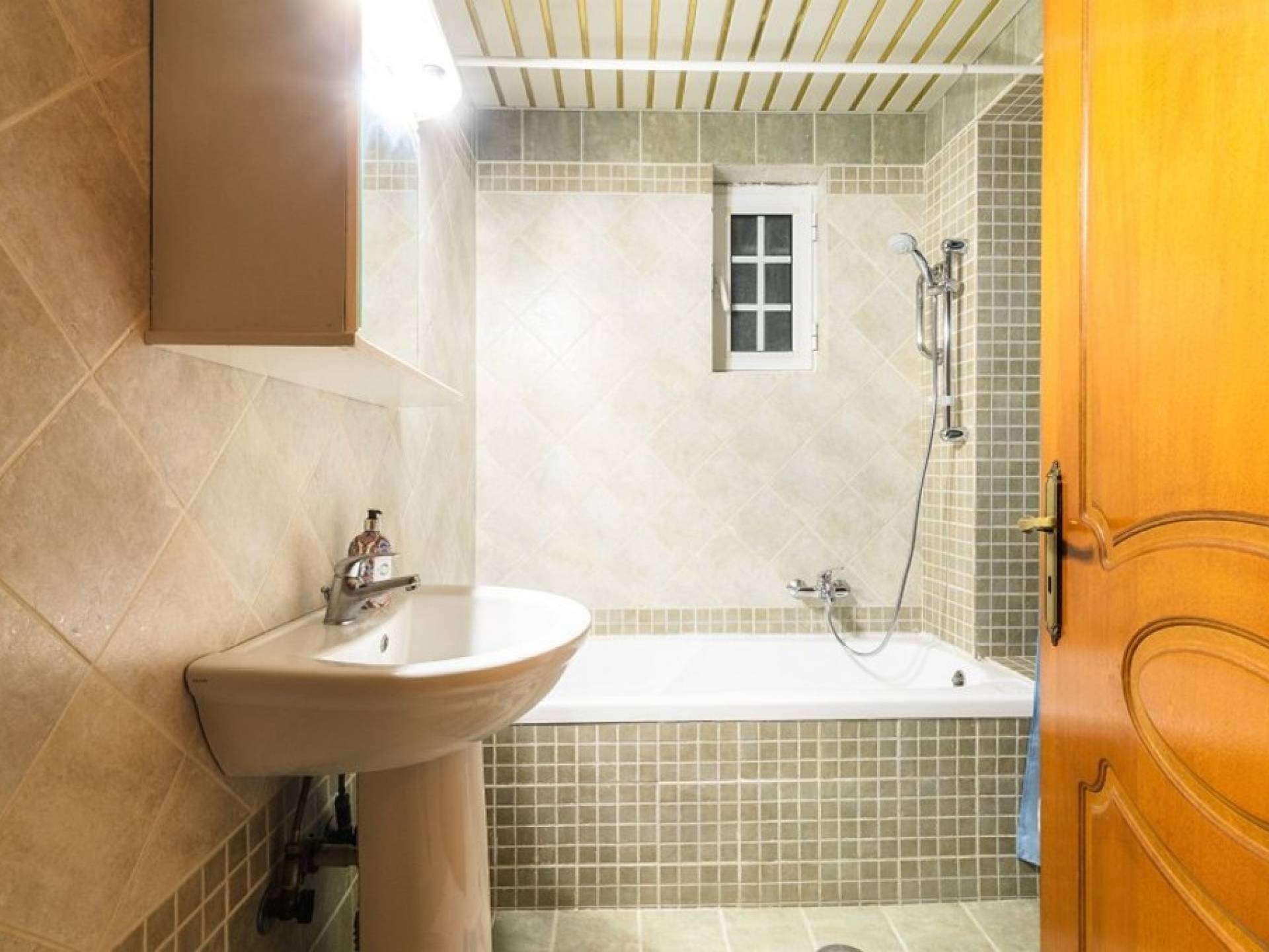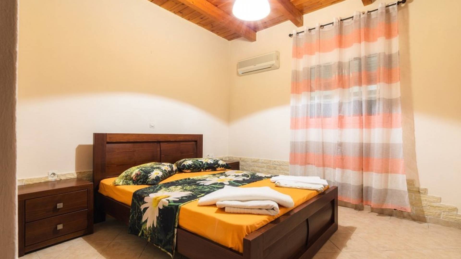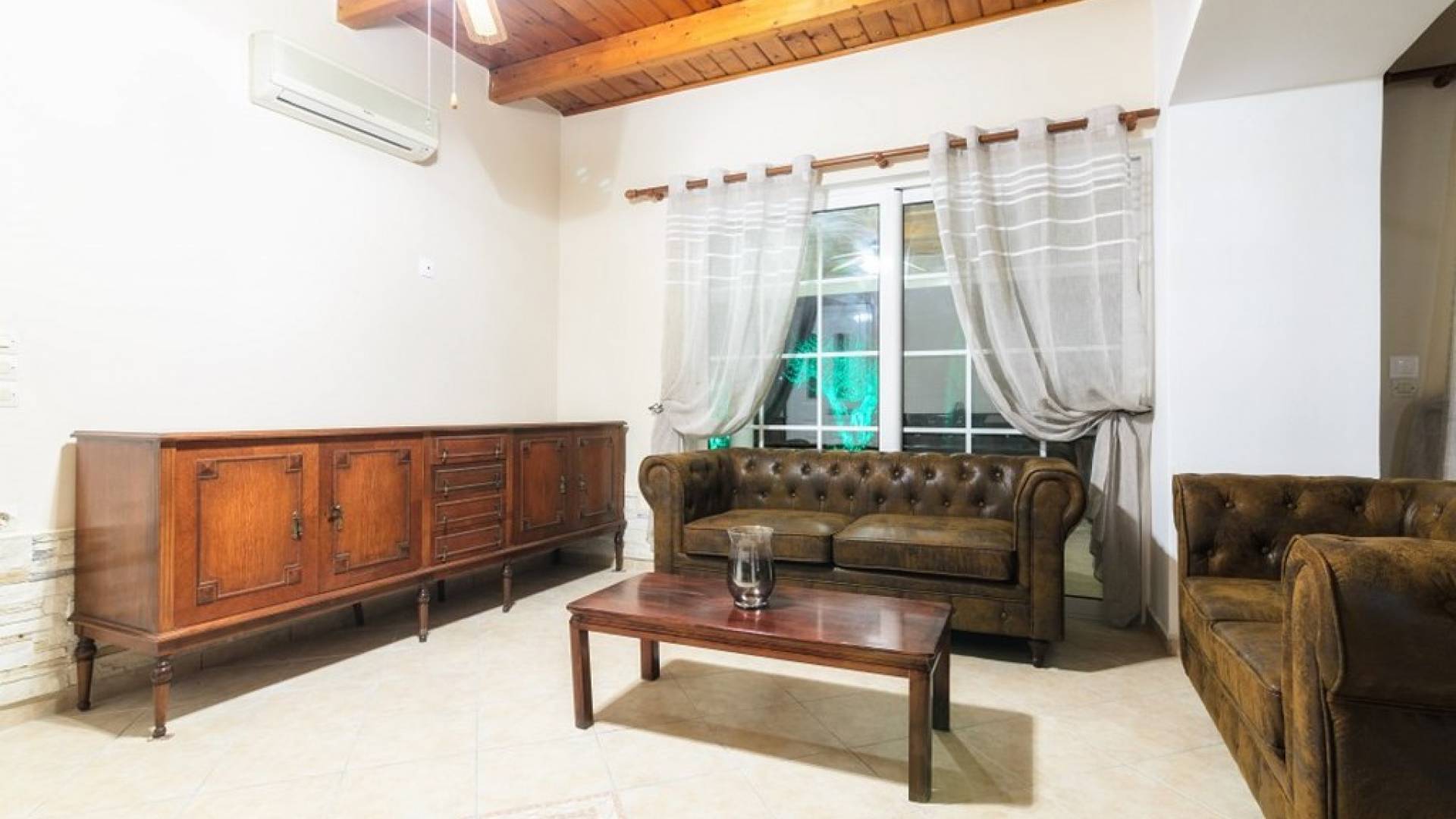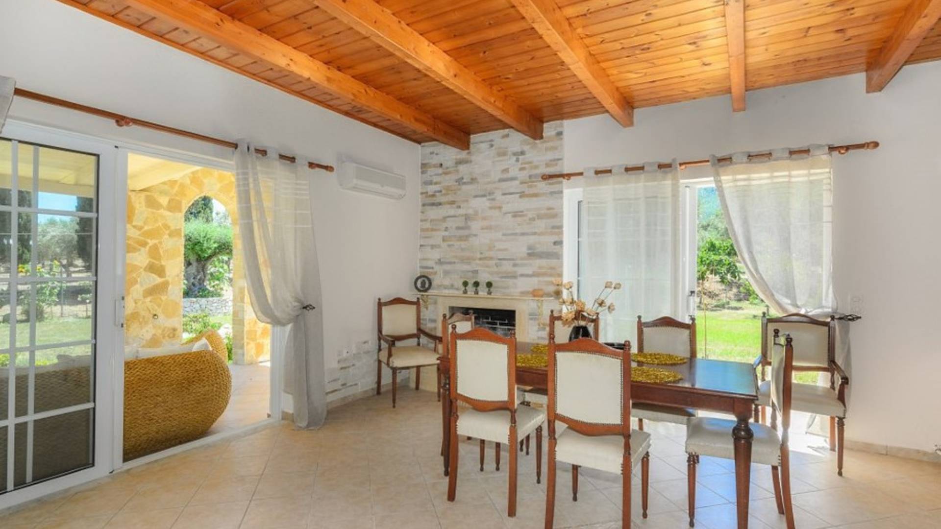 Au rez-de-chaussée il y a une cuisine entièrement équipée, un grand salon climatisé combiné avec un coin repas et une cheminée. Au même étage, il y a aussi une chambre avec un lit double et sa propre unité A / C, ainsi qu'une salle de bain séparée avec douche.