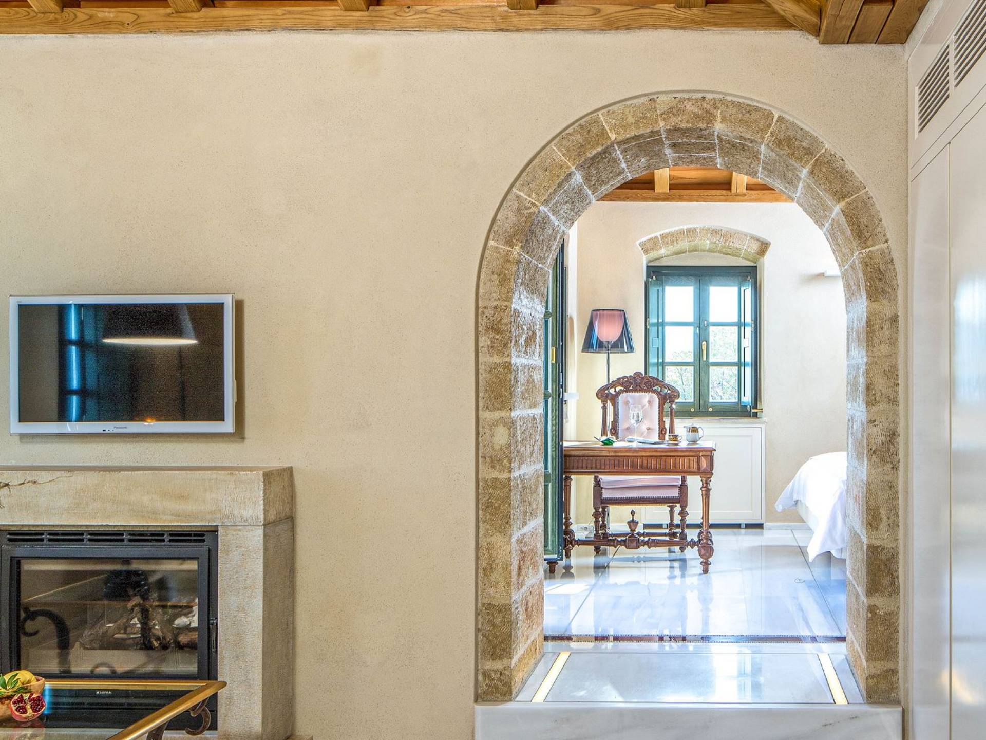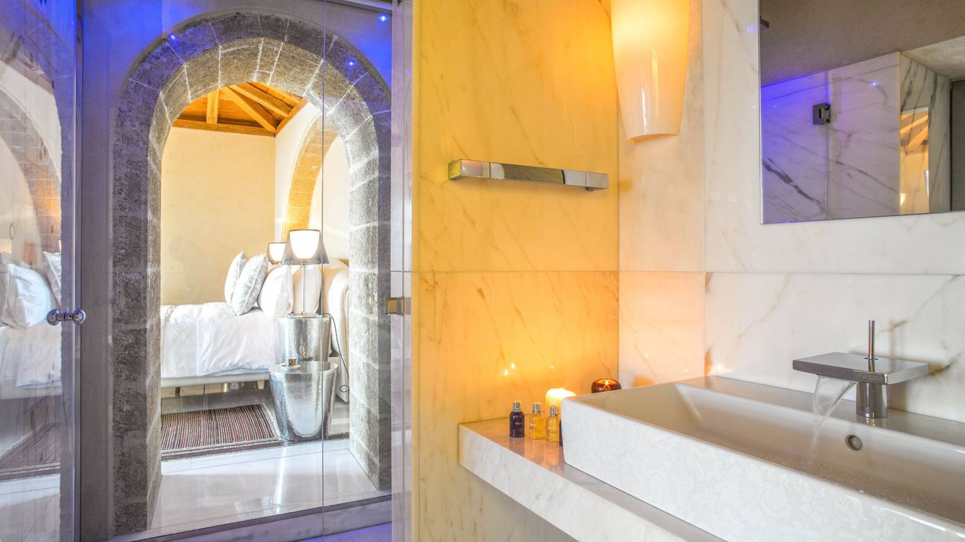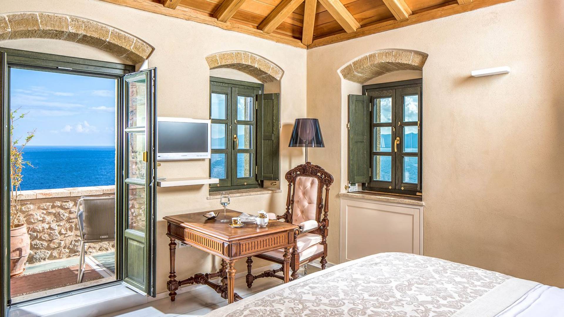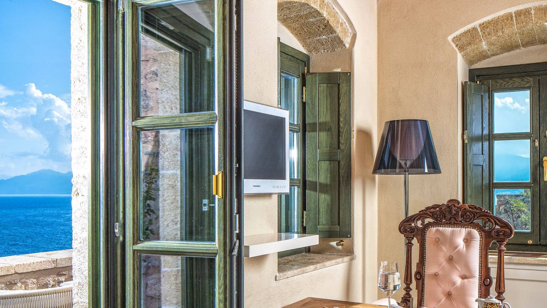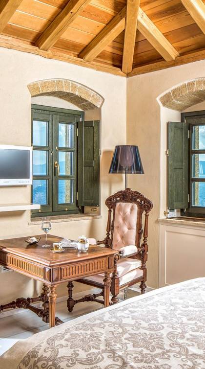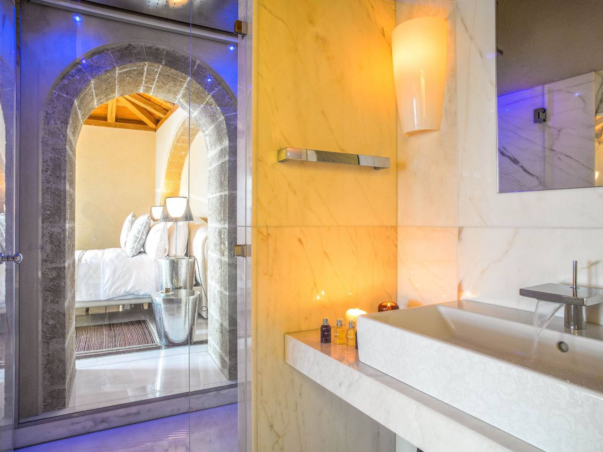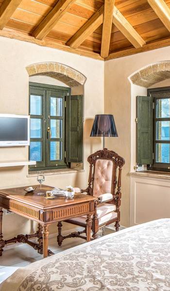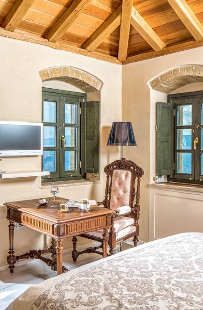 Le décor est planté dans la Suite Deluxe où l'on incarne tout ce qui est luxueux dans deux espaces distincts, la somptueuse chambre et le salon, mariant l'artisanat traditionnel à un design intérieur haut de gamme, comme celui de Philippe Starck et de Frau Poltrone '. Le confort est le nom du jeu dans cette suite en marbre blanc exquise et magnifique. Le bureau antique donne cette note supplémentaire de luxe. Passez les heures devant la cheminée confortable une nuit d'hiver ou profitez simplement d'un dîner d'été romantique pour deux sur votre balcon privé tout en profitant de la splendide vue imprenable sur la mer de Mirtoo devant vous.