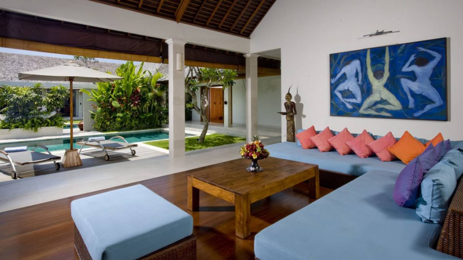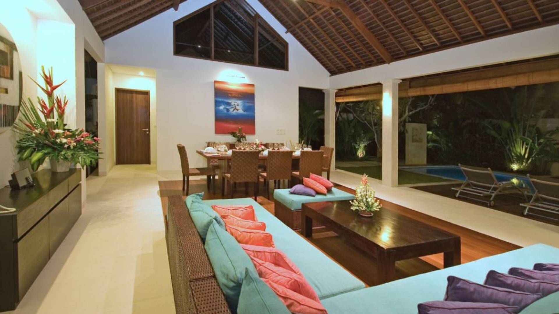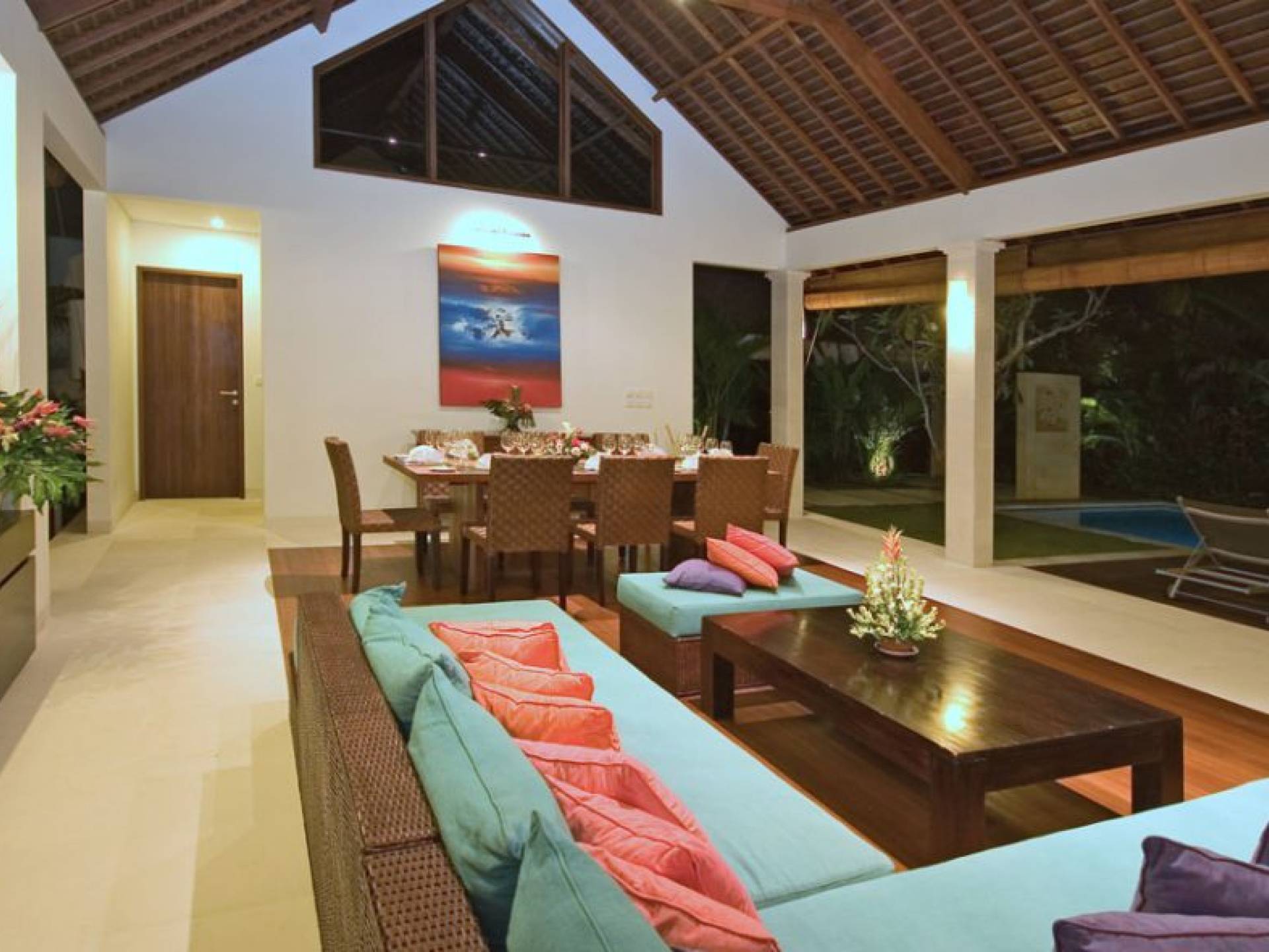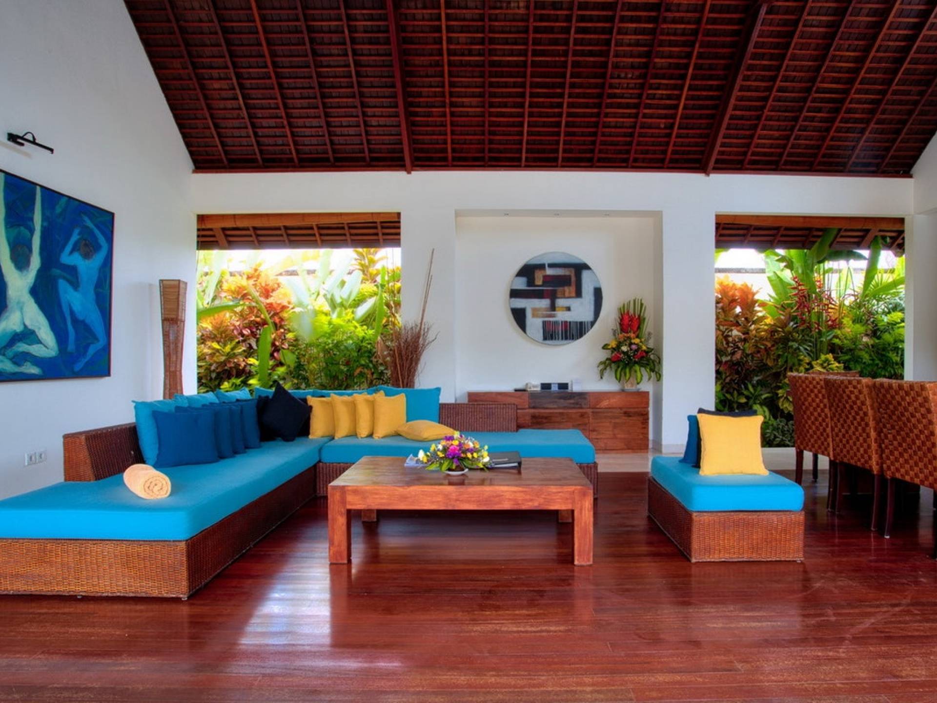 Adoptez le style de vie tropical et appréciez la beauté du spacieux pavillon ouvert pour la salle à manger et le salon de la Villa Nakula, qui fait face au jardin et à la piscine. Cet espace de vie est décoré d'œuvres d'art uniques, meublé d'un grand canapé confortable recouvert d'un bleu lumineux et estival et équipé d'enceintes iPod (un iPod chargé de musique pour tous les goûts est disponible sur demande), ce qui en fait l'endroit idéal pour retrouvez vos amis, lisez un livre ou dégustez des cocktails et des canapés au coucher du soleil.