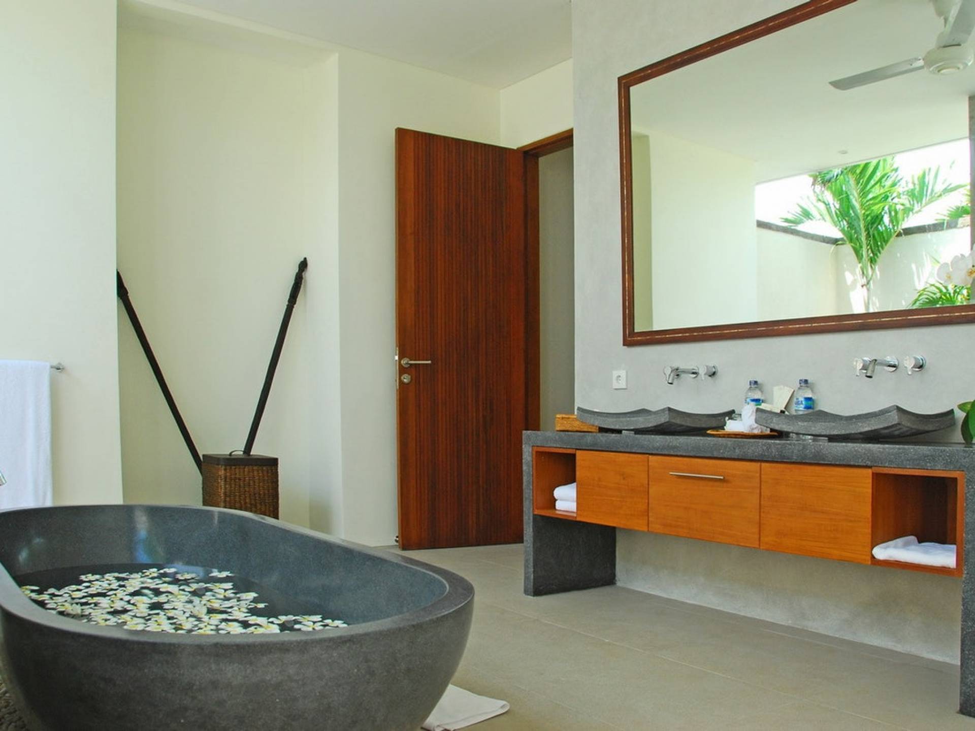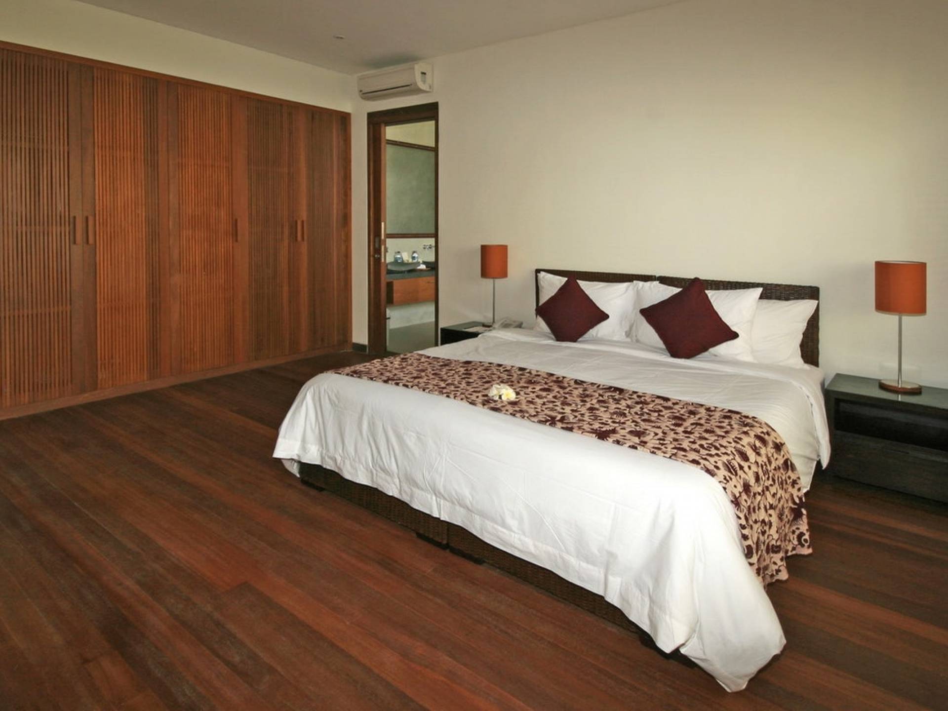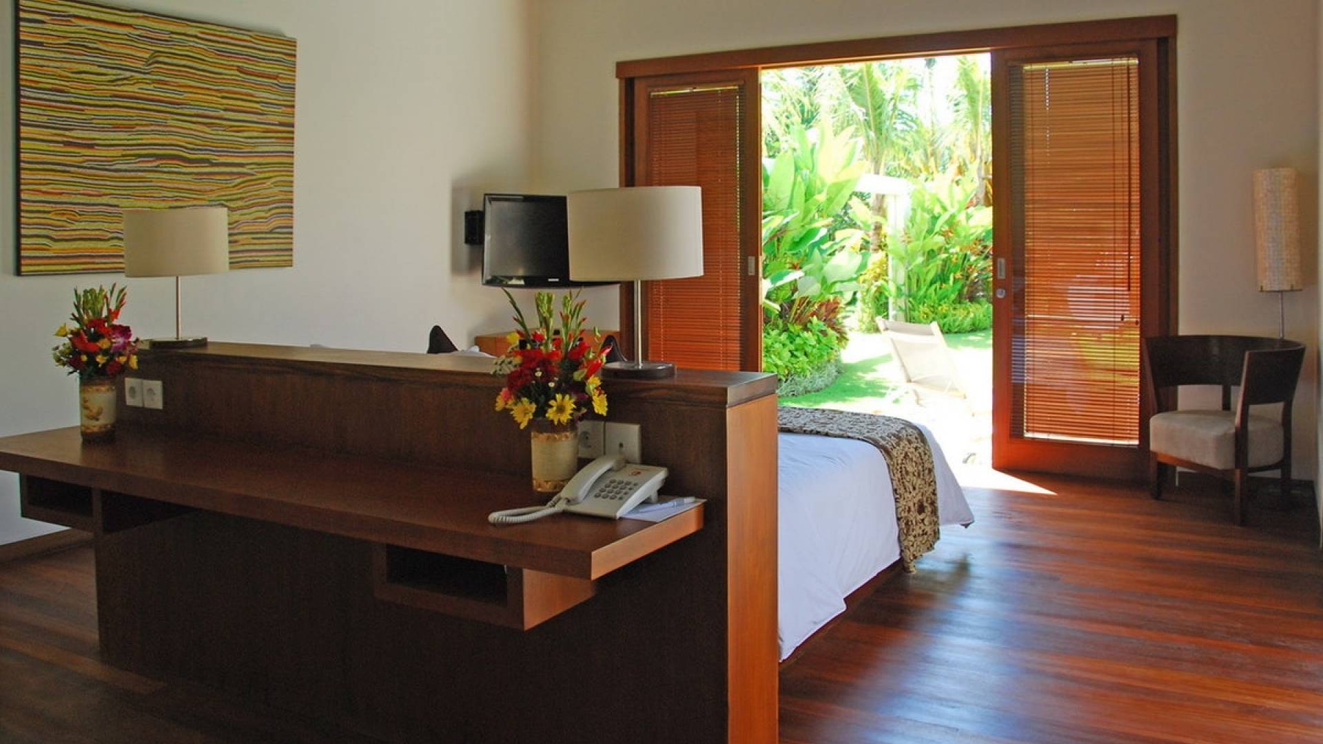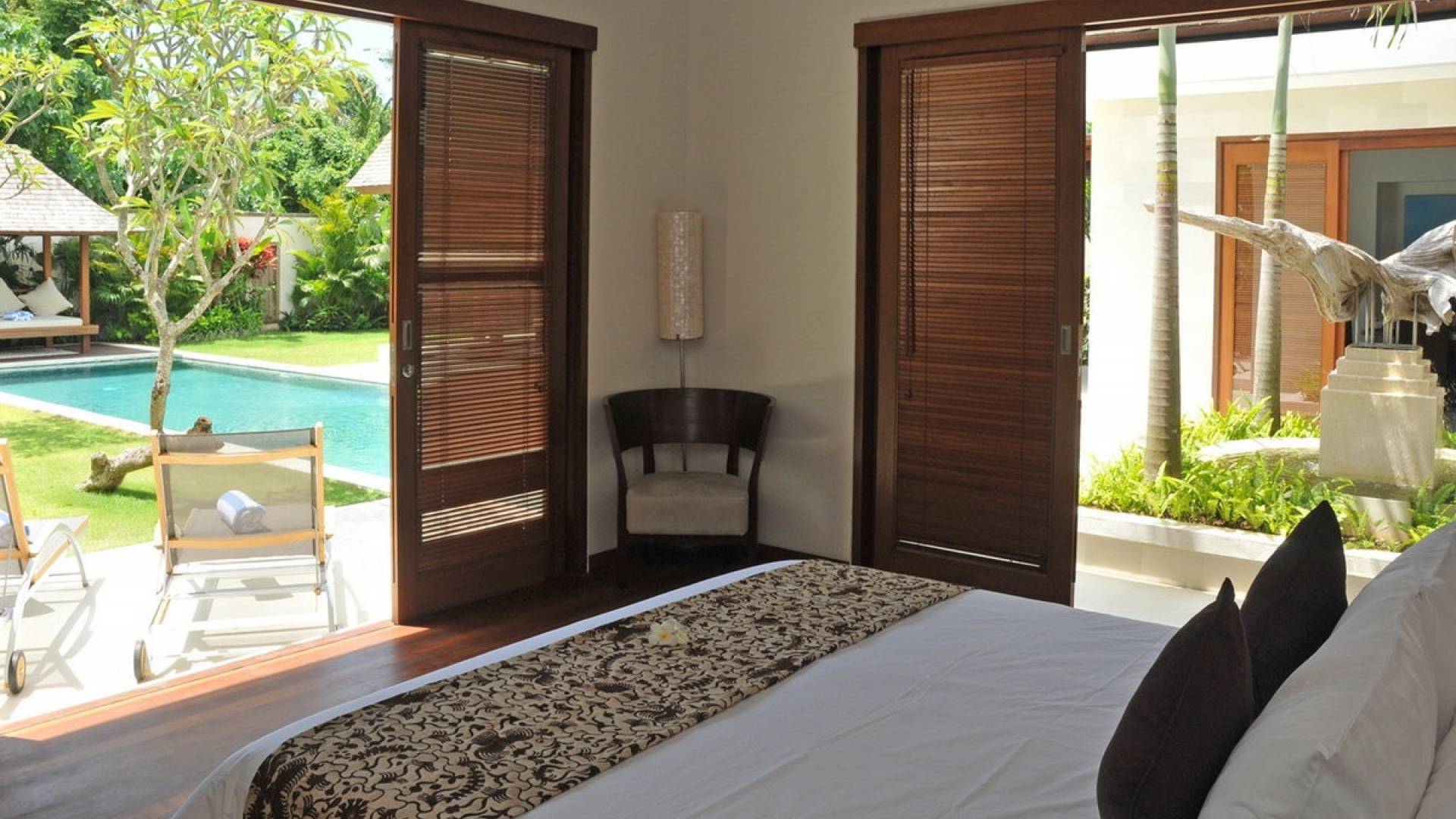 La chambre principale de la Villa Yudhistira, meublée d'un lit king-size et d'un bureau, dispose de doubles portes s'ouvrant sur le jardin, ce qui la rend merveilleusement lumineuse et aérée. La deuxième chambre, qui donne sur une cour soignée, a des lits jumeaux qui peuvent également être constitués comme un roi. Les deux chambres sont équipées d'écrans de télévision et la chambre principale d'un lecteur multimédia à disque dur (préchargé avec une énorme collection de films et de séries télévisées). Les grandes salles de bains privatives en plein air disposent de baignoires et de douches à effet pluie.