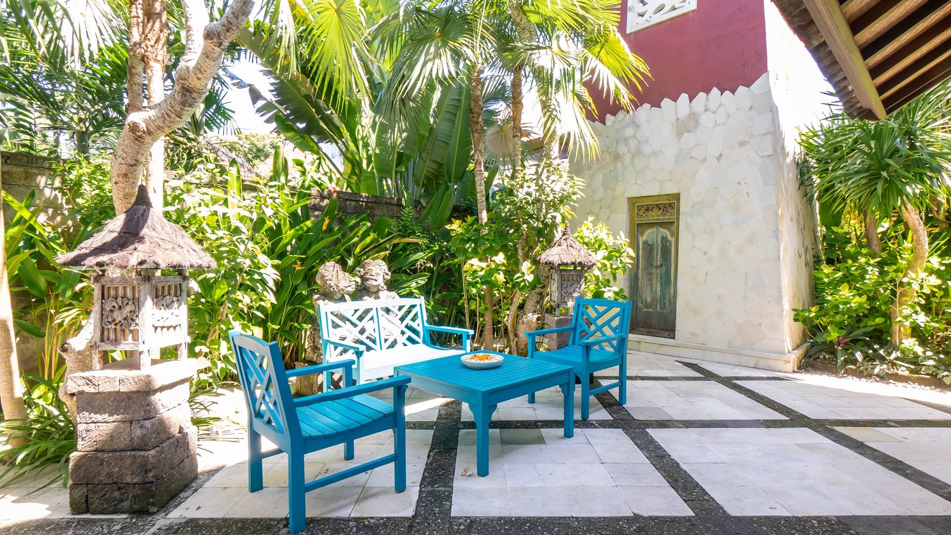 La disposition et la flore de la cour du jardin reflètent les paysages verdoyants de l'île avec des plantes indigènes de chaque feuillage, une fontaine d'eau exquise, une piscine extérieure et un jacuzzi. Des pierres de taille artisanales sont présentes dans toute la cour. La conception décloisonnée garantit que la beauté du jardin peut être appréciée dans chaque section de la villa.