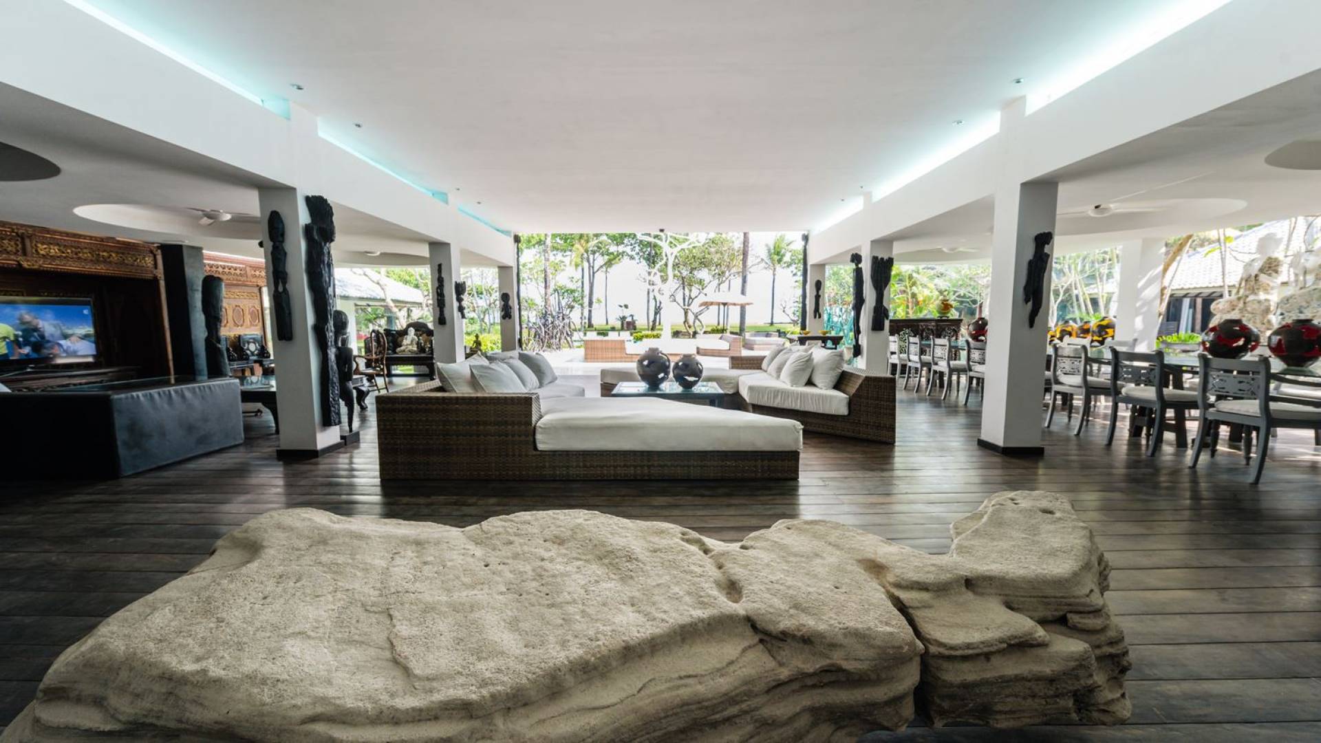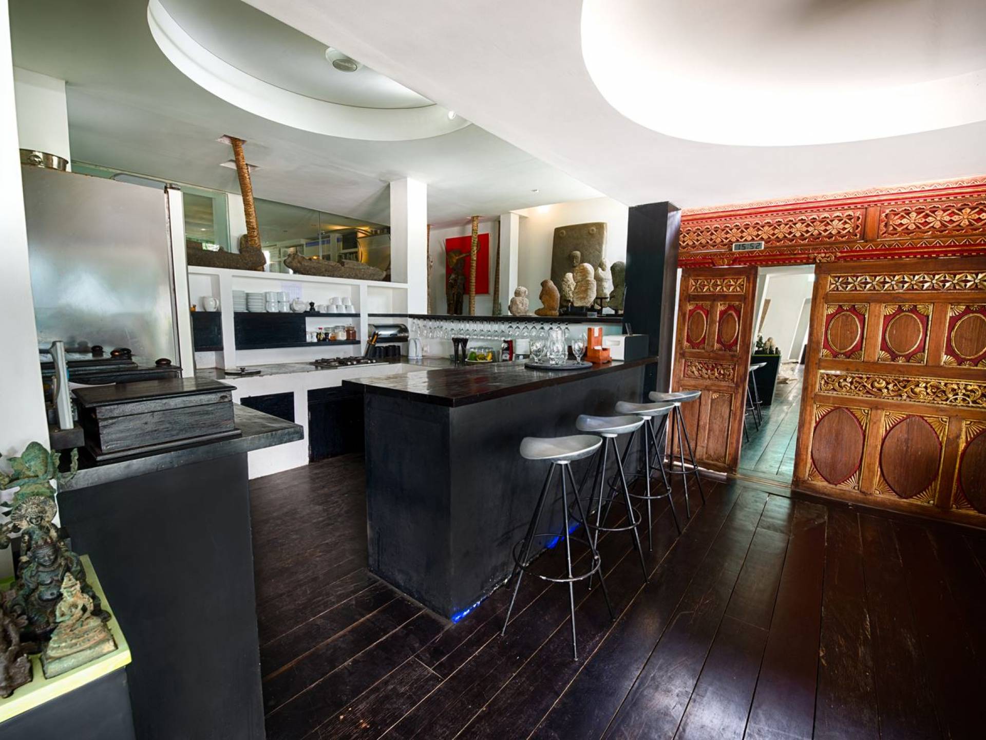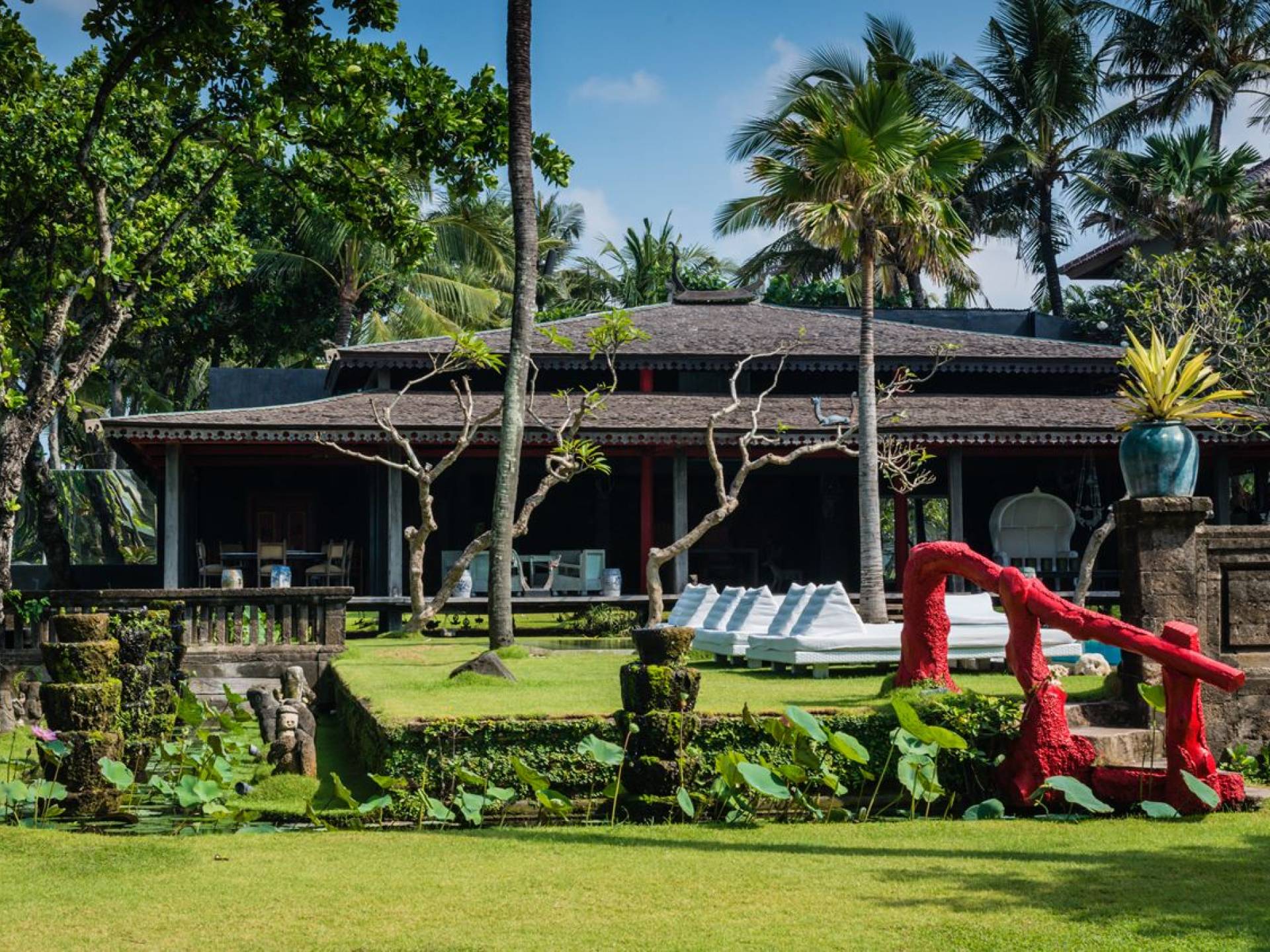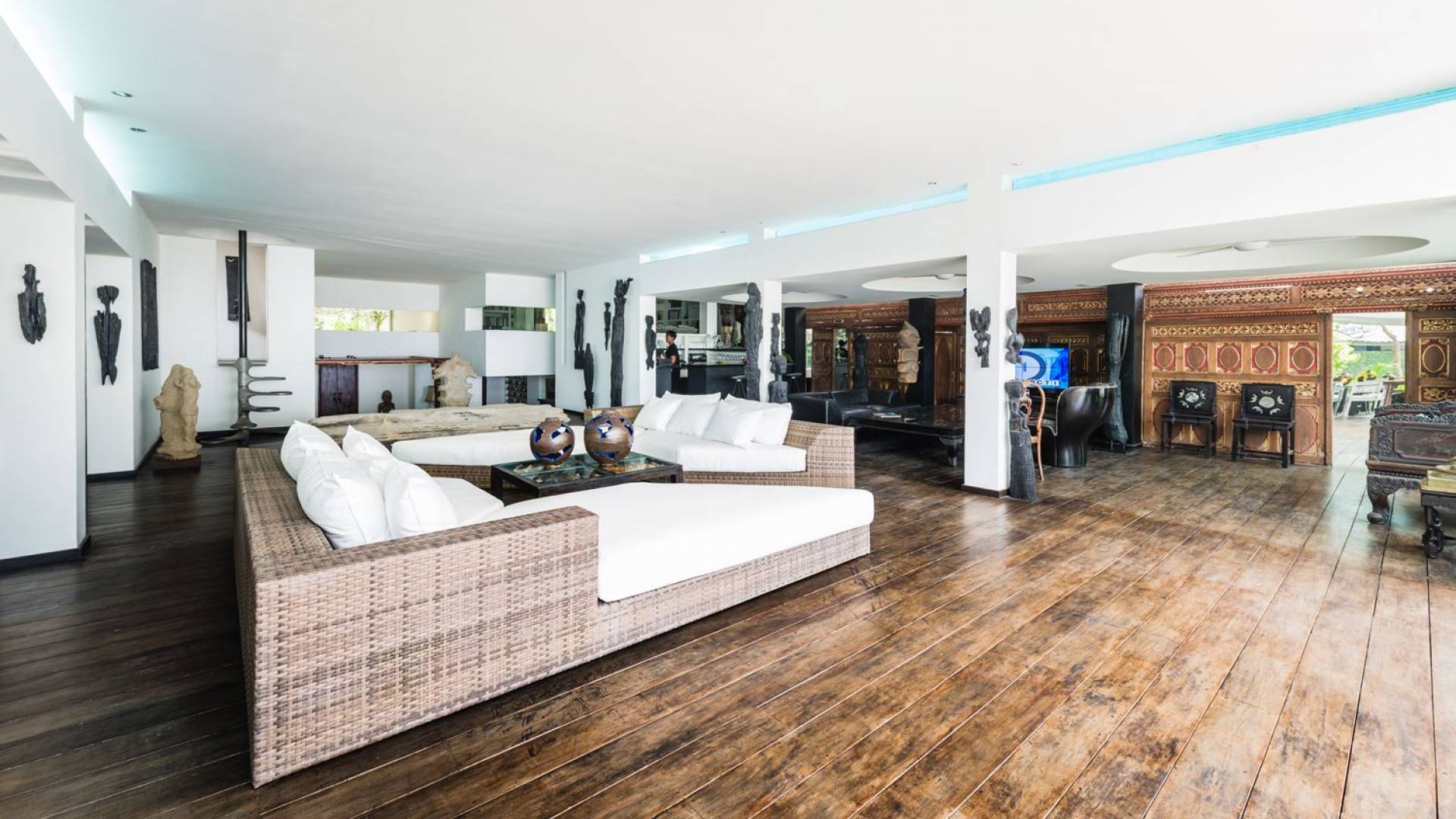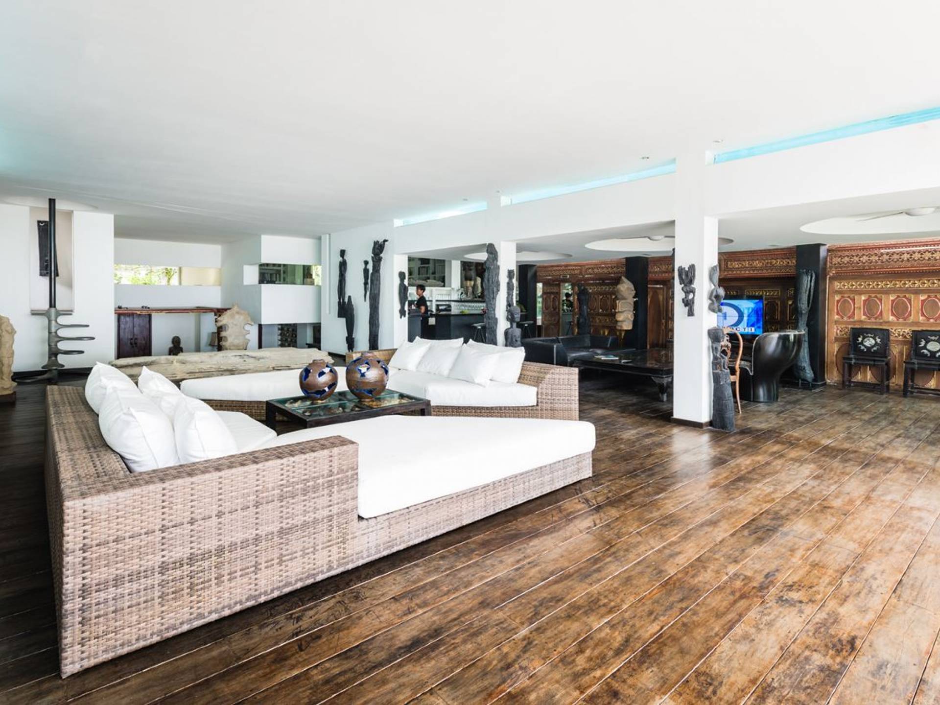Le spacieux salon décloisonné a l'air d'un musée, décoré d'antiquités et d'œuvres d'art tribales. Le salon dispose d'un parquet rustique, de meubles en bois sculptés à la main, d'une cheminée et de murs traditionnels en bois de teck finement sculptés d'un côté. Magnifique! Il y a de grands canapés en rotin avec des coussins blancs pour se détendre, il y a une longue table à manger pouvant accueillir jusqu'à 24 personnes, il y a une télévision et il y a une cuisine avec un bar et des tabourets. Un autre bâtiment impressionnant sur place est The King's House - une authentique ancienne maison de roi ramenée de Pontianak, Kalimantan. Cette ancienne maison à deux niveaux est idéale pour les célébrations et les événements, située juste à côté de la piscine. Il y a un grand plateau au milieu, qui pourrait constituer une piste de danse ou une scène et il est entouré d'une véranda avec des sièges et des options de restauration. Attenant au pavillon principal, il y a une galerie d'art montrant certaines des propres créations de Morabito. De plus, le domaine dispose d'un home cinéma et d'un spa privé. Quelque chose de plus que vous pourriez souhaiter? Nous ne le pensions pas !